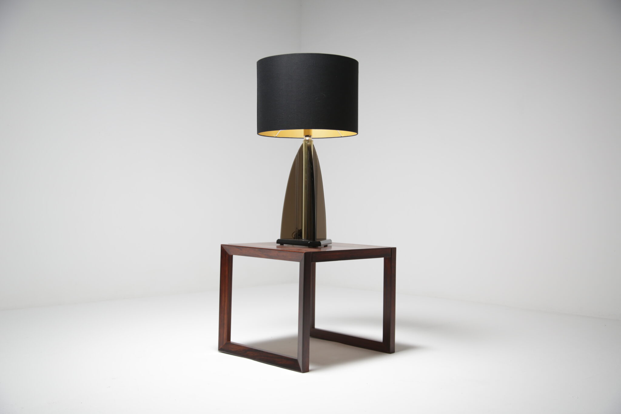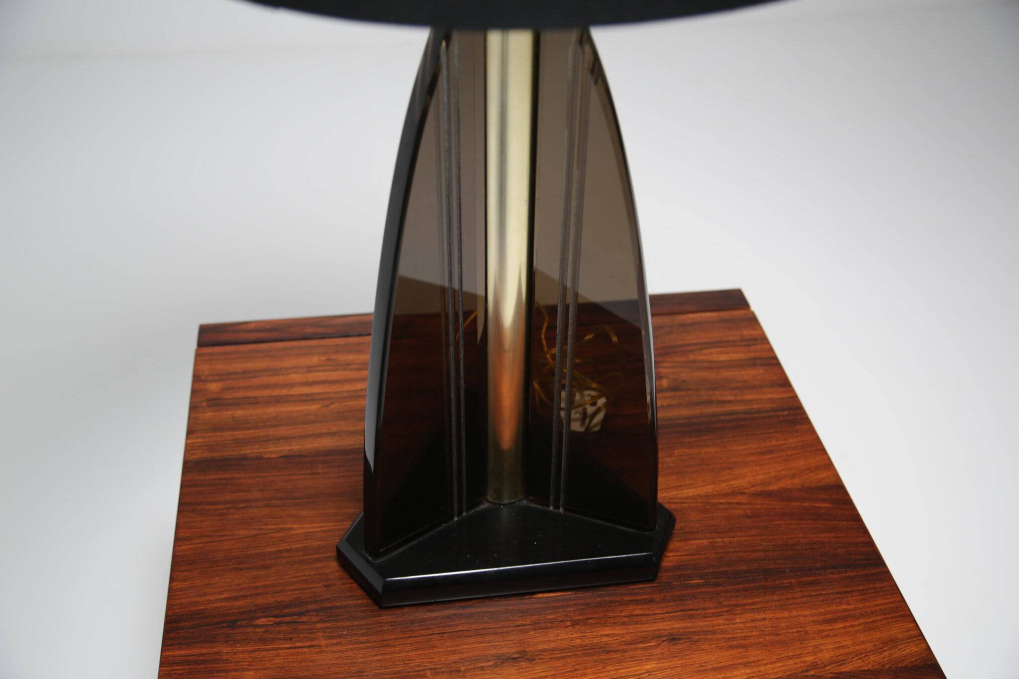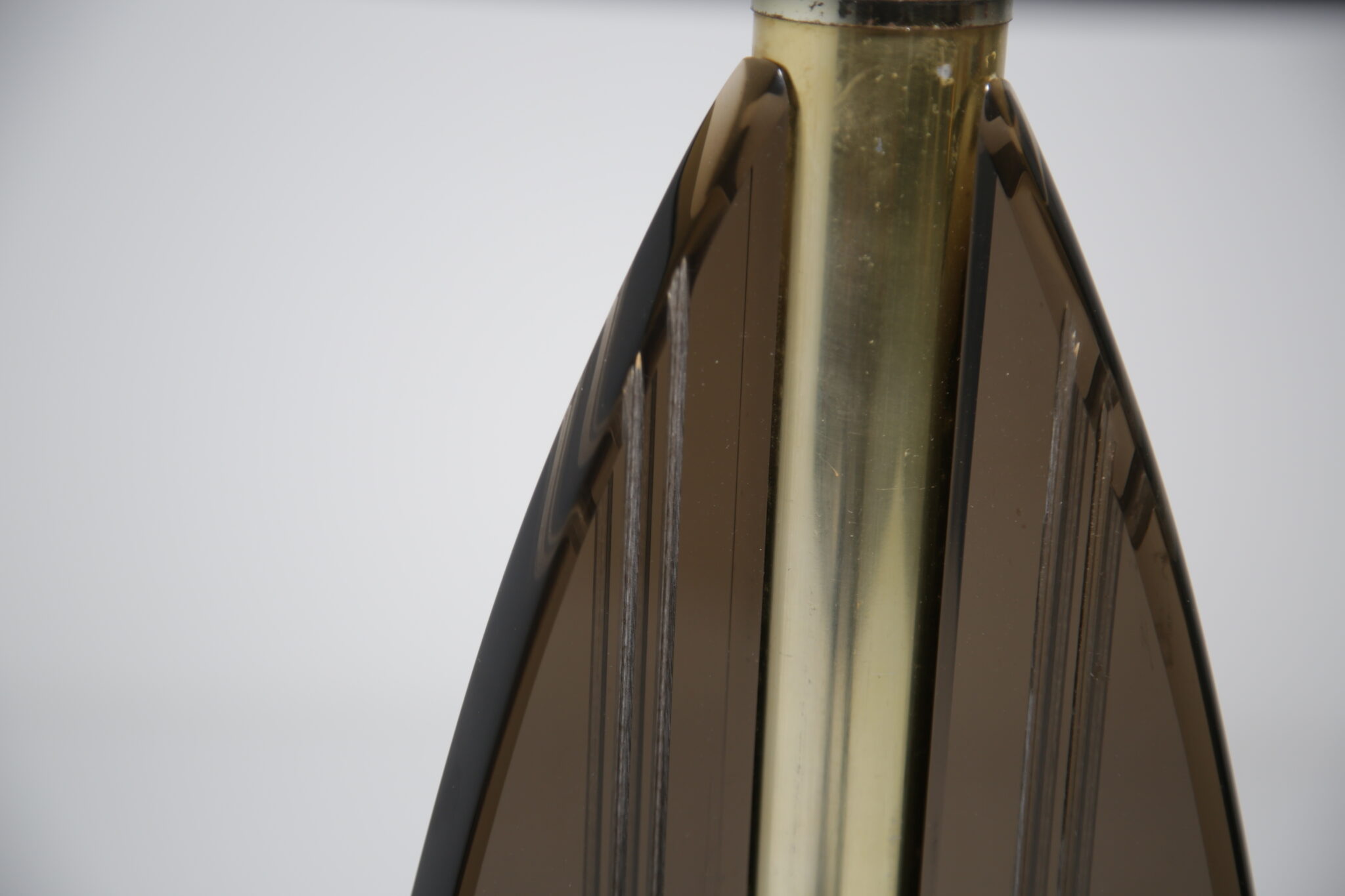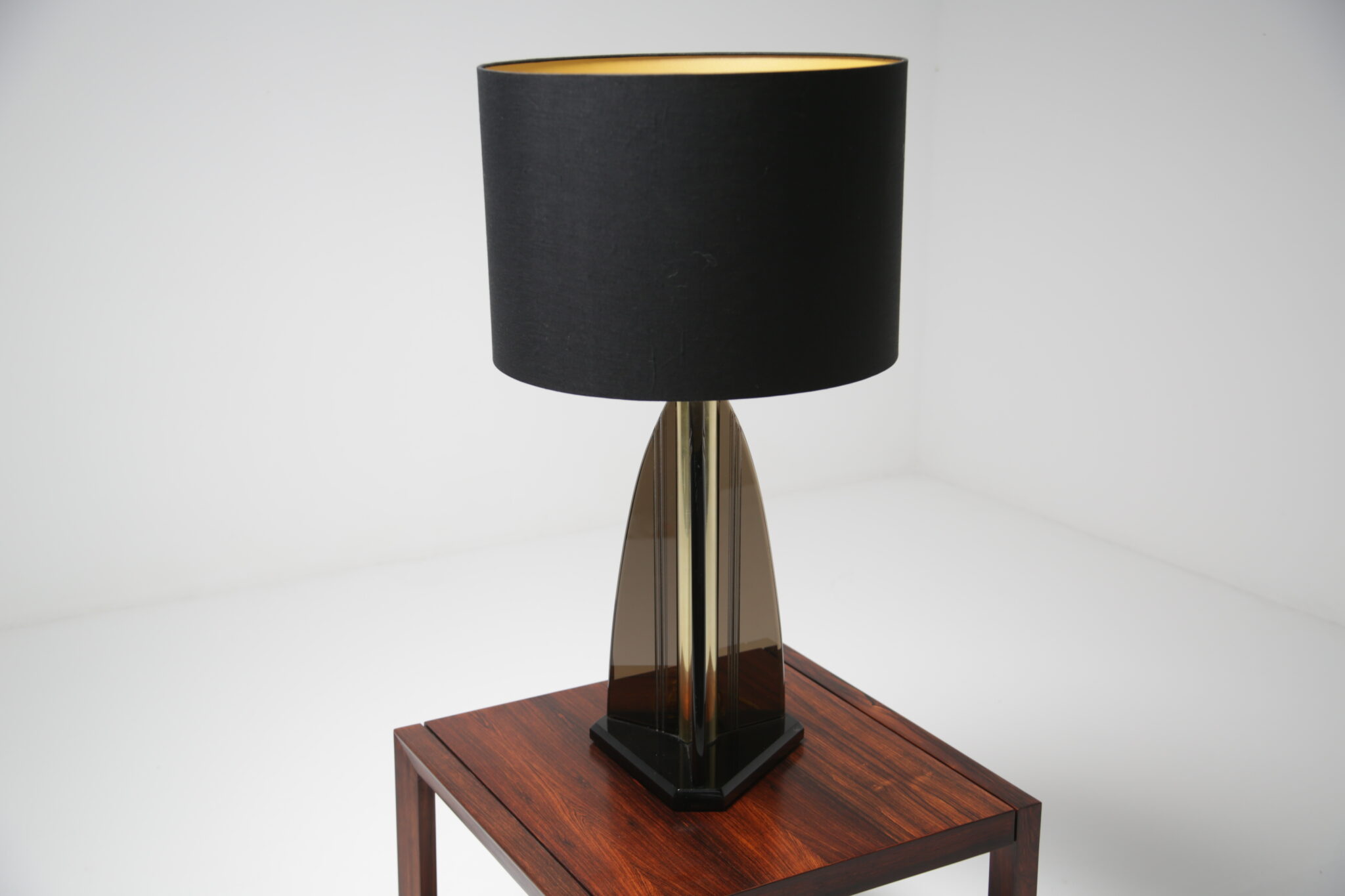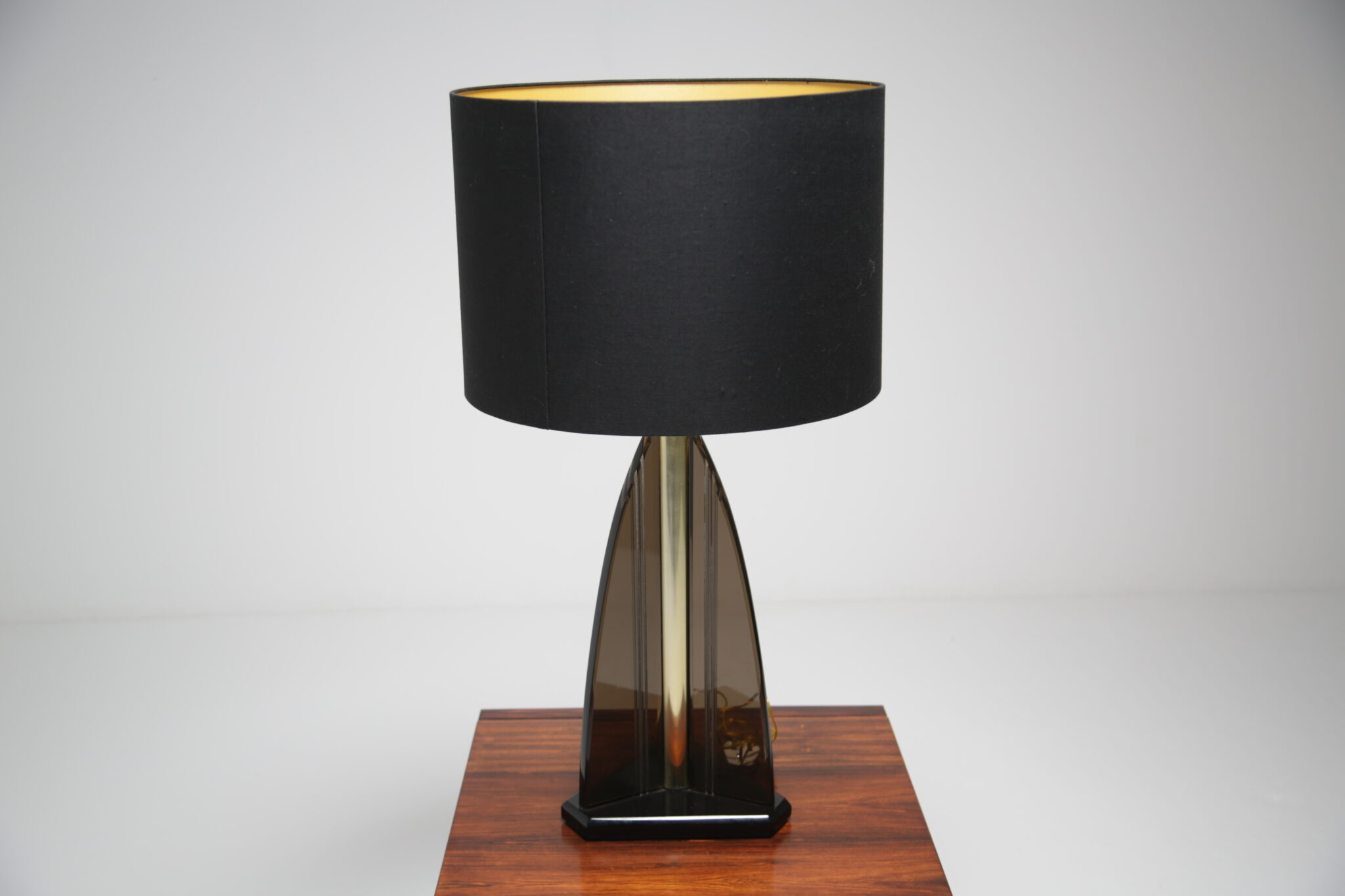 This beautiful and unusual vintage table lamp by Hivo Van Teal is the ultimate statement piece for any luxury living space, featuring a smoked Lucite and brass frame. The lamp is formed as a sculpture and has a sleek and modern design and would work in most spaces such as the office, bed or living room.