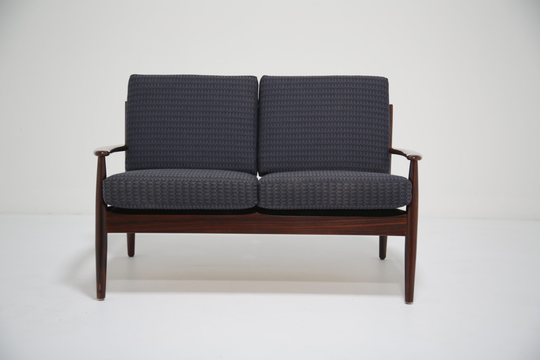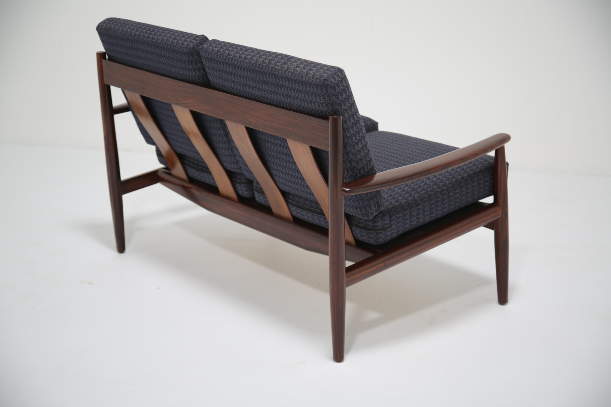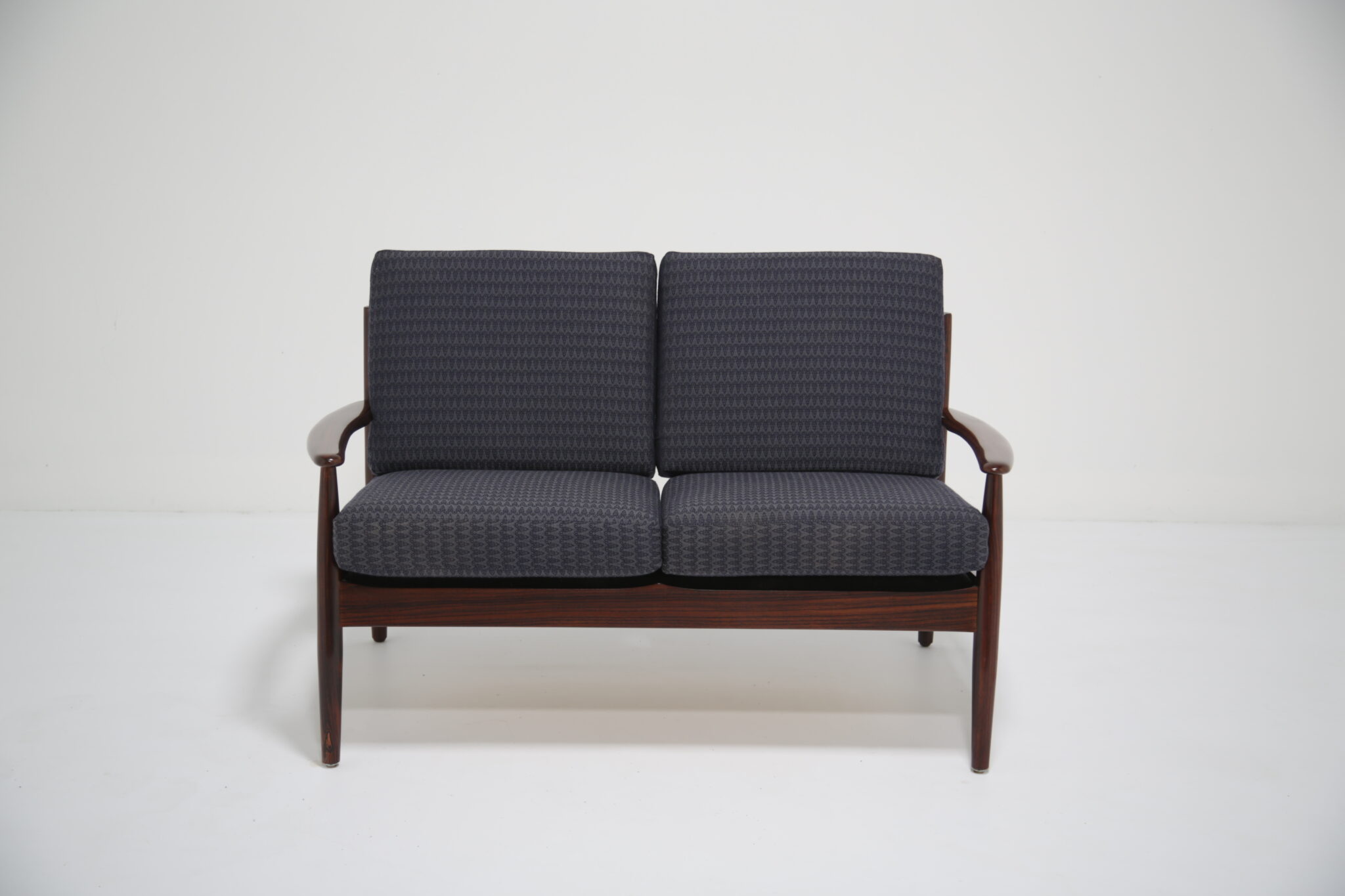 Danish Rosewood Coffee Table Attributed to Grete Jalk .This two-seat sofa is just stunning and a tribute to the timeless designs of Grete Jalk, skillfully capturing the essence of Danish modernism. Our restoration team has done a wonderful job restoring the frame of this sofa, bringing the lovely grain and darker tones of the rosewood. This sofa features gently curved back slats and rounded legs, characteristic of mid-century Scandinavian craftsmanship. The sofa’s sleek lines and warm wood tones bring elegance and sophistication to any space, while its compact profile makes it a versatile fit for various room layouts.