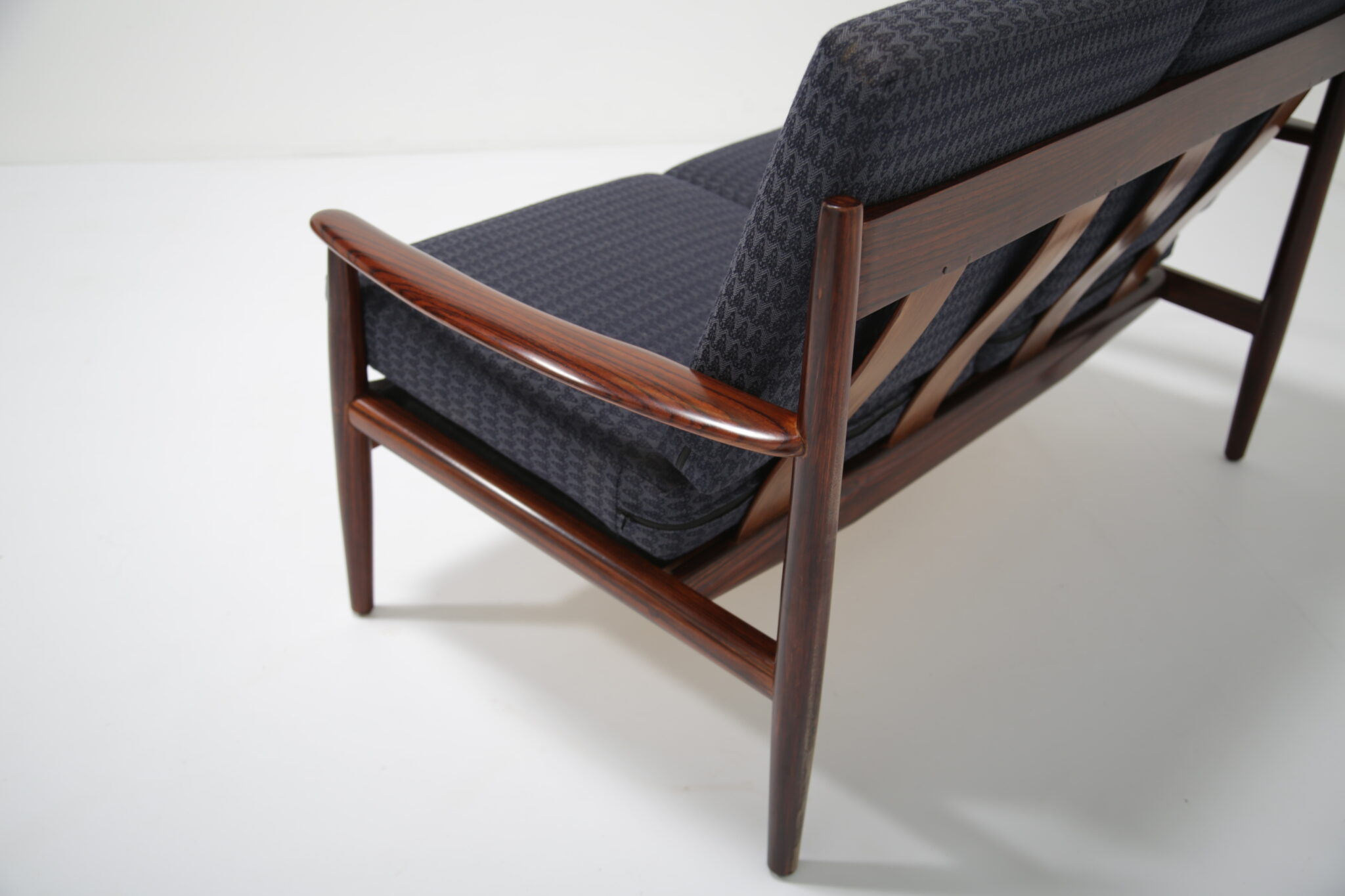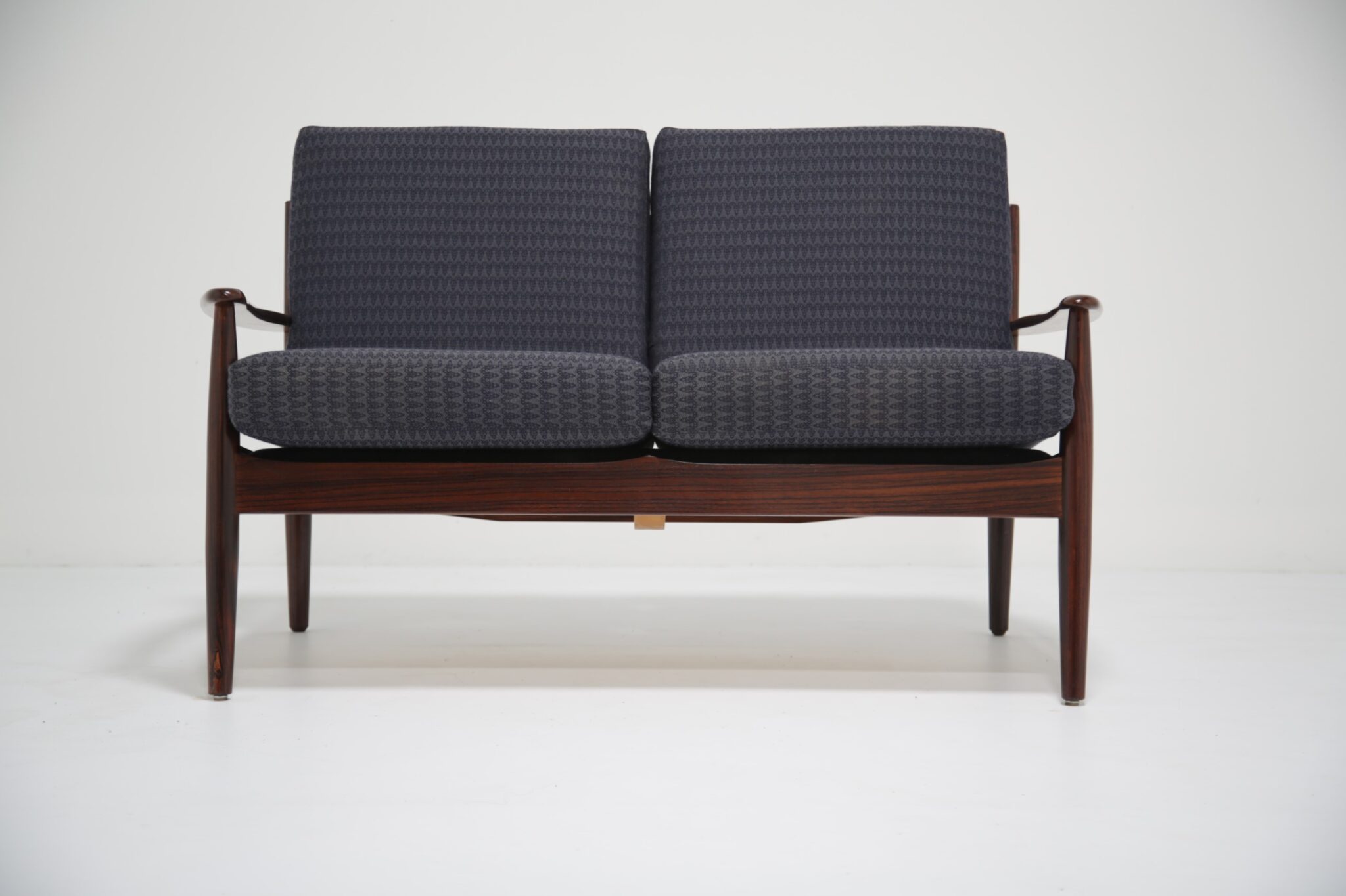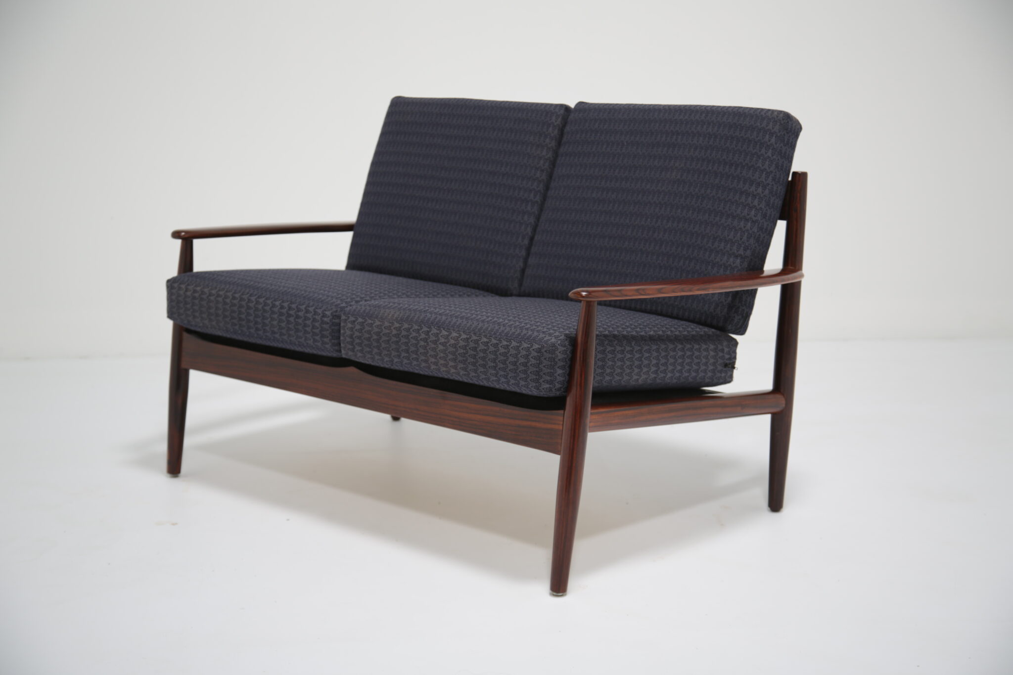 Danish Rosewood Coffee Table Attributed to Grete Jalk .This two-seat sofa is just stunning and a tribute to the timeless designs of Grete Jalk, skillfully capturing the essence of Danish modernism. Our restoration team has done a wonderful job restoring the frame of this sofa, bringing the lovely grain and darker tones of the rosewood. This sofa features gently curved back slats and rounded legs, characteristic of mid-century Scandinavian craftsmanship. The sofa’s sleek lines and warm wood tones bring elegance and sophistication to any space, while its compact profile makes it a versatile fit for various room layouts.