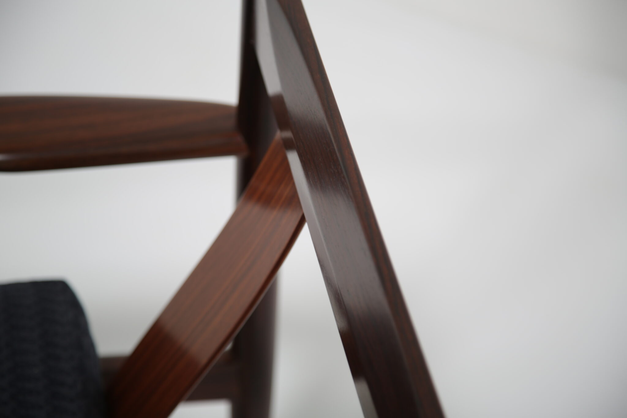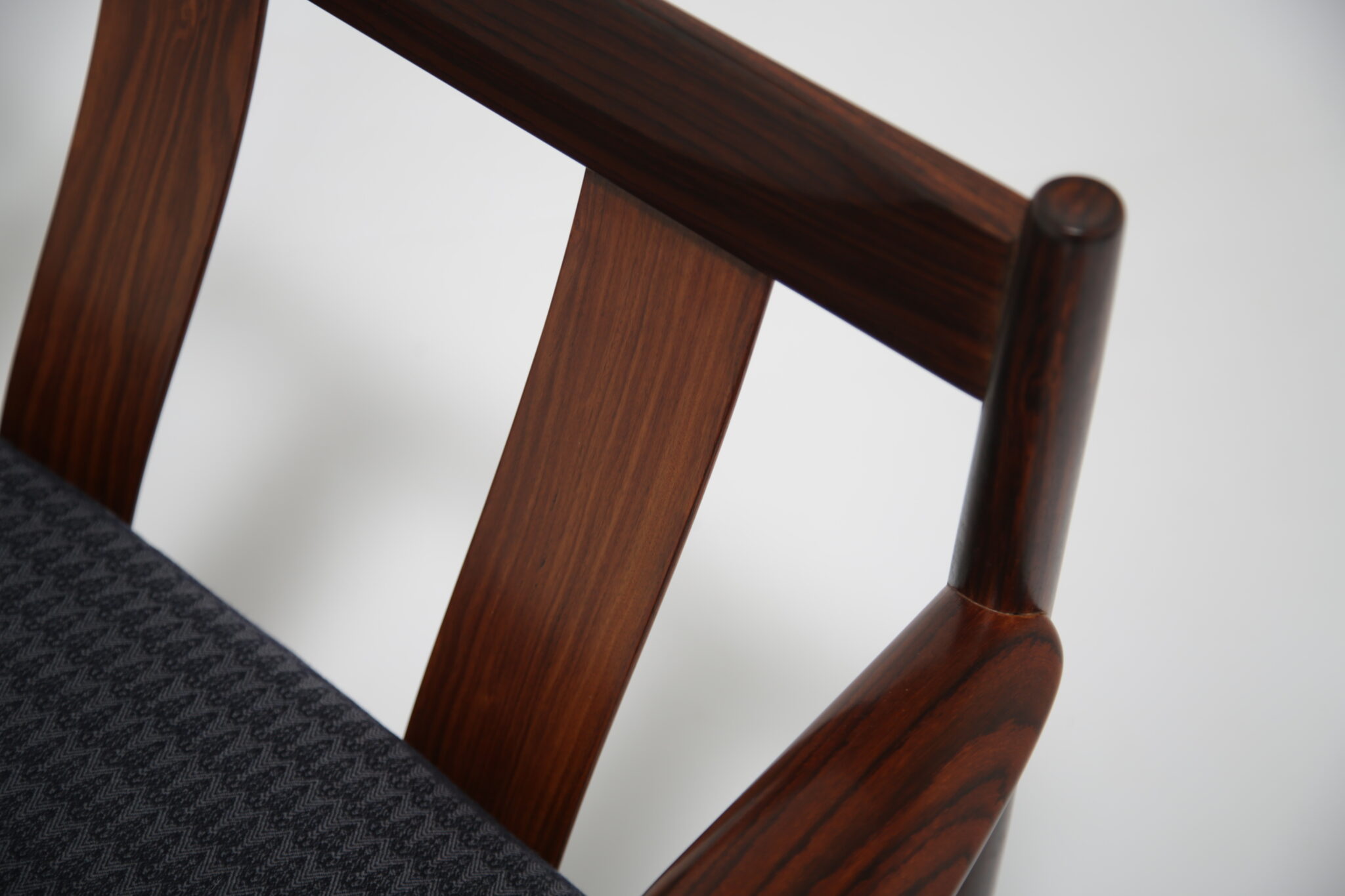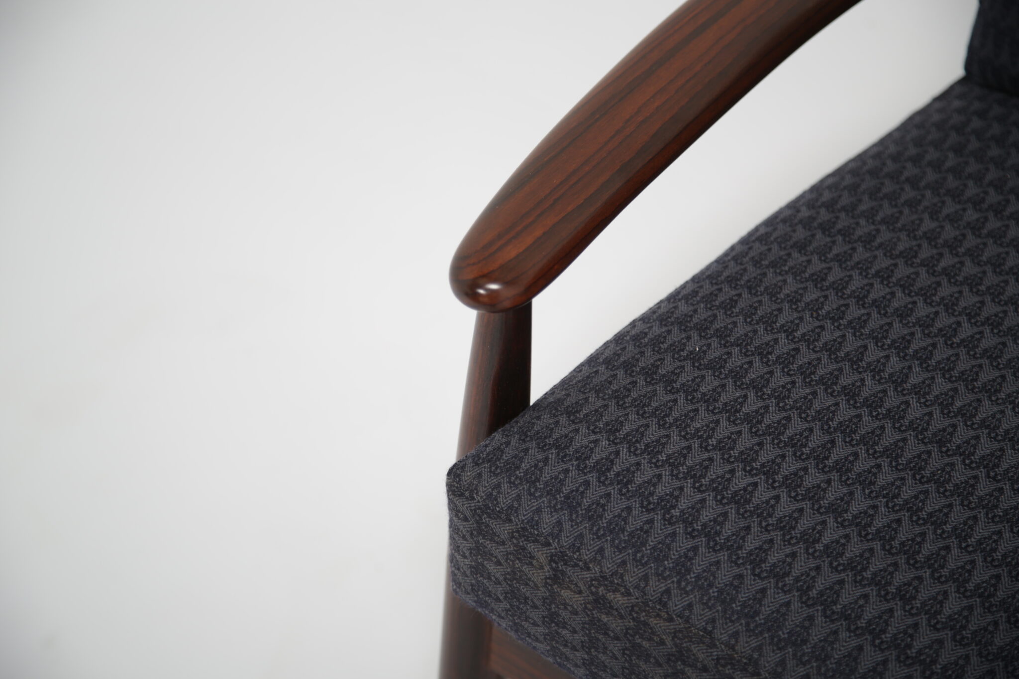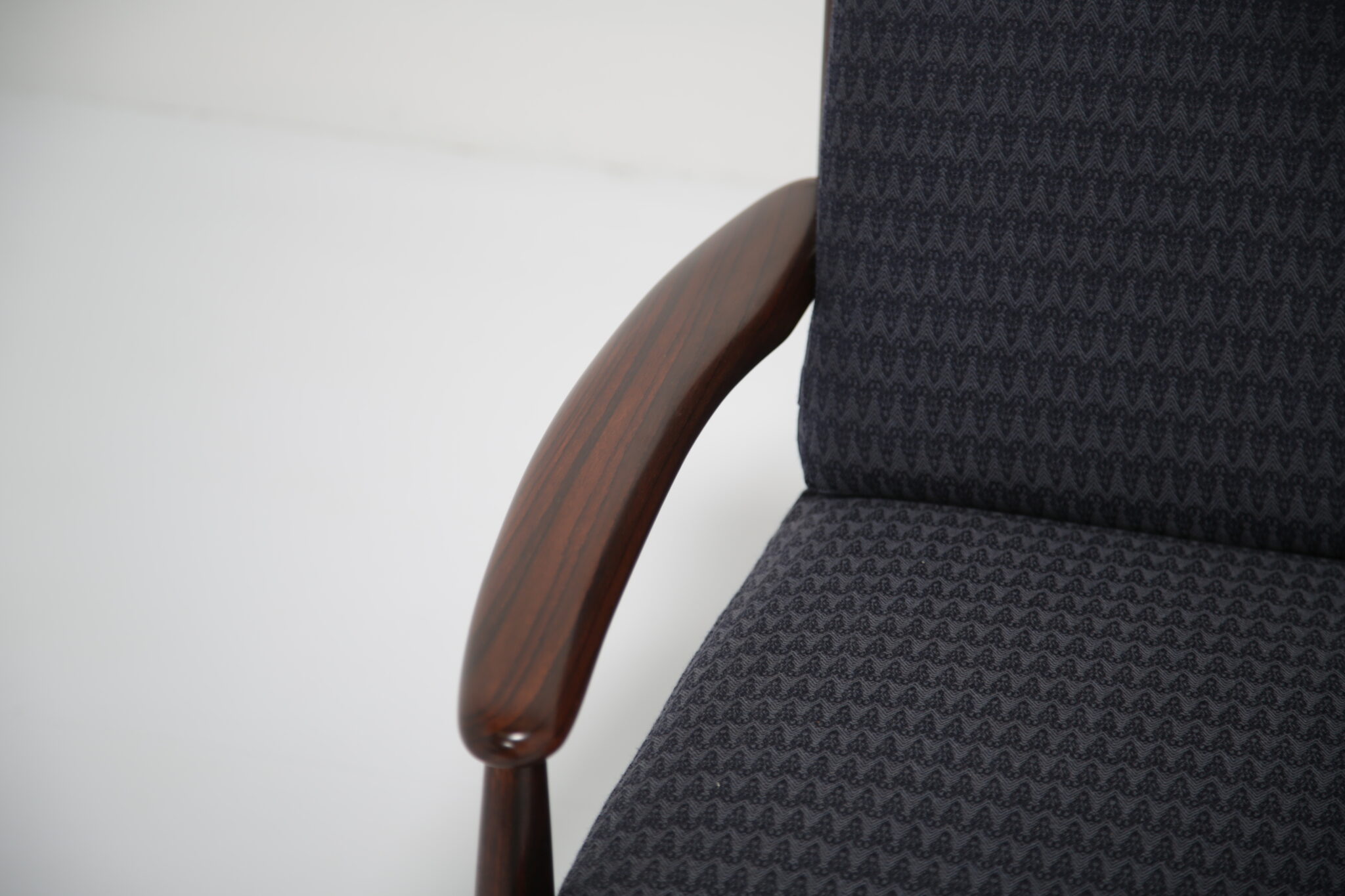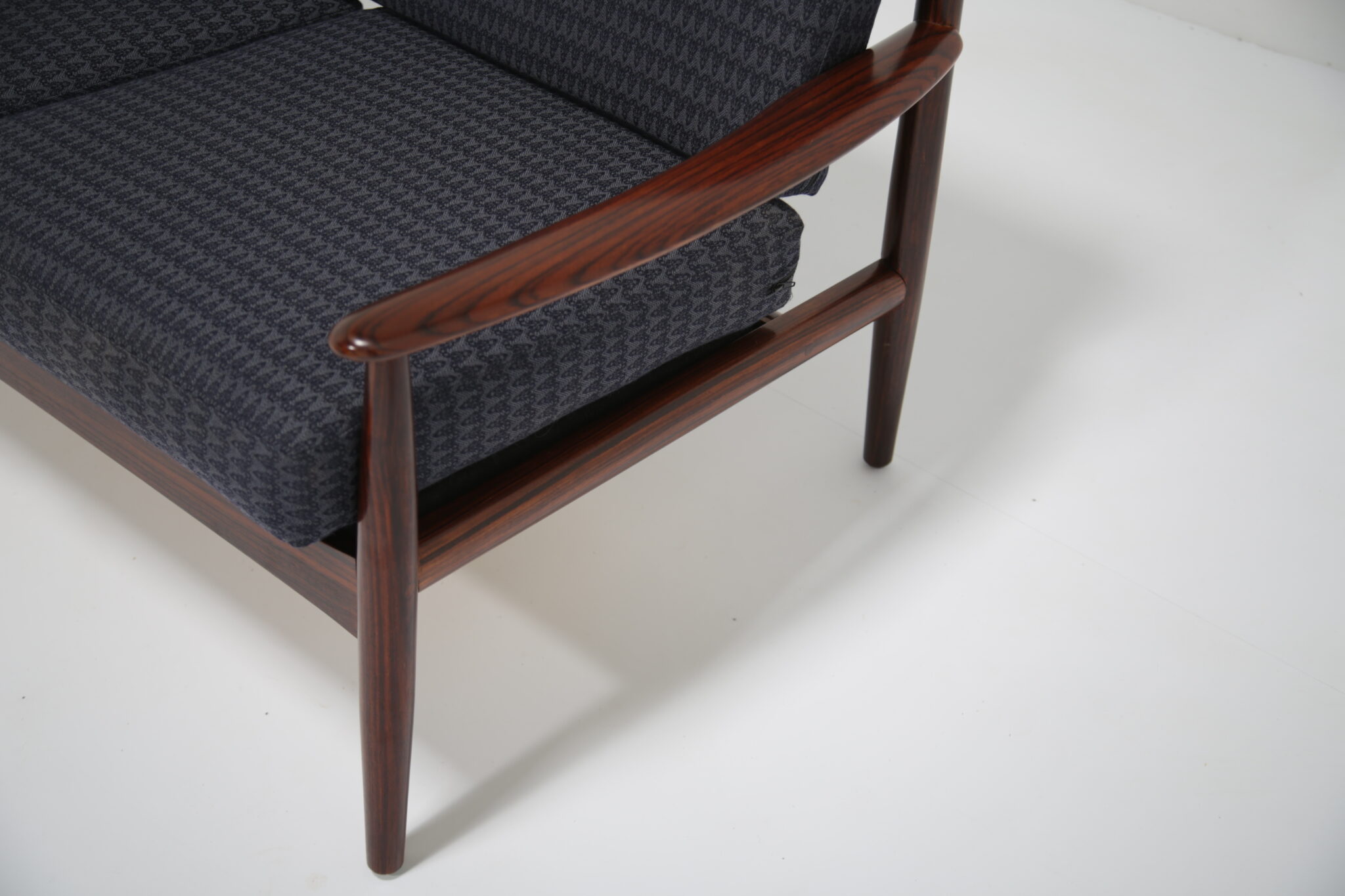 Upholstered in a lovely fabric that beautifully contrasts with the darker rosewood, this piece achieves a perfect balance between style and comfort.