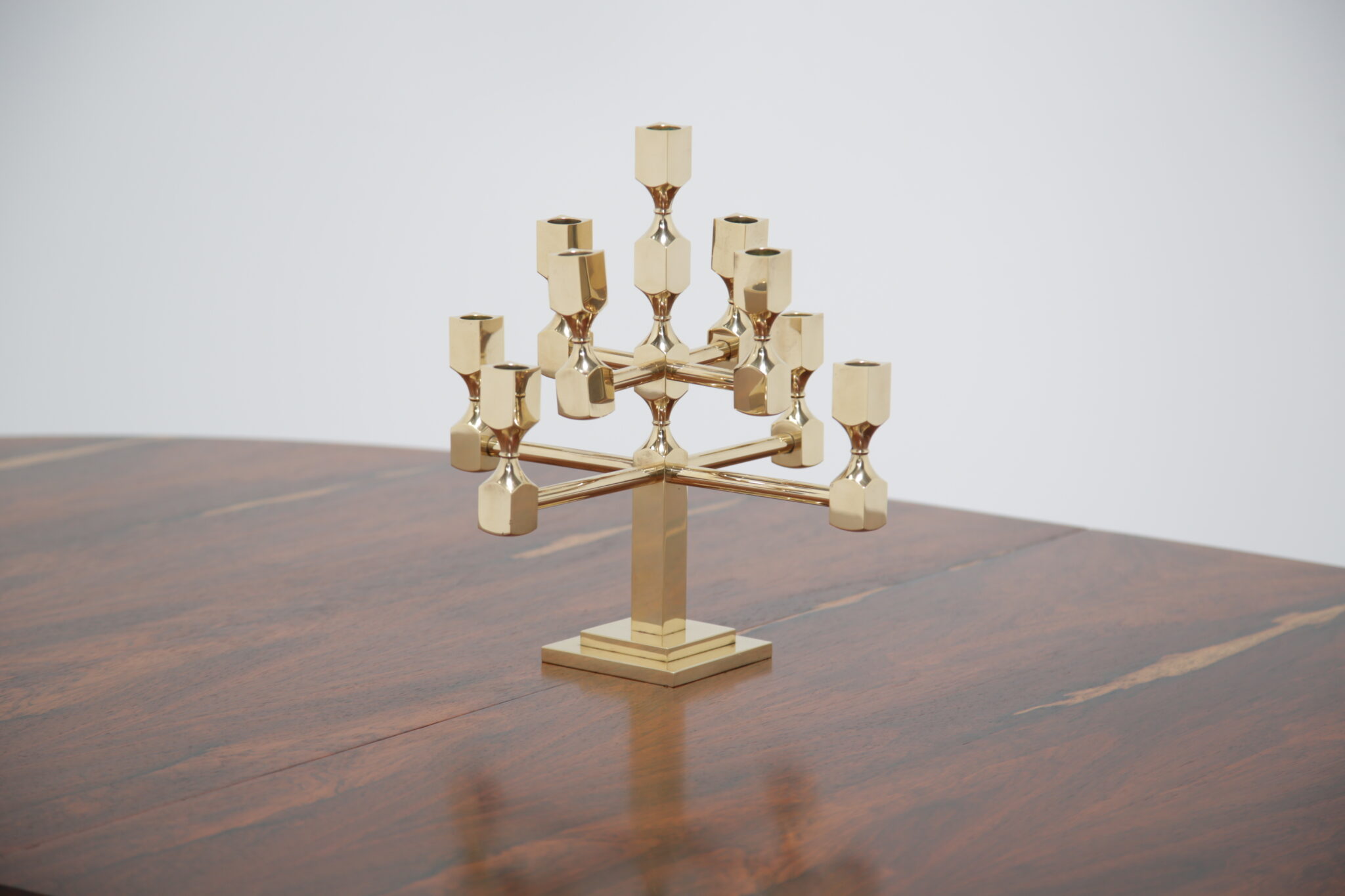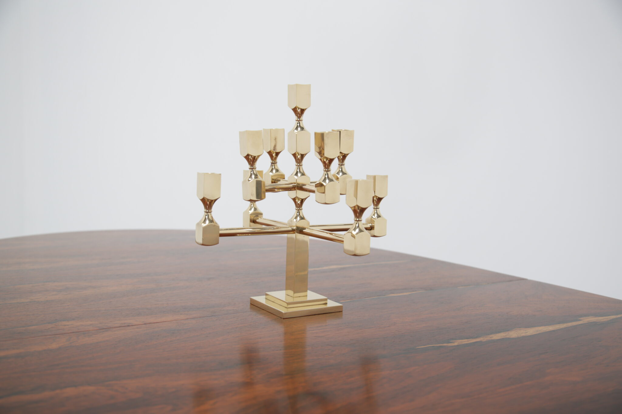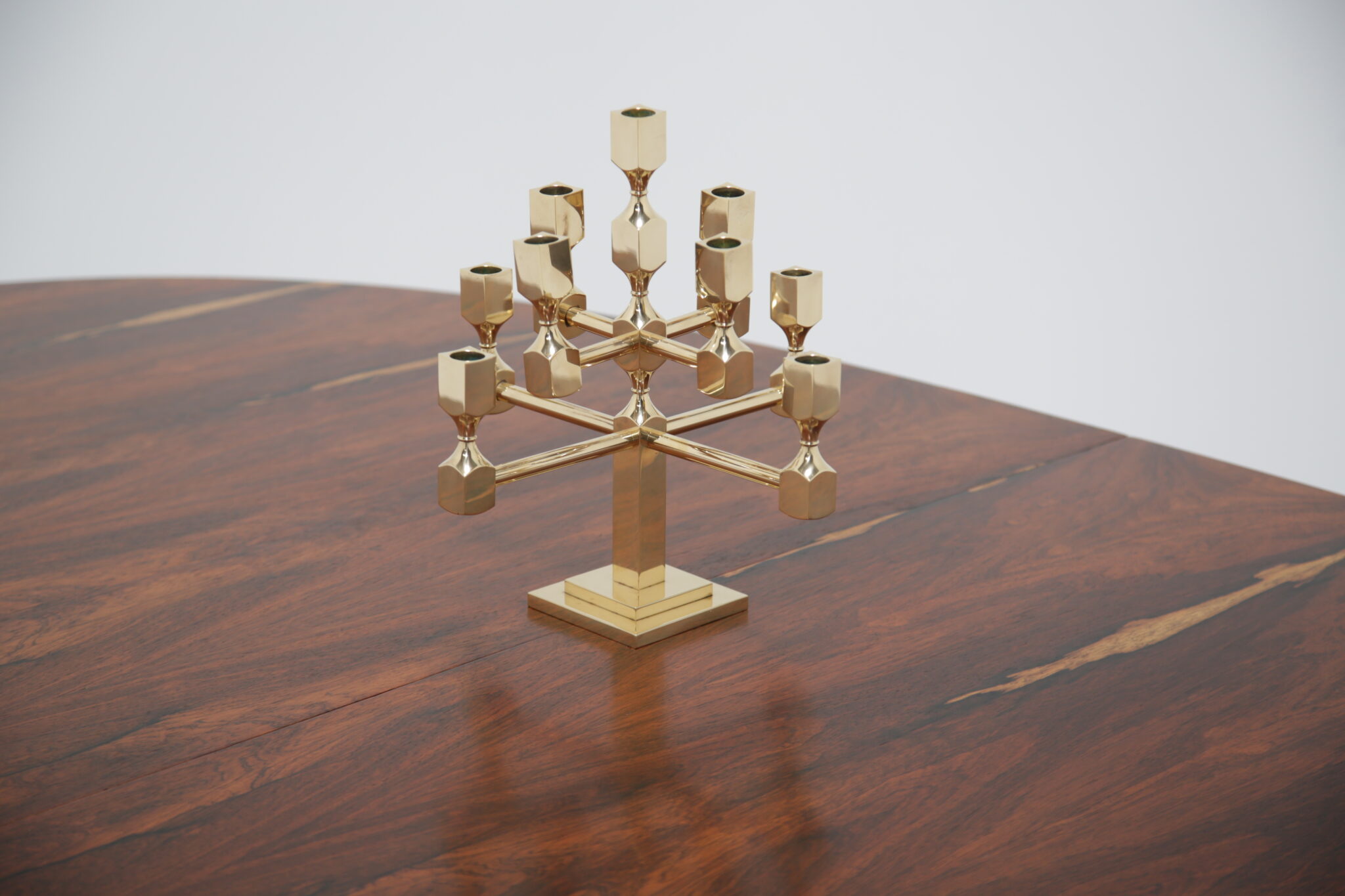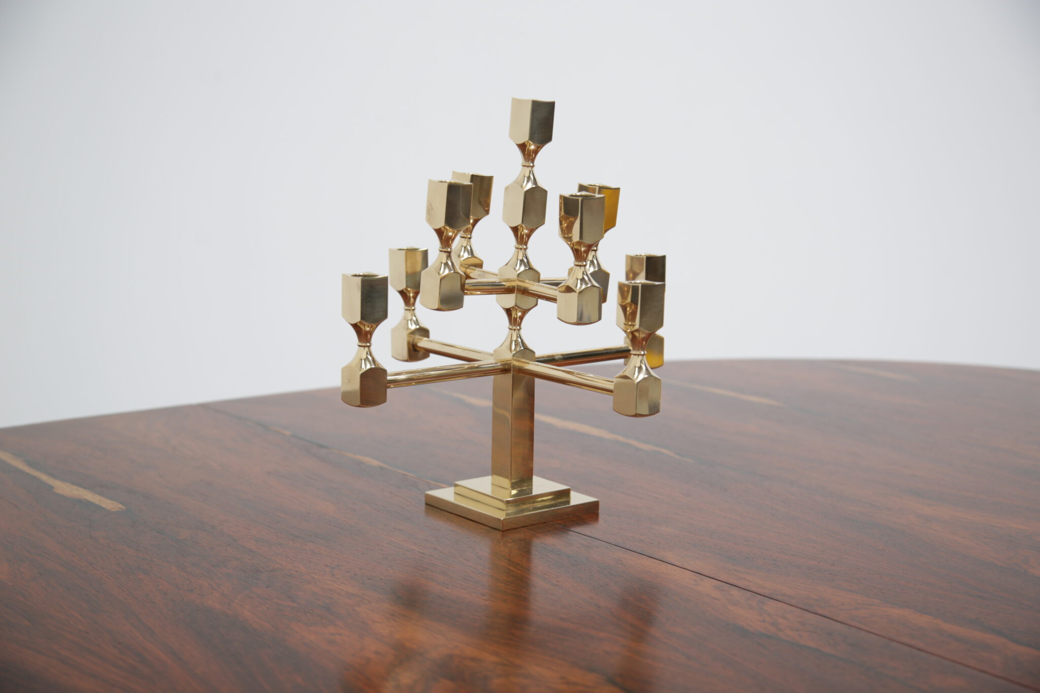 Vintage Brutalist Brass 9-Arm Candelabra – This heavy exquisite brass candelabra is absolutely stunning from every angle. Featuring 9 holders for candles, it is the perfect central item on your dining room table. It stands on a stepped double square based, with turned holders and rounded arms. Brutalist style. Designed by the Swedish designer Lars Bergsten for Gusum Metalworks in 1982. Signed and stamped on base.
