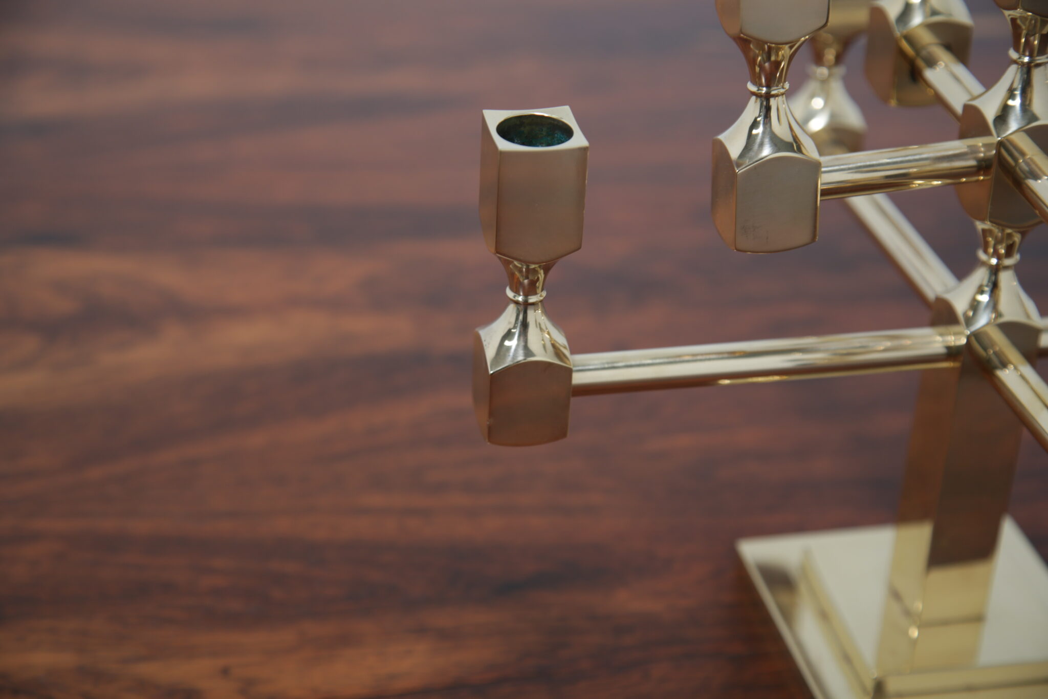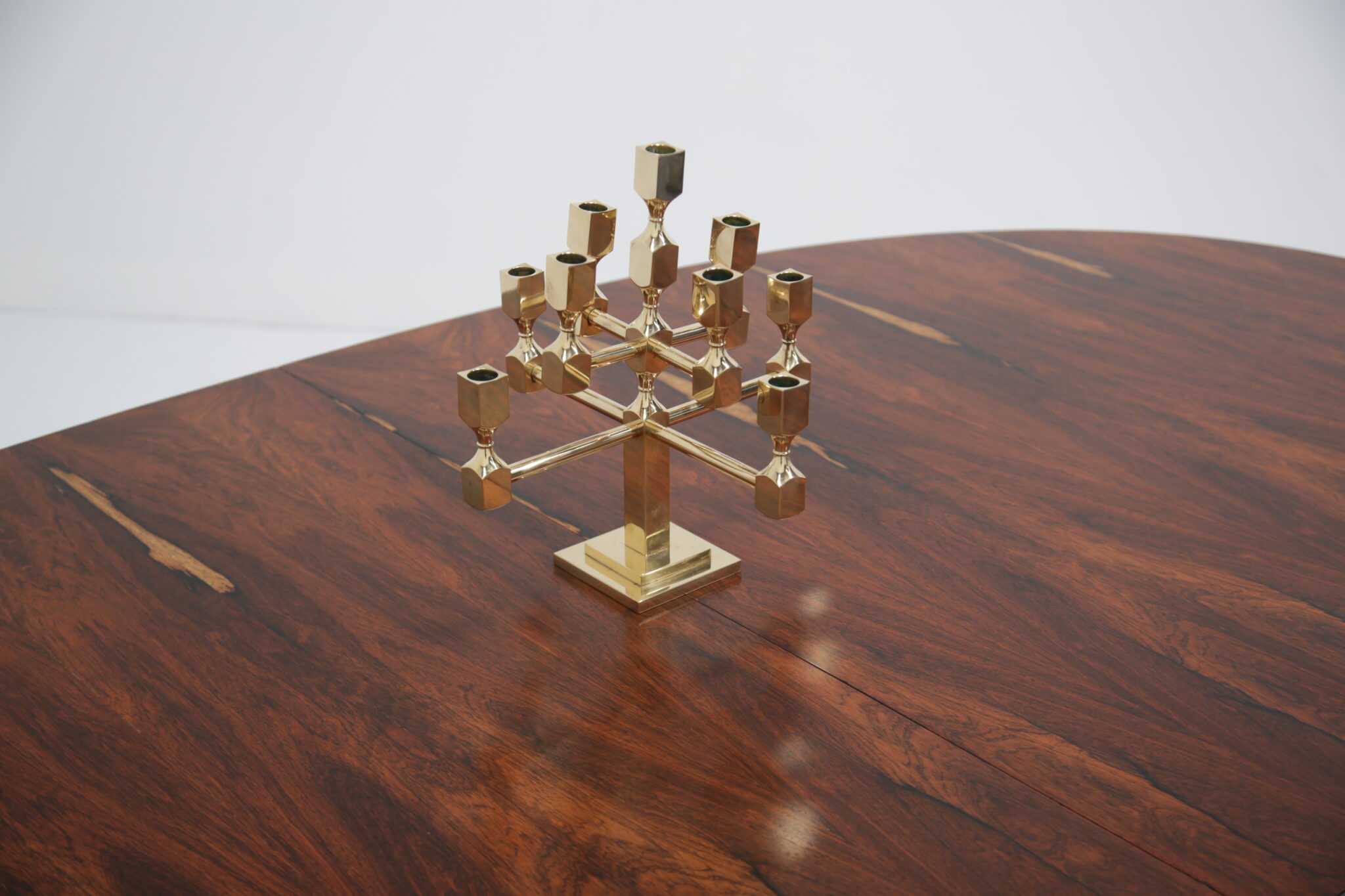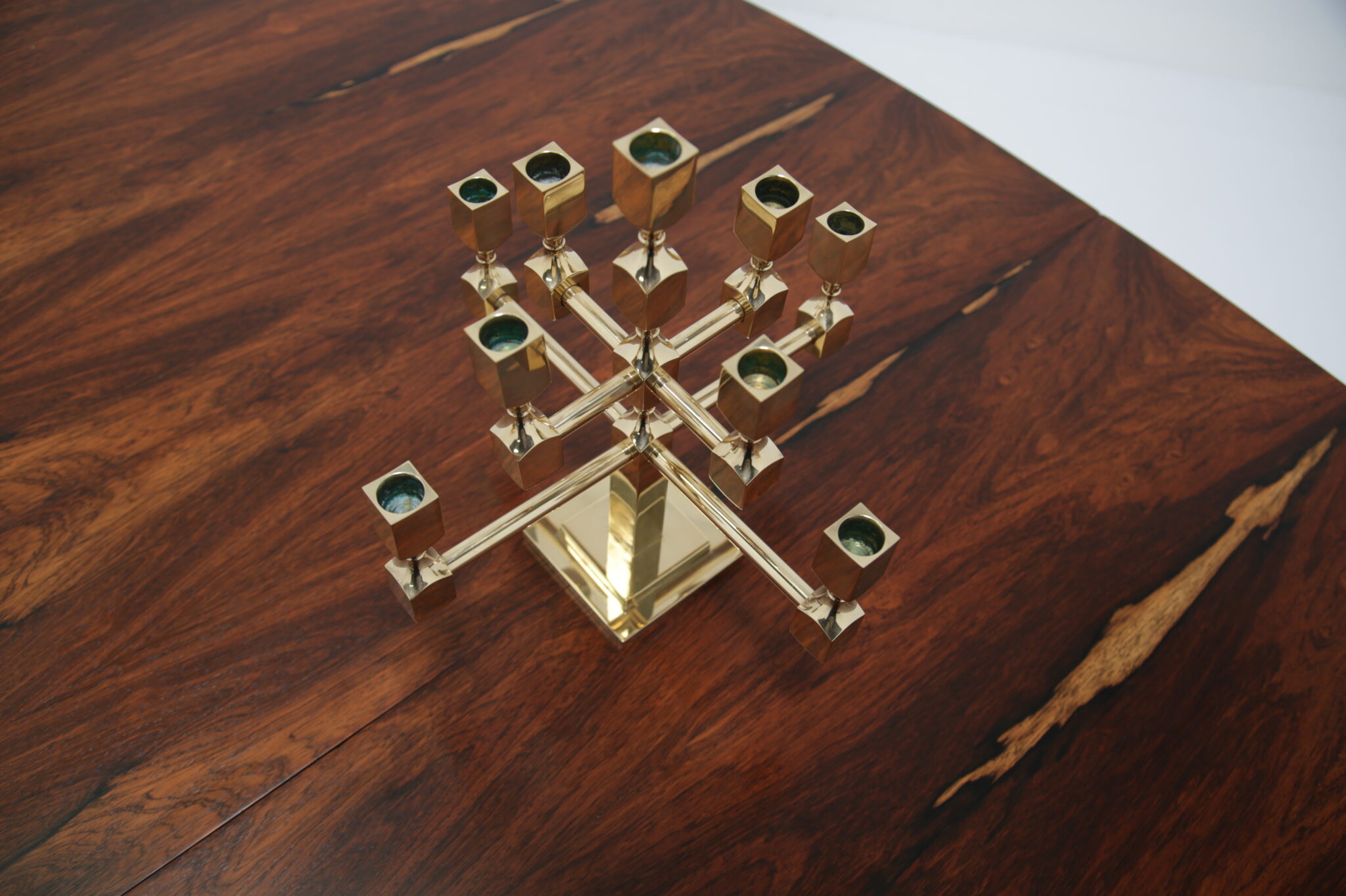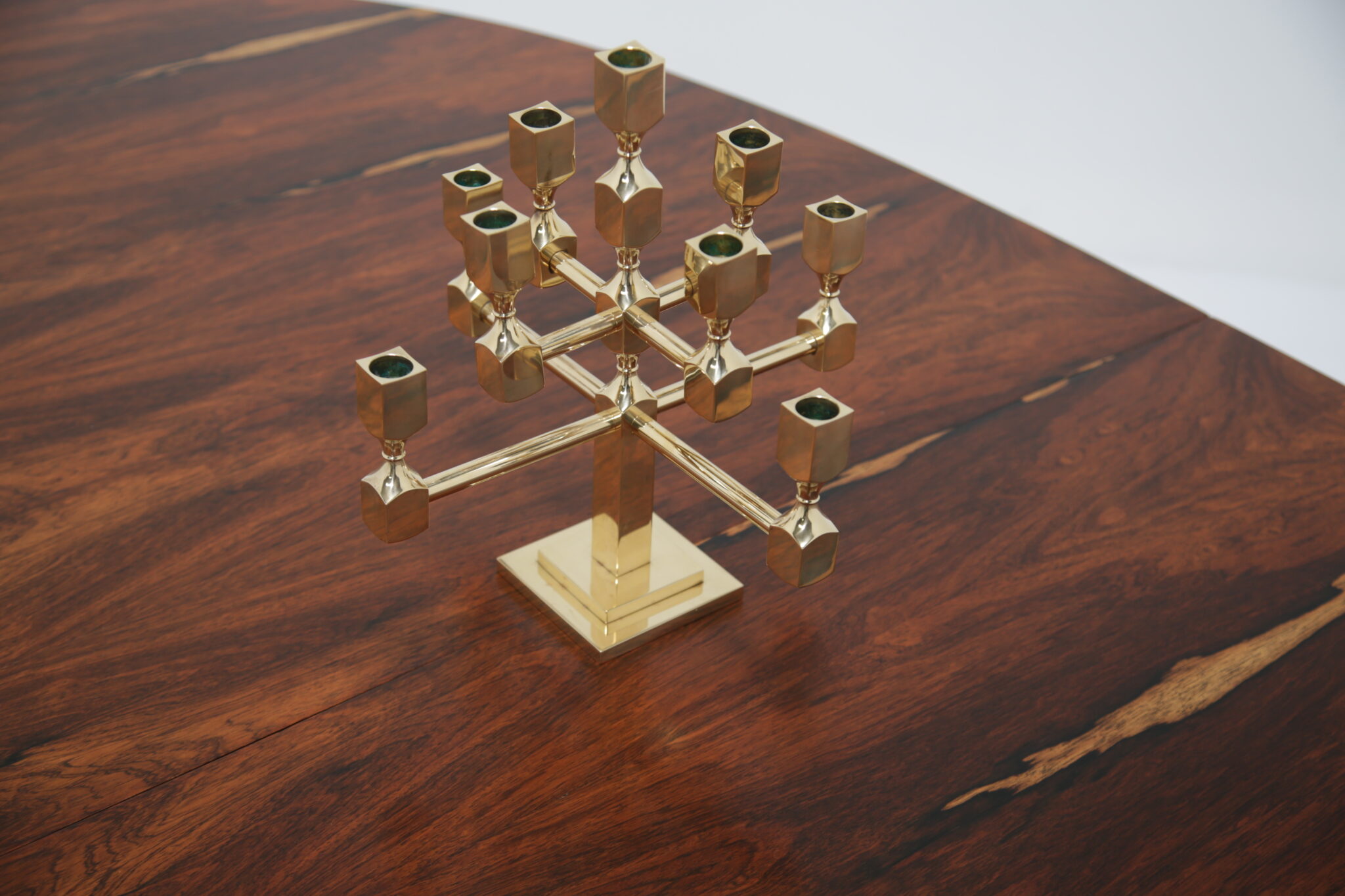Vintage Brutalist Brass 9-Arm Candelabra – This heavy exquisite brass candelabra is absolutely stunning from every angle. Featuring 9 holders for candles, it is the perfect central item on your dining room table. It stands on a stepped double square based, with turned holders and rounded arms. Brutalist style. Designed by the Swedish designer Lars Bergsten for Gusum Metalworks in 1982. Signed and stamped on base.