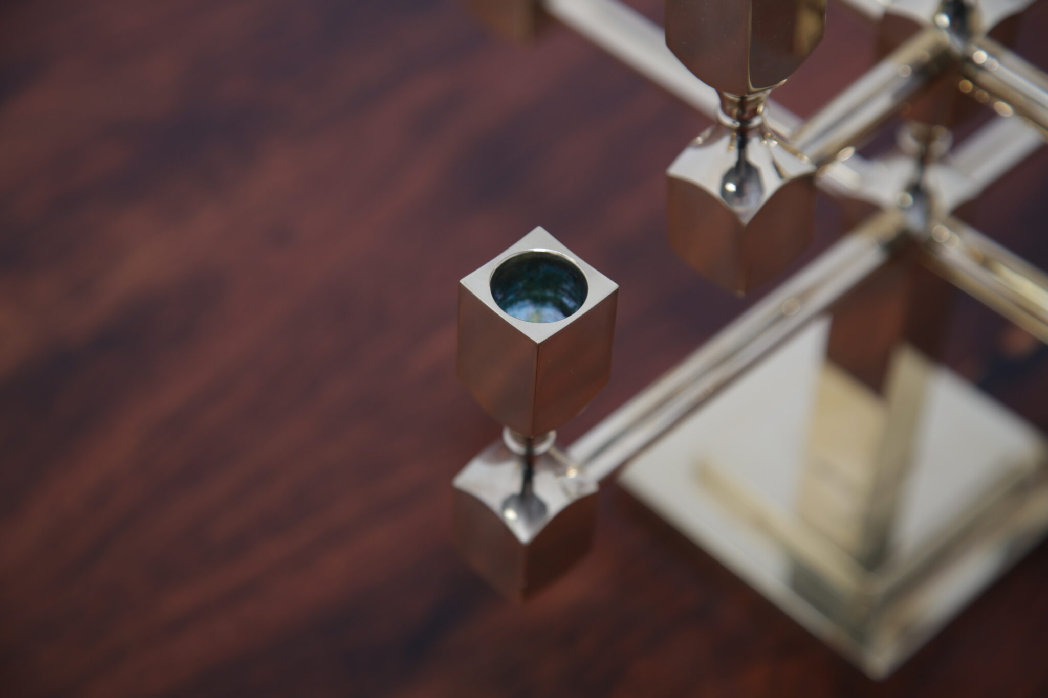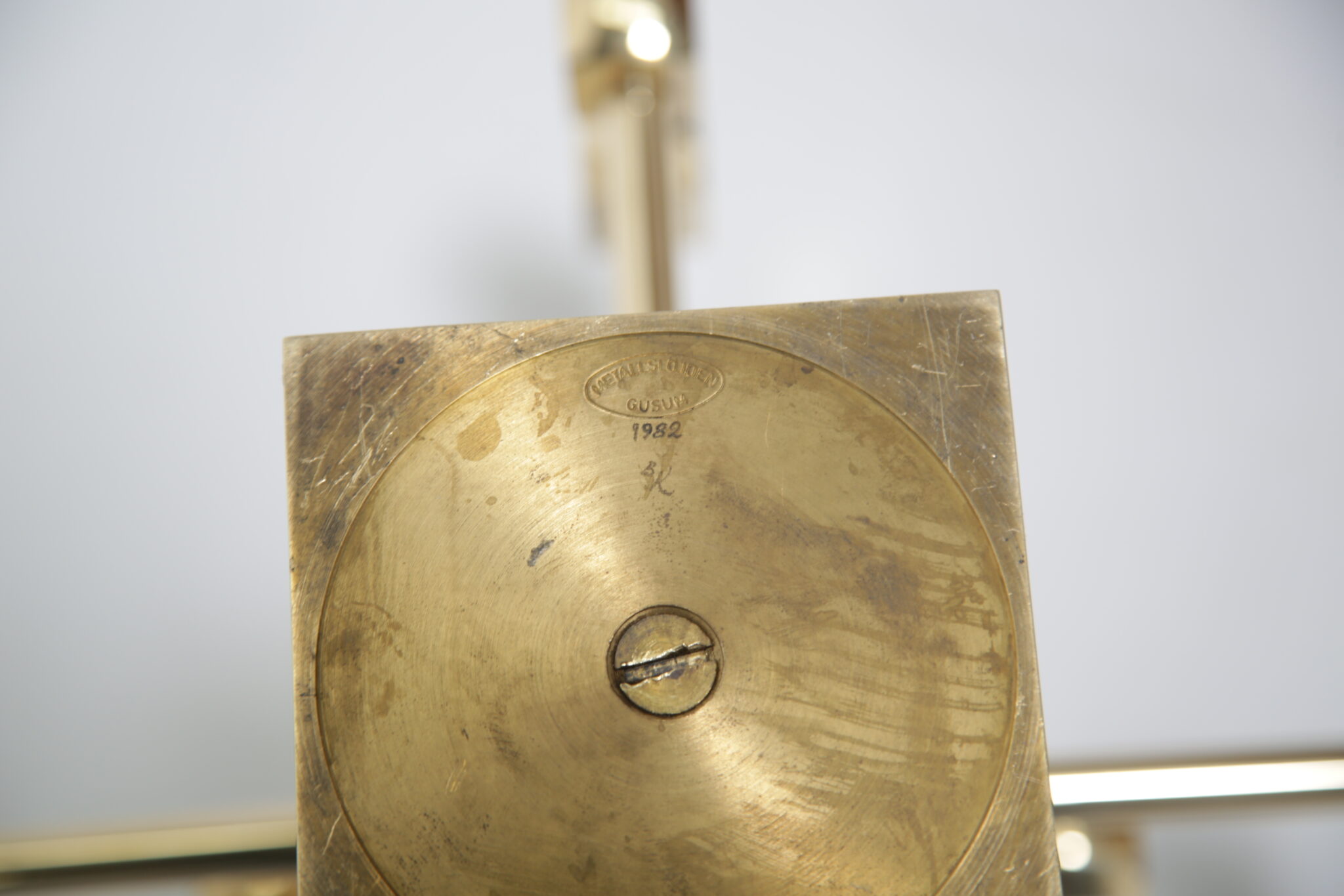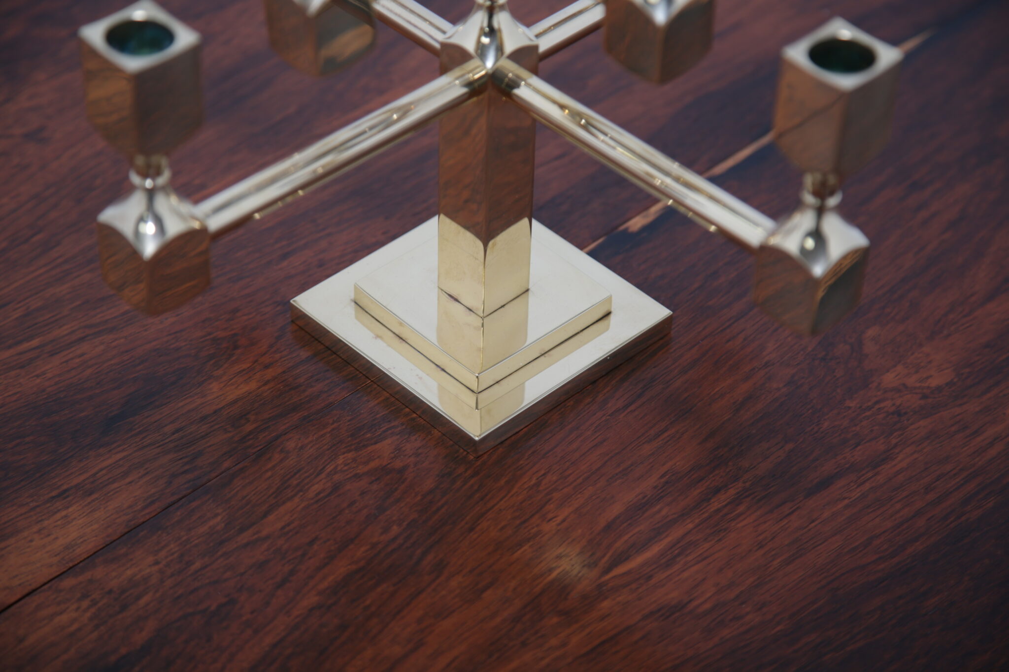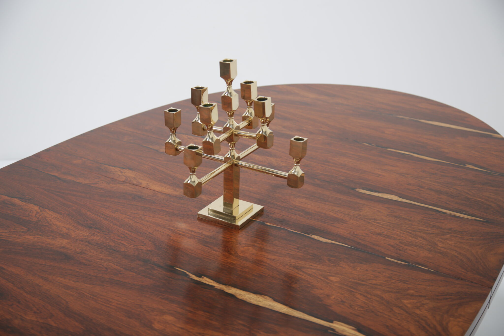 Vintage Brutalist Brass 9-Arm Candelabra – This heavy exquisite brass candelabra is absolutely stunning from every angle. Featuring 9 holders for candles, it is the perfect central item on your dining room table. It stands on a stepped double square based, with turned holders and rounded arms. Brutalist style. Designed by the Swedish designer Lars Bergsten for Gusum Metalworks in 1982. Signed and stamped on base.