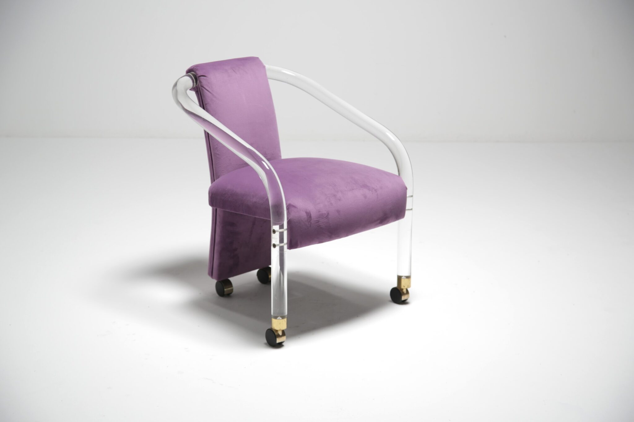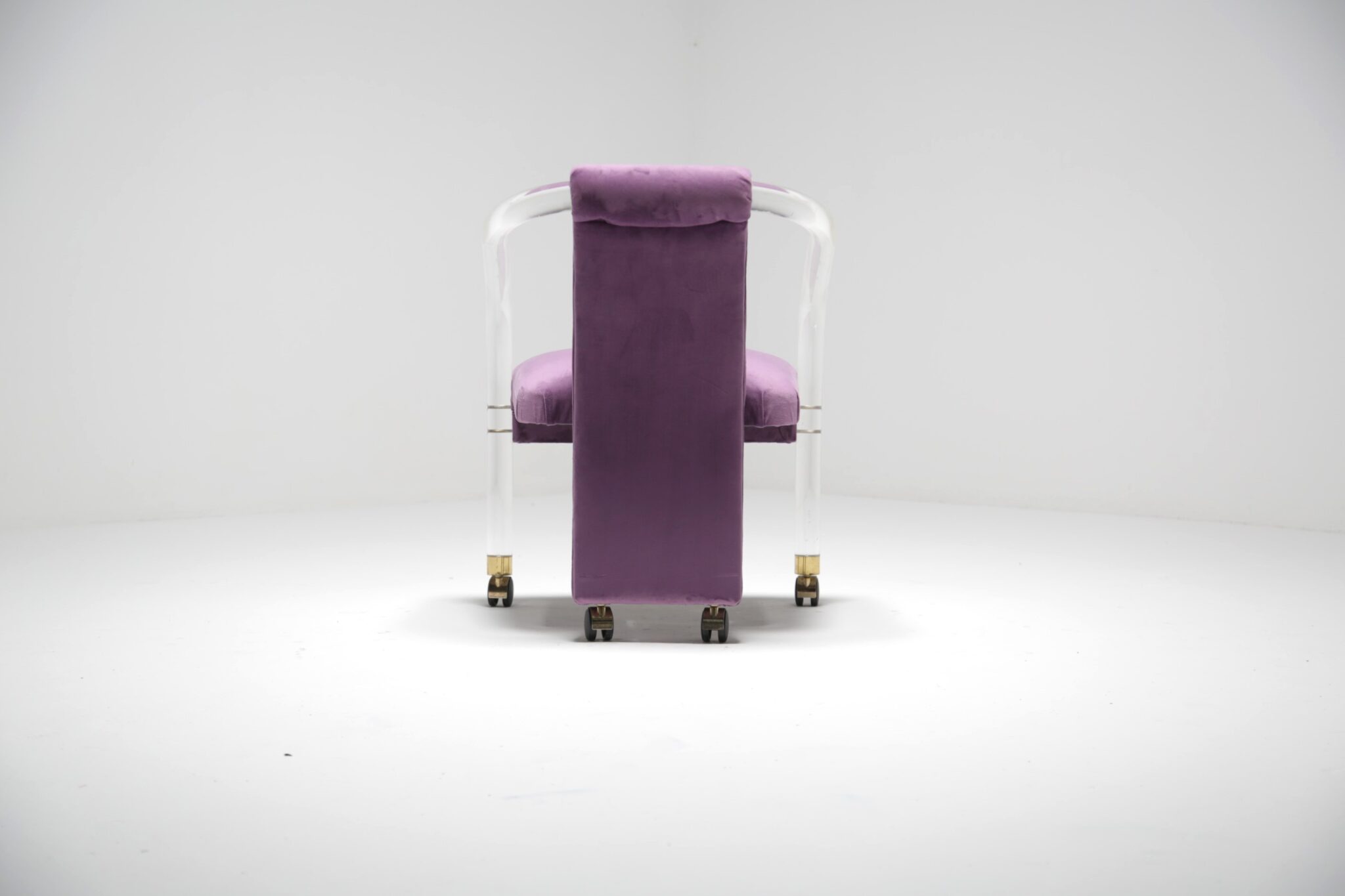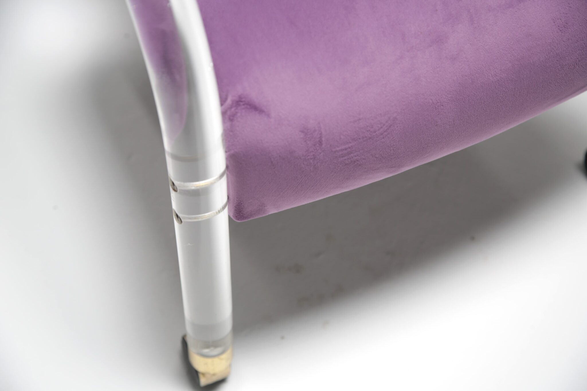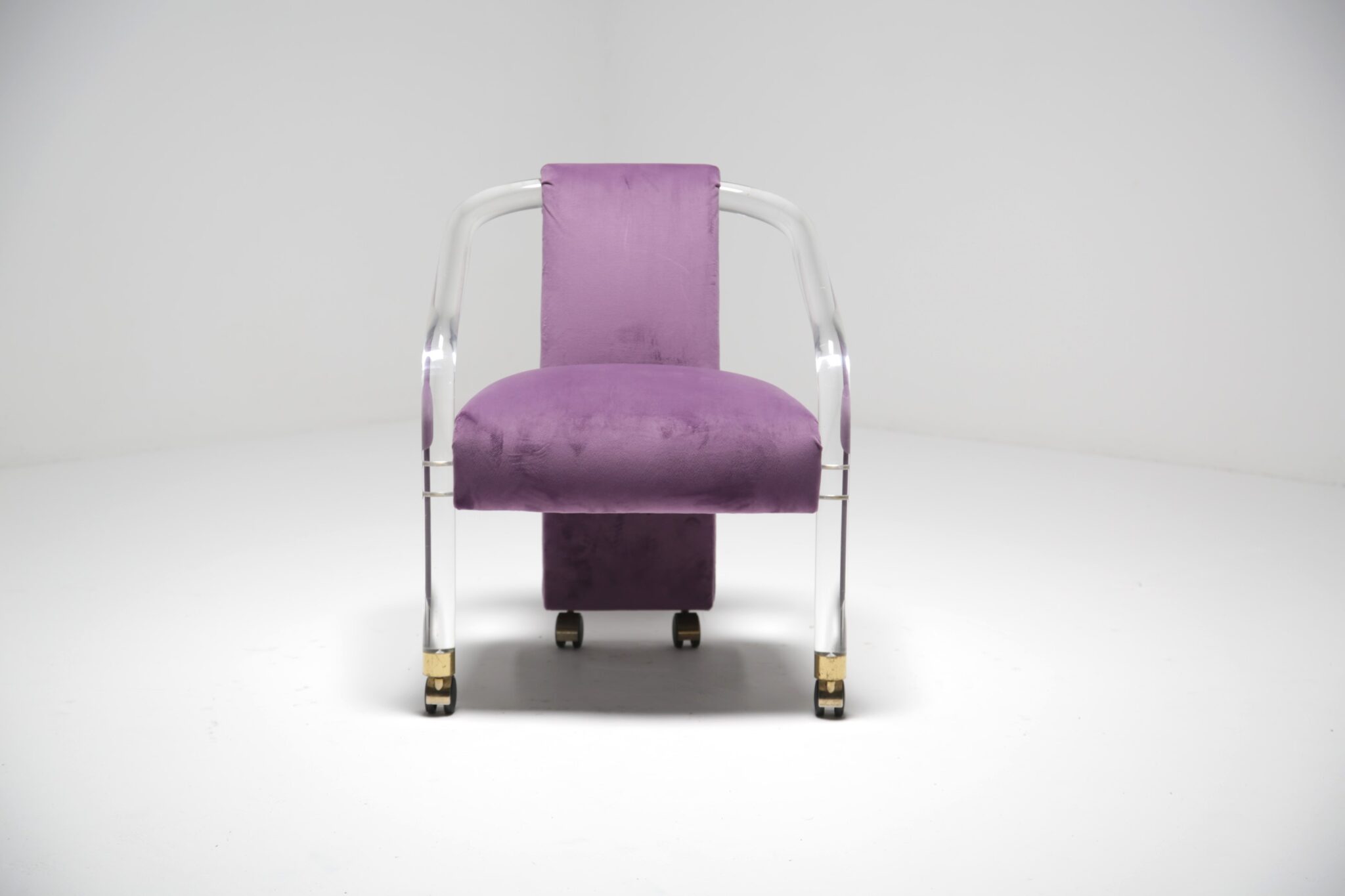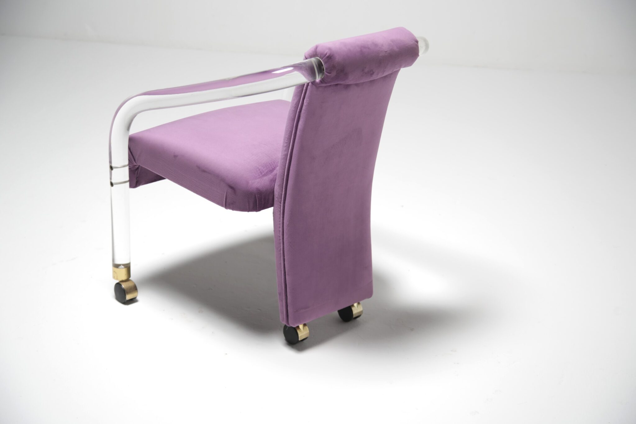 Experience timeless elegance with our Vintage Lucite and Purple Velvet Armchair, designed by Charles Hollis Jones in the 1970s. Crafted from solid tubular lucite. This chair boasts a plush purple velvet upholstery and gold-colored wheels. It is a blending mid-century modern design with luxurious comfort.