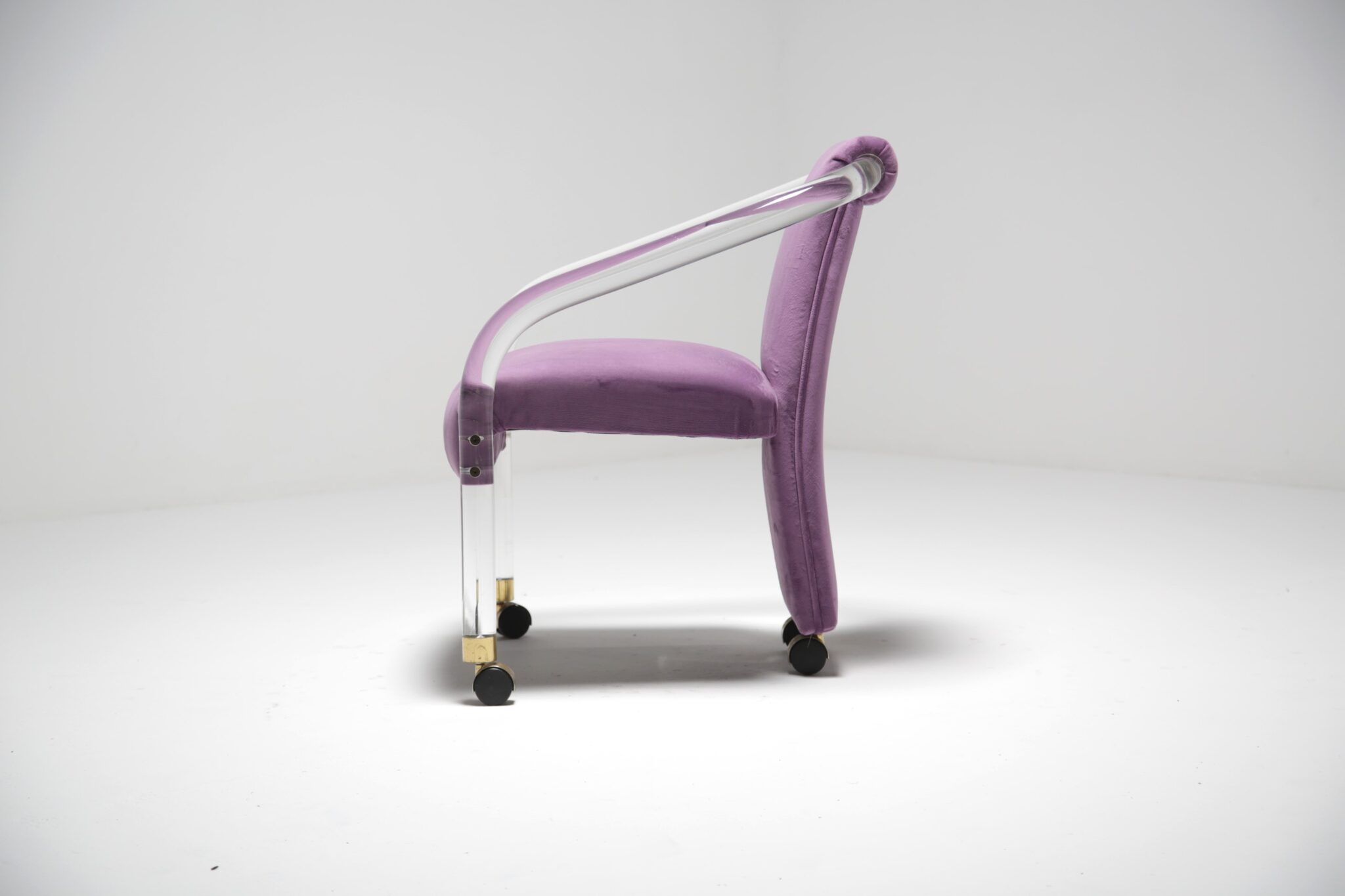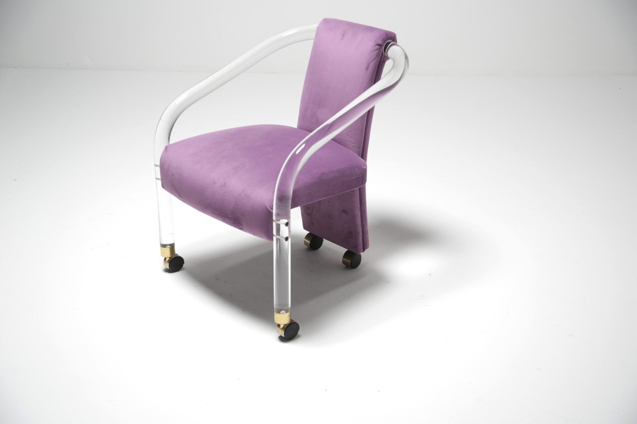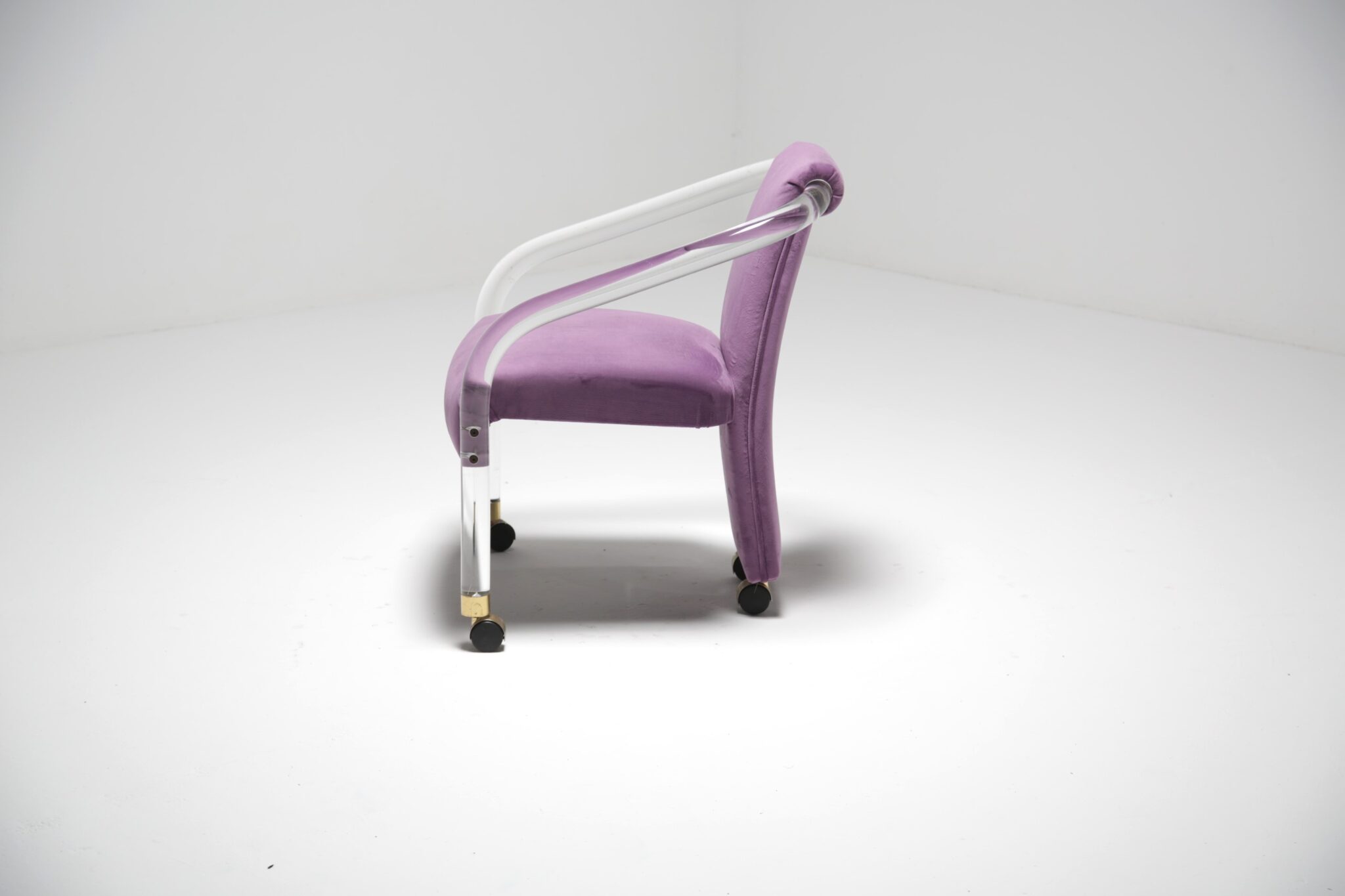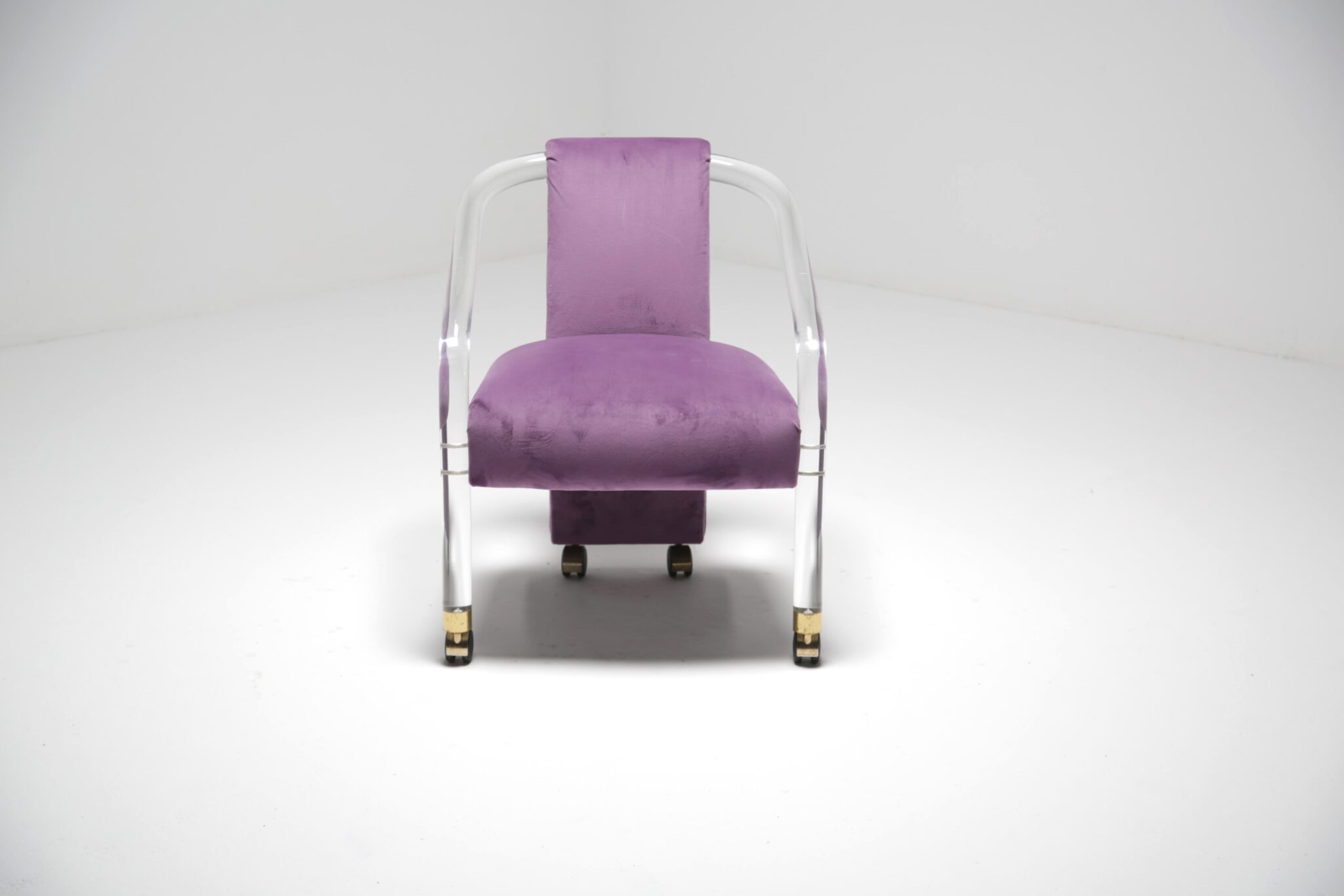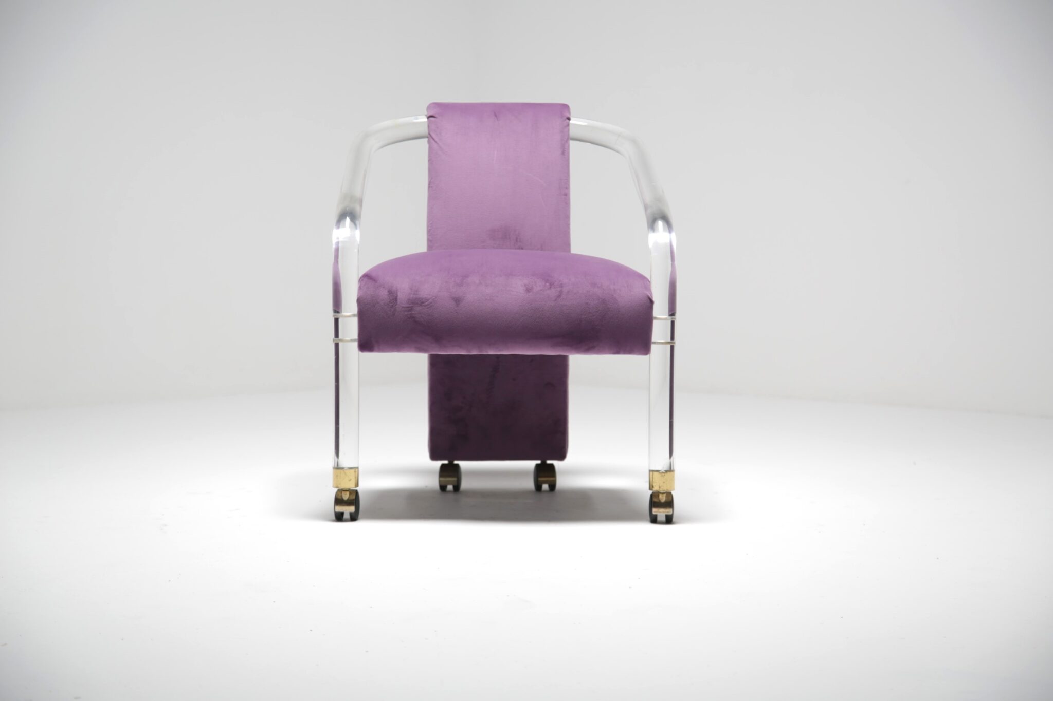 Experience timeless elegance with our Vintage Lucite and Purple Velvet Armchair, designed by Charles Hollis Jones in the 1970s. Crafted from solid tubular lucite. This chair boasts a plush purple velvet upholstery and gold-colored wheels. It is a blending mid-century modern design with luxurious comfort.