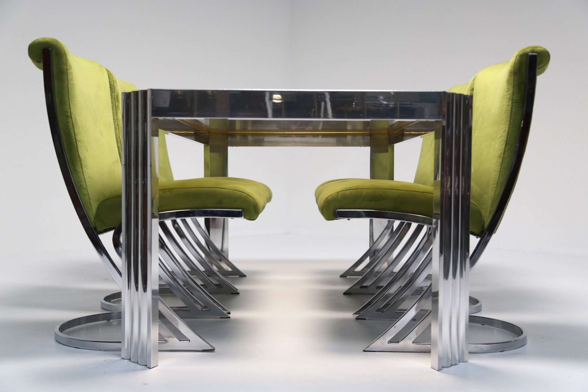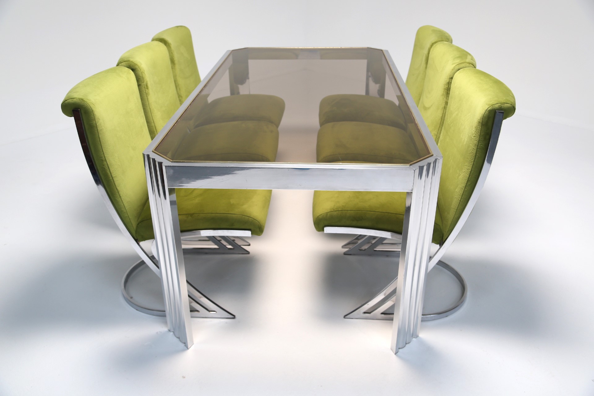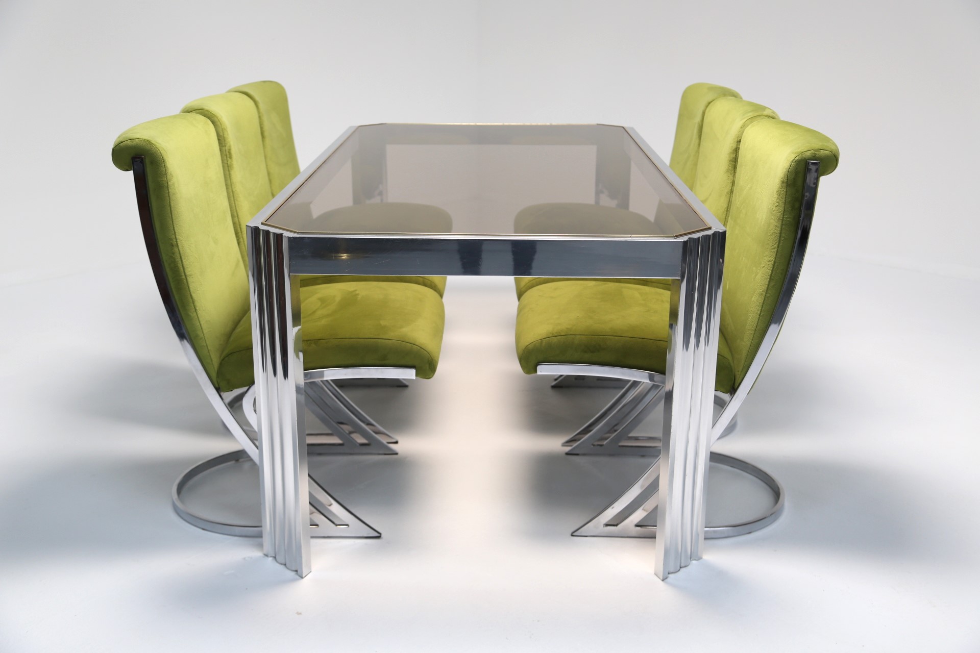 This striking vintage dining table dates to the 1970s and is a superb example of the era’s fascination with modern materials and bold geometry. It features a smoked glass top with subtly rounded corners, resting on a polished chrome frame. The standout feature is undoubtedly the fluted detailing on the corners of the legs, a clear nod to the Art Deco movement of the 1930s. The overall silhouette is clean and minimal, but with just enough decorative flair to command attention. With its reflective chrome base and soft bronze hue in the glass, this piece pairs beautifully with both vintage and contemporary dining chairs. Perfect for a glamorous city apartment or a statement dining space.