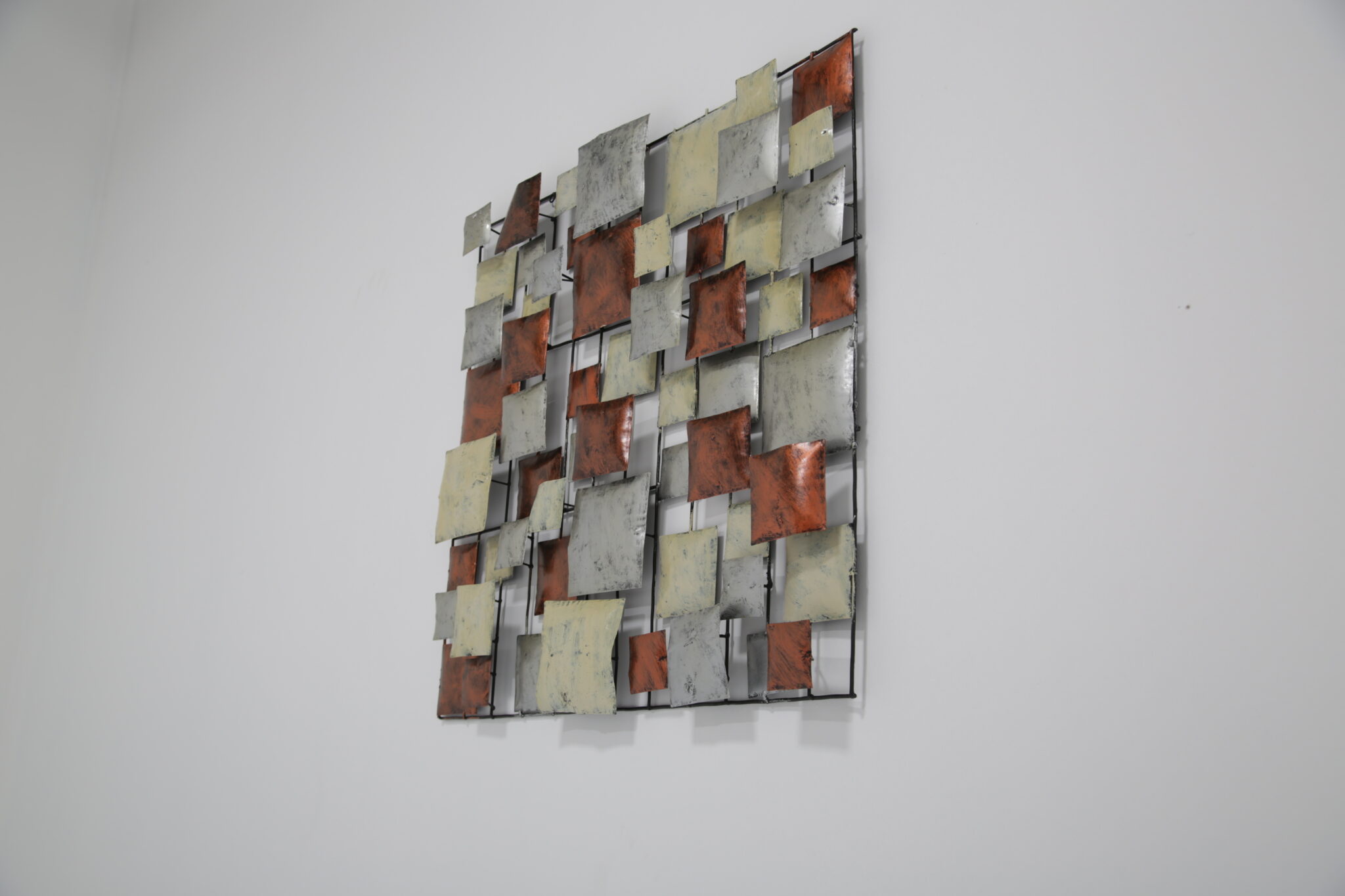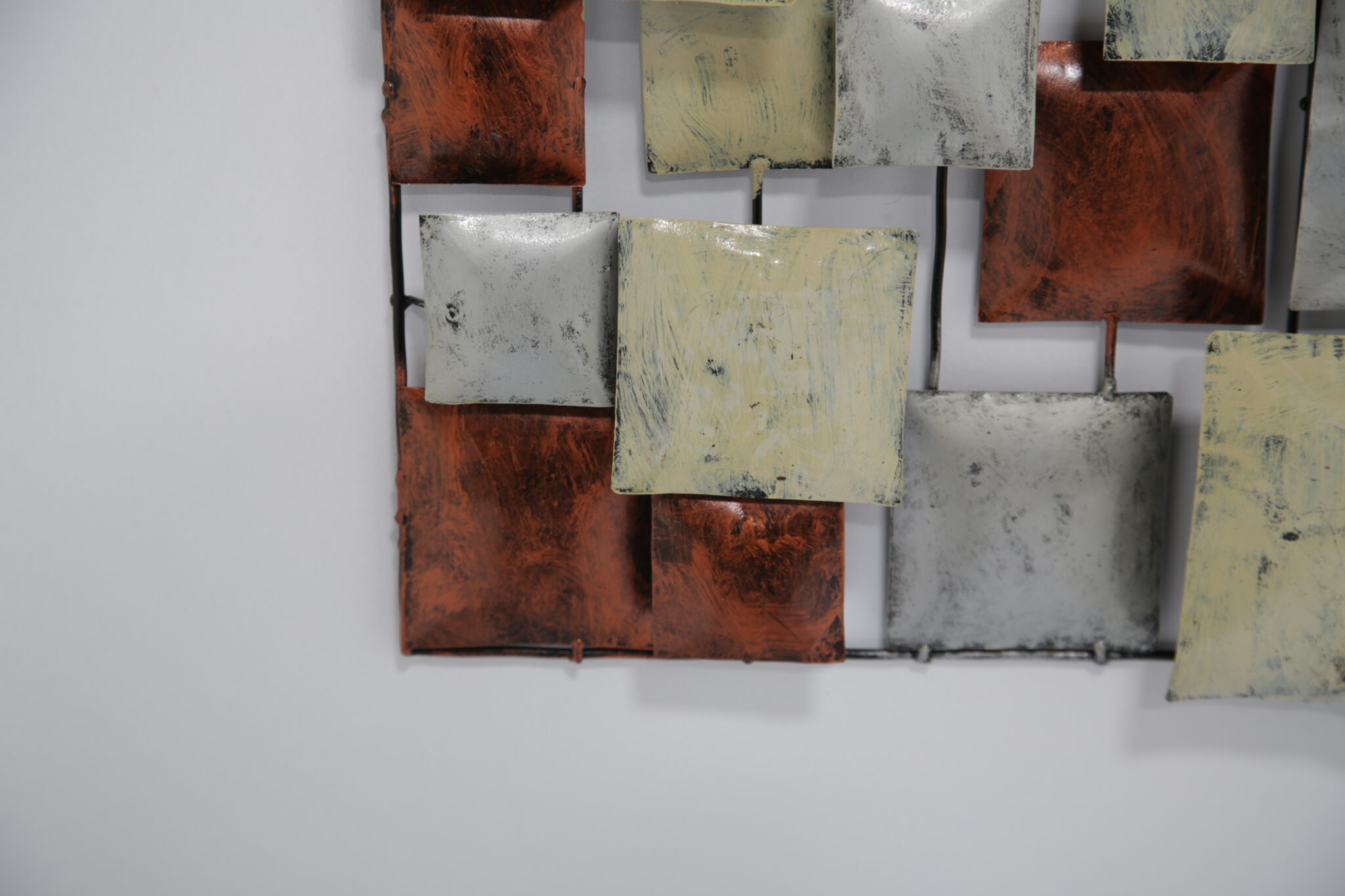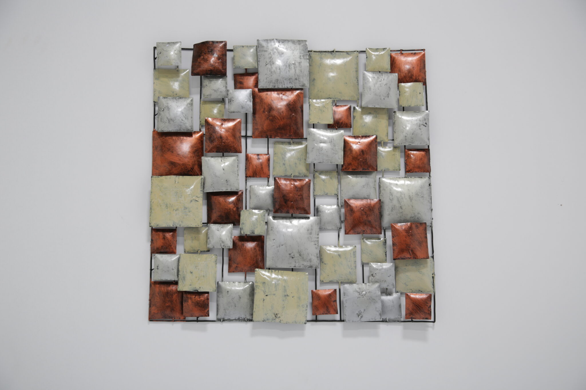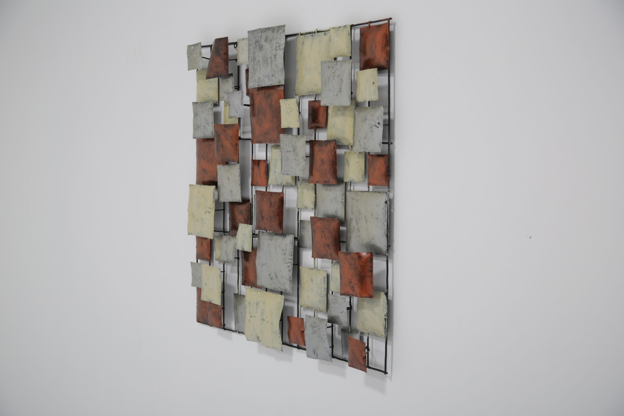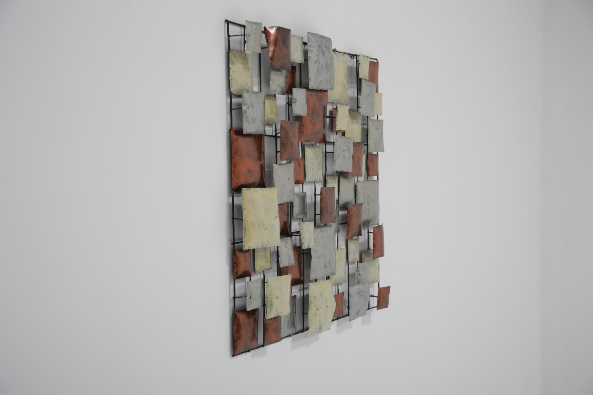 A striking mid-century Brutalist wall sculpture, handcrafted in the United States during the 70-80s. This piece features a dynamic grid of three-dimensional, enamel-coated metal squares in layered hues of copper, cream, and silvery grey. The textured, oxidized finishes give it a bold industrial feel, while the asymmetrical composition offers a rhythmic, architectural quality reminiscent of Paul Evans and Curtis Jere.