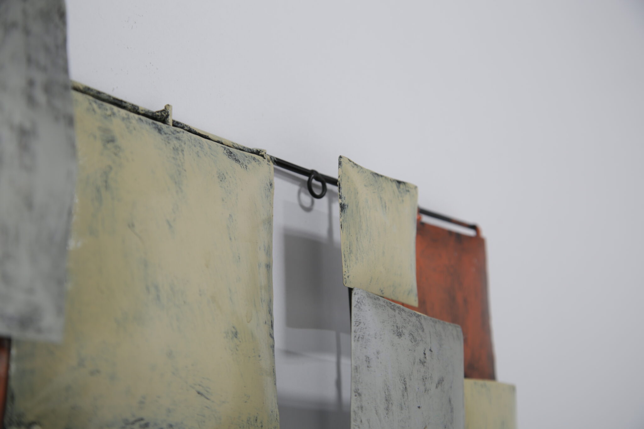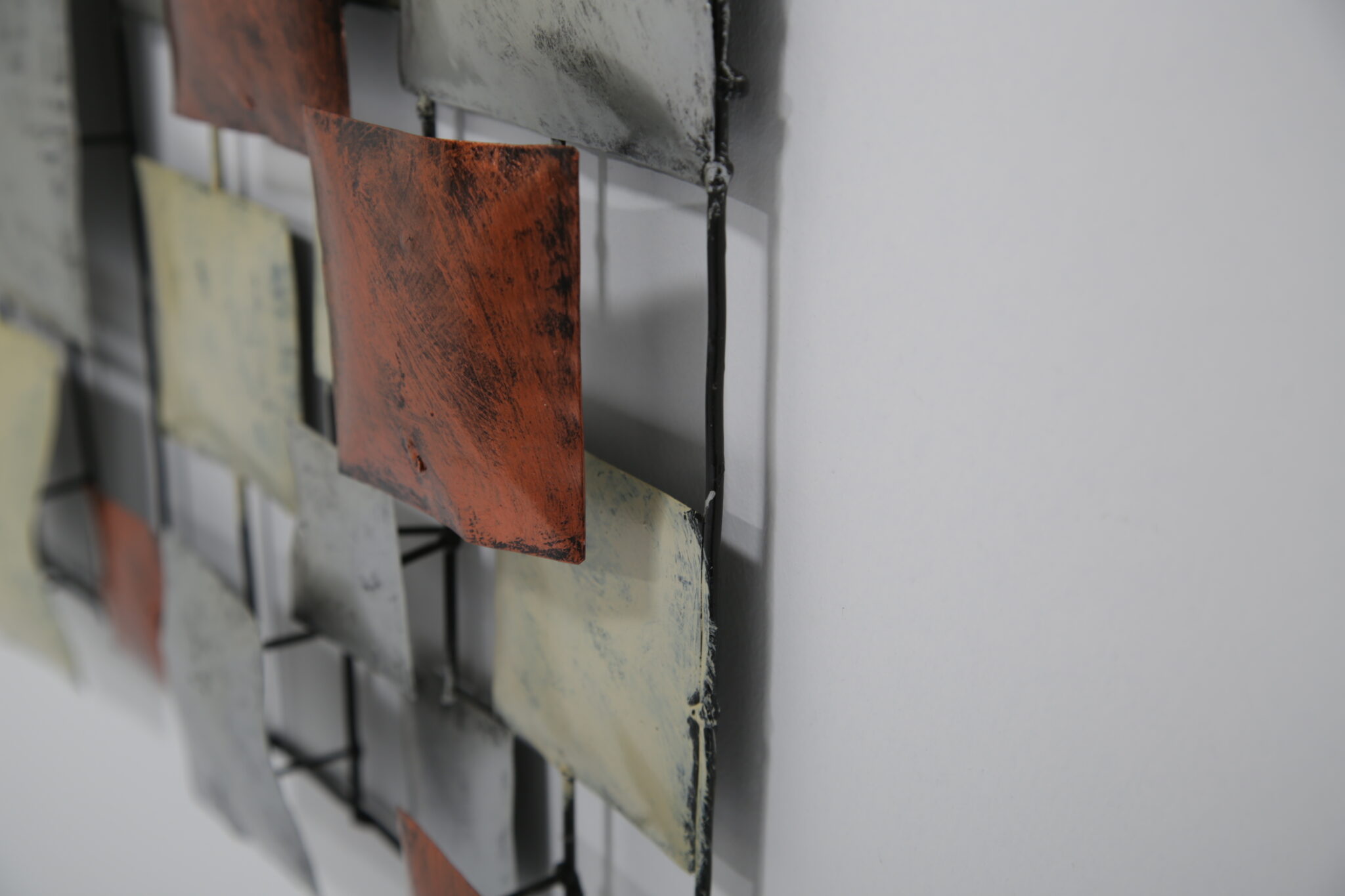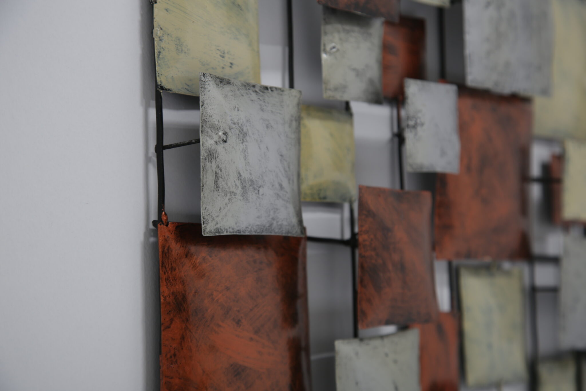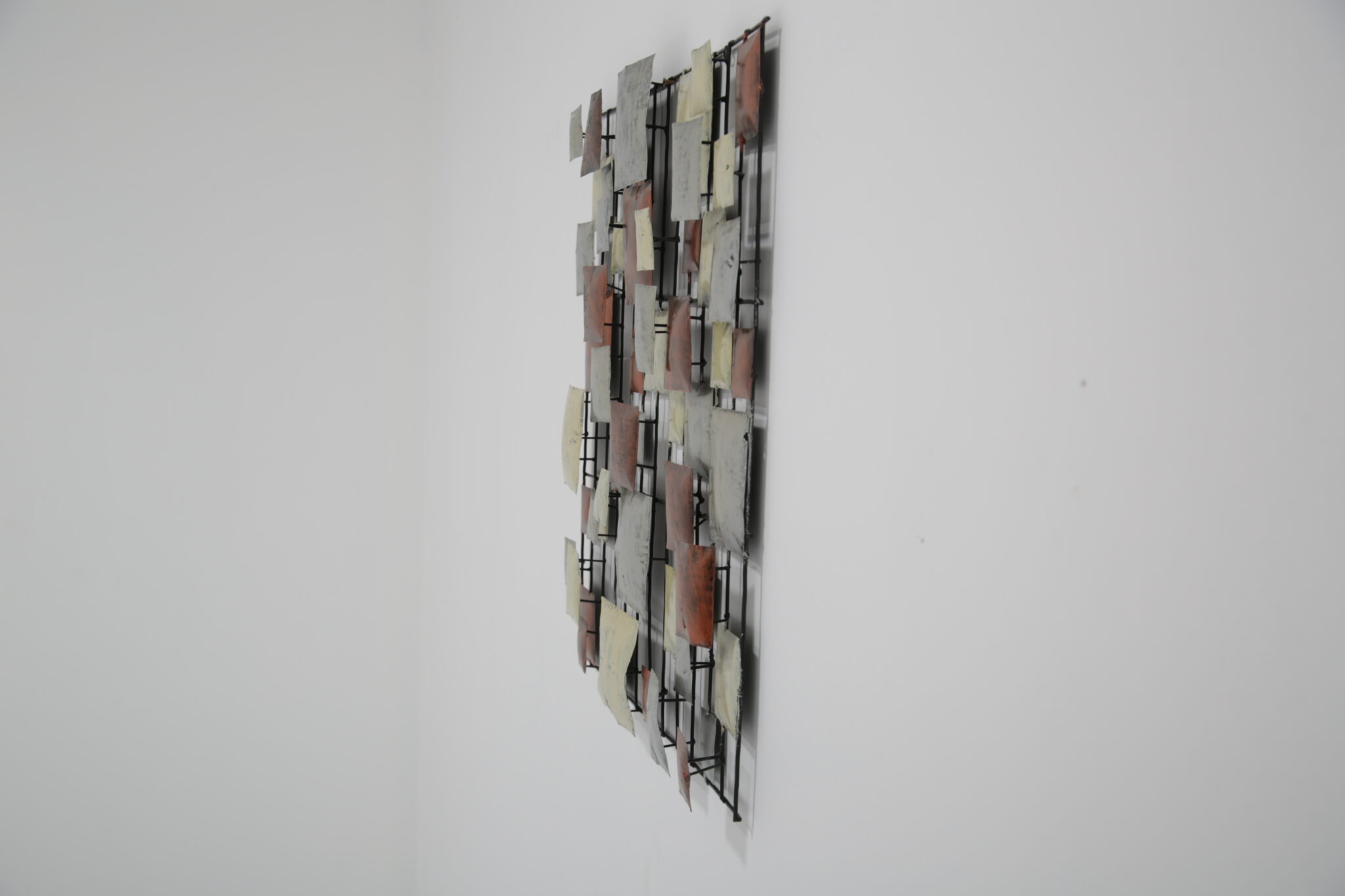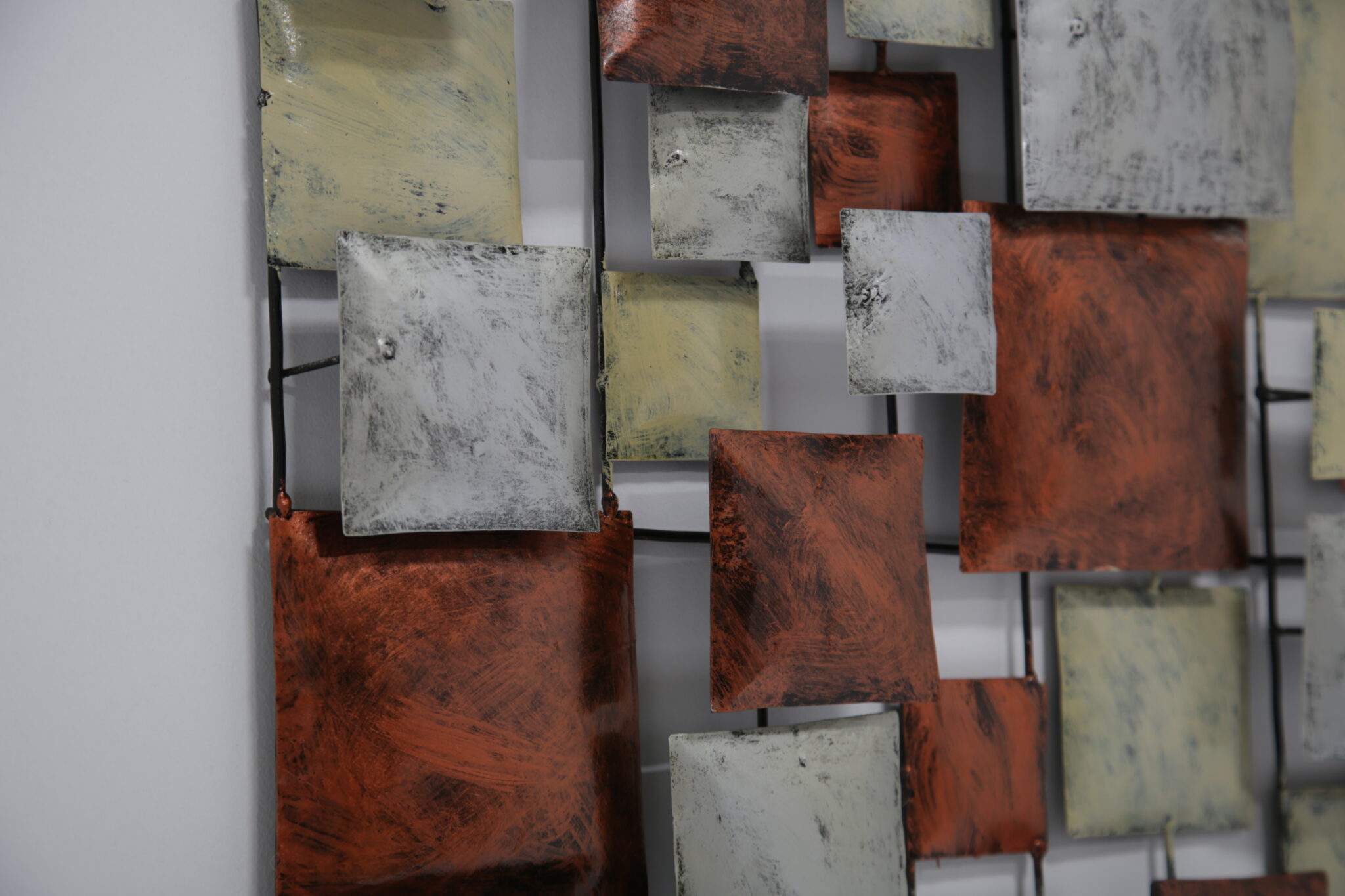 A striking mid-century Brutalist wall sculpture, handcrafted in the United States during the 70-80s. This piece features a dynamic grid of three-dimensional, enamel-coated metal squares in layered hues of copper, cream, and silvery grey. The textured, oxidized finishes give it a bold industrial feel, while the asymmetrical composition offers a rhythmic, architectural quality reminiscent of Paul Evans and Curtis Jere.