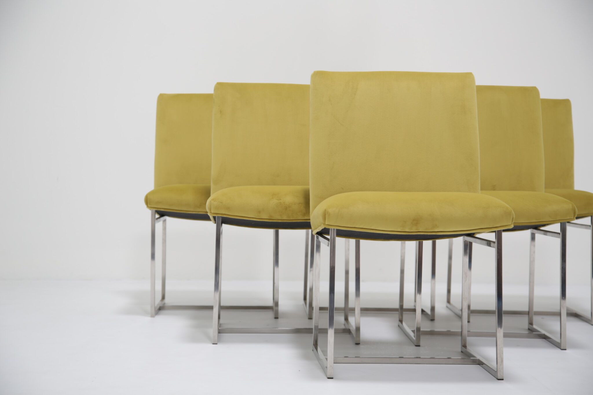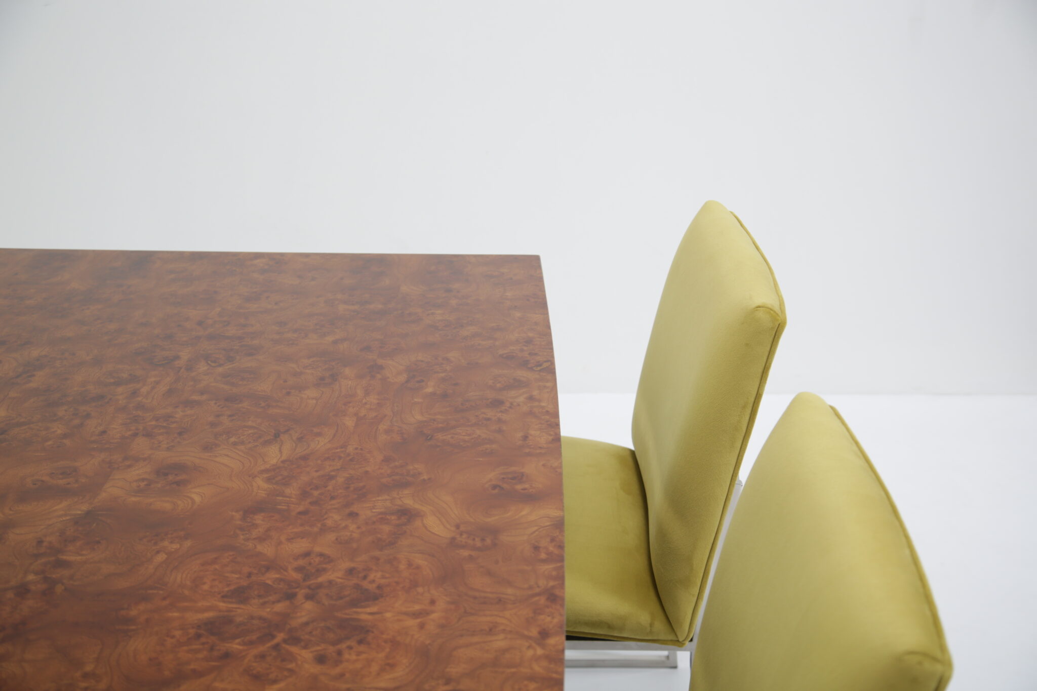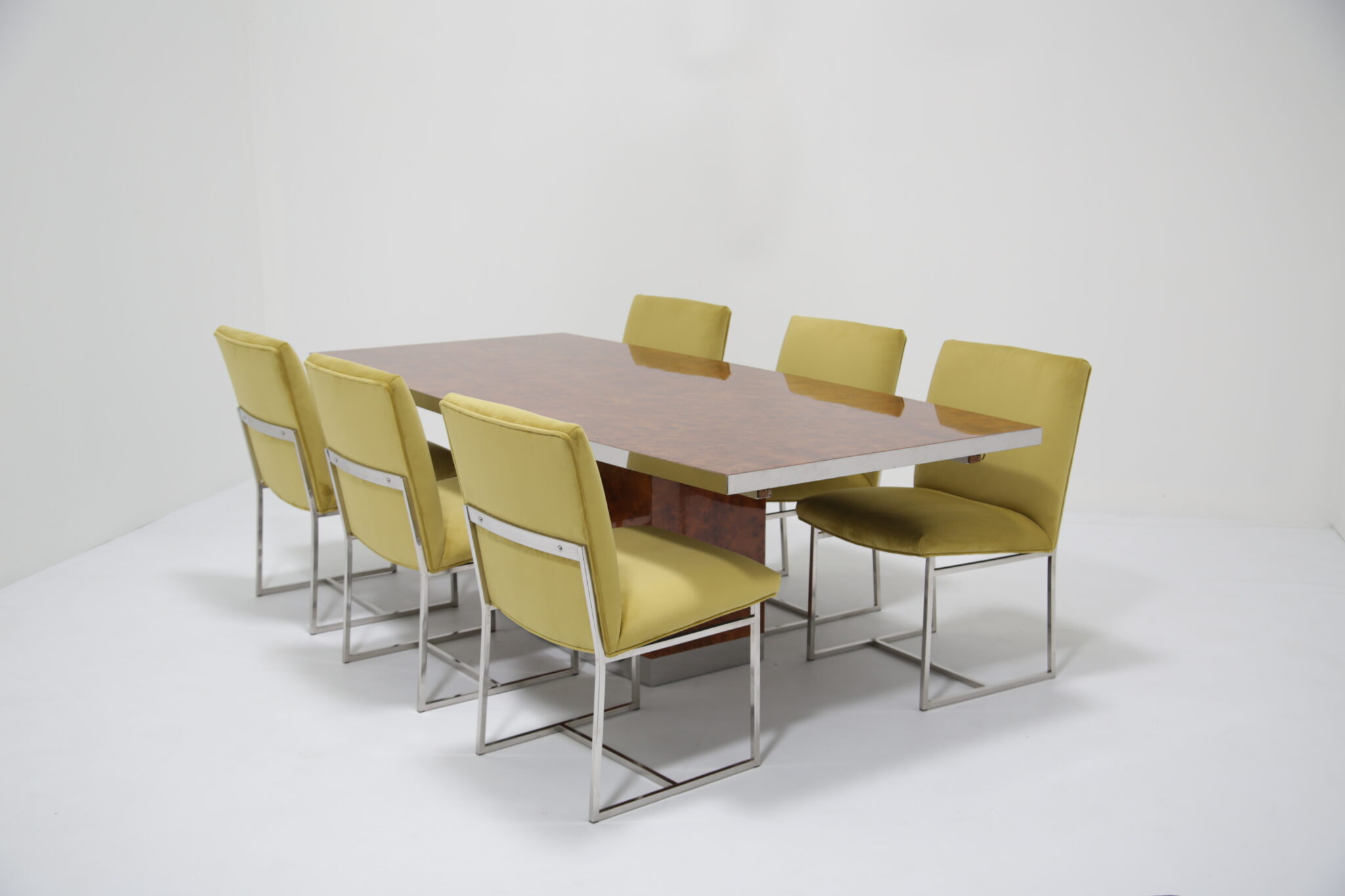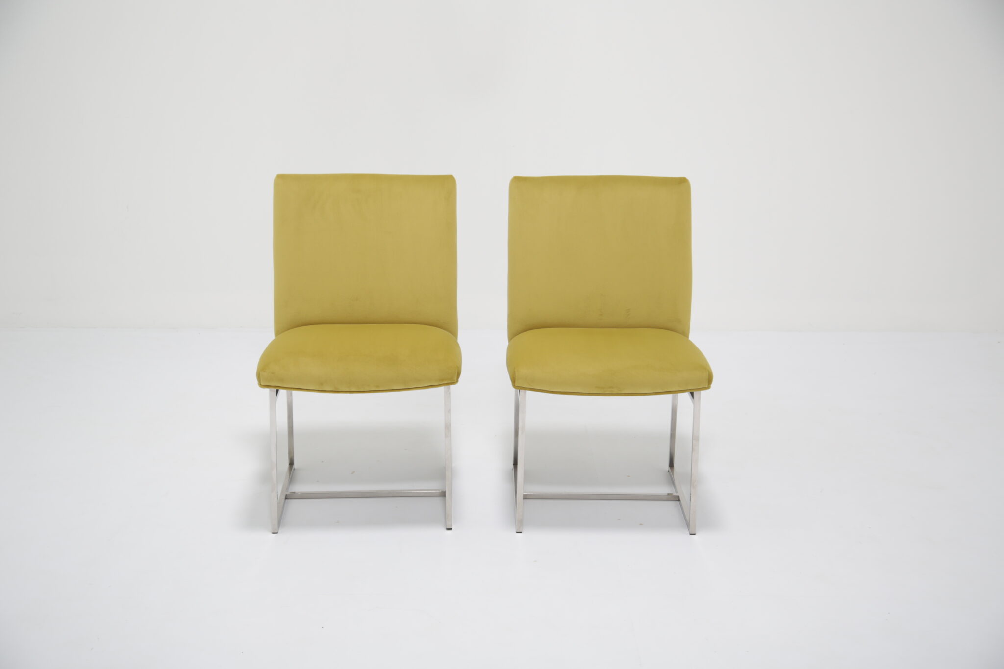 Just added to our collection are these exclusive dining chairs upholstered in a ginger lime green velvet on sturdy chrome frames. These chairs are incredible comfortable and provides good support for the back. The chrome frames are study and provides reflection in a room that may need it as natural as well as artificial light. The color choice of the upholstery adds a splash of brightness to a dining room that may need it. These chairs were imported from the States.