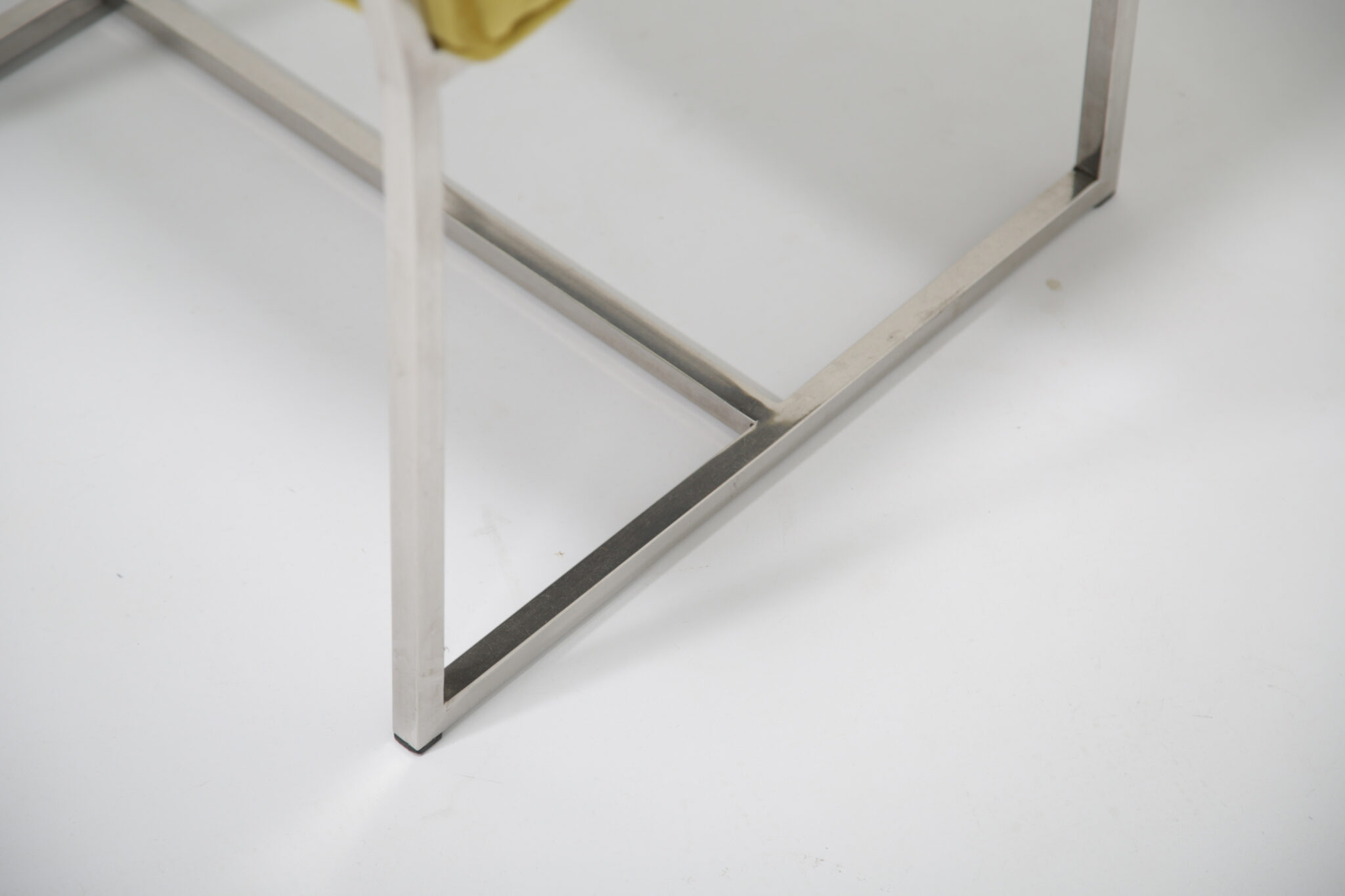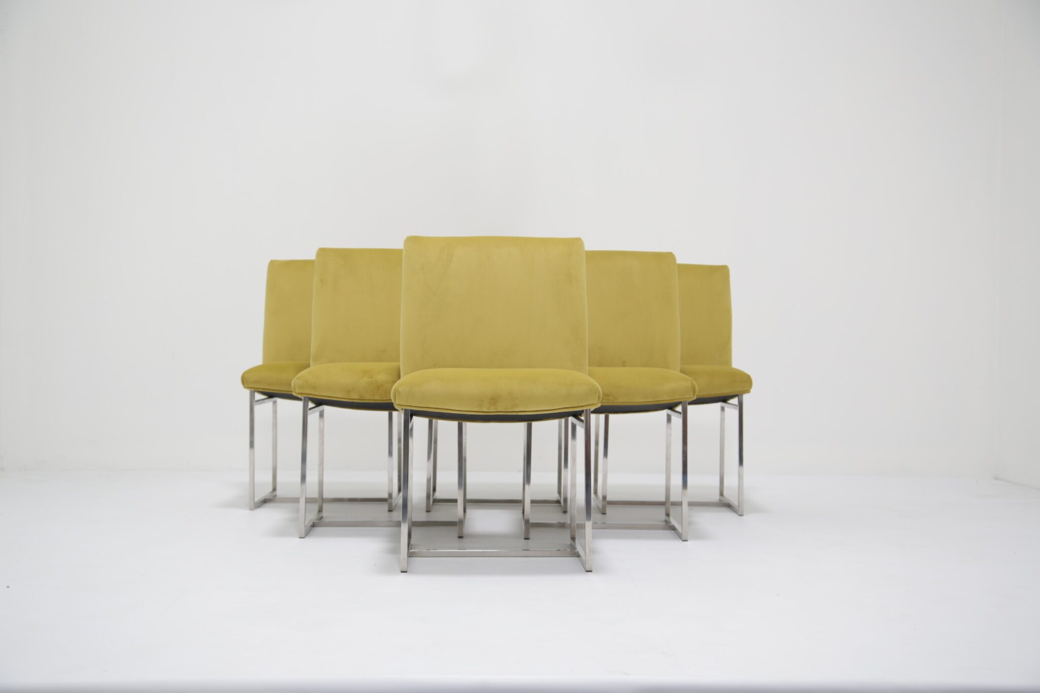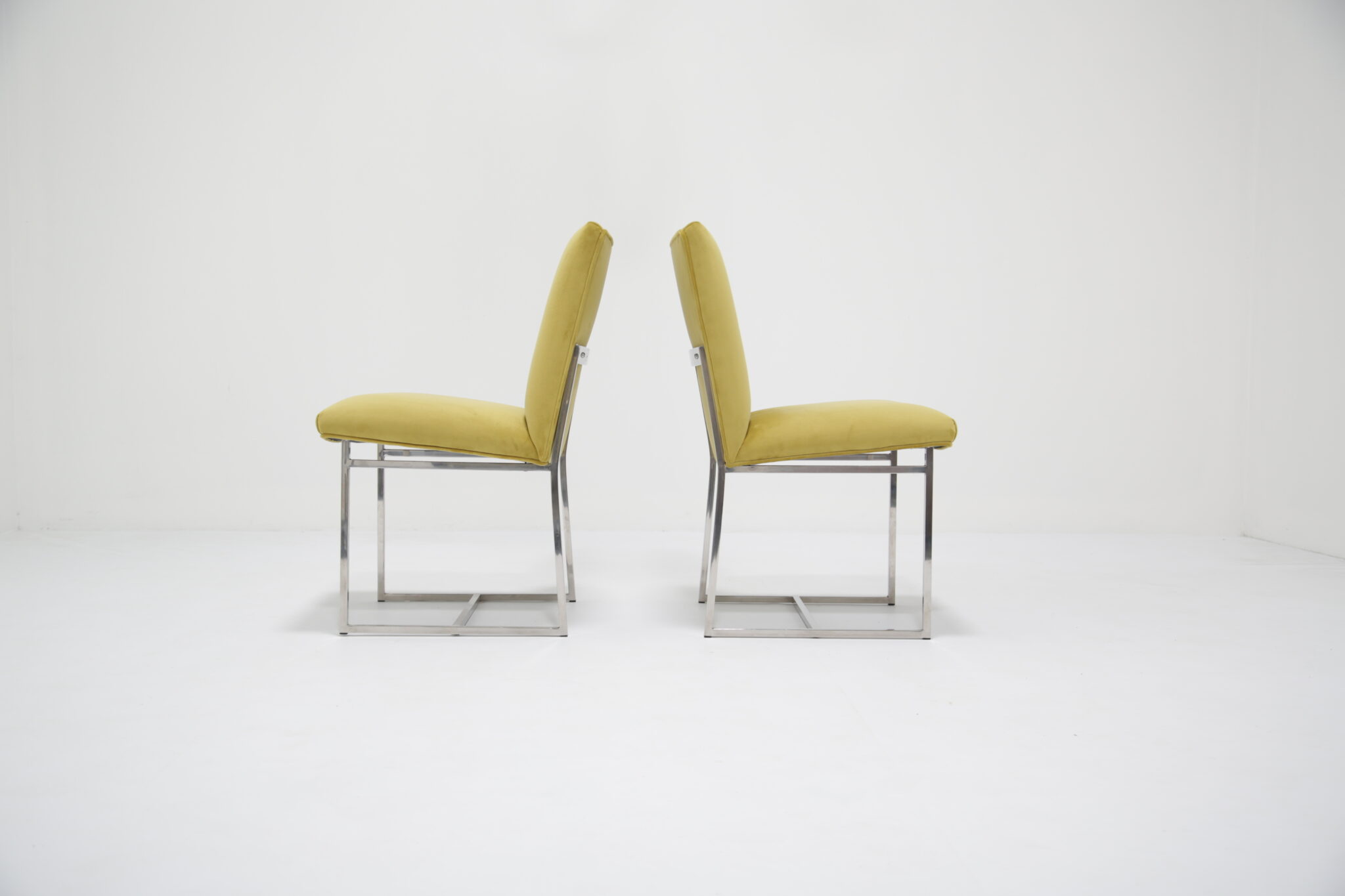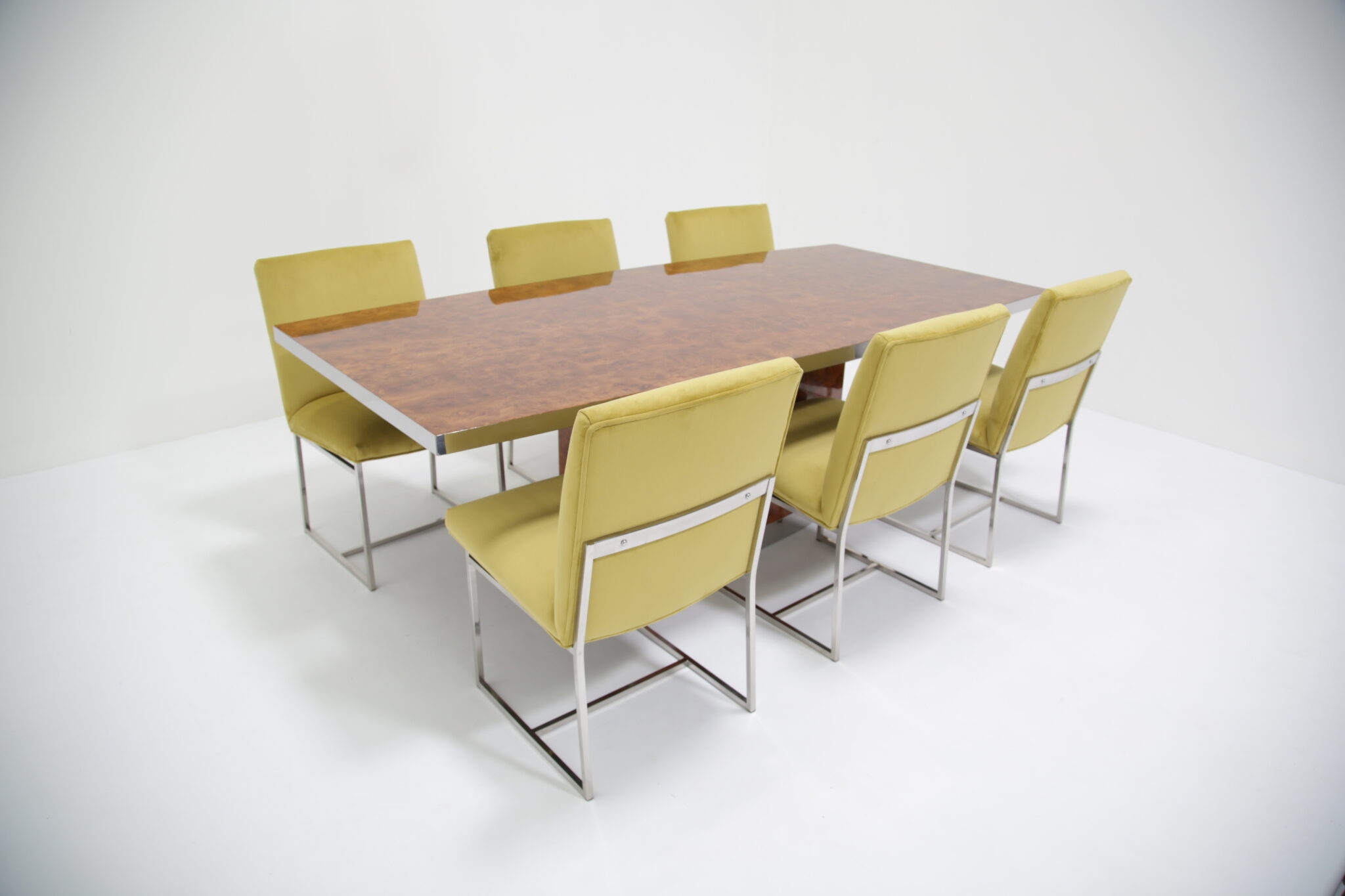 Just added to our collection are these exclusive dining chairs upholstered in a ginger lime green velvet on sturdy chrome frames. These chairs are incredible comfortable and provides good support for the back. The chrome frames are study and provides reflection in a room that may need it as natural as well as artificial light. The color choice of the upholstery adds a splash of brightness to a dining room that may need it. These chairs were imported from the States.