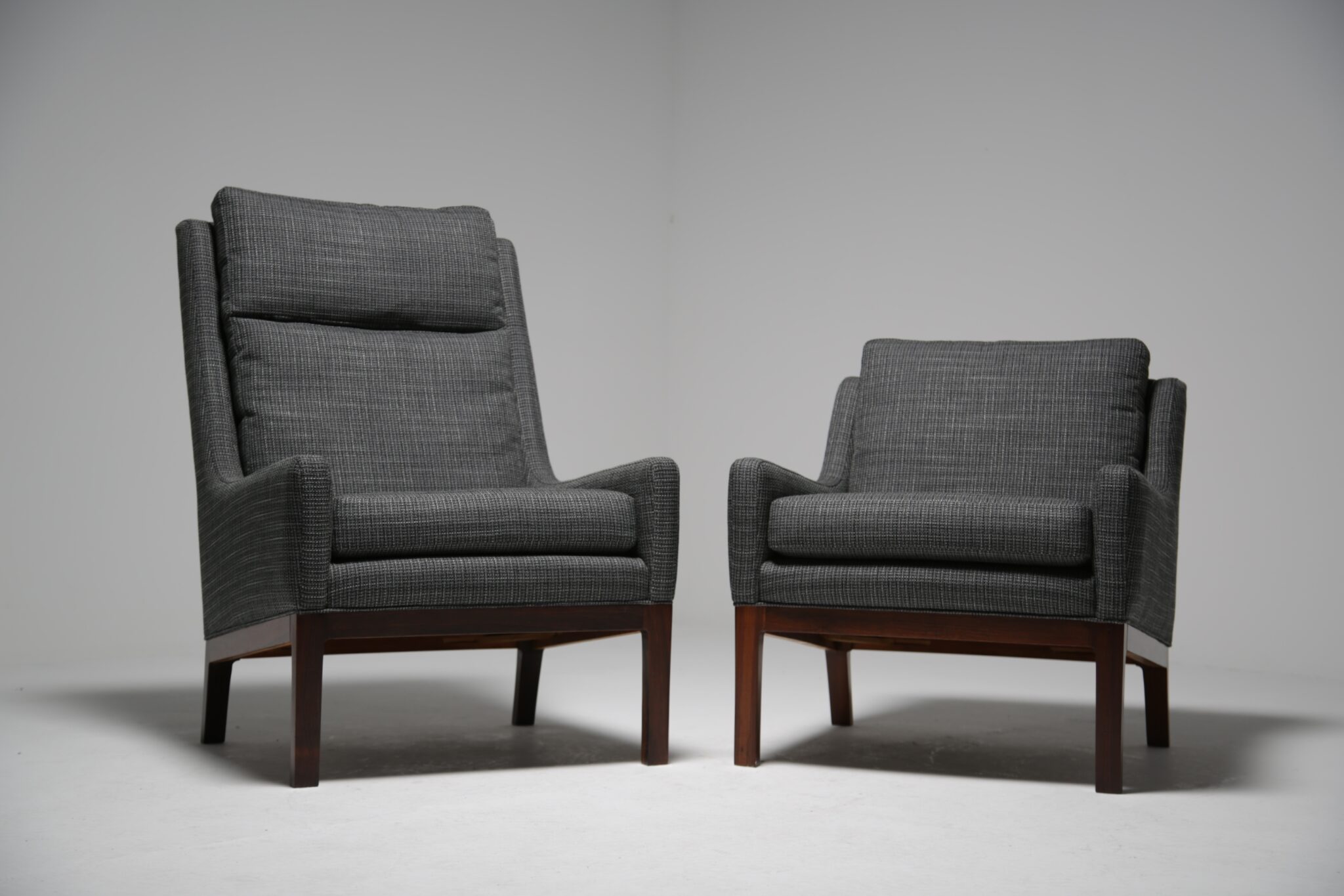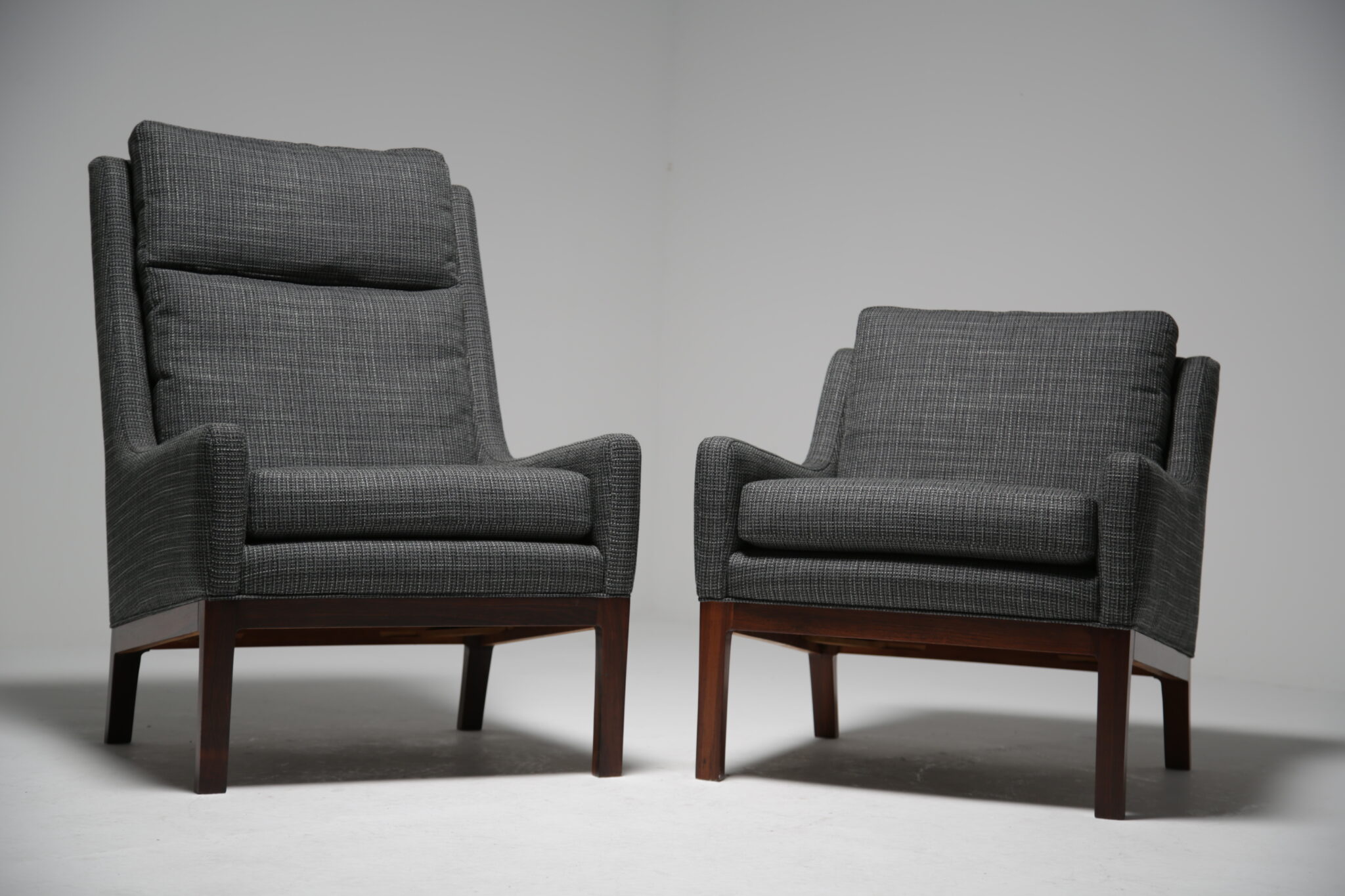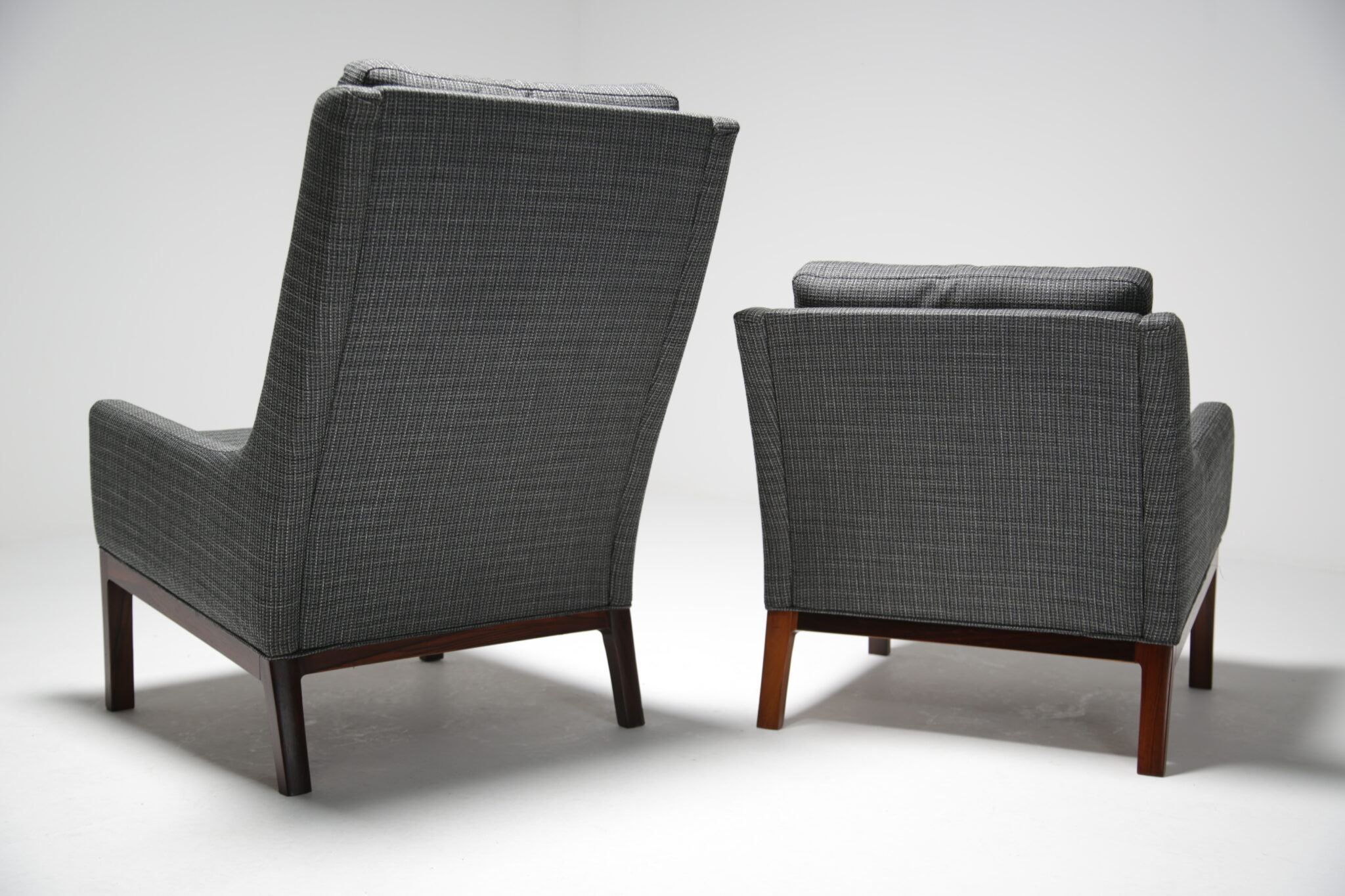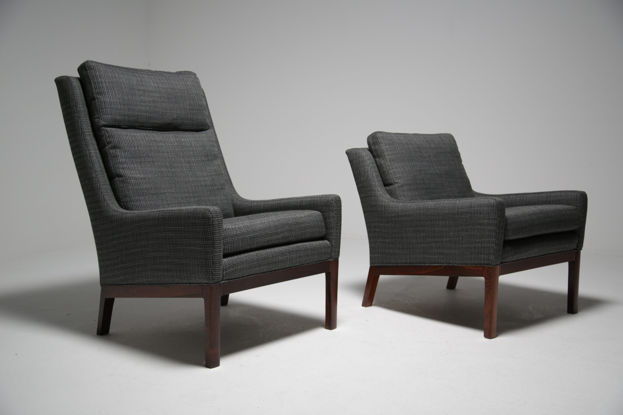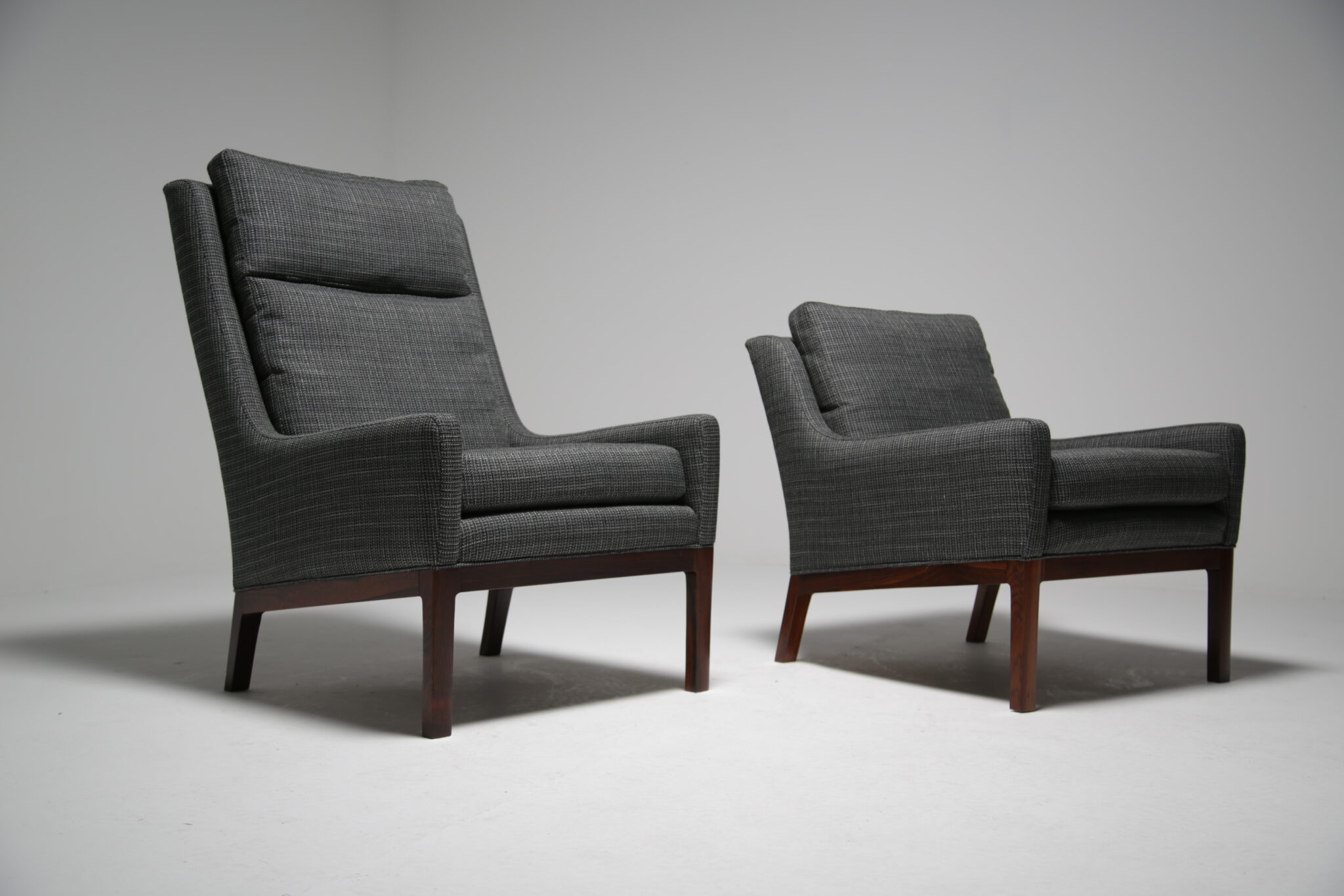 Get comfortable in these wonderful armchairs upholstered in a modern grey fabric on polished rosewood frames. Designed by the Danish designer Kai Lyngfeldt-Larsen for Soren Wiladsen in the 1960s. The pair compromises of a comfortable high-back armchair and a low-back armchair, which was commonly known as “his and hers” back in the day. The images are a bit dark which doens’t justify the quality and the colour of the chairs. The grey fabric works well with the rosewood which features a beautifully pronounced grain.