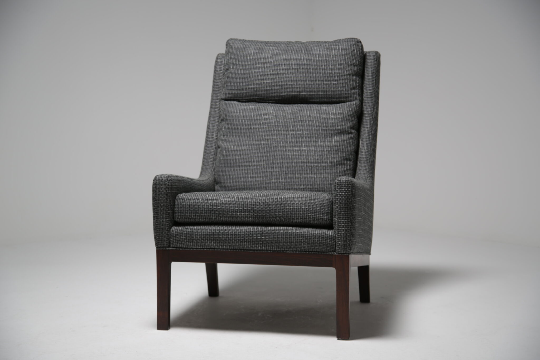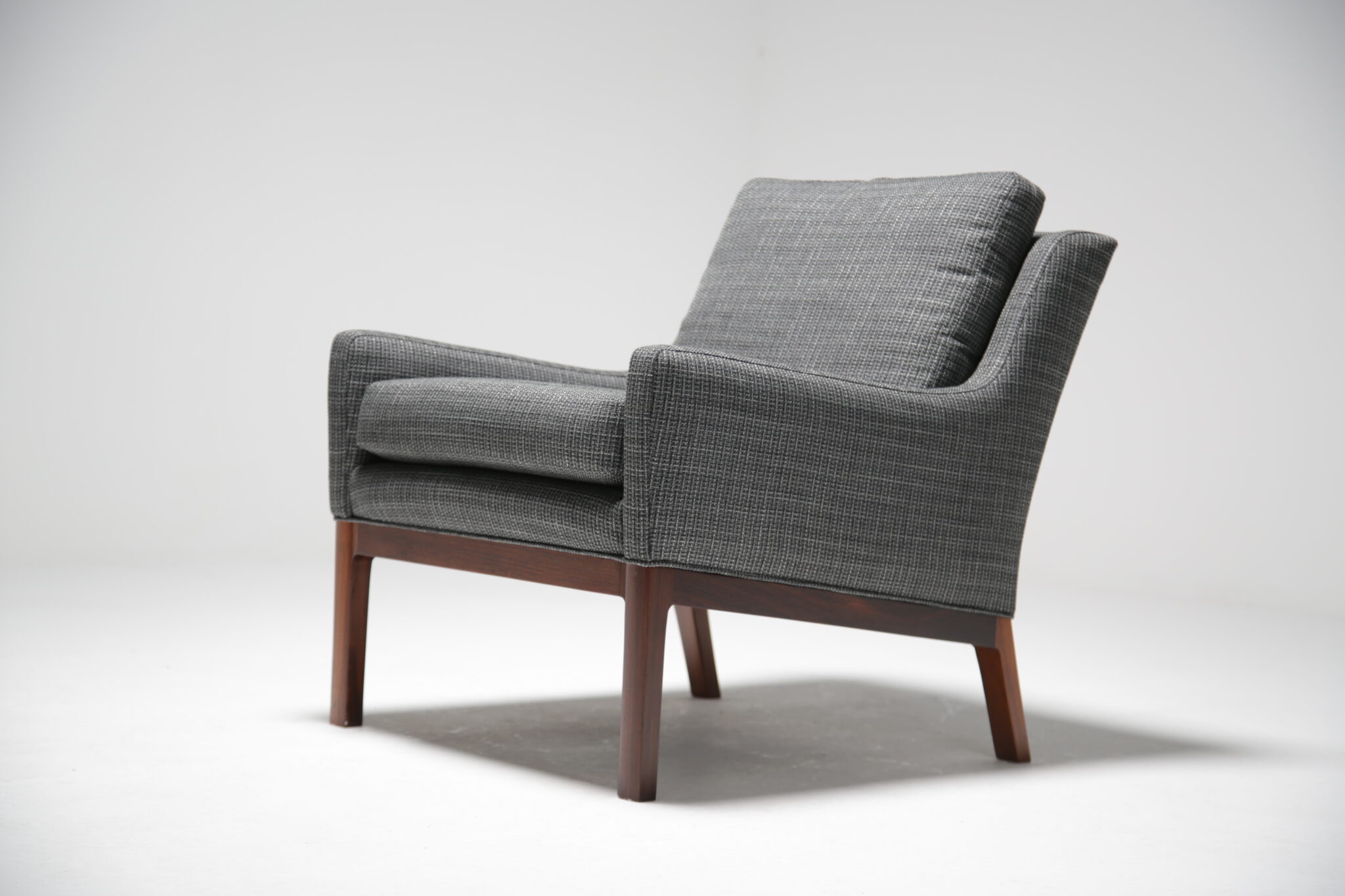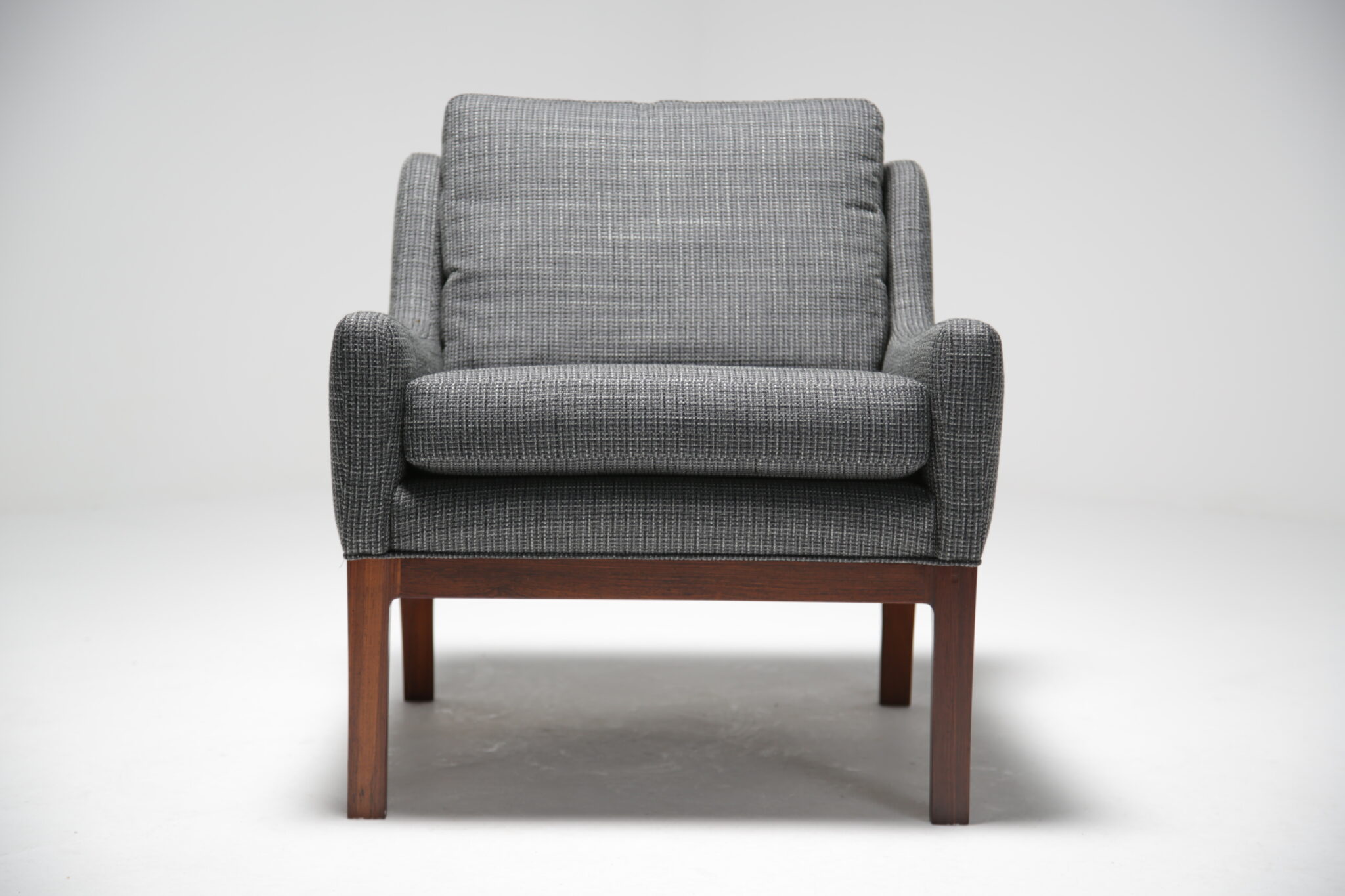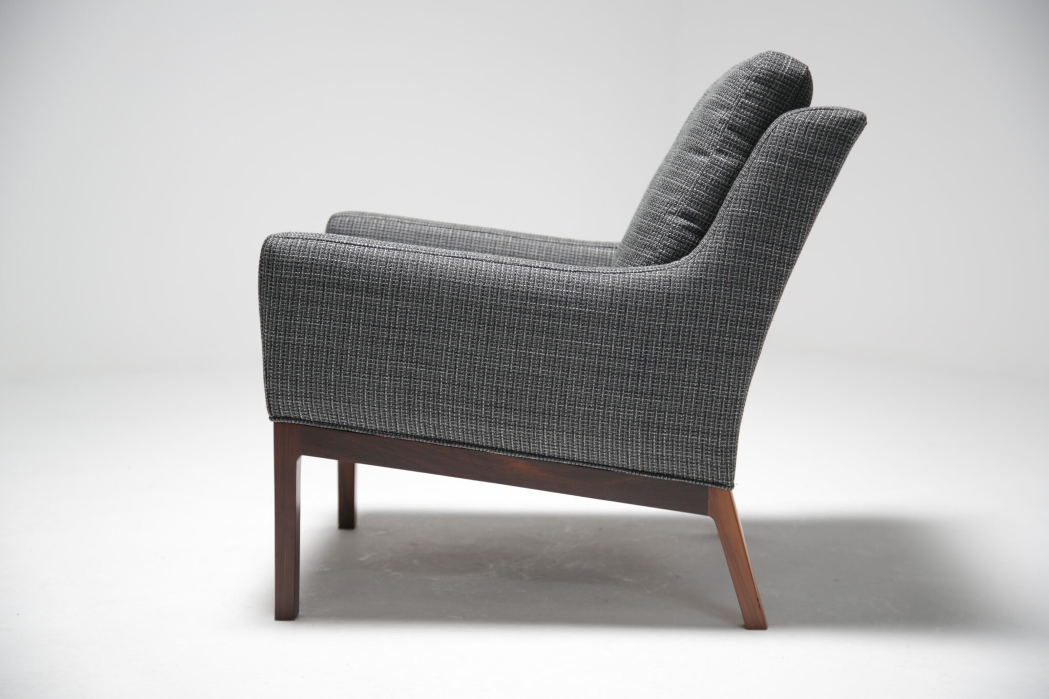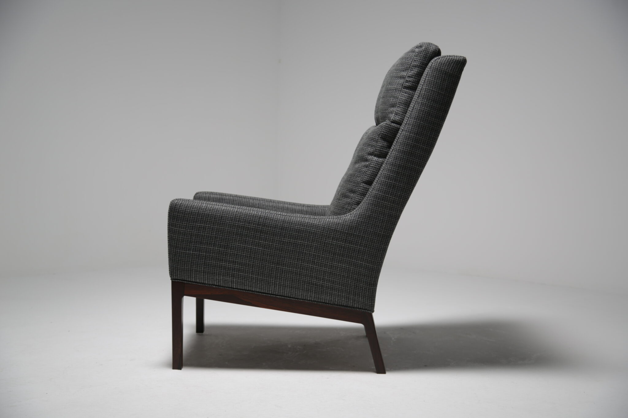 Get comfortable in these wonderful armchairs upholstered in a modern grey fabric on polished rosewood frames. Designed by the Danish designer Kai Lyngfeldt-Larsen for Soren Wiladsen in the 1960s. The pair compromises of a comfortable high-back armchair and a low-back armchair, which was commonly known as “his and hers” back in the day. The images are a bit dark which doens’t justify the quality and the colour of the chairs. The grey fabric works well with the rosewood which features a beautifully pronounced grain.