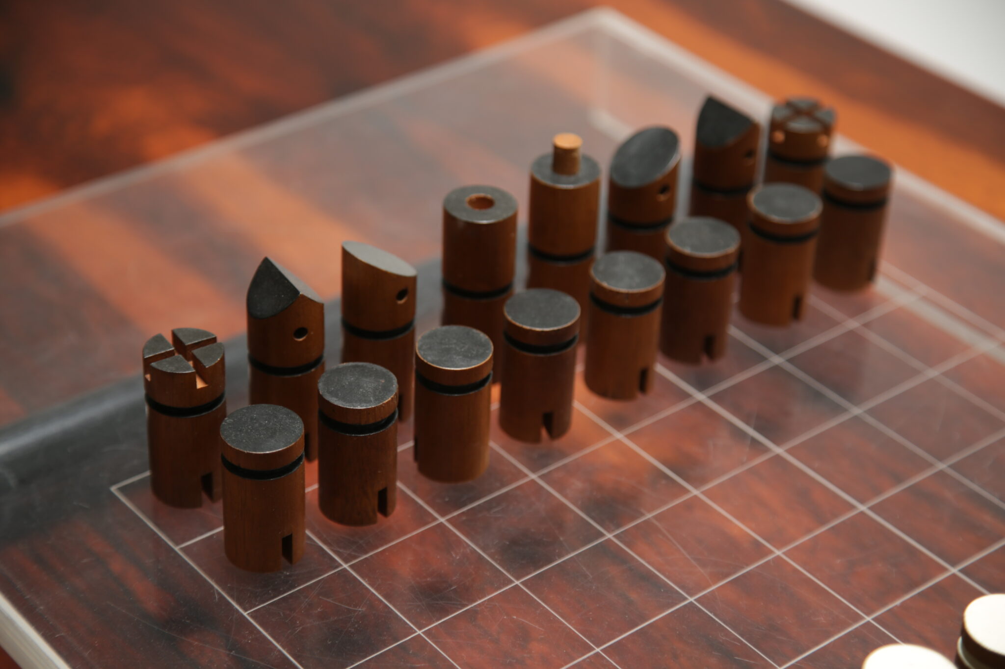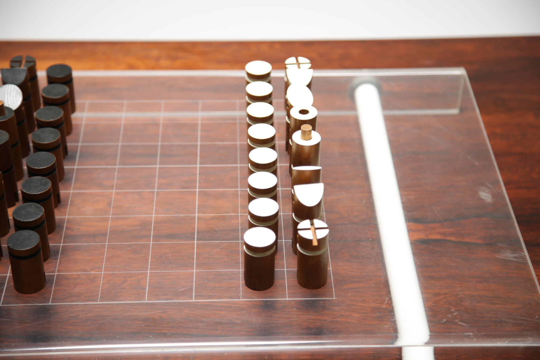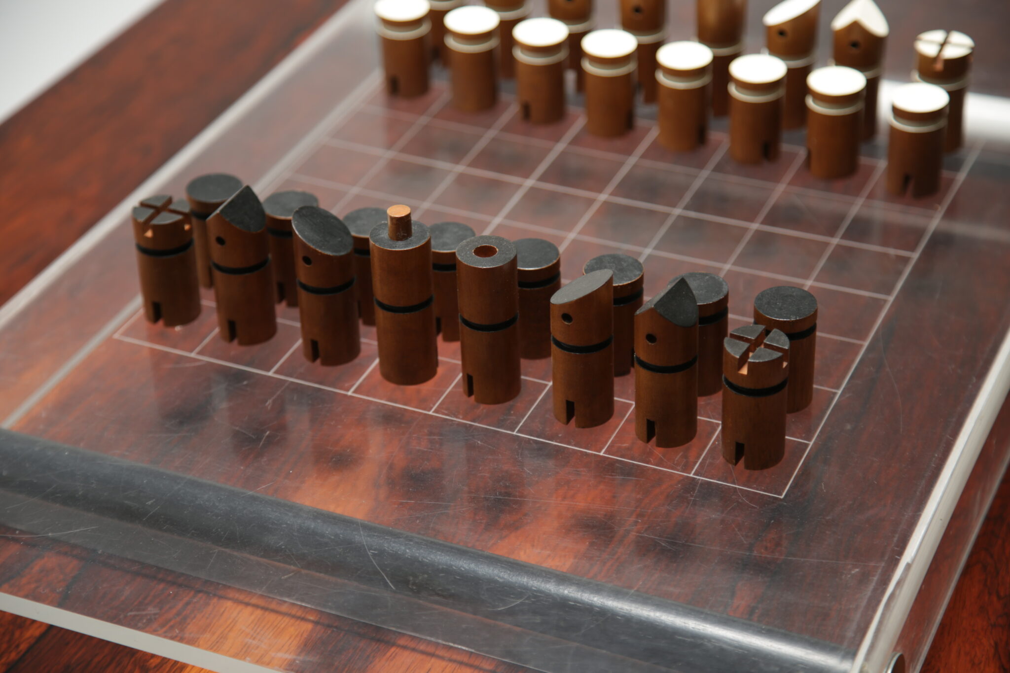 Prepare to be enchanted by the masterful craftsmanship of artist Patrick Gannon, showcased in this bespoke chess set that marries artistry and functionality. Crafted in the year 1977, this unique creation boasts a perspex board adorned with meticulously carved wooden chess figures, each lovingly painted by the artist’s hand.