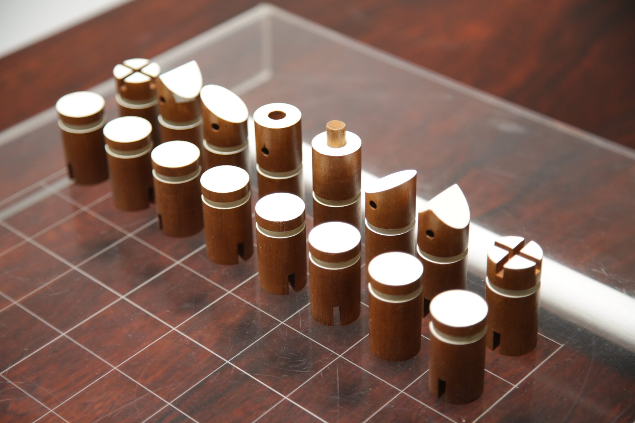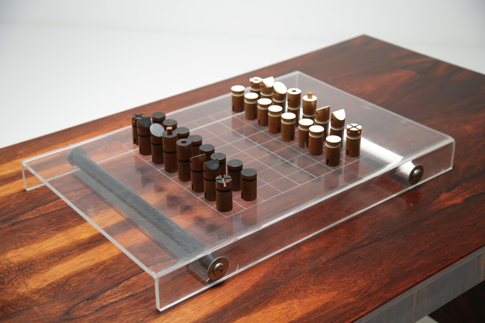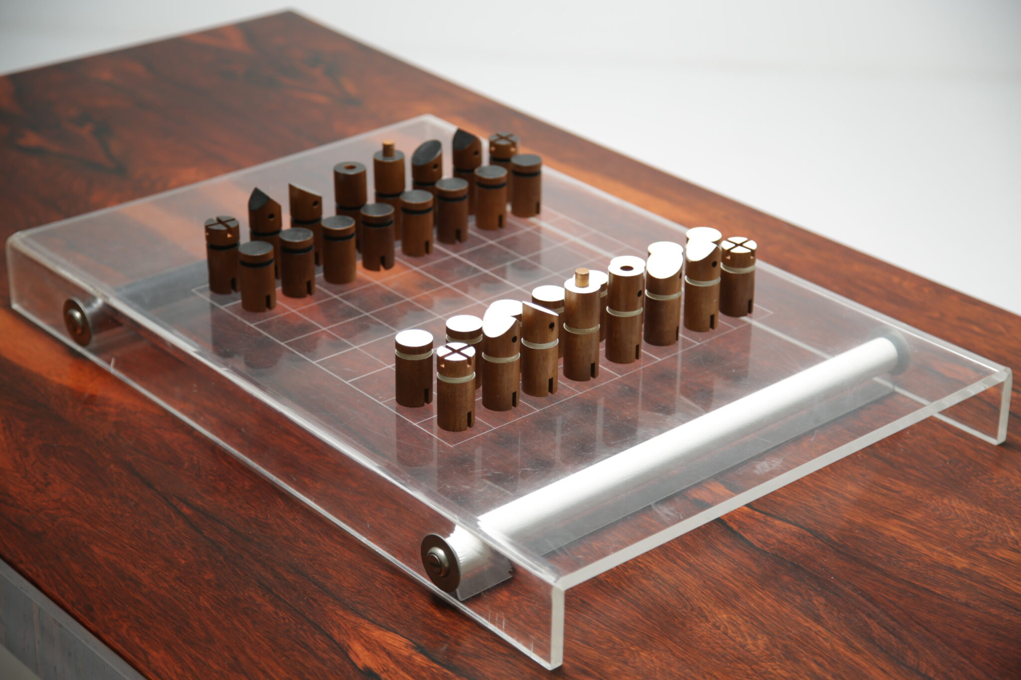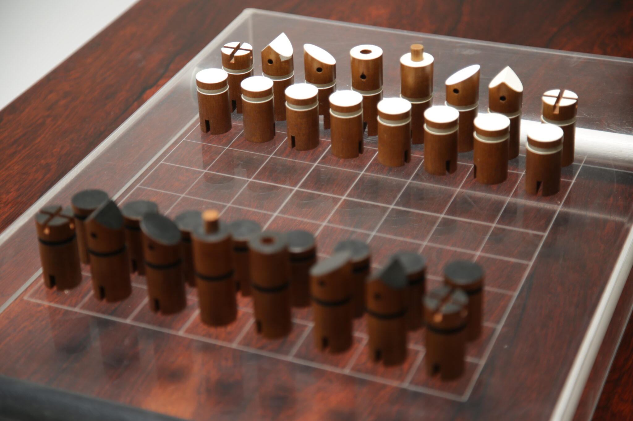 Prepare to be enchanted by the masterful craftsmanship of artist Patrick Gannon, showcased in this bespoke chess set that marries artistry and functionality. Crafted in the year 1977, this unique creation boasts a perspex board adorned with meticulously carved wooden chess figures, each lovingly painted by the artist’s hand.