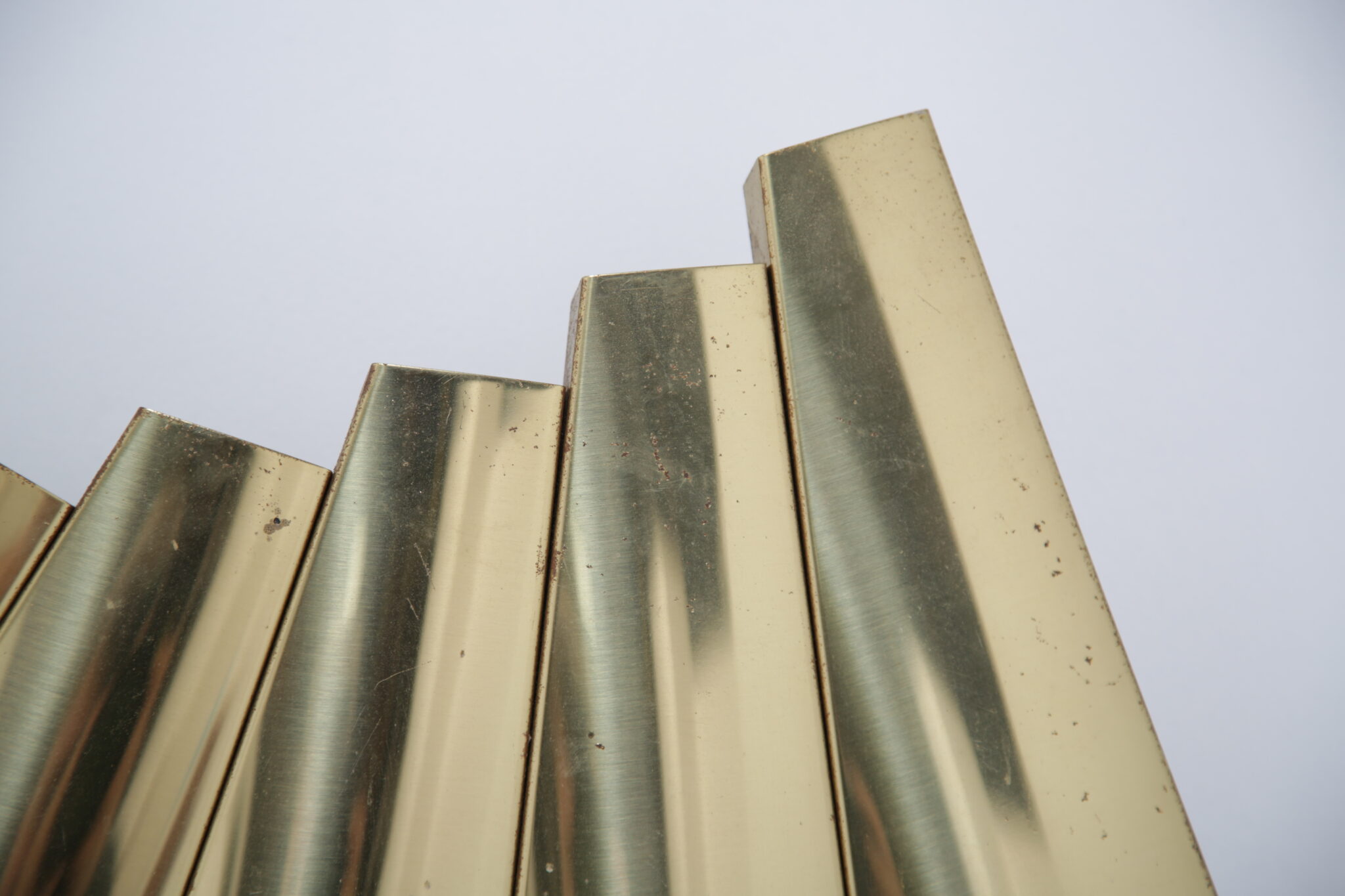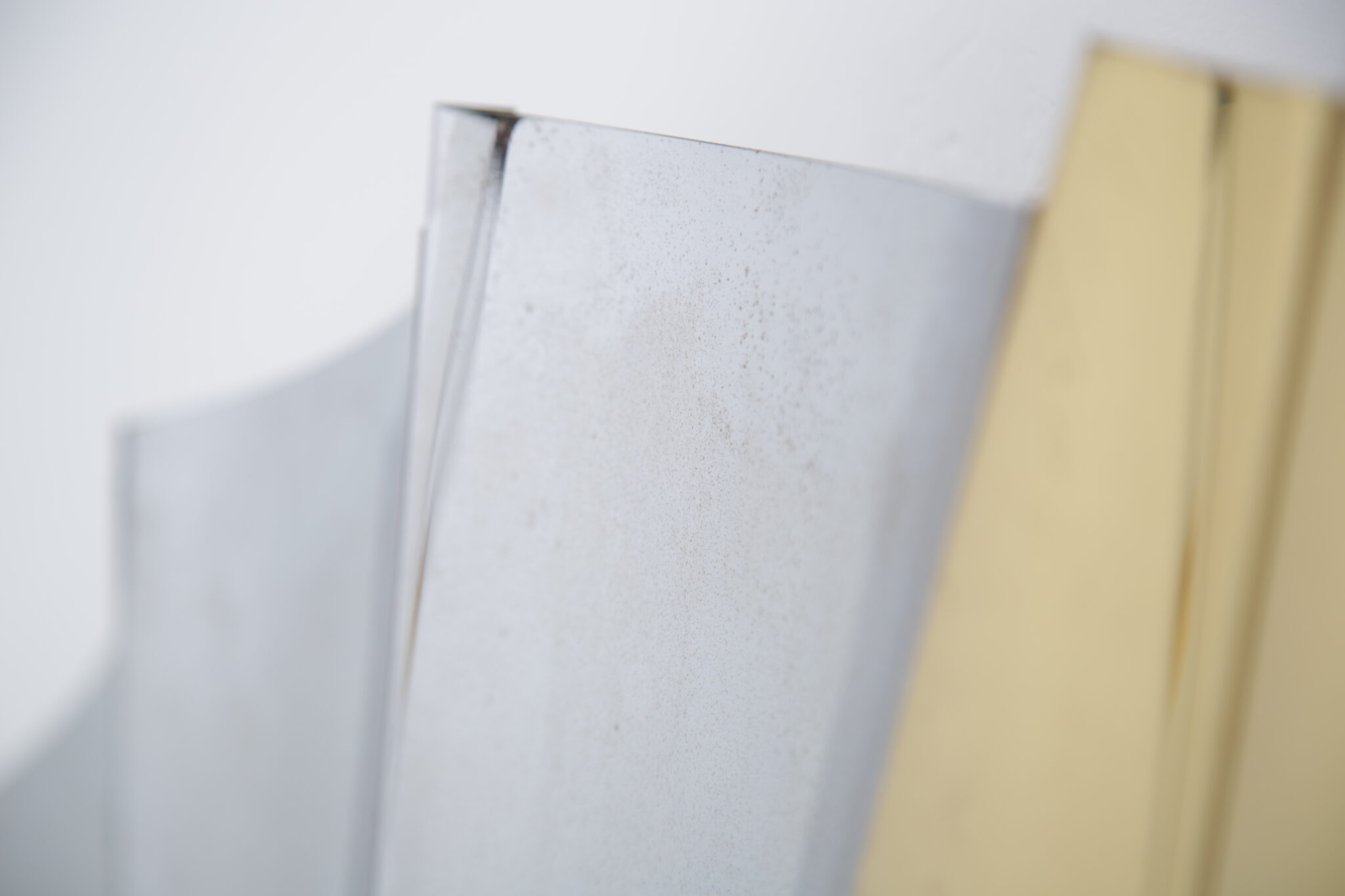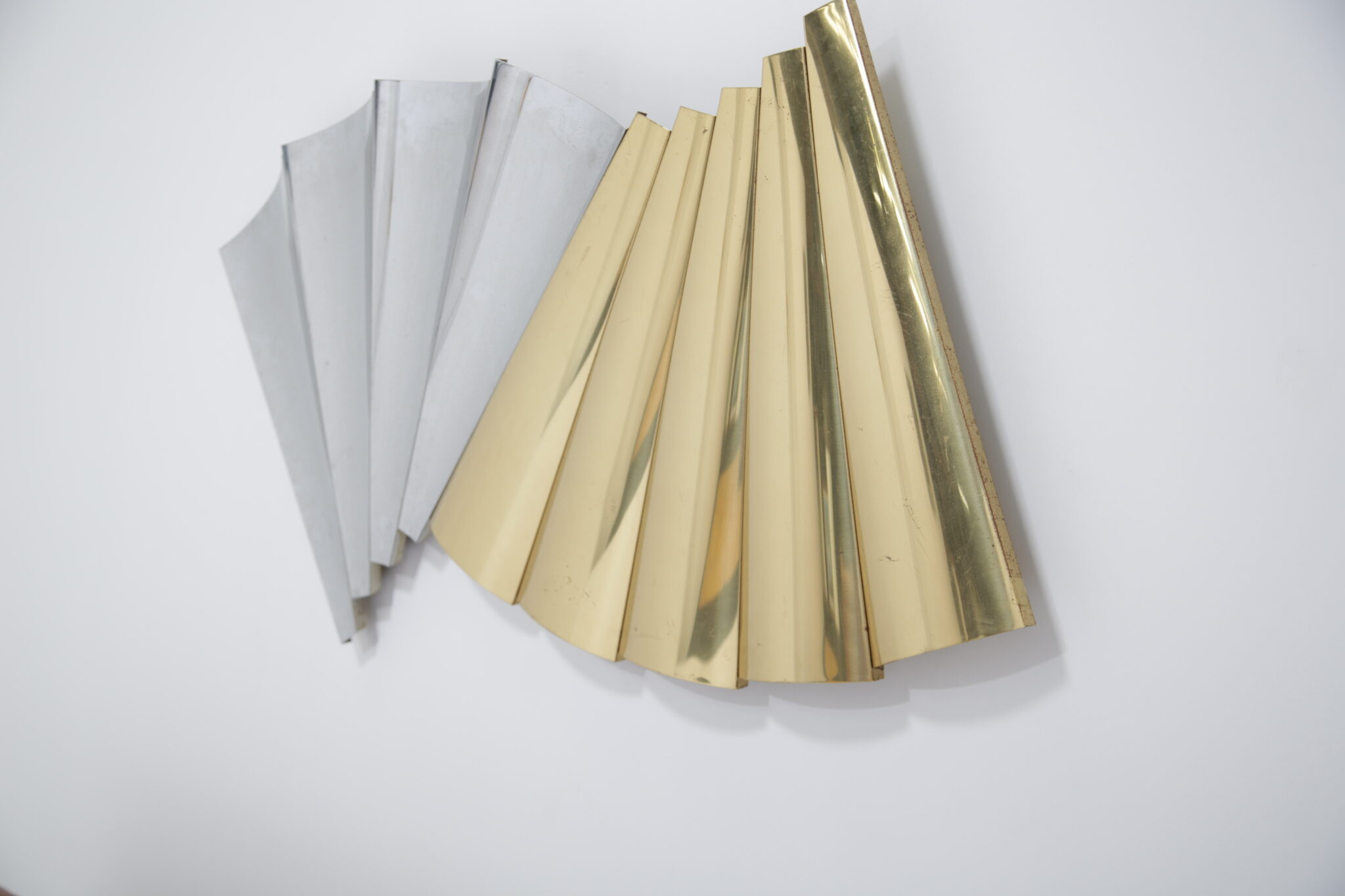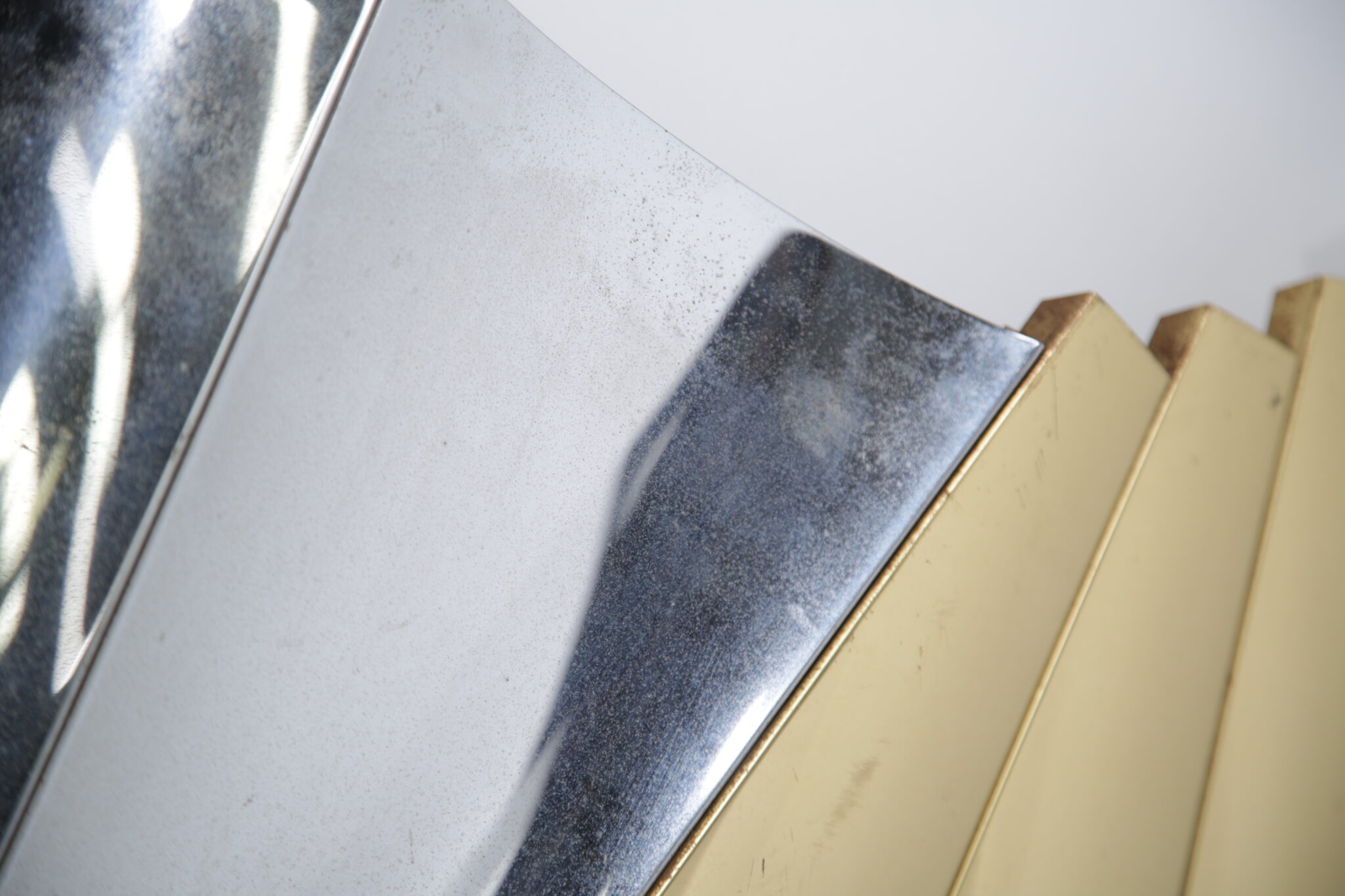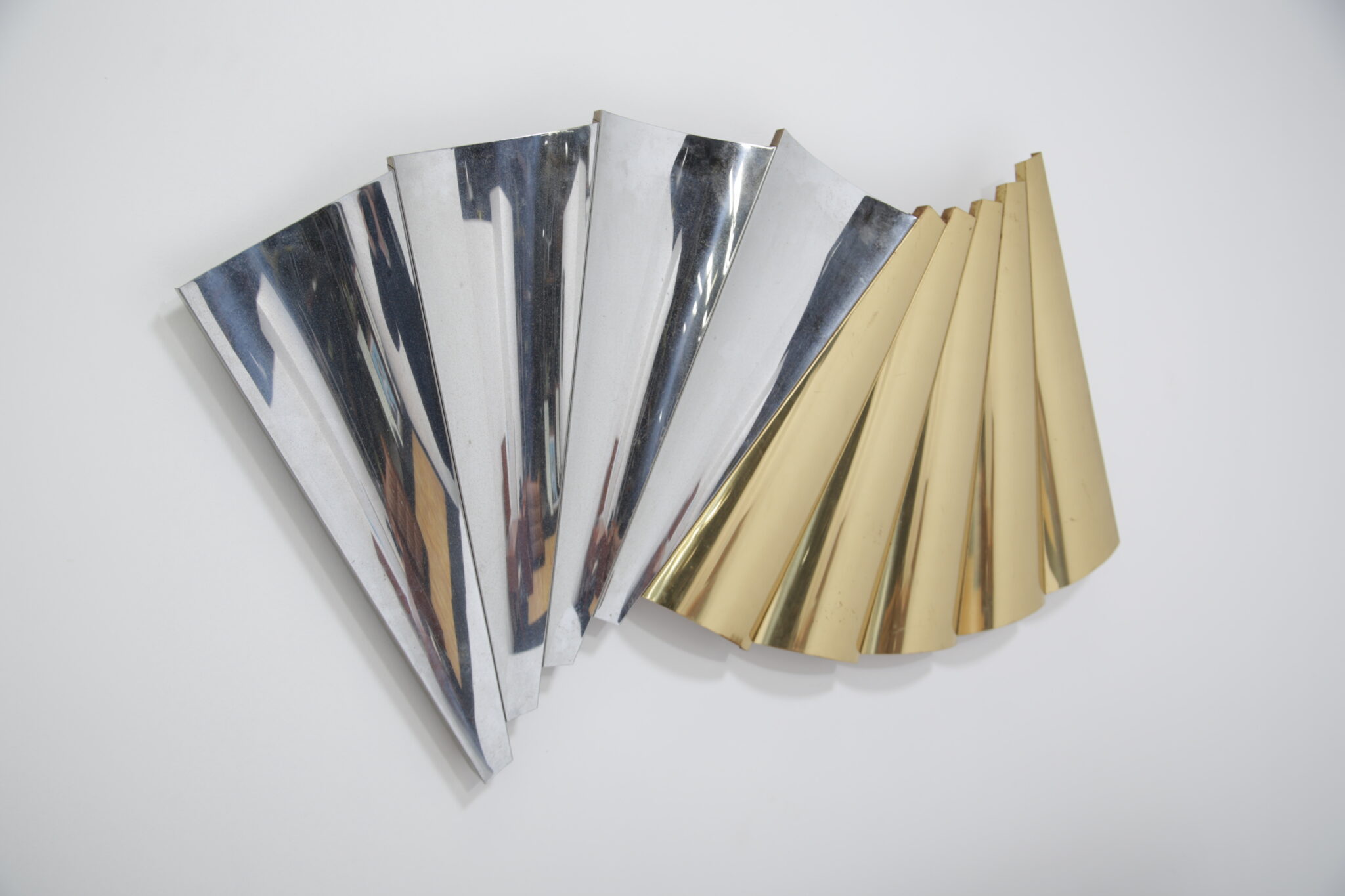 A striking example of mid-century metalwork, this wall sculpture is called “Outfold” and was designed by by the American duo Curtis Freiler and Jerry Fels. Often described as Curtis Jere or C. Jeré for Artisan House). This piece embodies the bold, abstract style that made the design duo famous. Crafted in the 1980s, the piece features a dynamic composition of folded and layered metal, creating an interplay of light, shadow, and texture.
