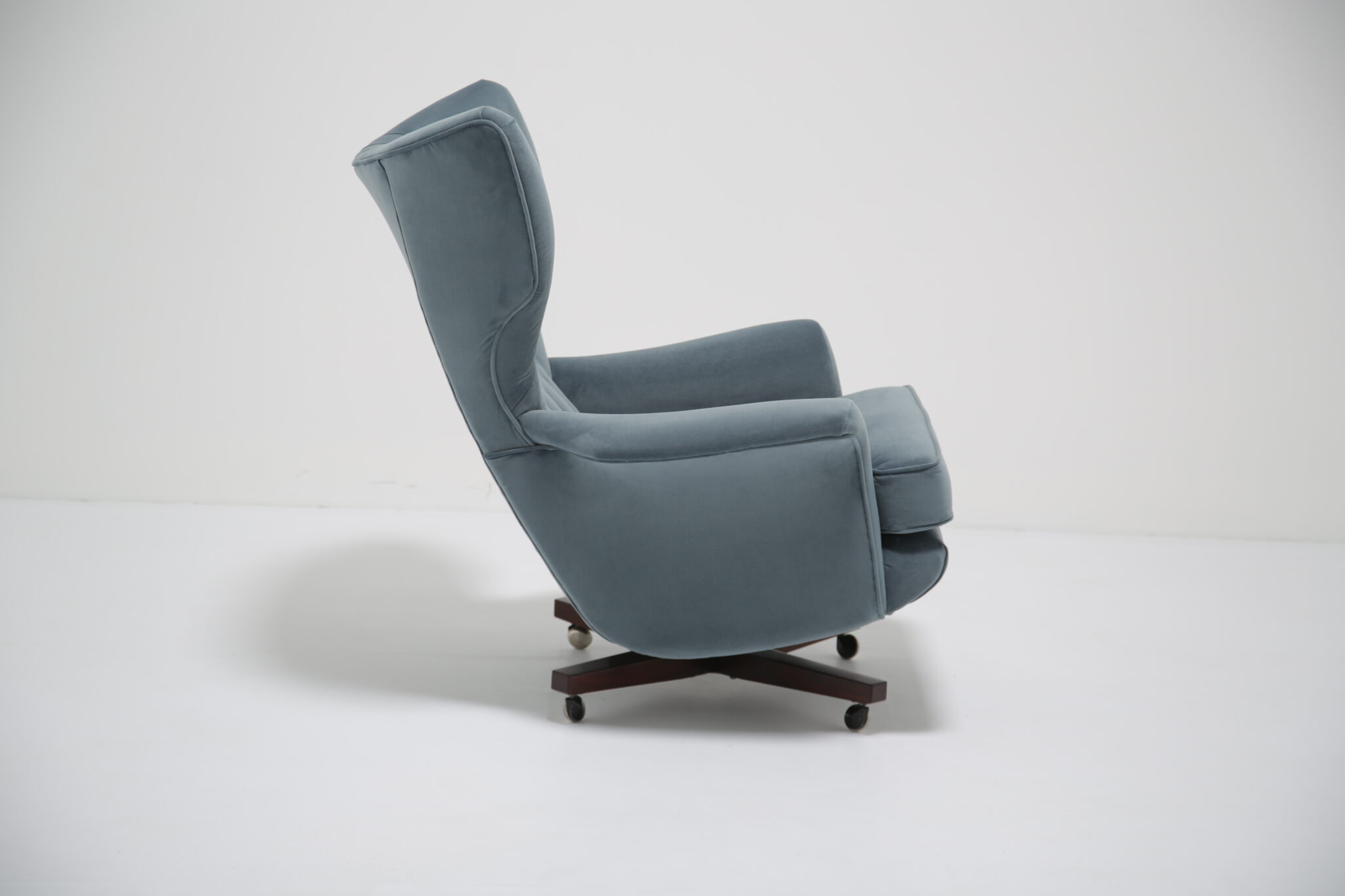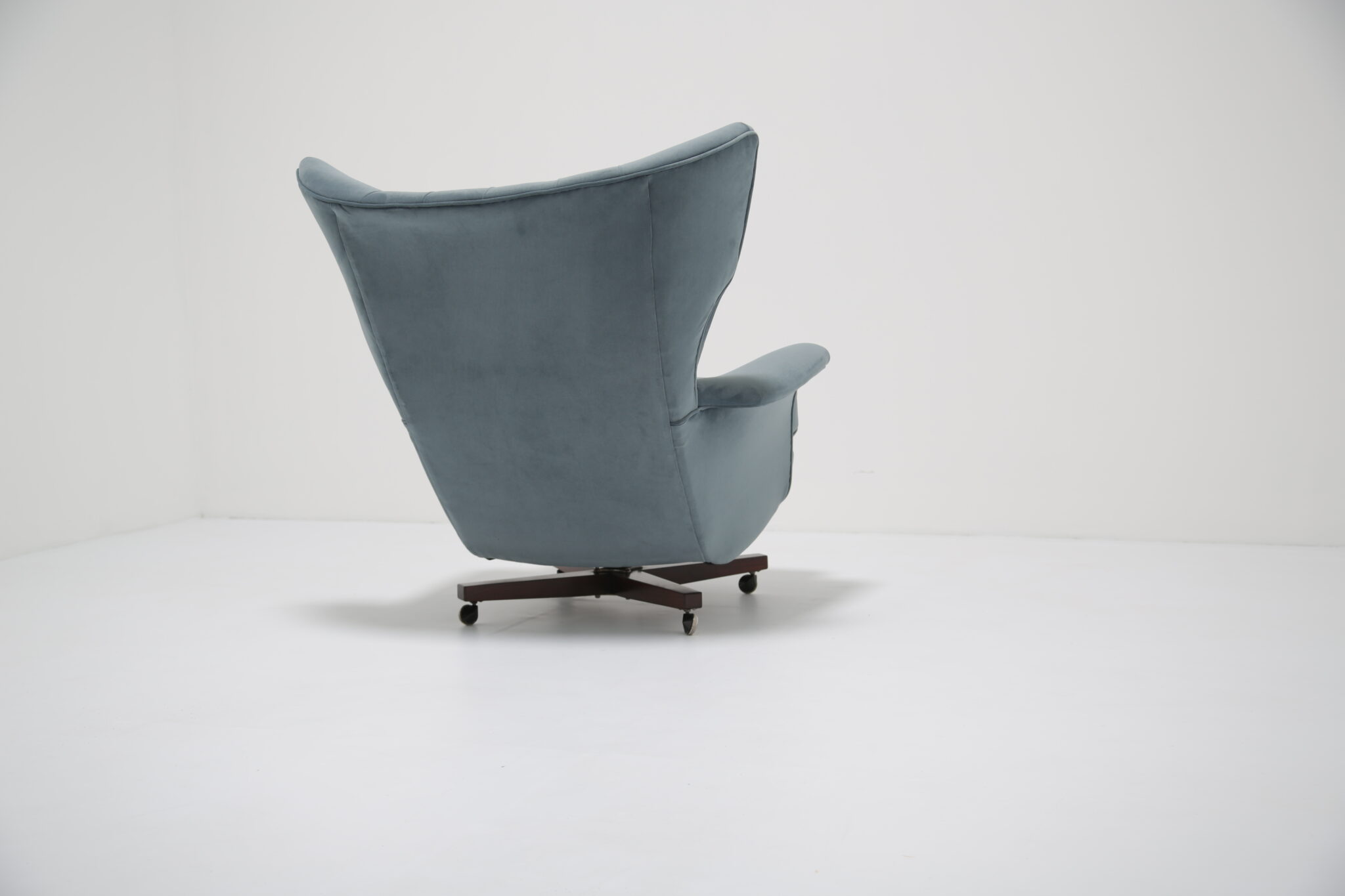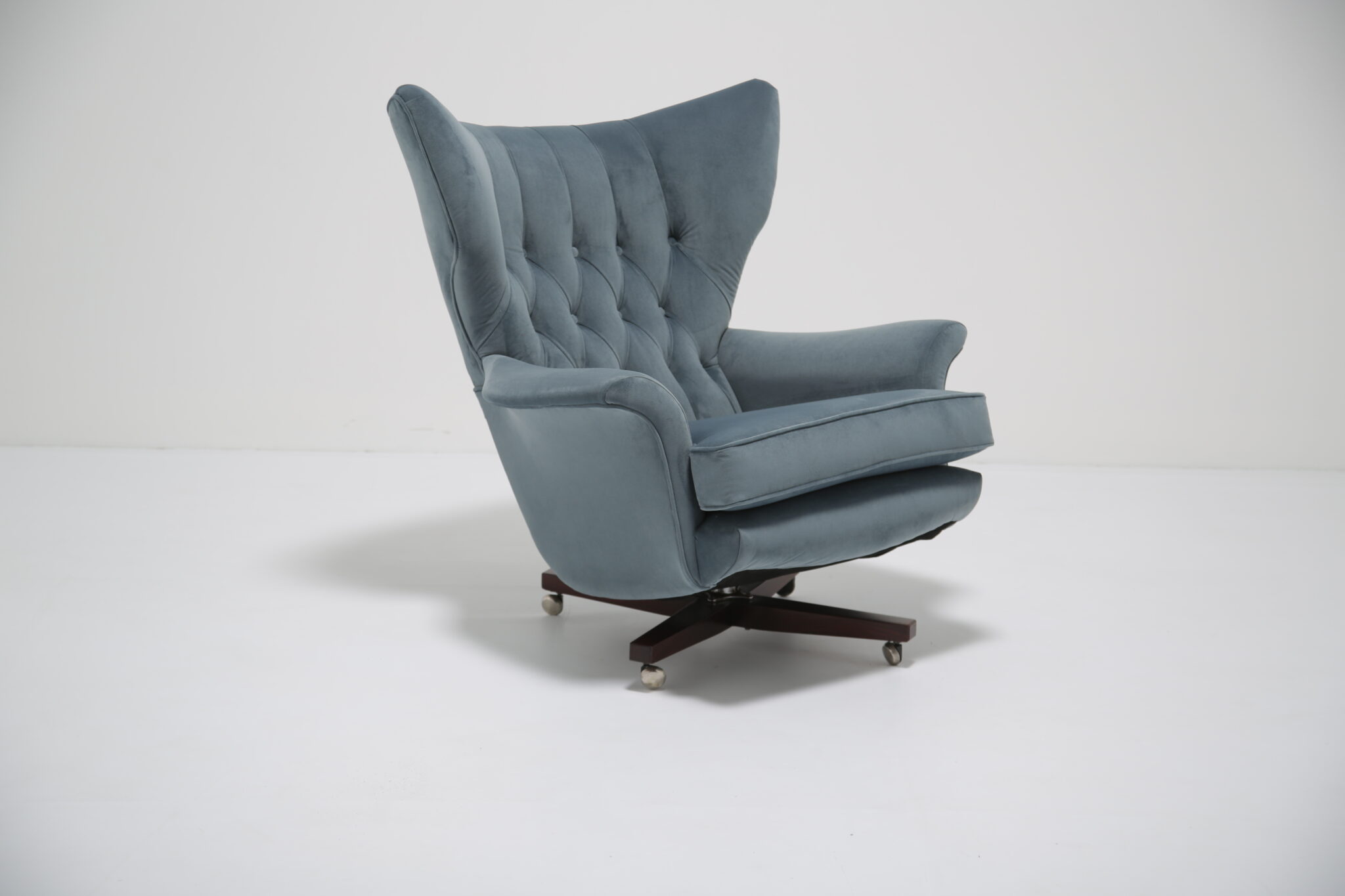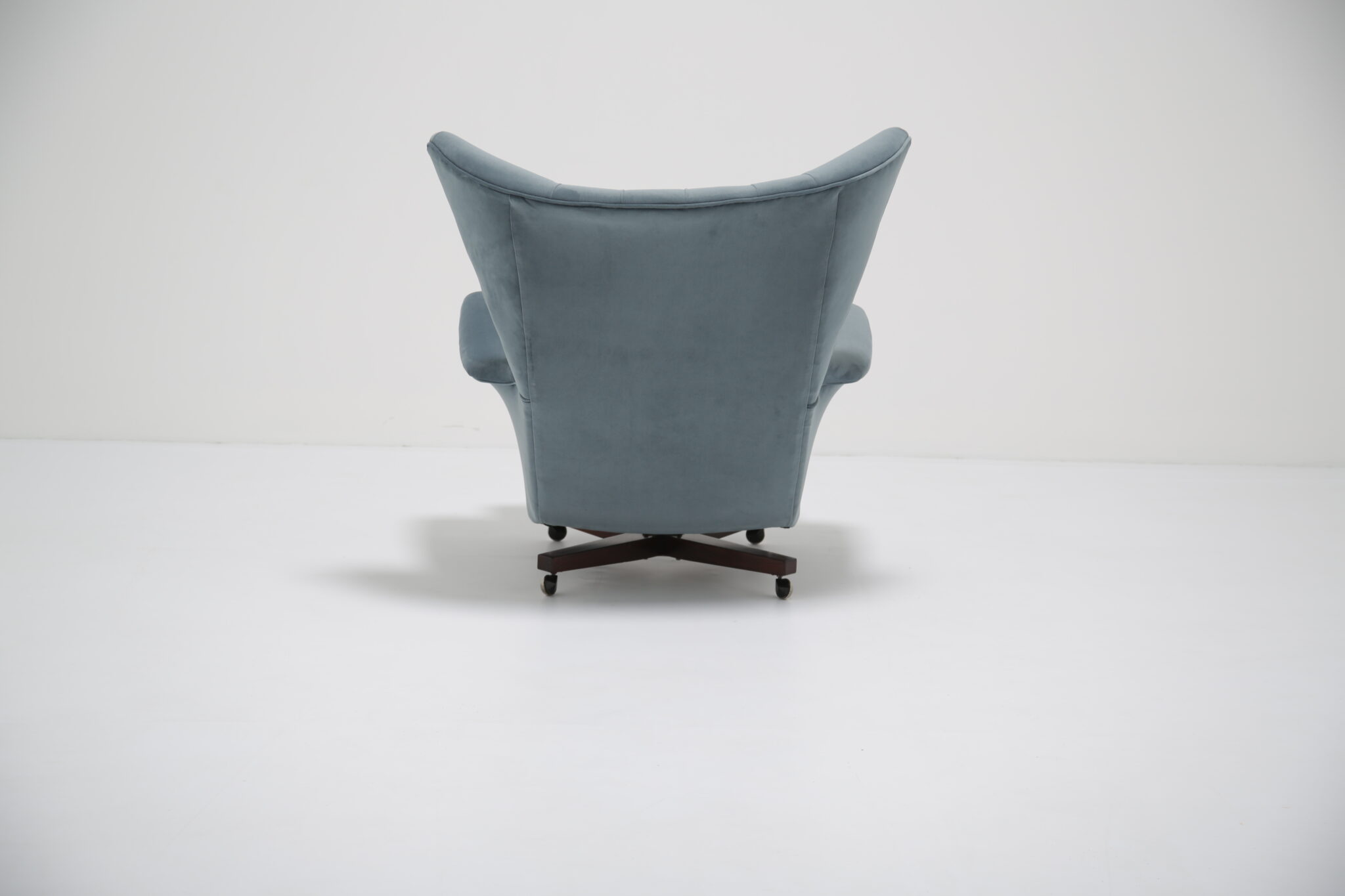 Designed by G-Plan in the late 1960s, the famous Model 6250 lounge chair—often nicknamed the “Blofeld chair” for its James Bond film connection—is a true mid-century icon. This sculptural armchair has been fully restored and reupholstered in a nice blue velvet that adds richness and sophistication. Its enveloping seat provides maximum comfort, while the swivel and rocking base with castors offers both flexibility and ease of movement. A bold design statement, it embodies the futuristic aesthetic of 1960s Britain and remains highly collectible today. The base is in rosewood, adding a depth of color to this gorgeous and comfortable lounge chair.