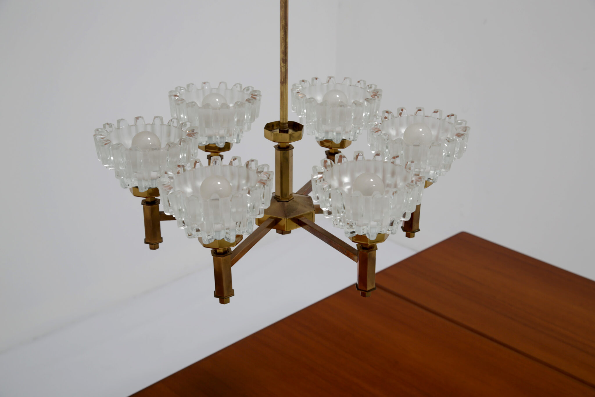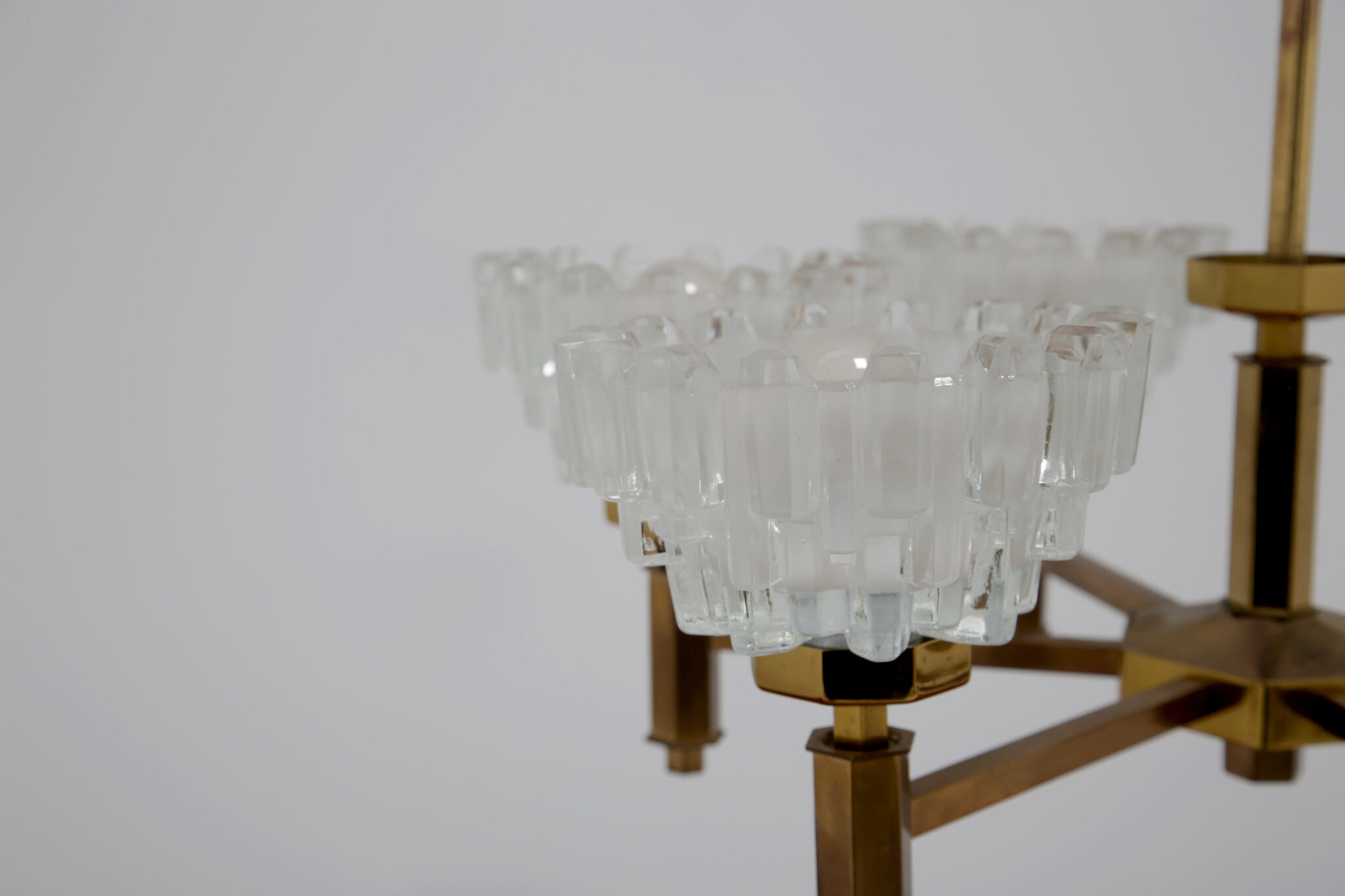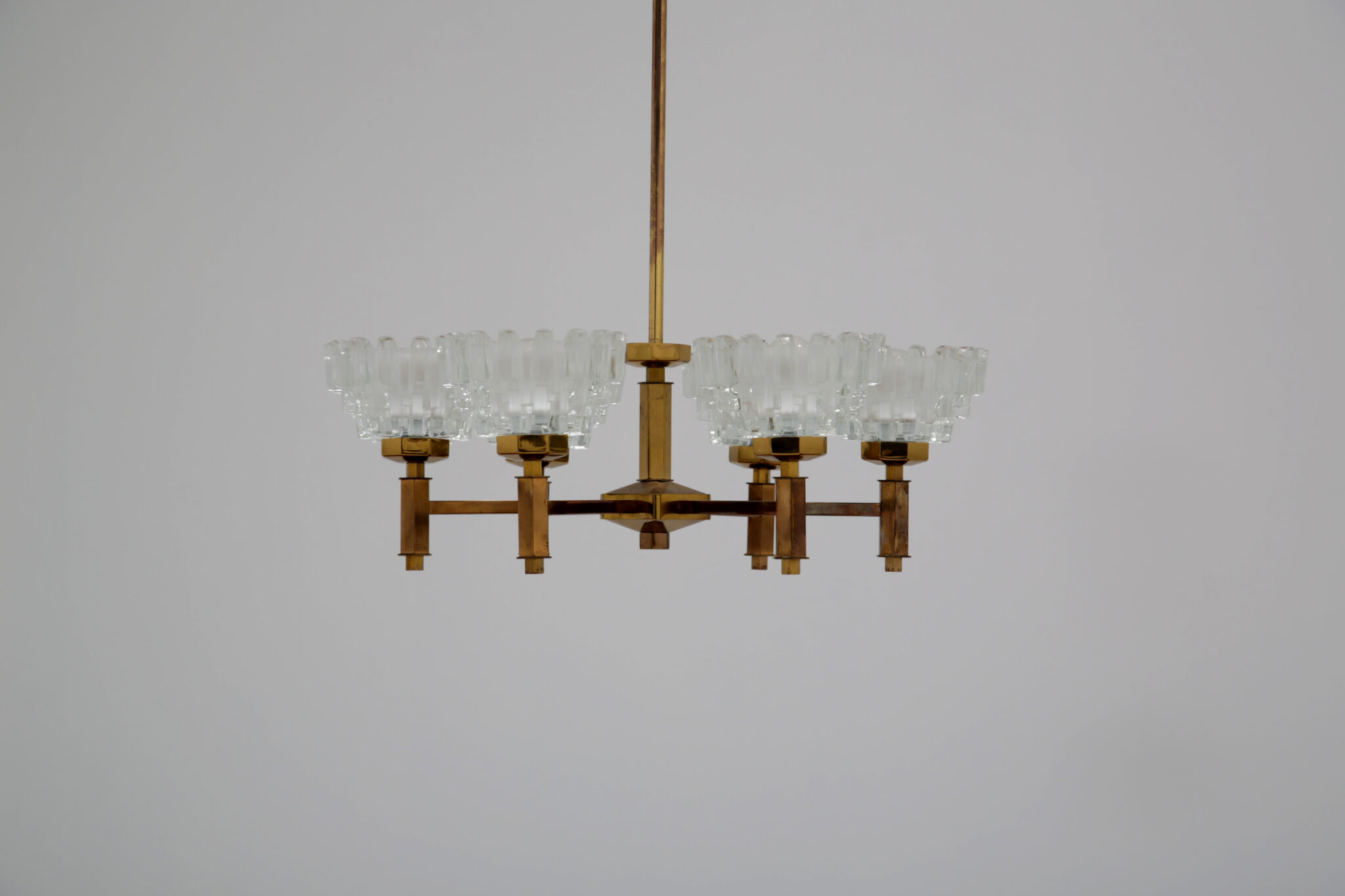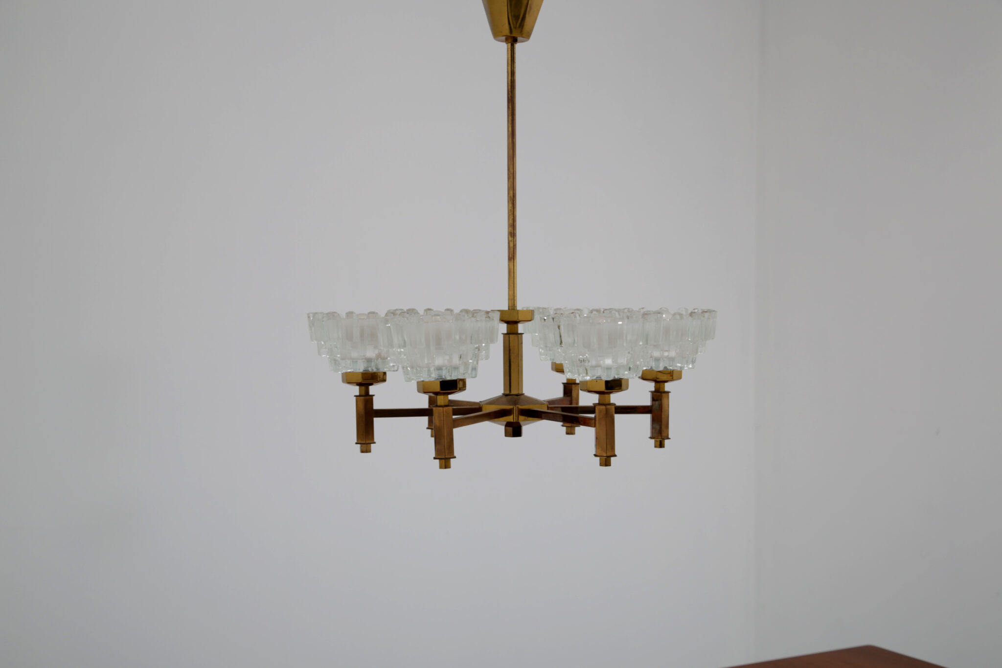 This stunning chandelier was imported from Sweden and was designed by the renowned lighting designer Hans-Agne Jakobsson, a household name in Sweden and around the world for the beautifully sculpted lighting he designed. This chandelier is no different, featuring 6 beautifully sculpted cut glass shades with beautifully shaped hexagonal design on the frame. This chandelier features 6 arms, and would be perfect above a dining table to provide cozy lighting.