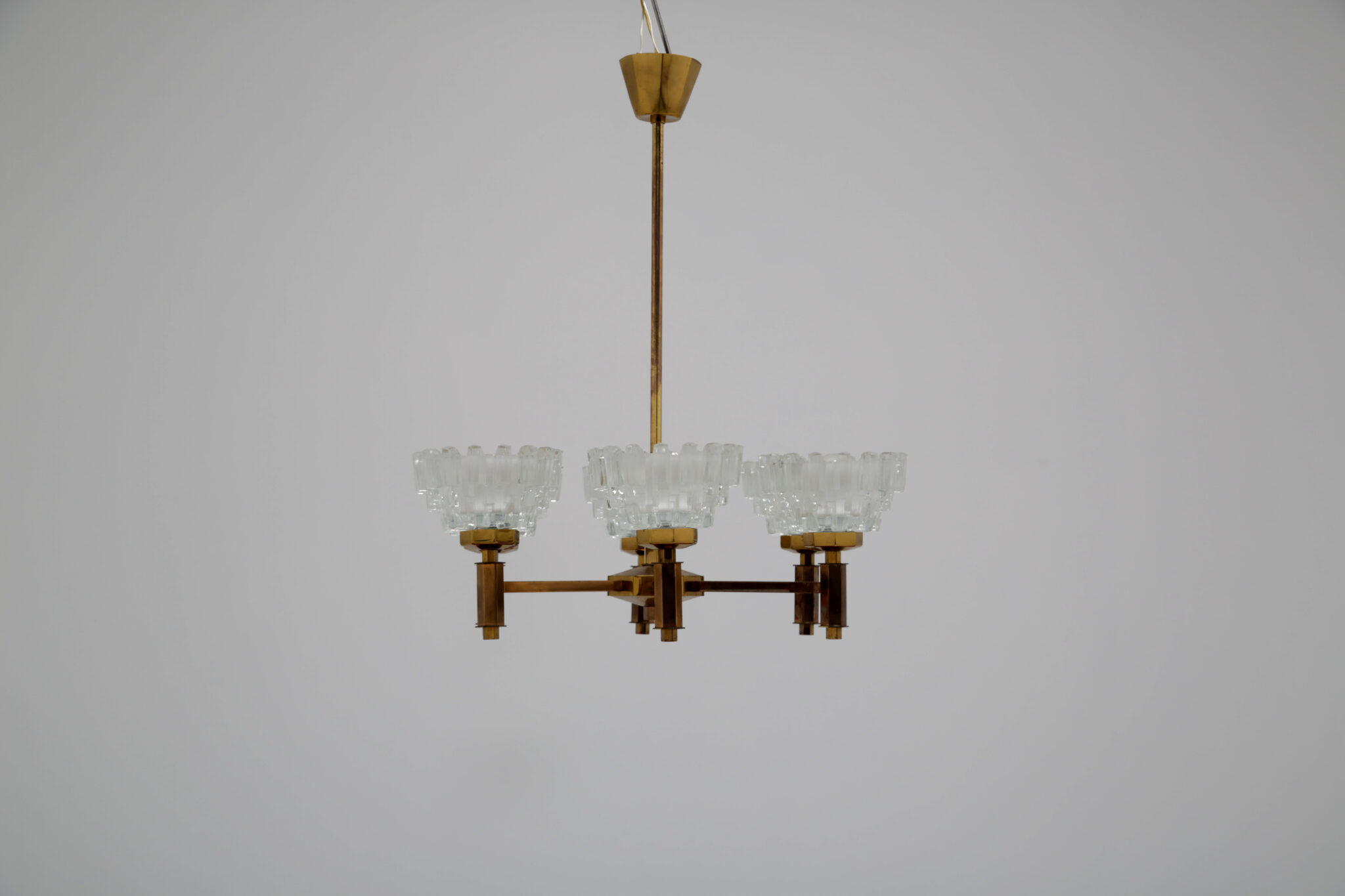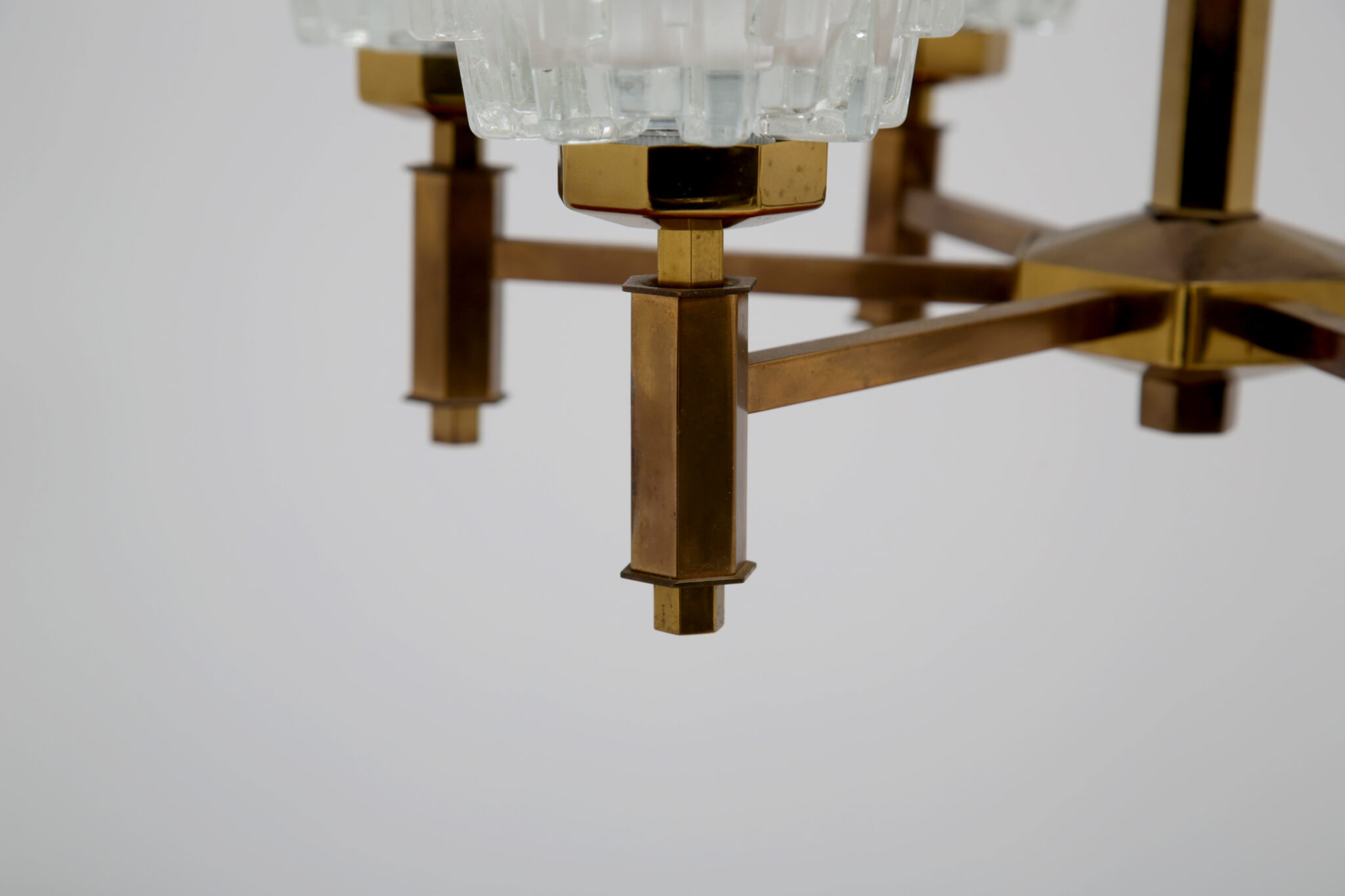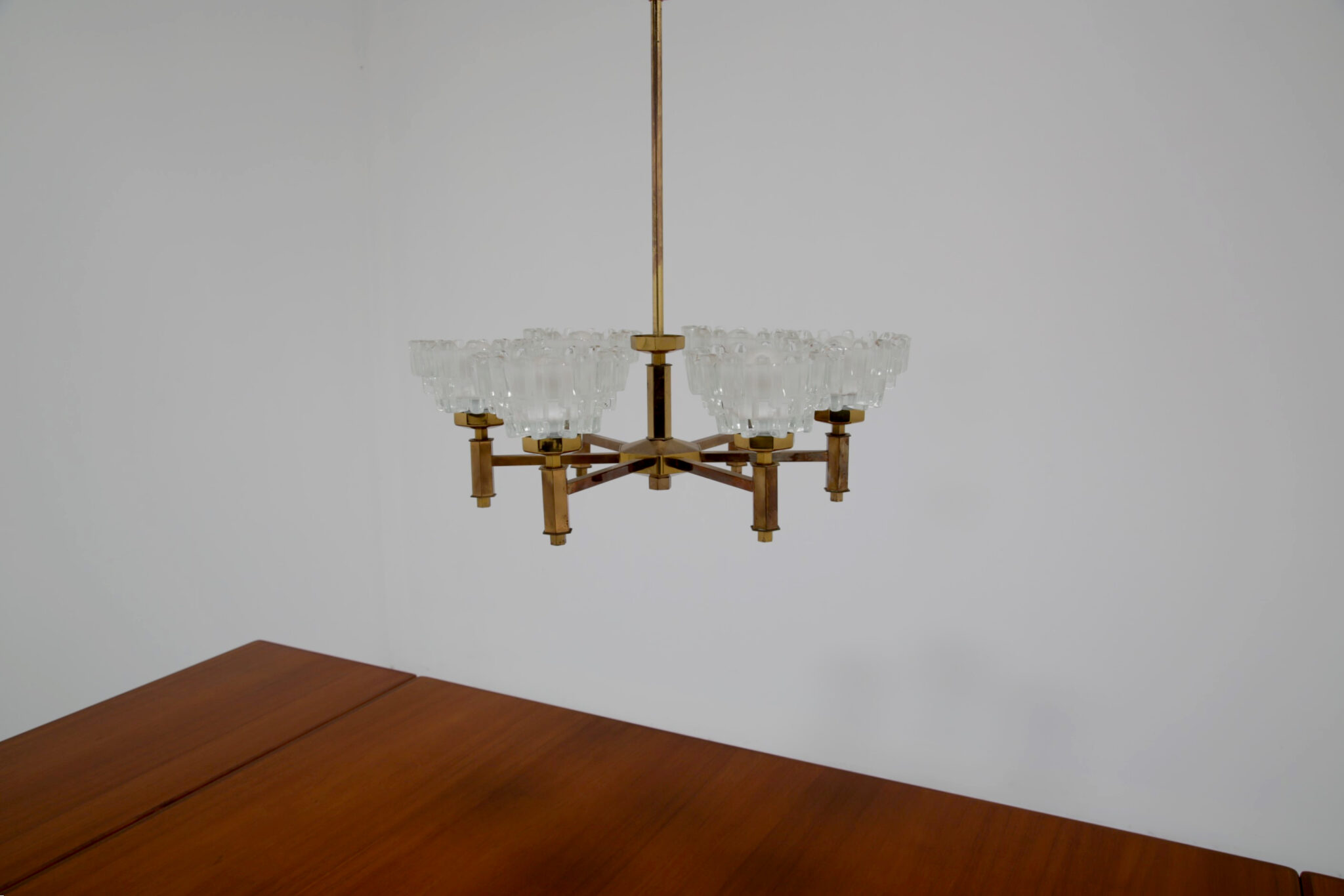 This stunning chandelier was imported from Sweden and was designed by the renowned lighting designer Hans-Agne Jakobsson, a household name in Sweden and around the world for the beautifully sculpted lighting he designed. This chandelier is no different, featuring 6 beautifully sculpted cut glass shades with beautifully shaped hexagonal design on the frame. This chandelier features 6 arms, and would be perfect above a dining table to provide cozy lighting.