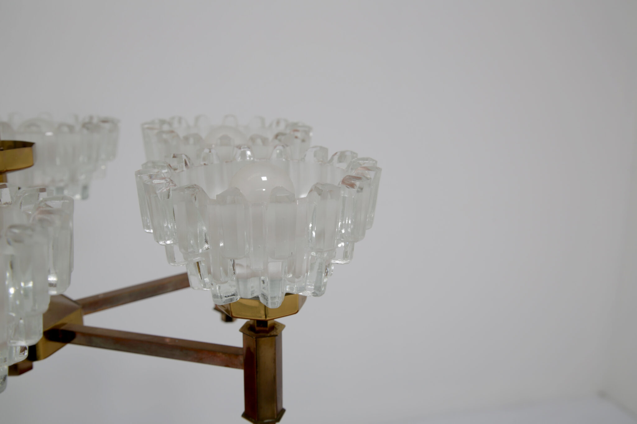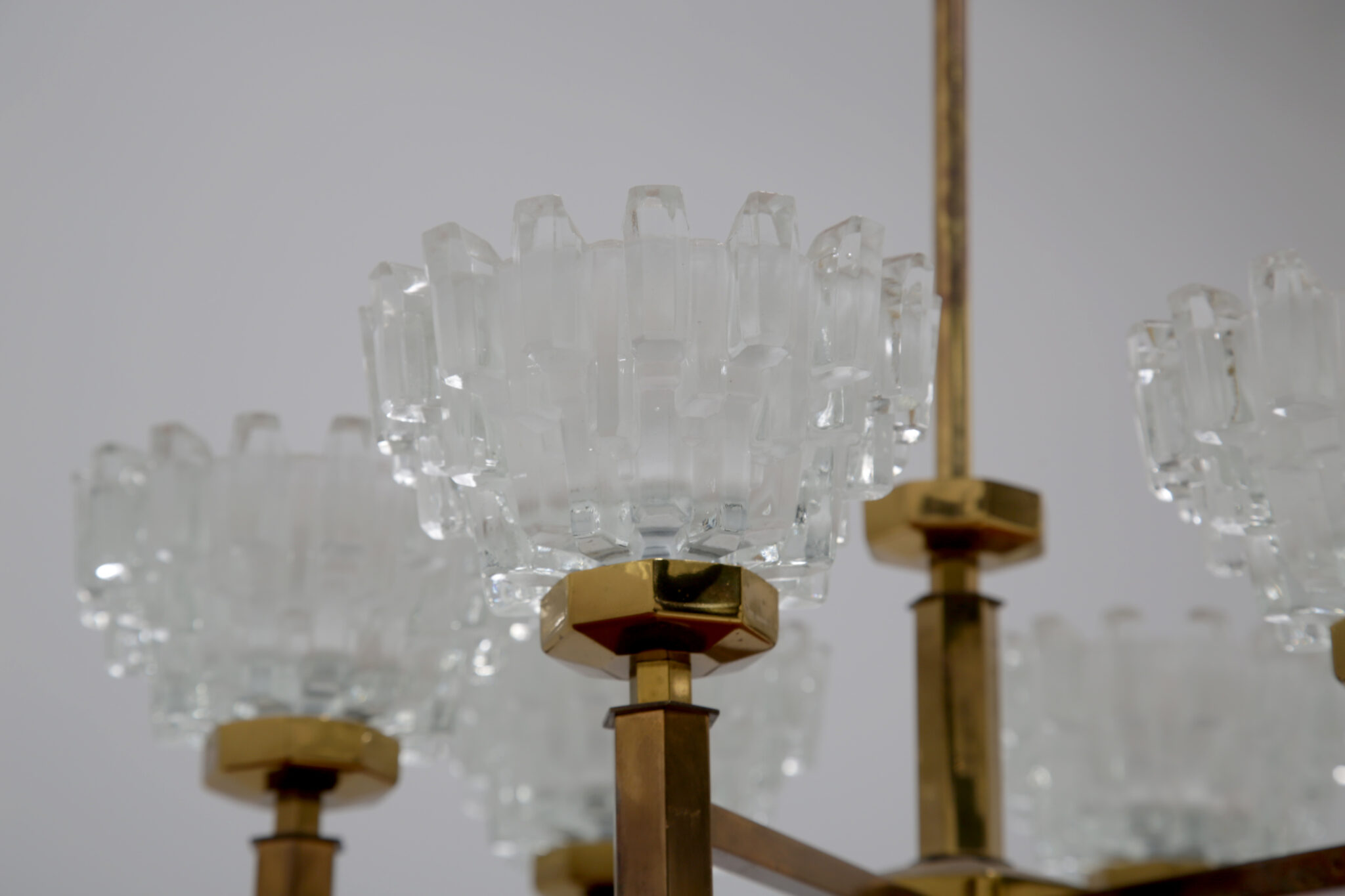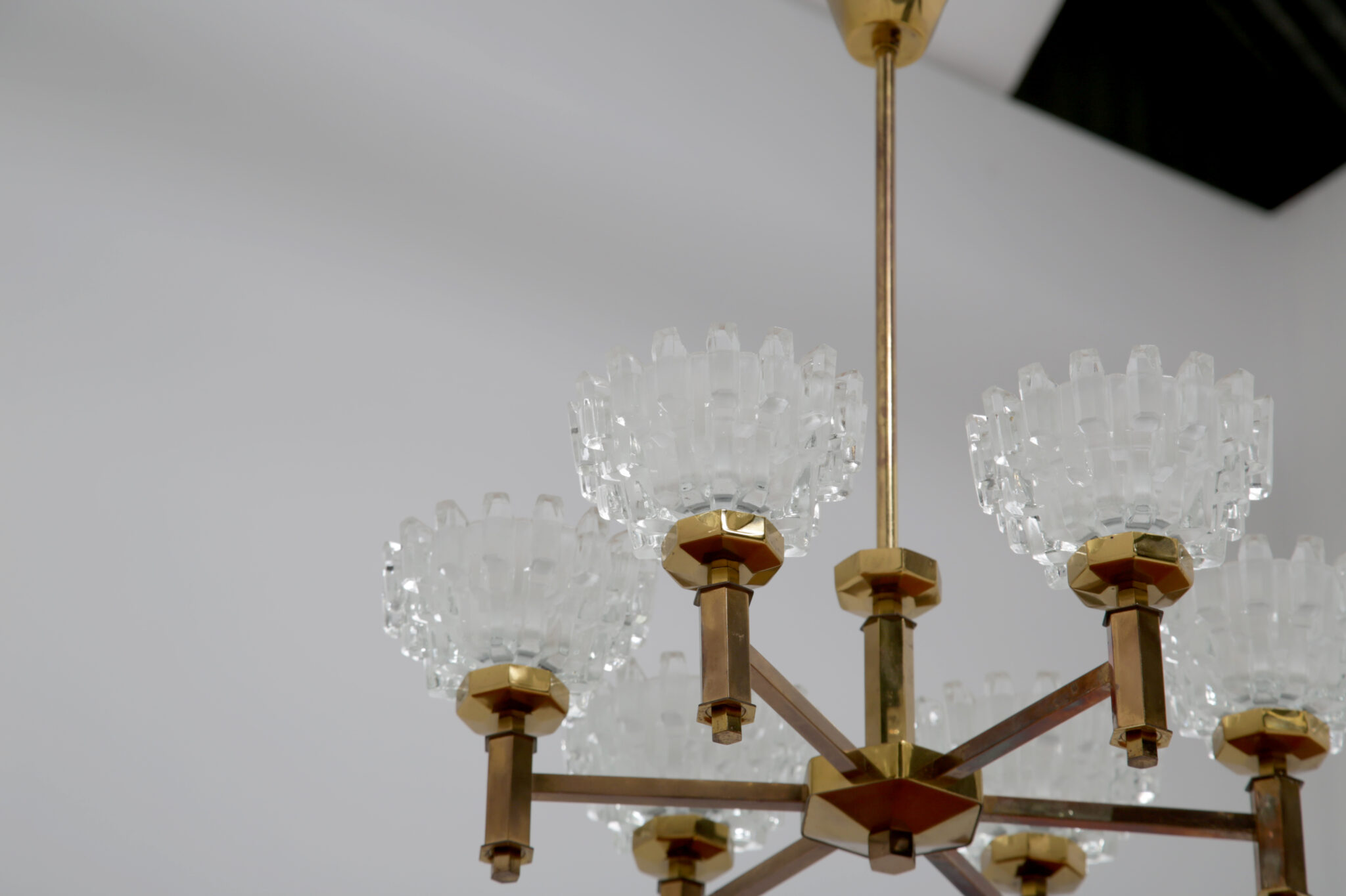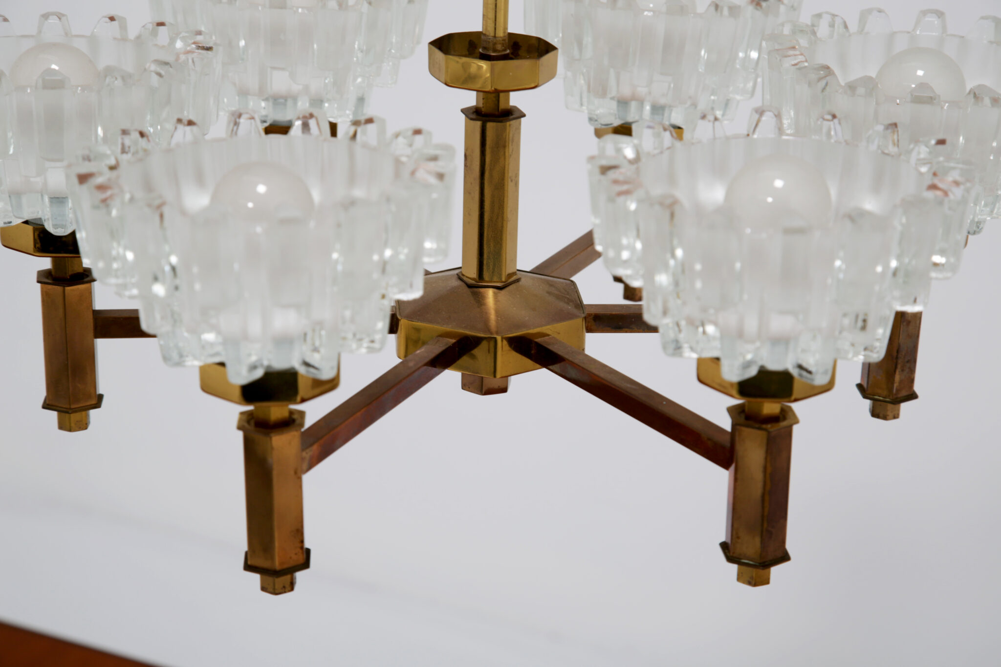 This stunning chandelier was imported from Sweden and was designed by the renowned lighting designer Hans-Agne Jakobsson, a household name in Sweden and around the world for the beautifully sculpted lighting he designed. This chandelier is no different, featuring 6 beautifully sculpted cut glass shades with beautifully shaped hexagonal design on the frame. This chandelier features 6 arms, and would be perfect above a dining table to provide cozy lighting.
