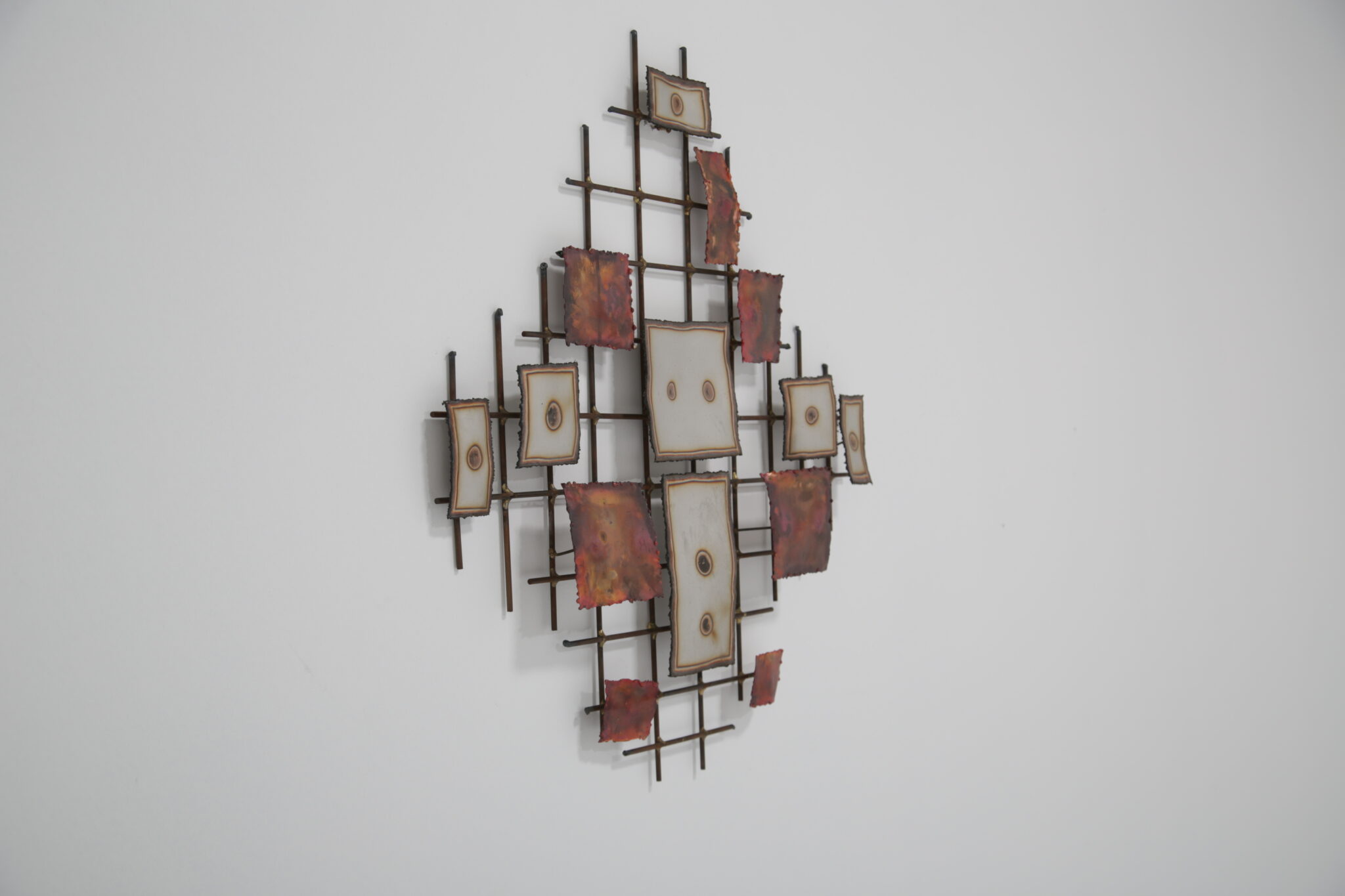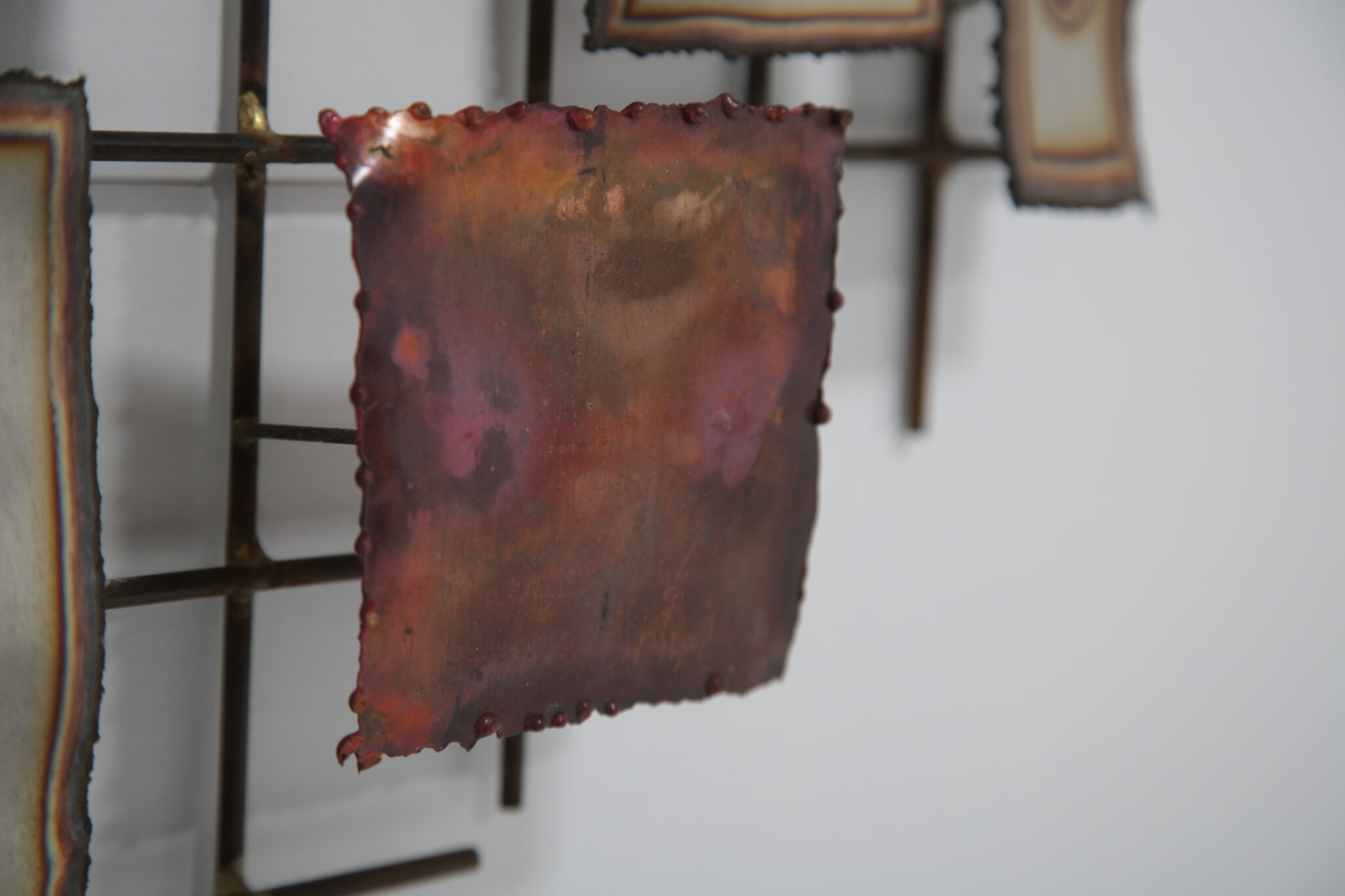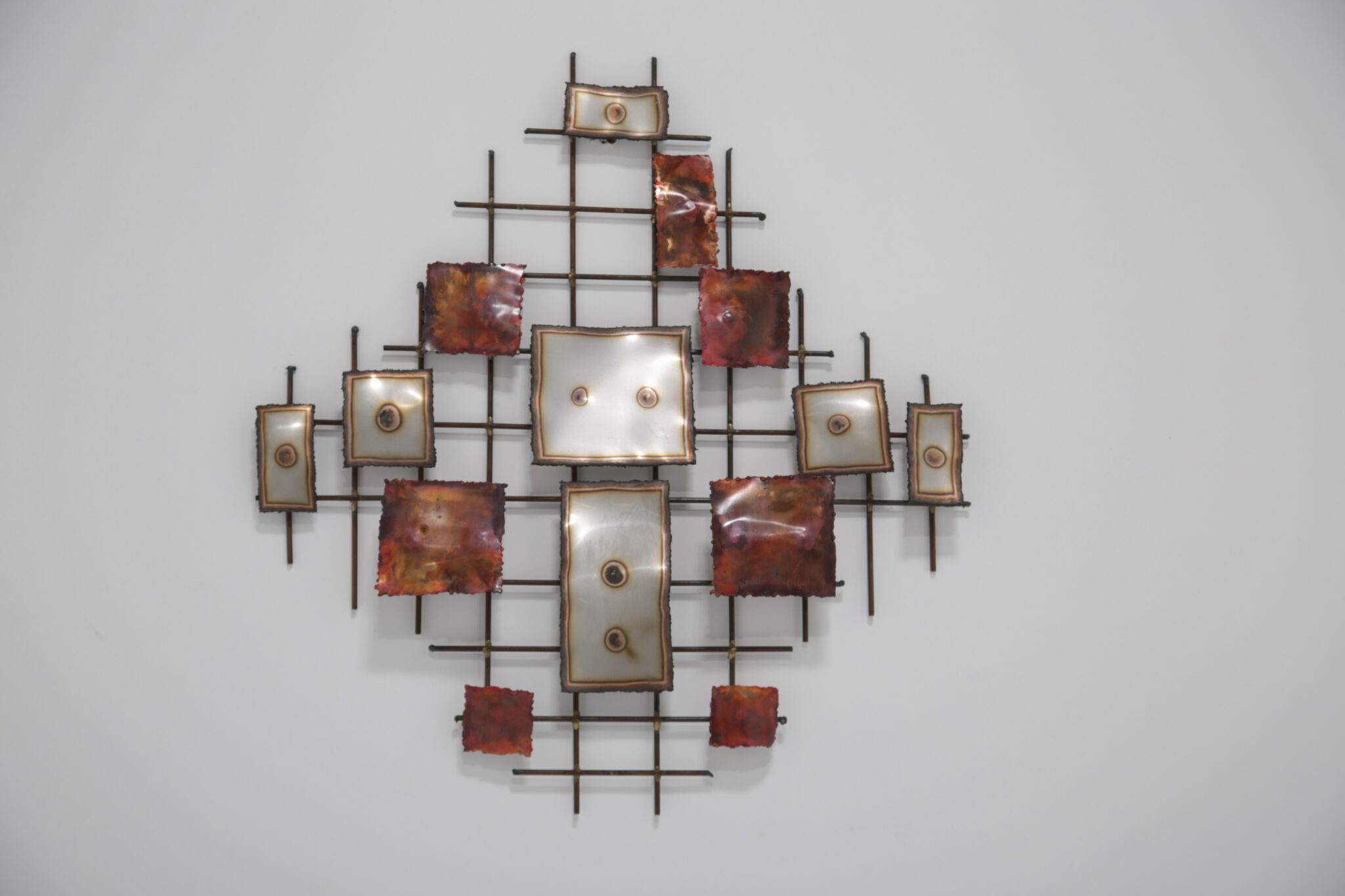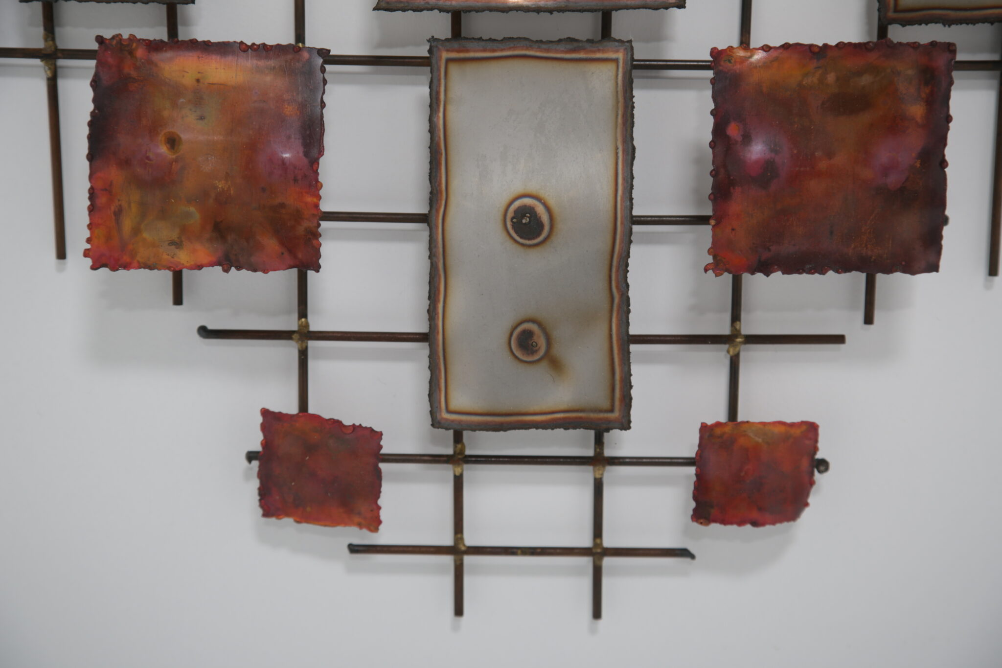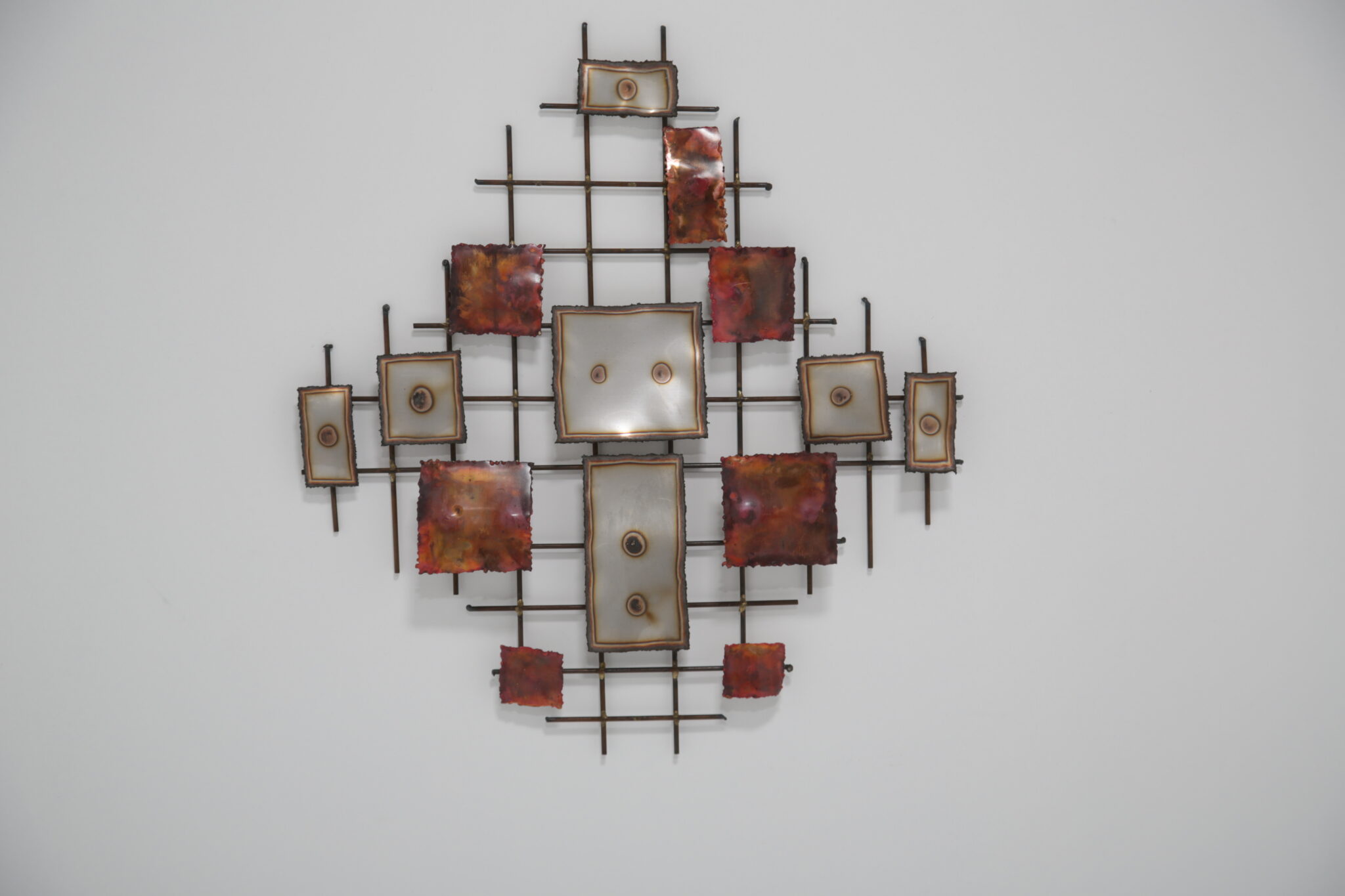This striking vintage wall sculpture embodies the bold and raw energy of Brutalist design, bringing a dynamic statement to any space. Composed of a grid of sculpted metal panels with rich patina and contrasting textures, this piece evokes a sense of movement and industrial charm. The interplay between the sleek, smooth surfaces and the rust-like finish creates a visually engaging contrast that adds depth to any room. The fluid arrangement of geometric forms gives it a timeless yet modern appeal, ideal for enhancing mid-century modern or eclectic interiors.