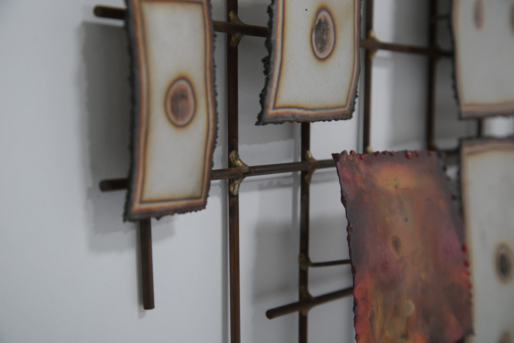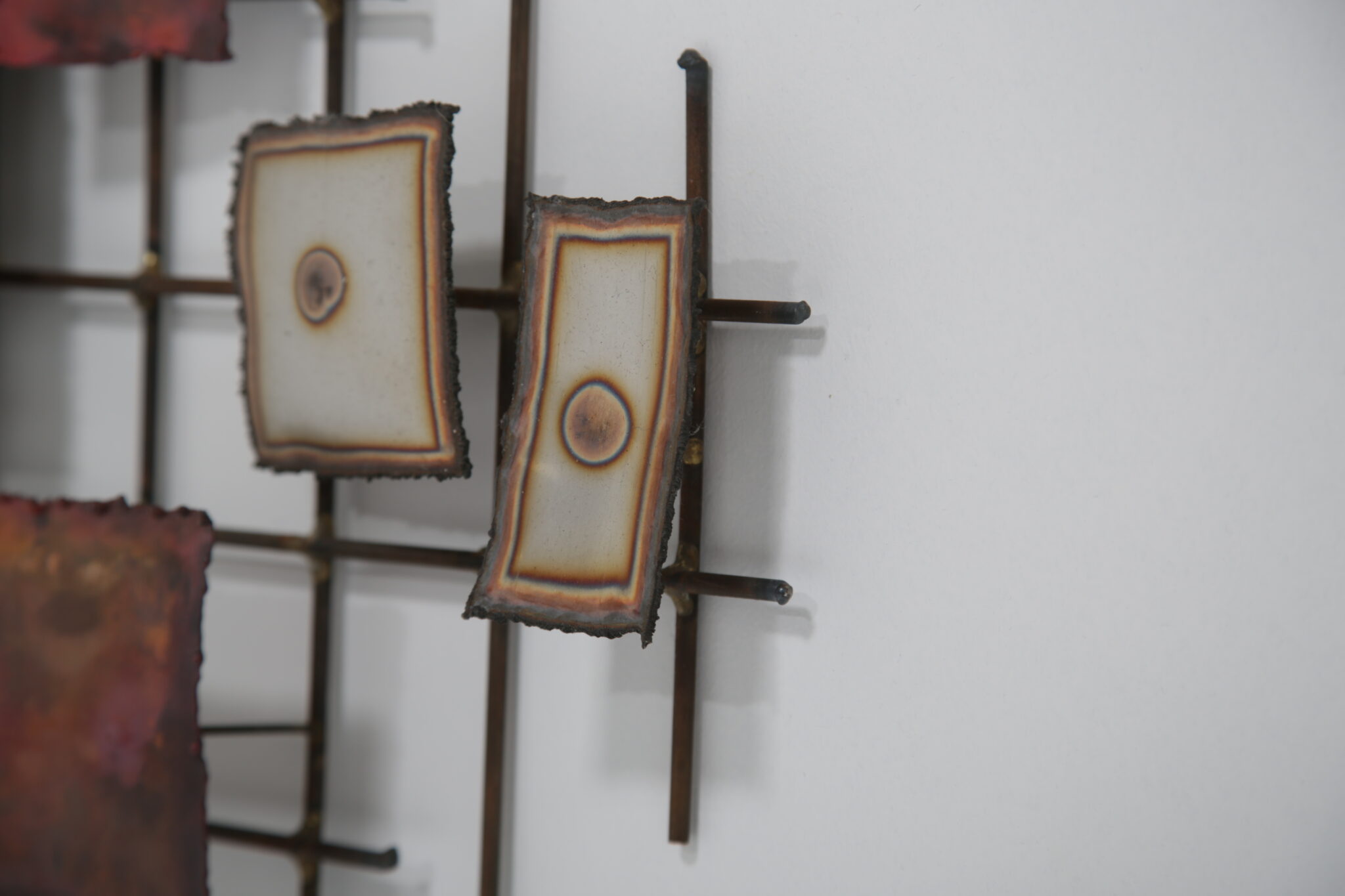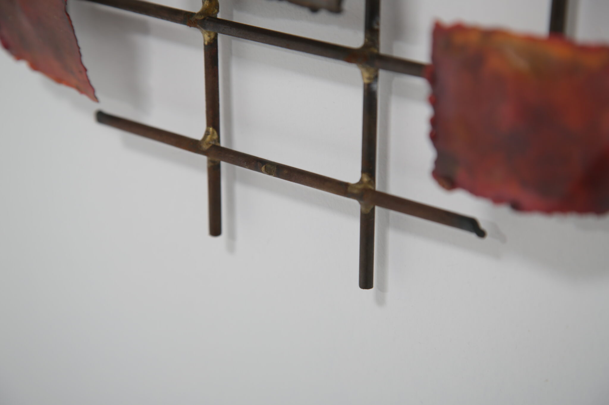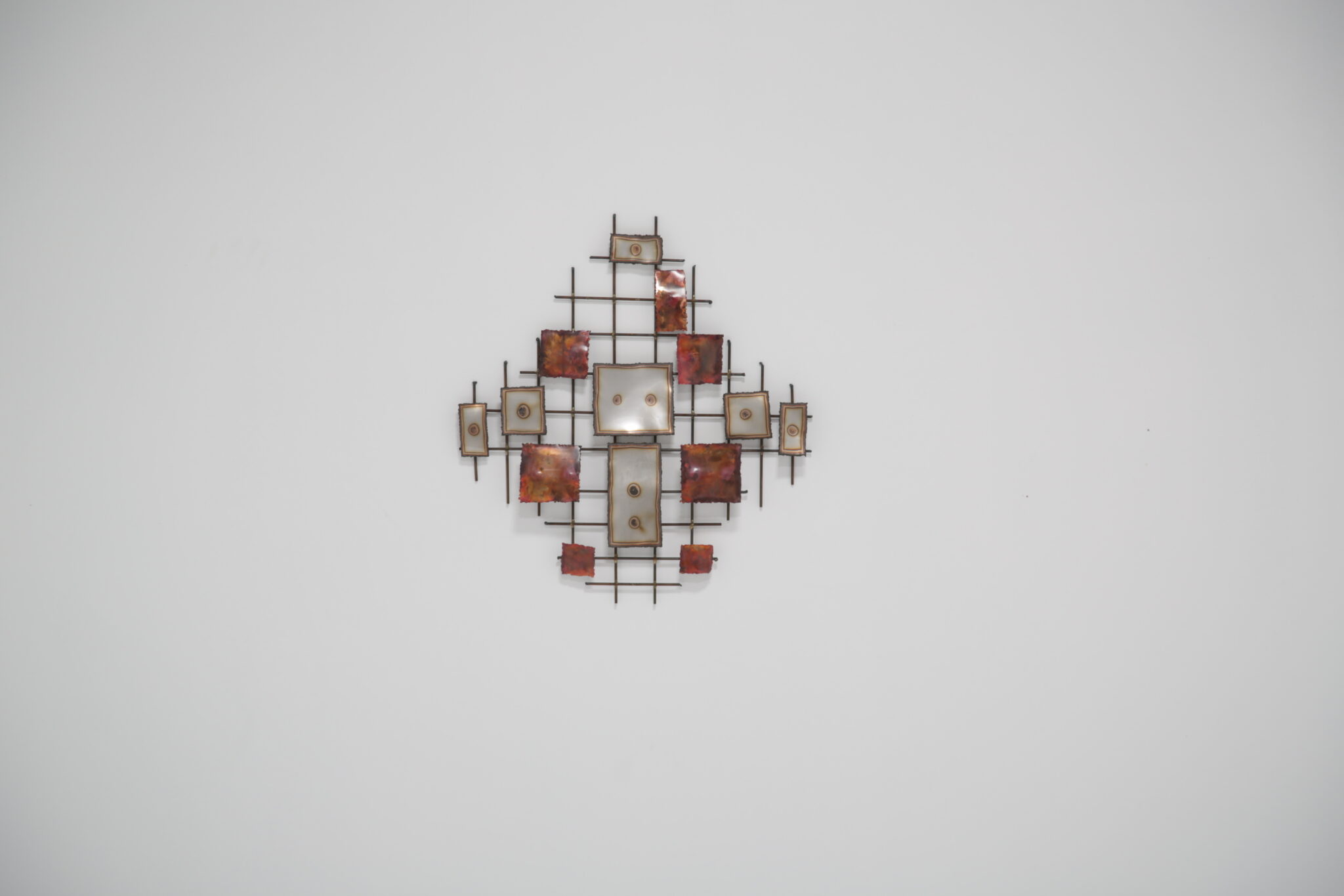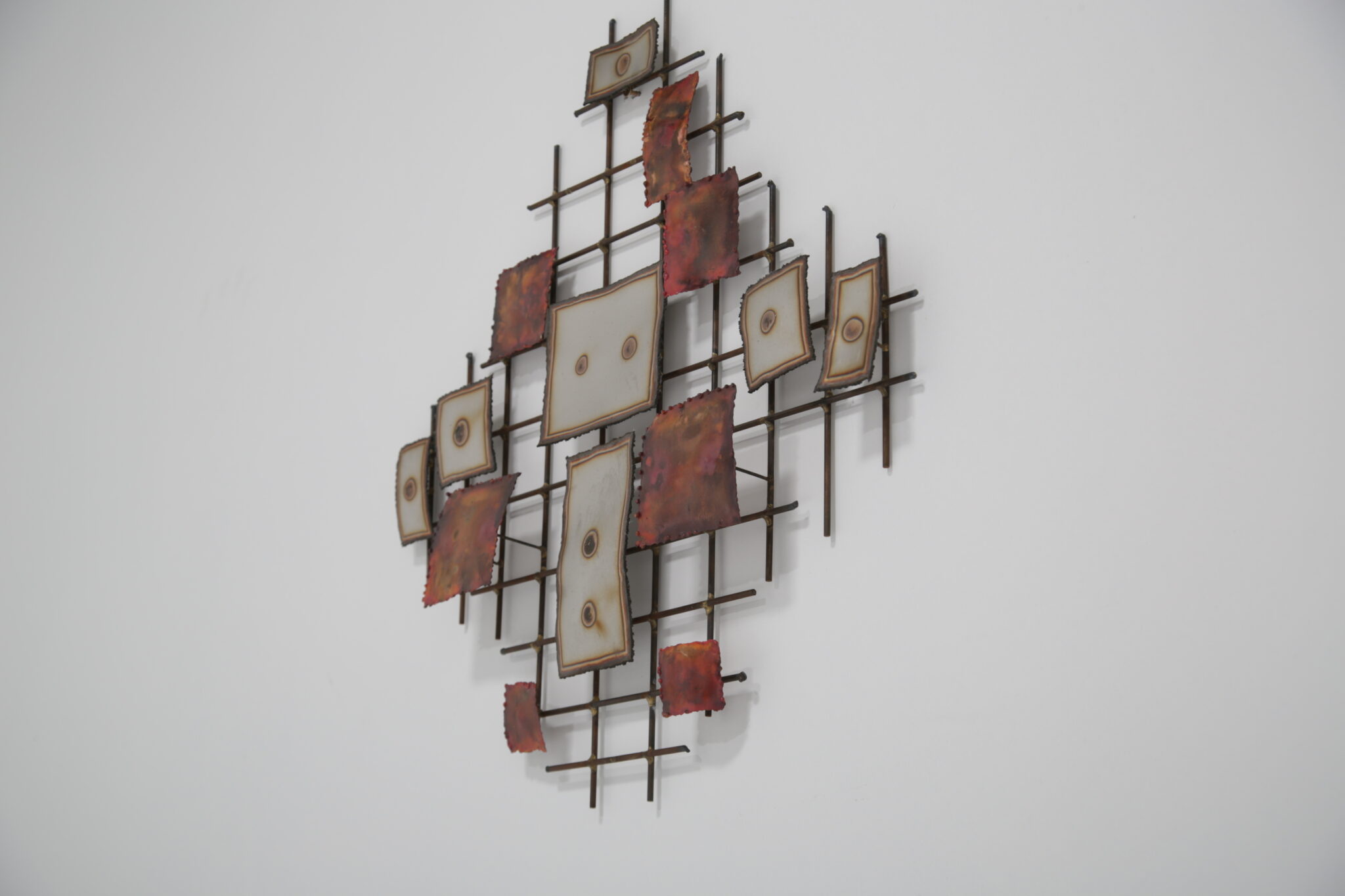 This striking vintage wall sculpture embodies the bold and raw energy of Brutalist design, bringing a dynamic statement to any space. Composed of a grid of sculpted metal panels with rich patina and contrasting textures, this piece evokes a sense of movement and industrial charm. The interplay between the sleek, smooth surfaces and the rust-like finish creates a visually engaging contrast that adds depth to any room. The fluid arrangement of geometric forms gives it a timeless yet modern appeal, ideal for enhancing mid-century modern or eclectic interiors.