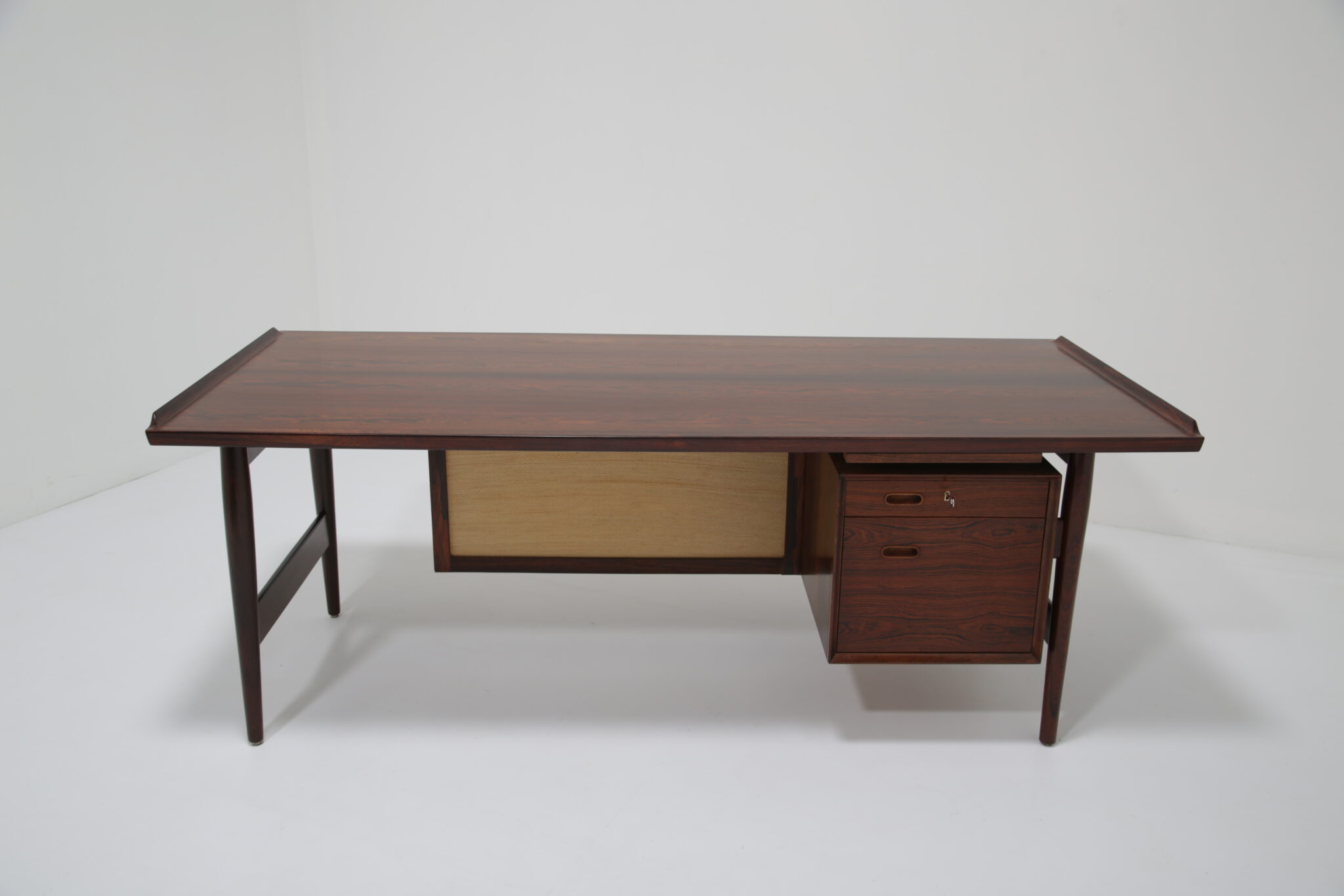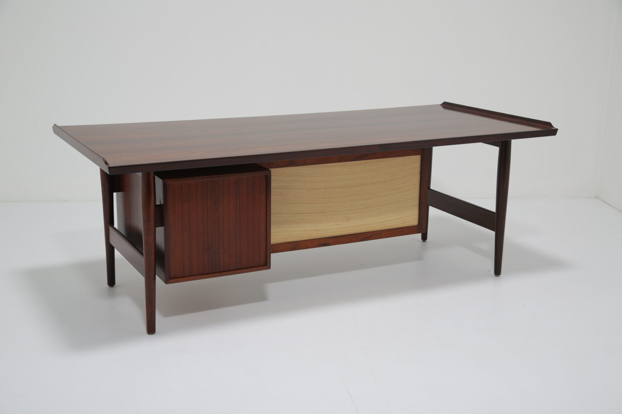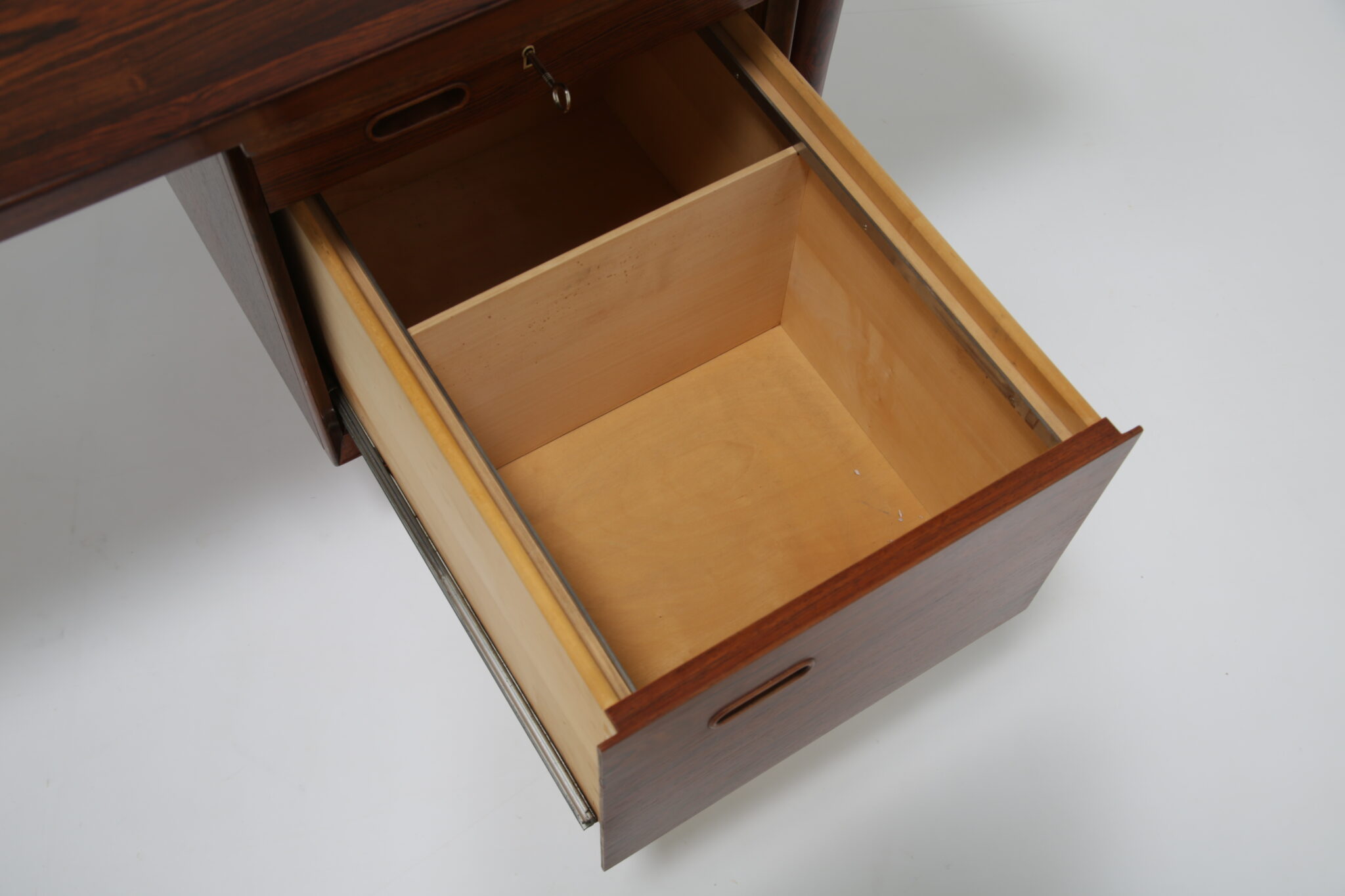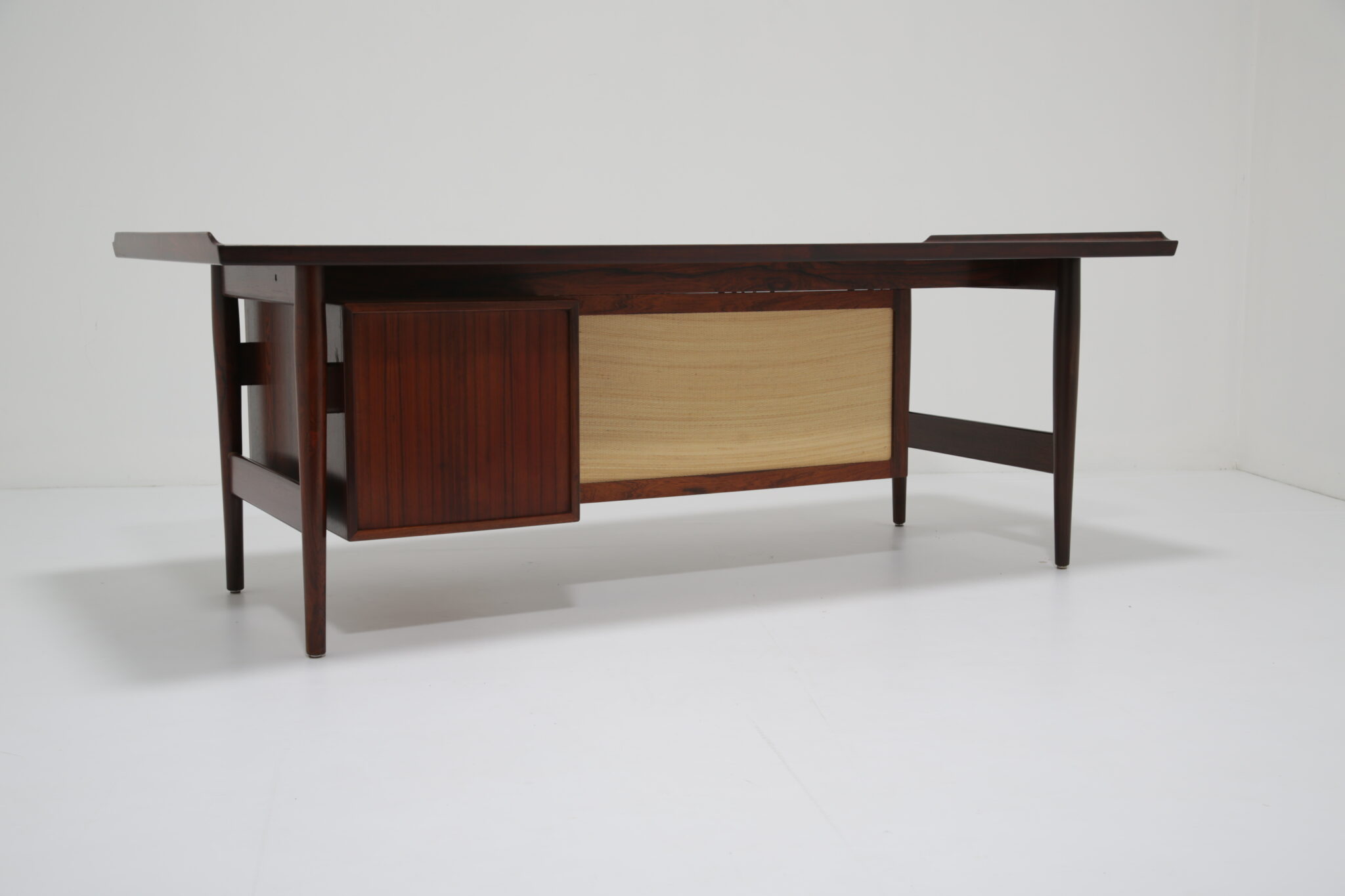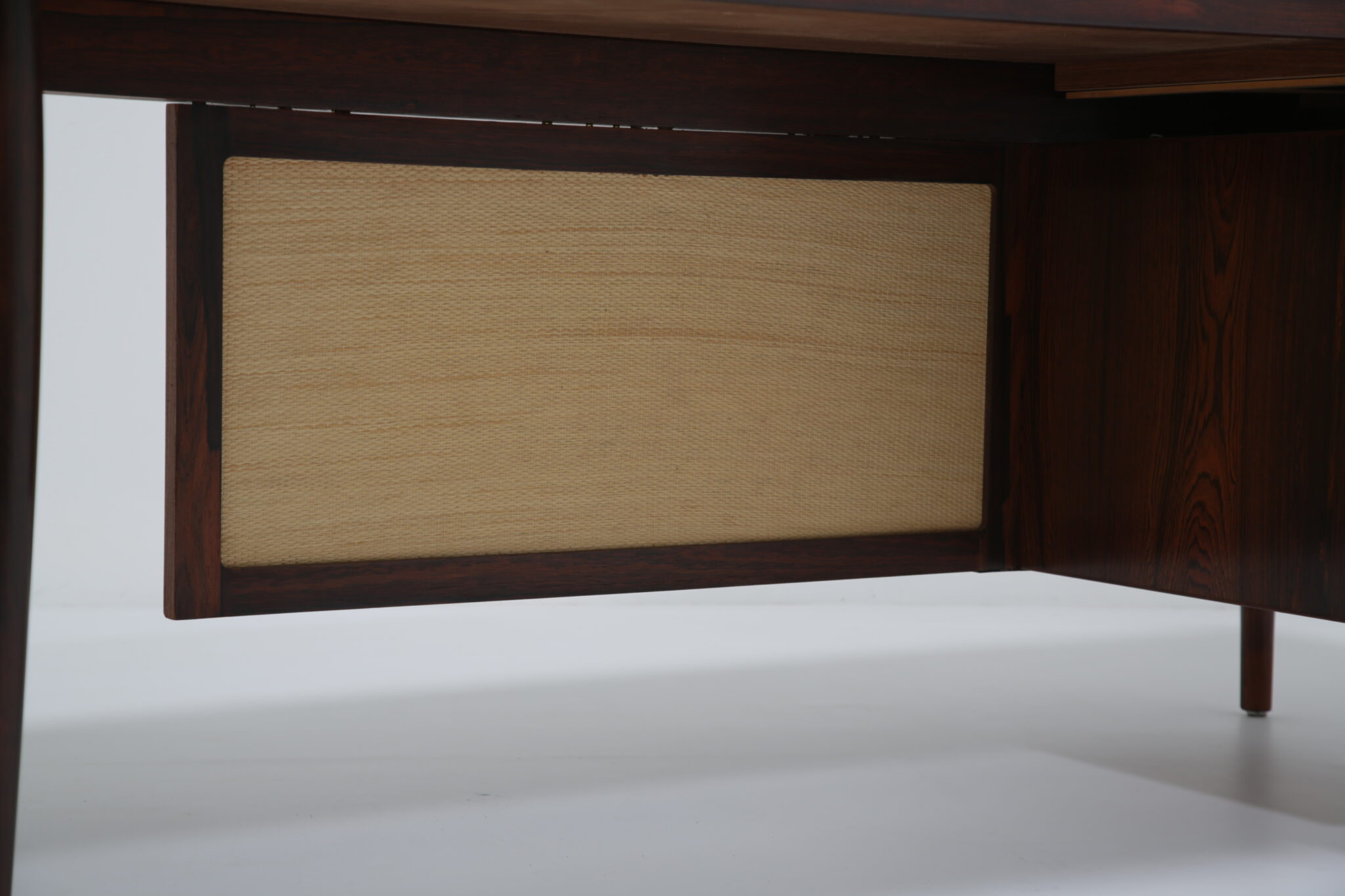 Make a statement in your office with this stunning executive rosewood desk designed by the renowned Danish designer Arne Vodder and manufactured by Sibast Møbler in the 1960s. This desk is truly an extraordinary piece with a deep pronounced rosewood grain, curved raised edges, rounded legs and a screen cover underneath in rattan that can be removed if necessary. The desk features small pull out drawer for holding your pens and other smaller items such as erasers, staples and etcetera. The floating box holds two drawers, one small and one large that will hold files, documents and other essential and important items.
