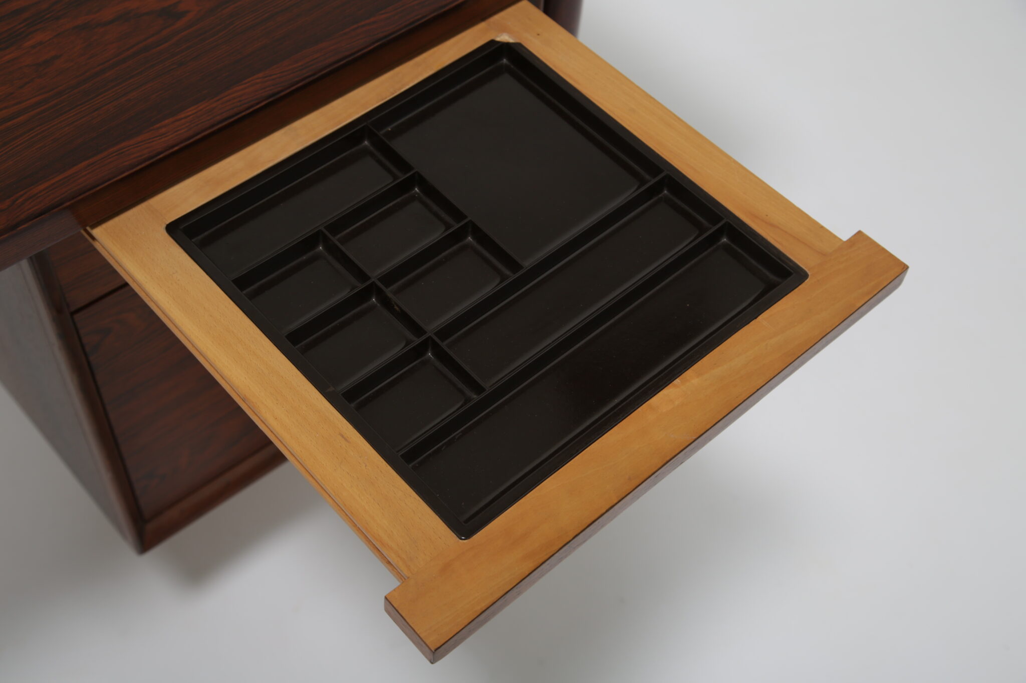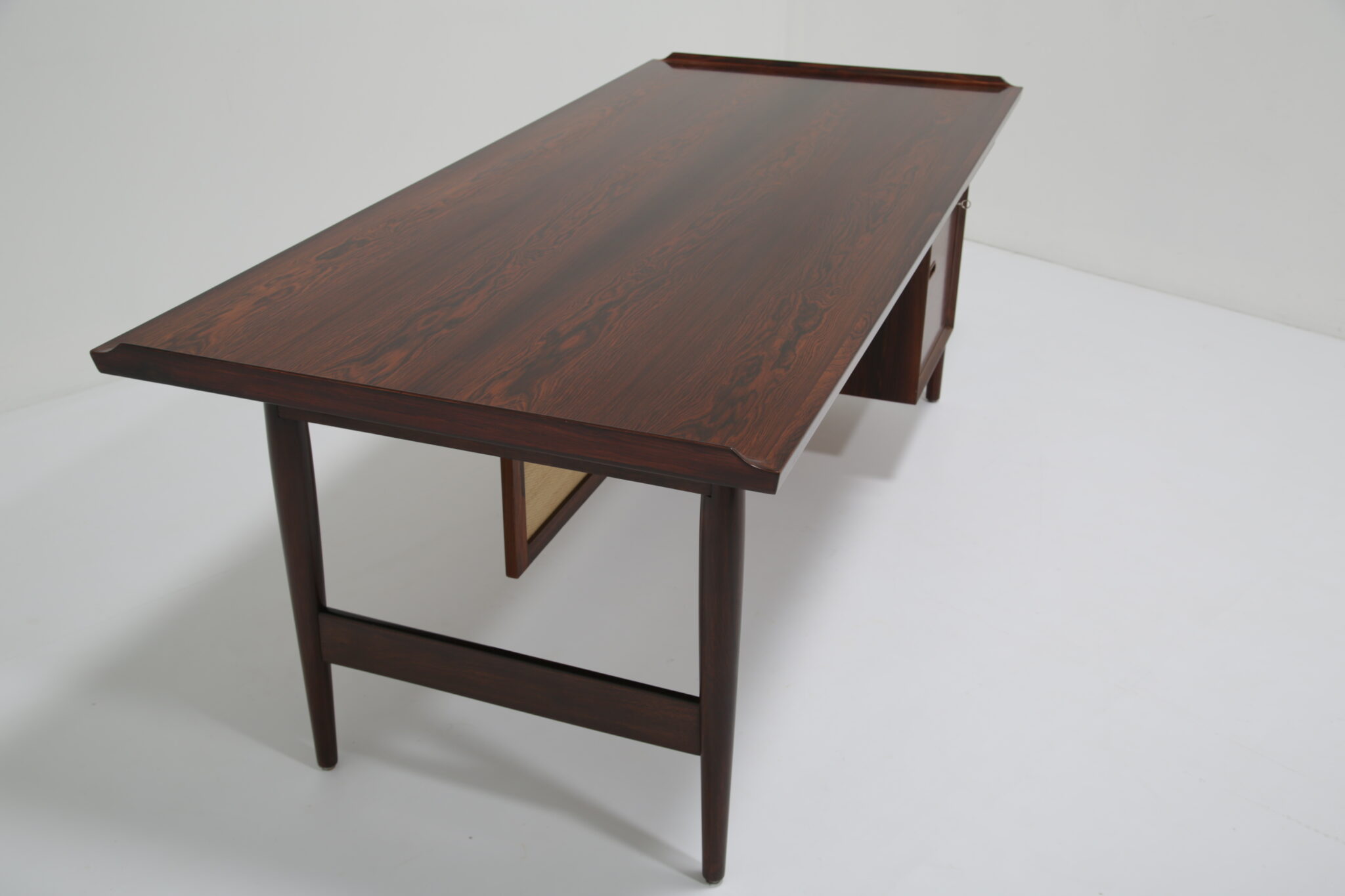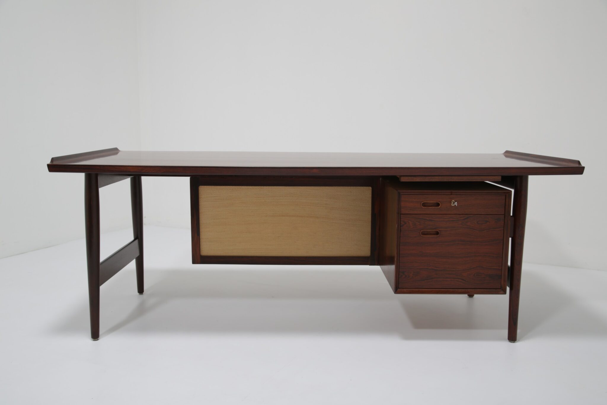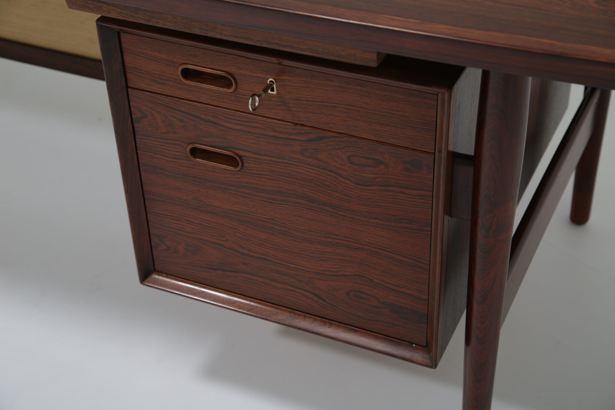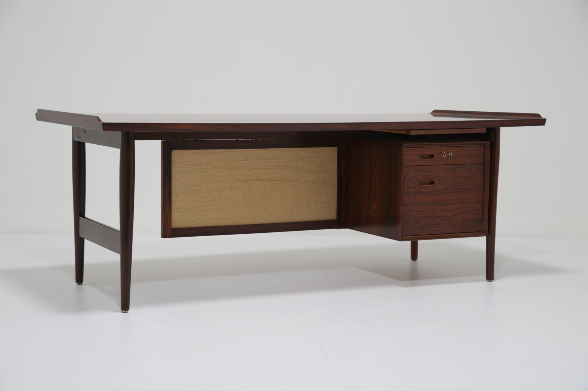 Make a statement in your office with this stunning executive rosewood desk designed by the renowned Danish designer Arne Vodder and manufactured by Sibast Møbler in the 1960s. This desk is truly an extraordinary piece with a deep pronounced rosewood grain, curved raised edges, rounded legs and a screen cover underneath in rattan that can be removed if necessary. The desk features small pull out drawer for holding your pens and other smaller items such as erasers, staples and etcetera. The floating box holds two drawers, one small and one large that will hold files, documents and other essential and important items.