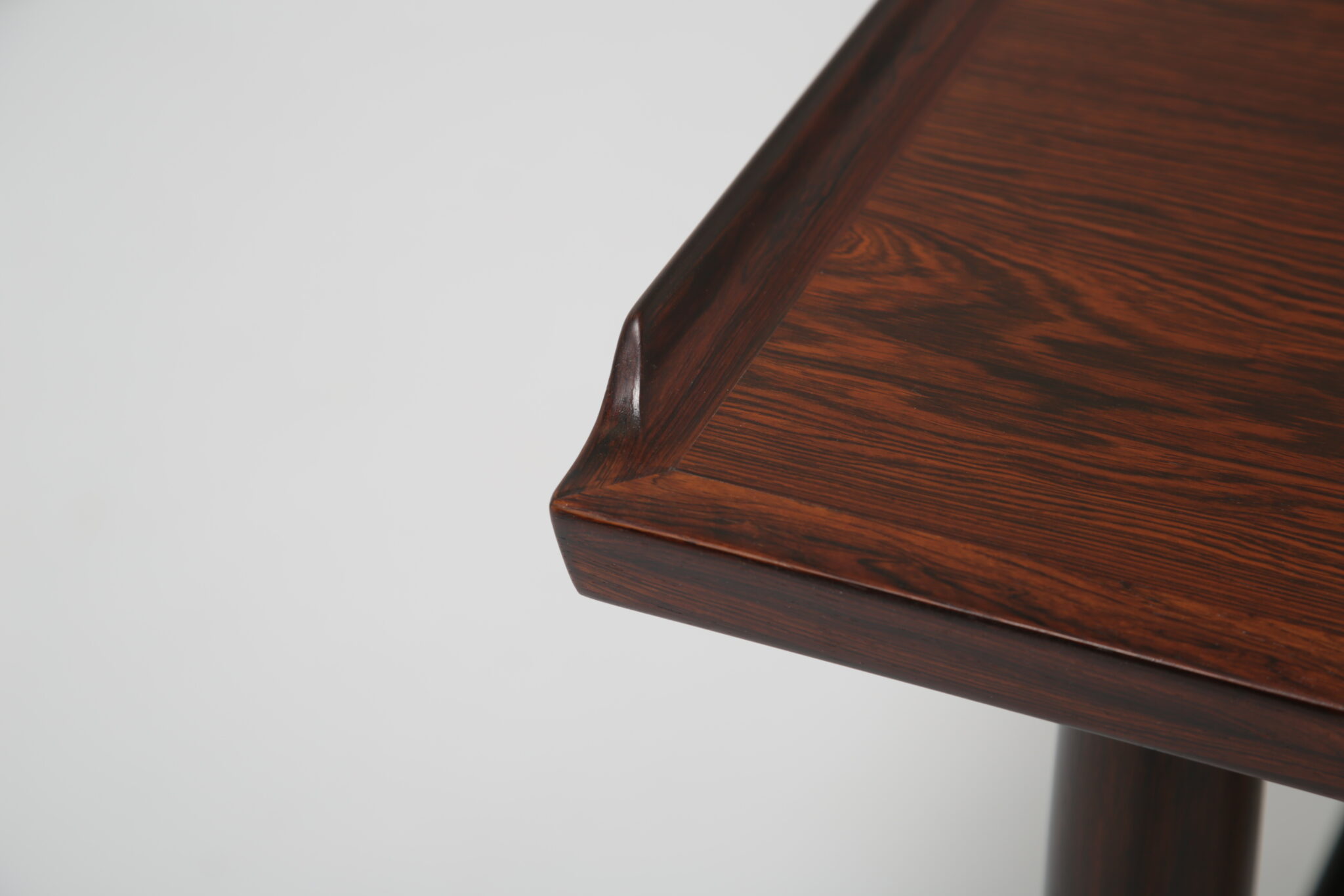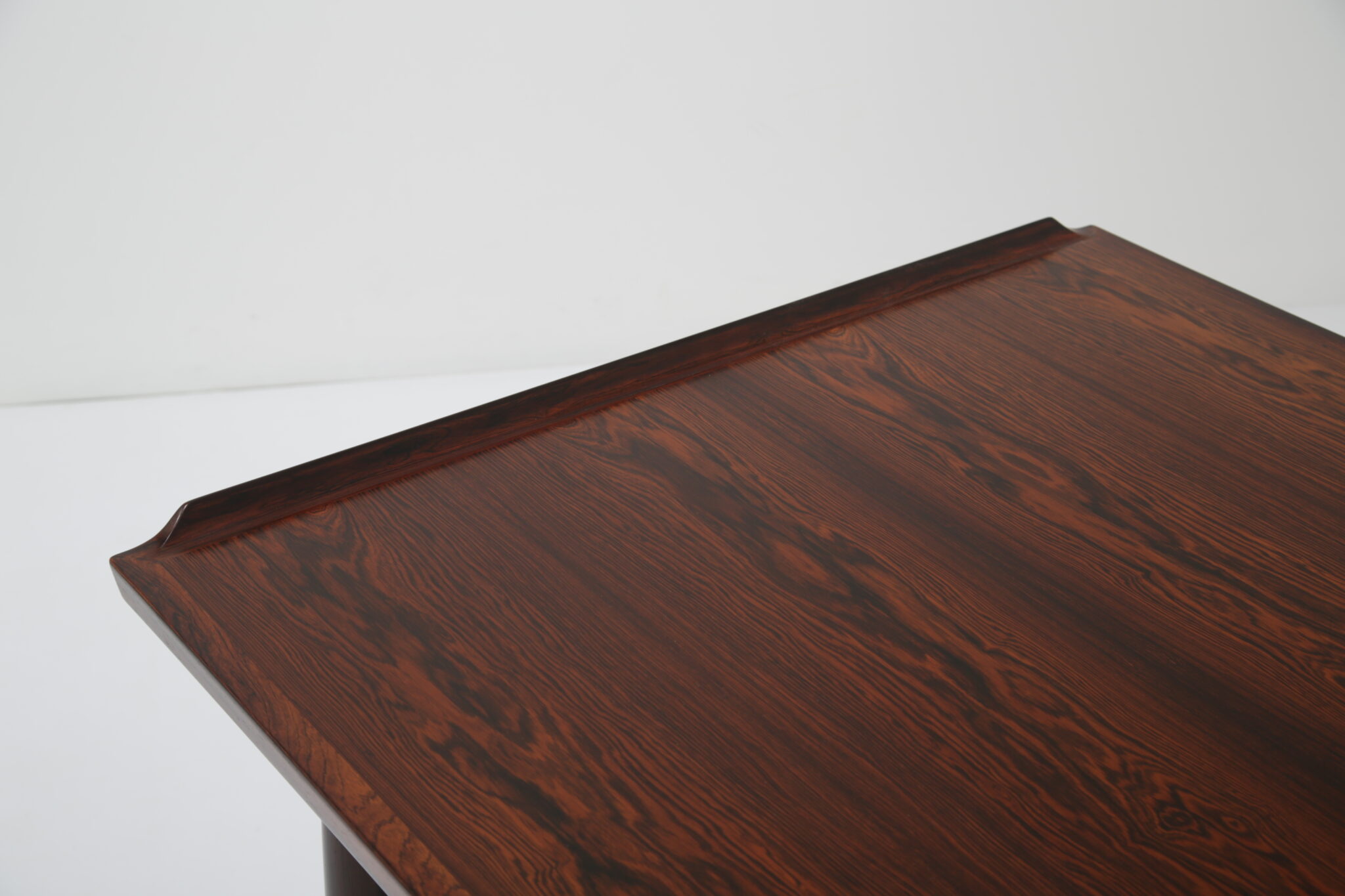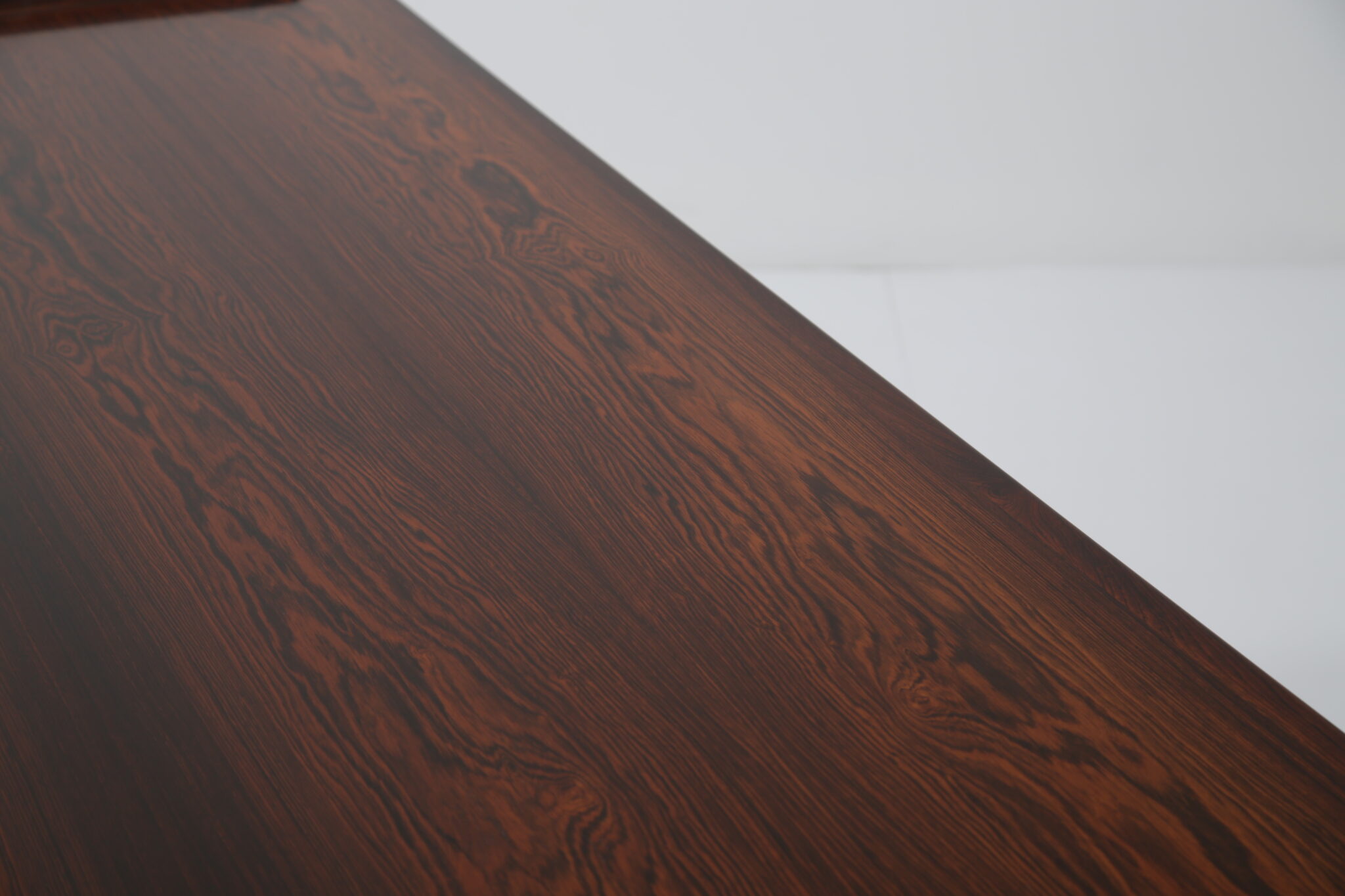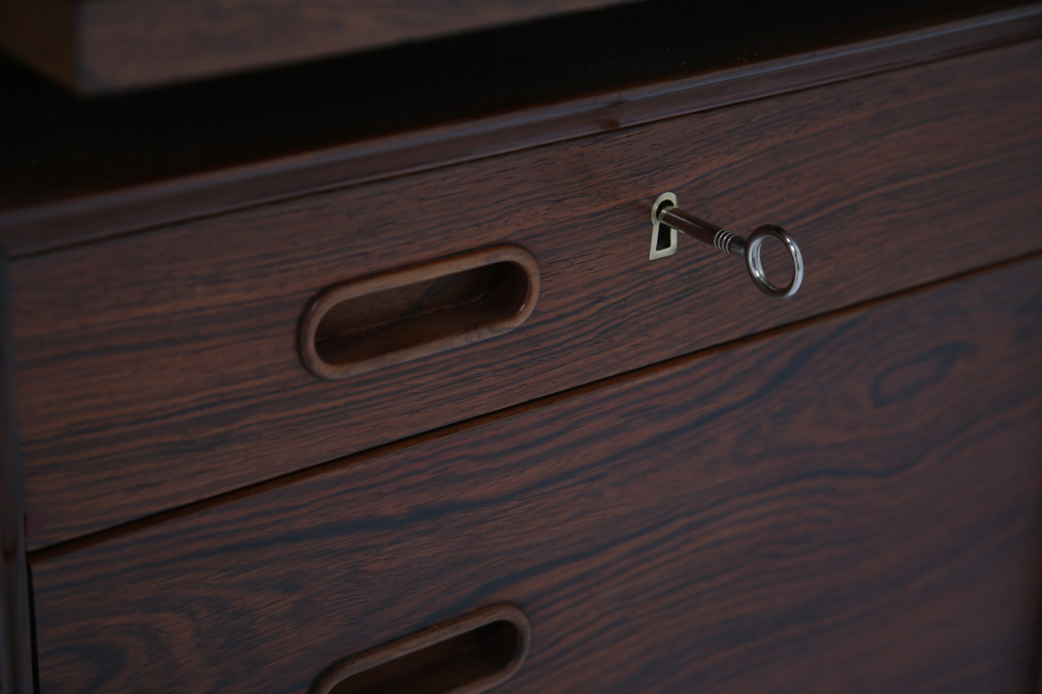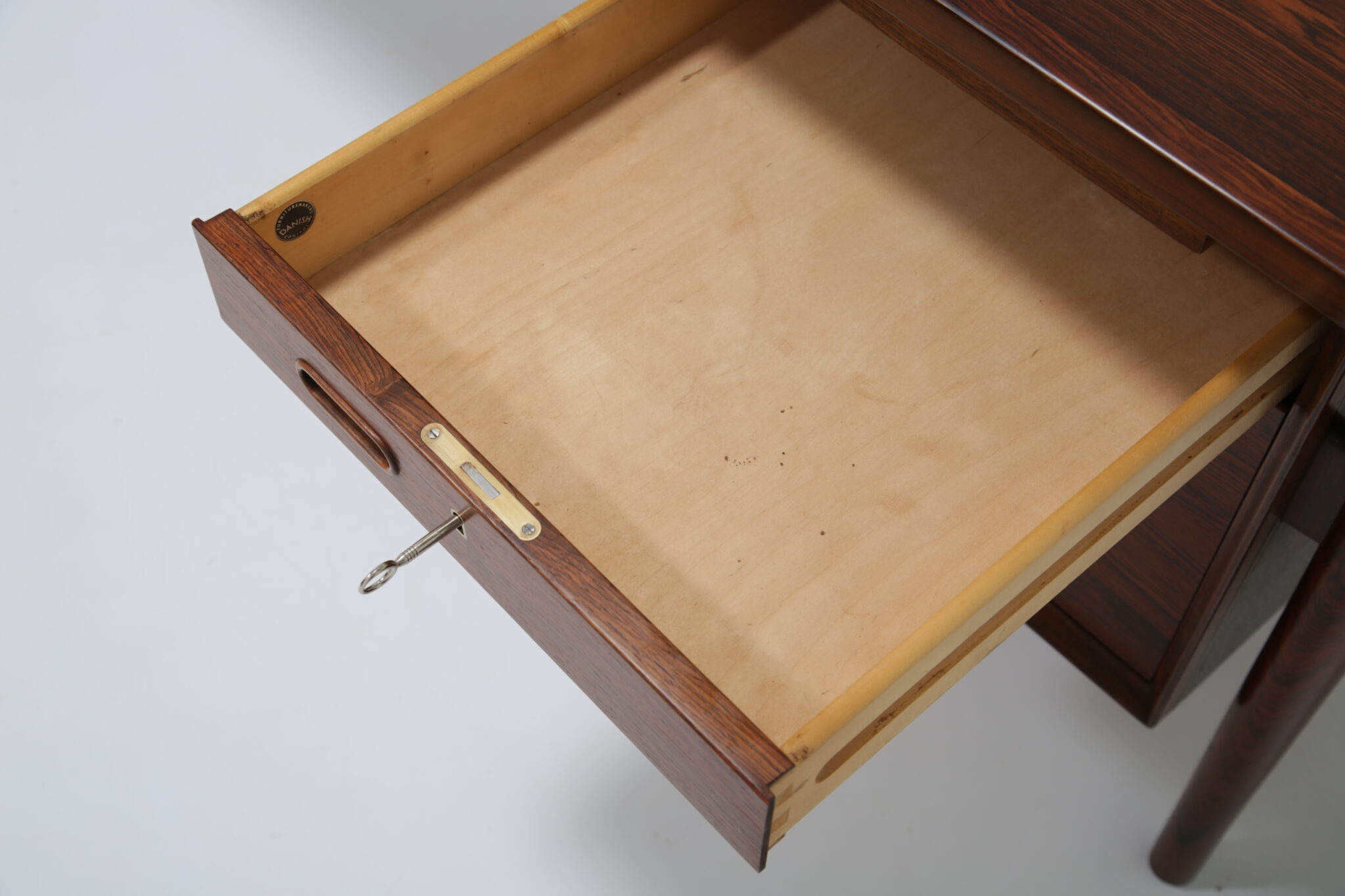Make a statement in your office with this stunning executive rosewood desk designed by the renowned Danish designer Arne Vodder and manufactured by Sibast Møbler in the 1960s. This desk is truly an extraordinary piece with a deep pronounced rosewood grain, curved raised edges, rounded legs and a screen cover underneath in rattan that can be removed if necessary. The desk features small pull out drawer for holding your pens and other smaller items such as erasers, staples and etcetera. The floating box holds two drawers, one small and one large that will hold files, documents and other essential and important items.