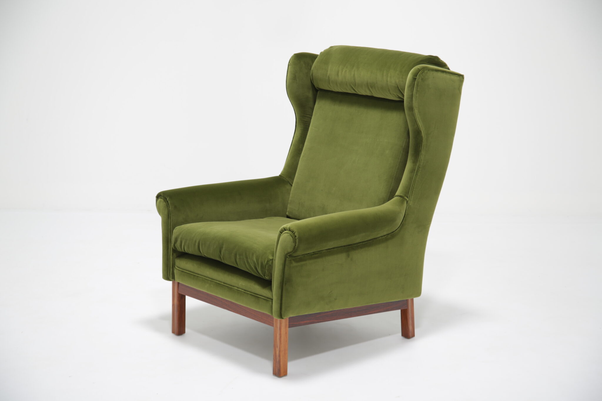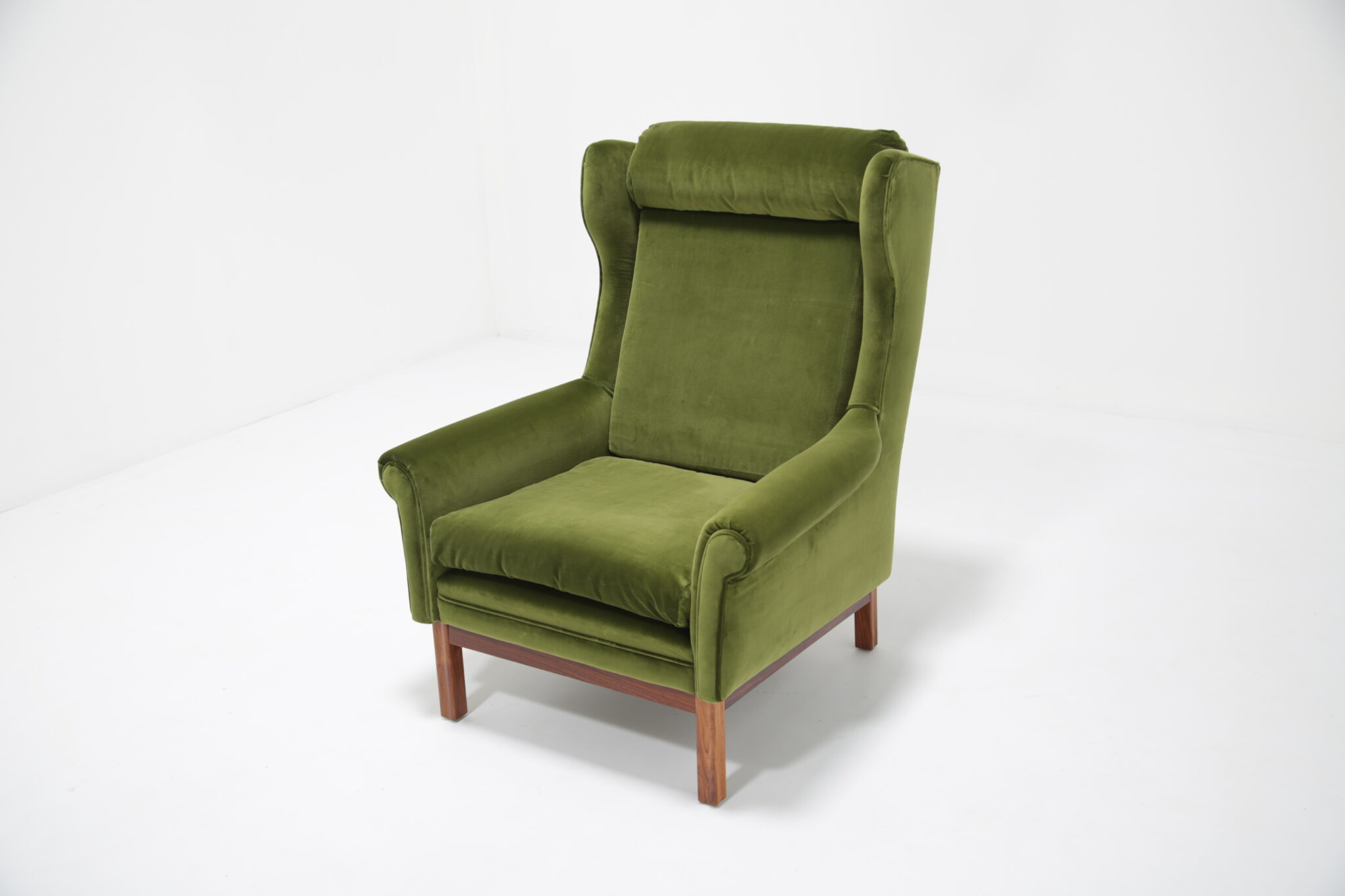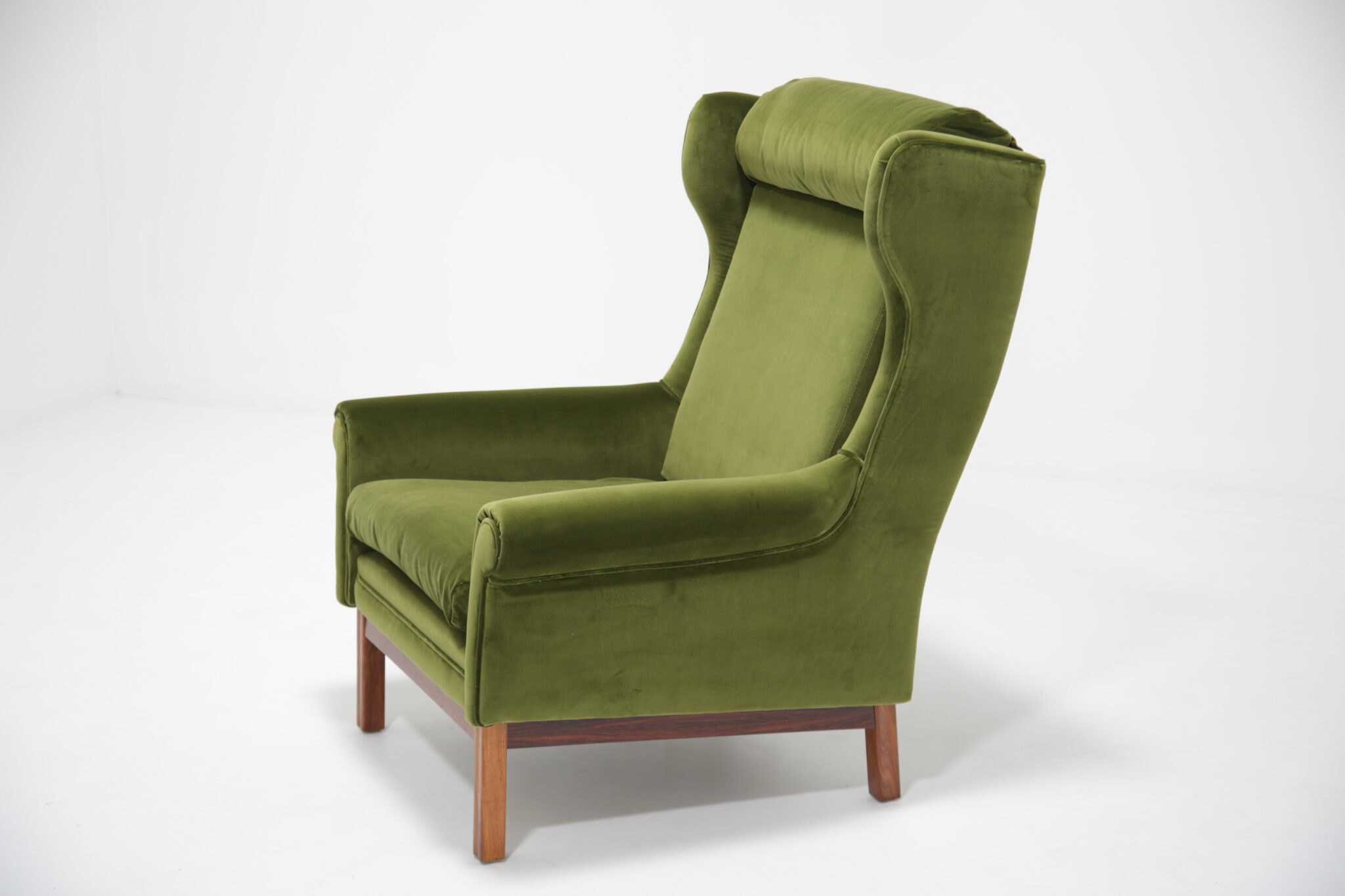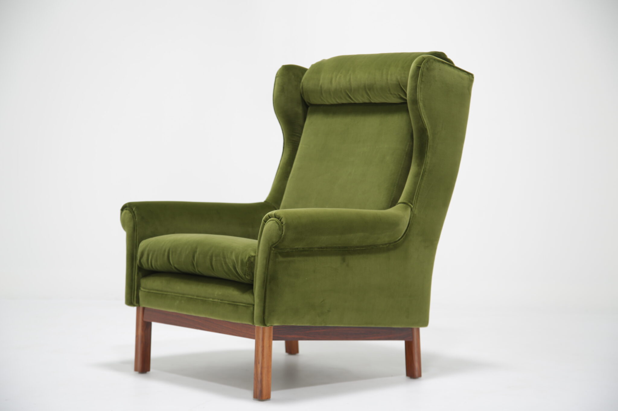 Get comfortable and relax in this stunning wingback armchair upholstered in a lush high-quality modern green cotton velvet. This chair features a head cushion and provides excellent support for the back, providing you with comfort. The profile is sleek with a modern look and comes with a built in head-cushion making it perfect to relax in-front of the TV in your living room or as your new favorite reading chair. The frame is a mix between stained wood and rosewood and was manufactured in Denmark in the 1960s.