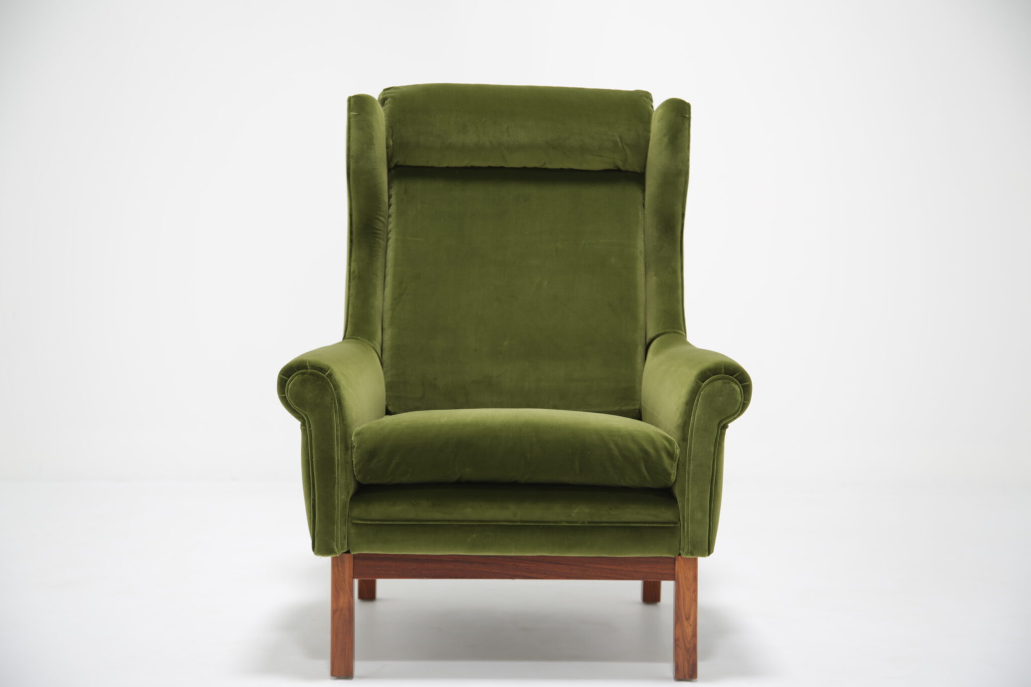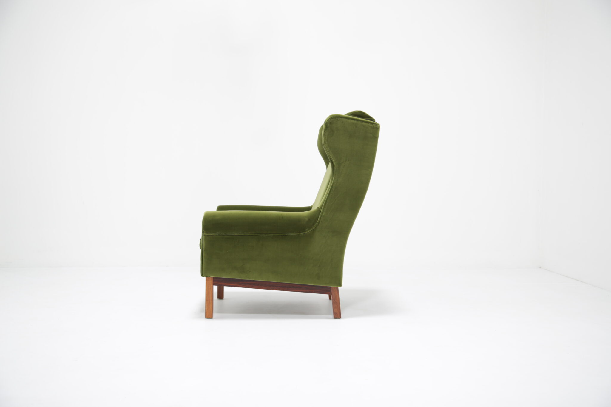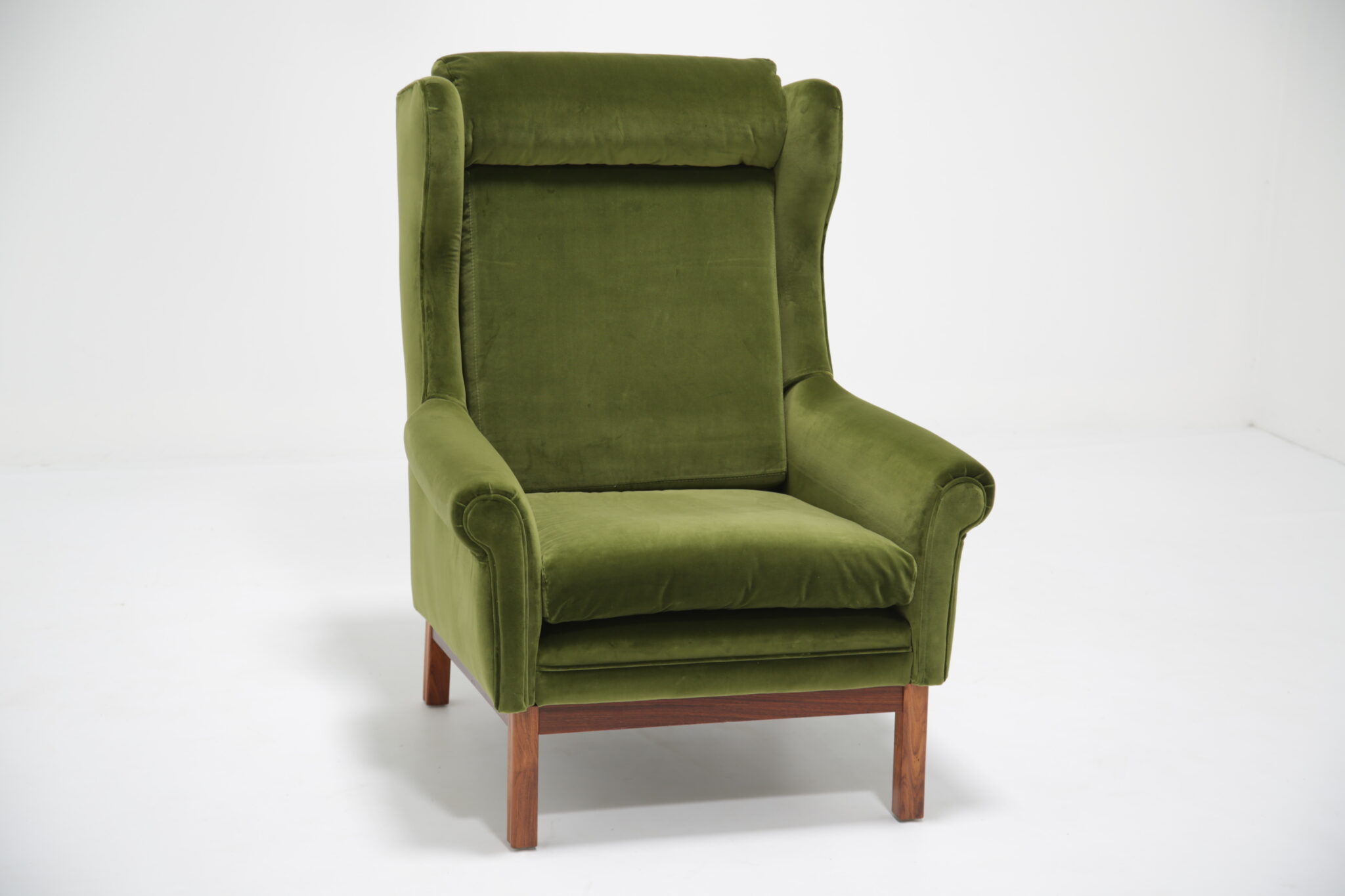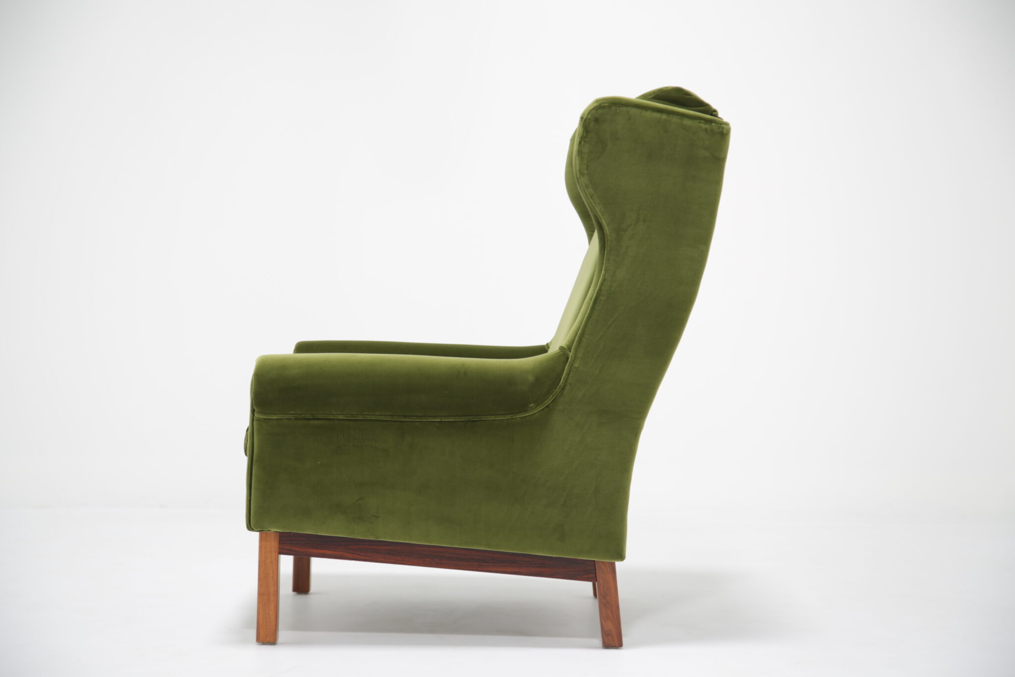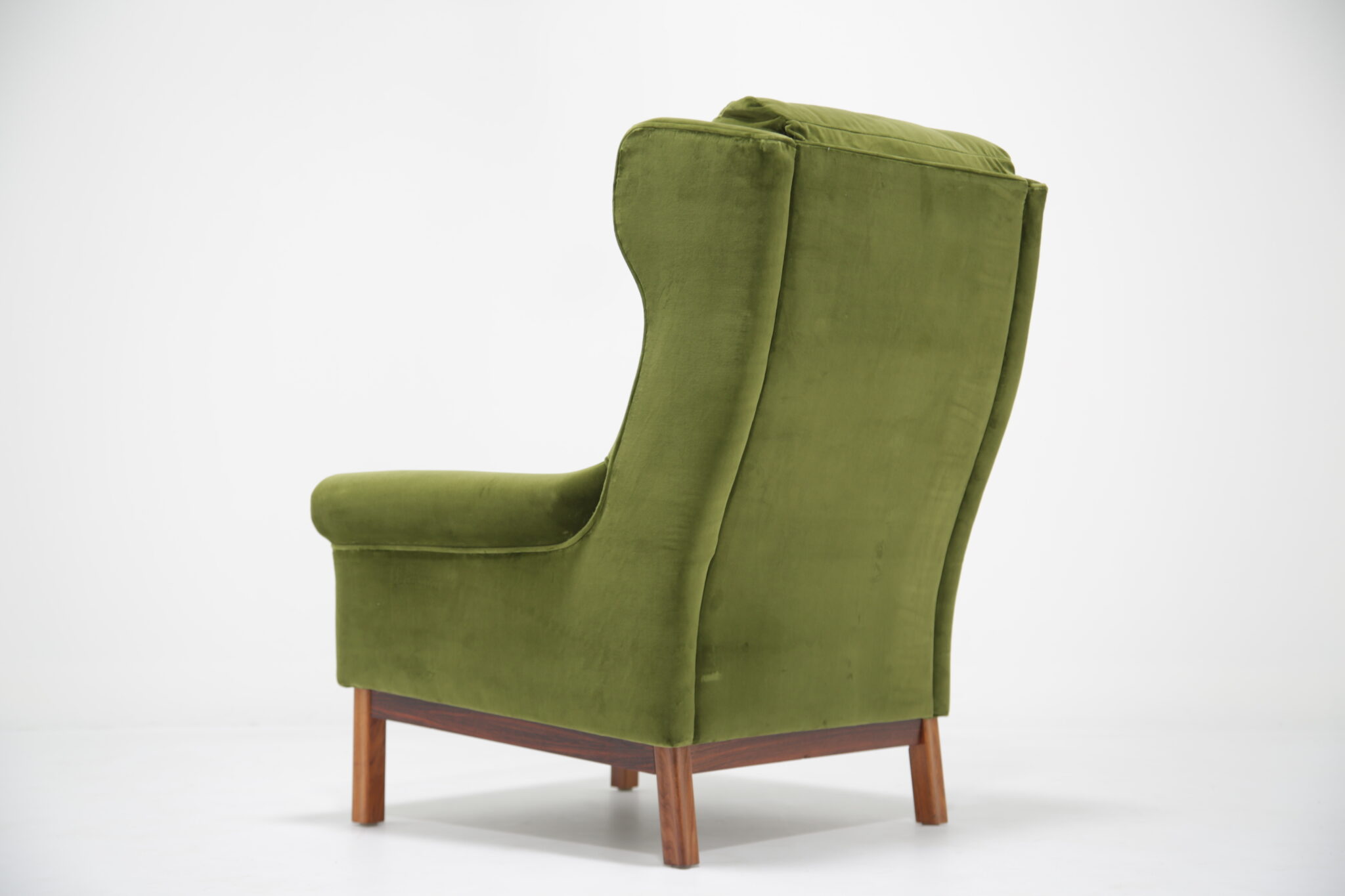 Get comfortable and relax in this stunning wingback armchair upholstered in a lush high-quality modern green cotton velvet. This chair features a head cushion and provides excellent support for the back, providing you with comfort. The profile is sleek with a modern look and comes with a built in head-cushion making it perfect to relax in-front of the TV in your living room or as your new favorite reading chair. The frame is a mix between stained wood and rosewood and was manufactured in Denmark in the 1960s.