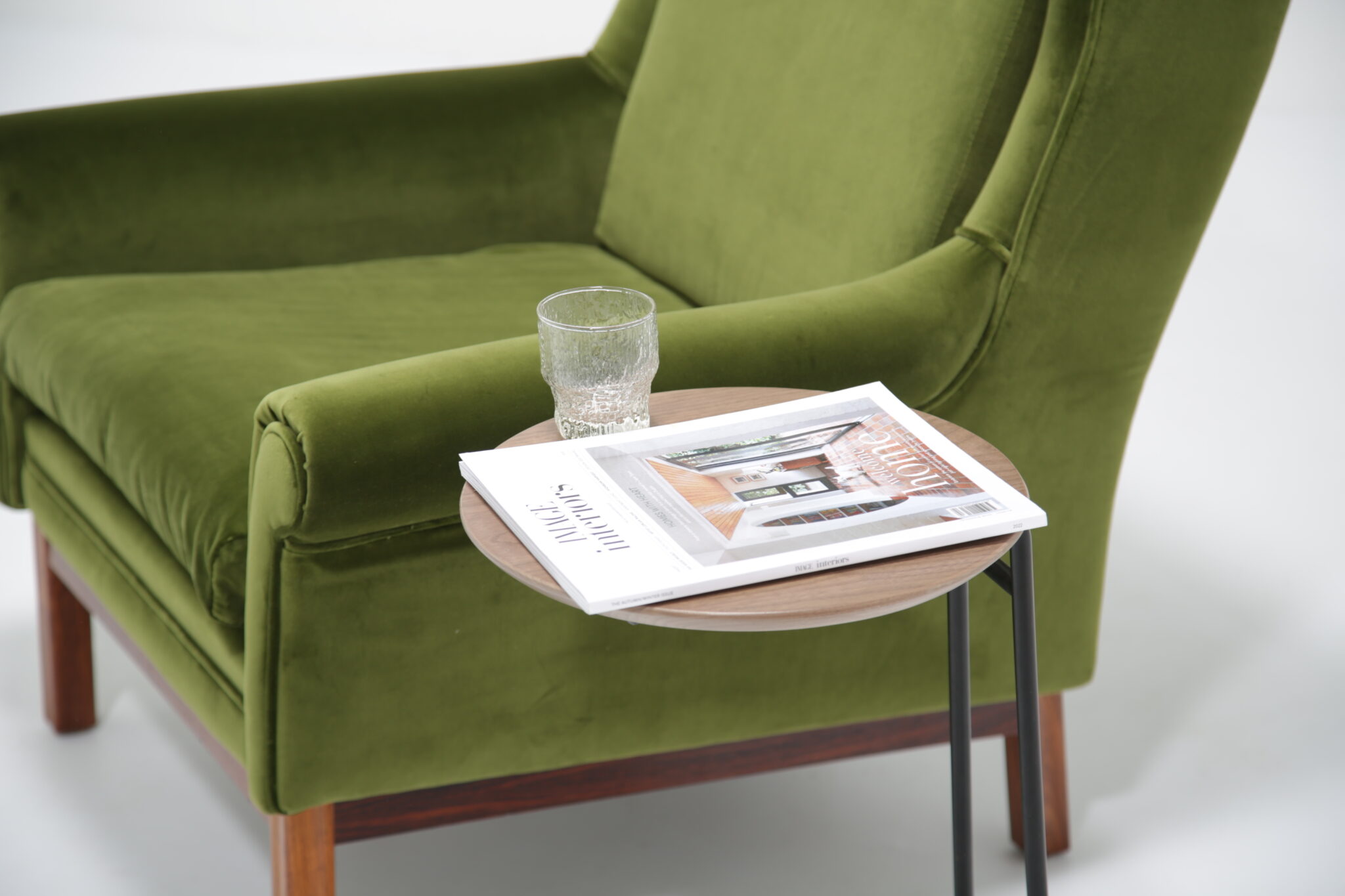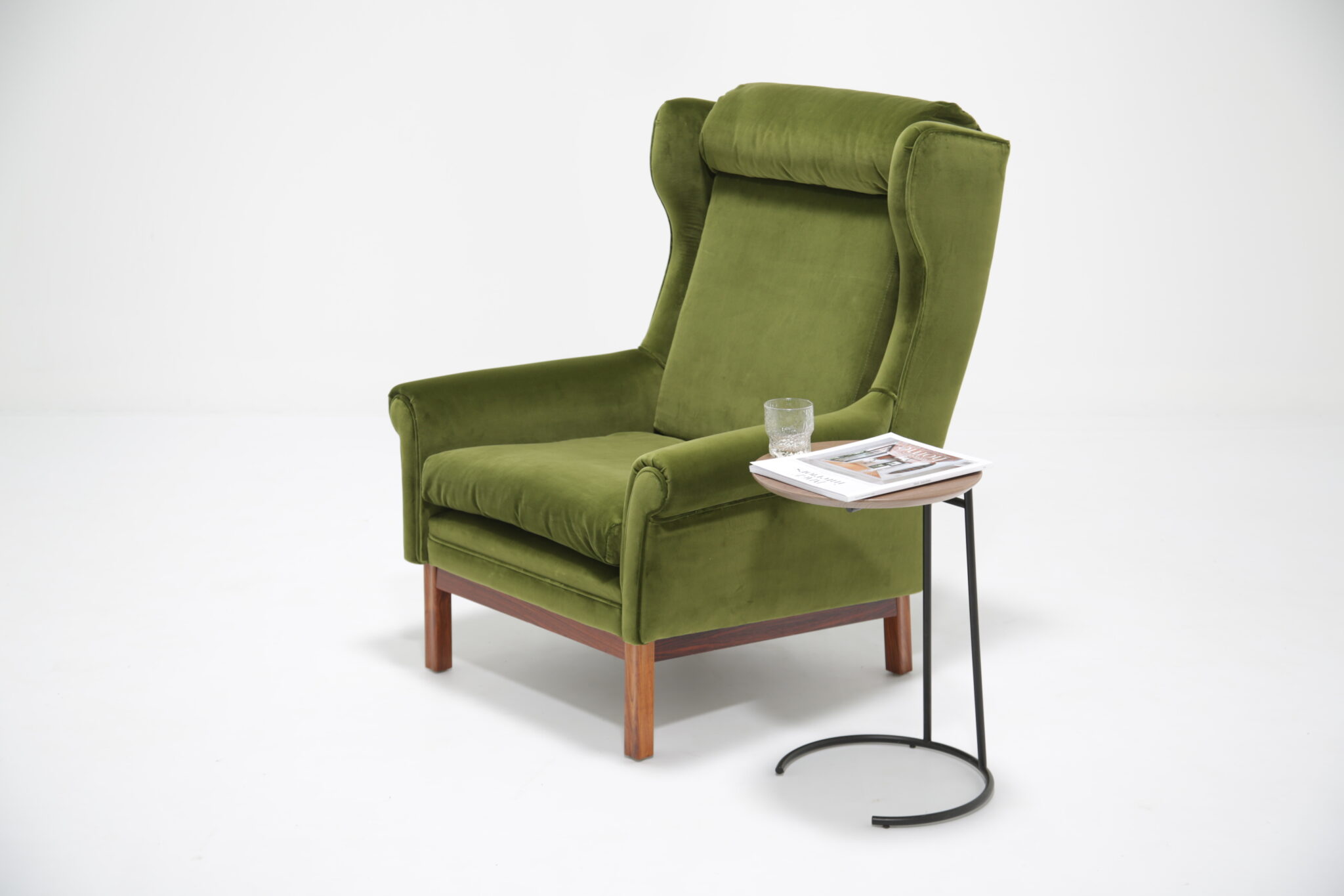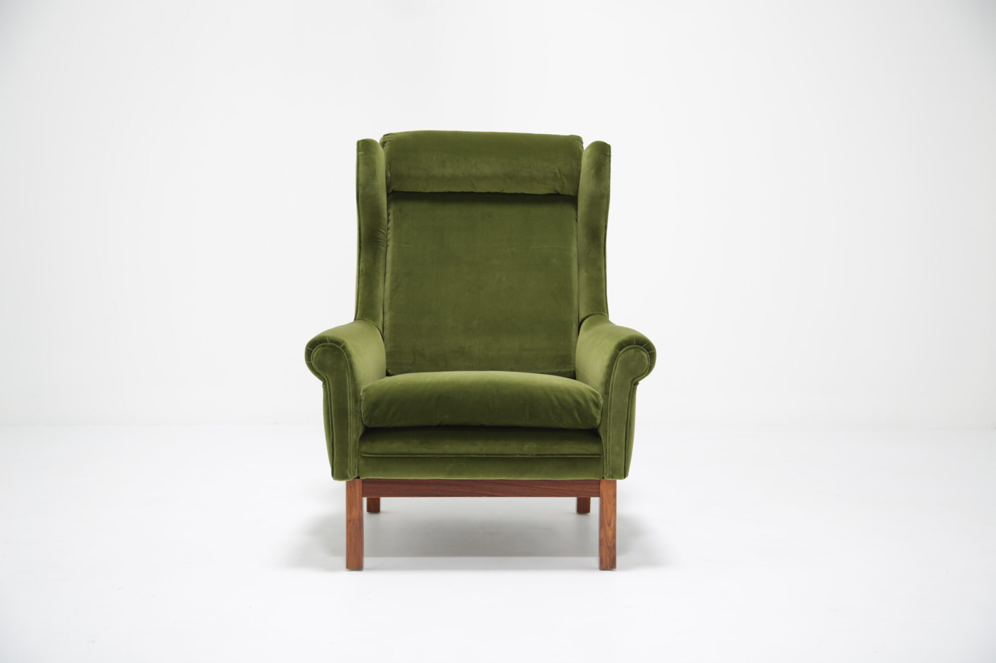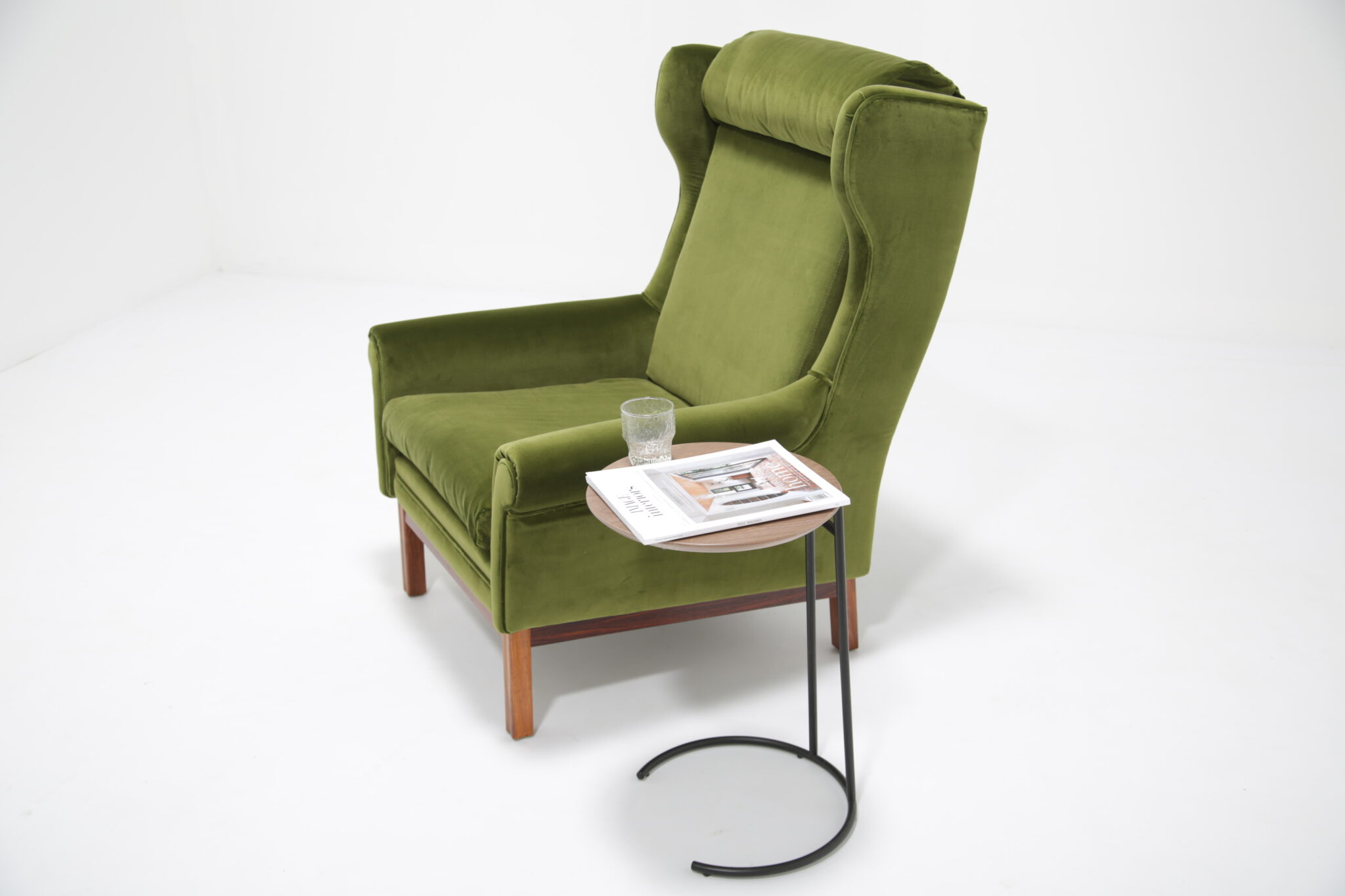 Get comfortable and relax in this stunning wingback armchair upholstered in a lush high-quality modern green cotton velvet. This chair features a head cushion and provides excellent support for the back, providing you with comfort. The profile is sleek with a modern look and comes with a built in head-cushion making it perfect to relax in-front of the TV in your living room or as your new favorite reading chair. The frame is a mix between stained wood and rosewood and was manufactured in Denmark in the 1960s.