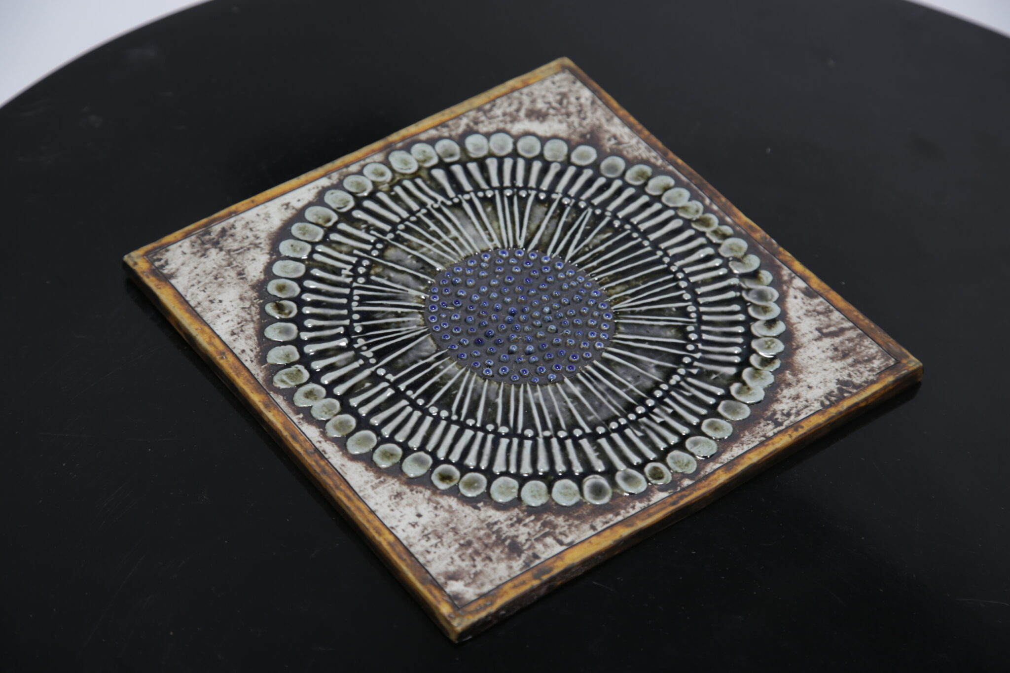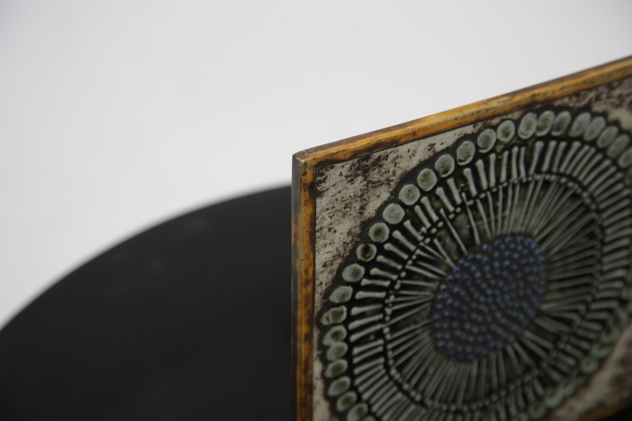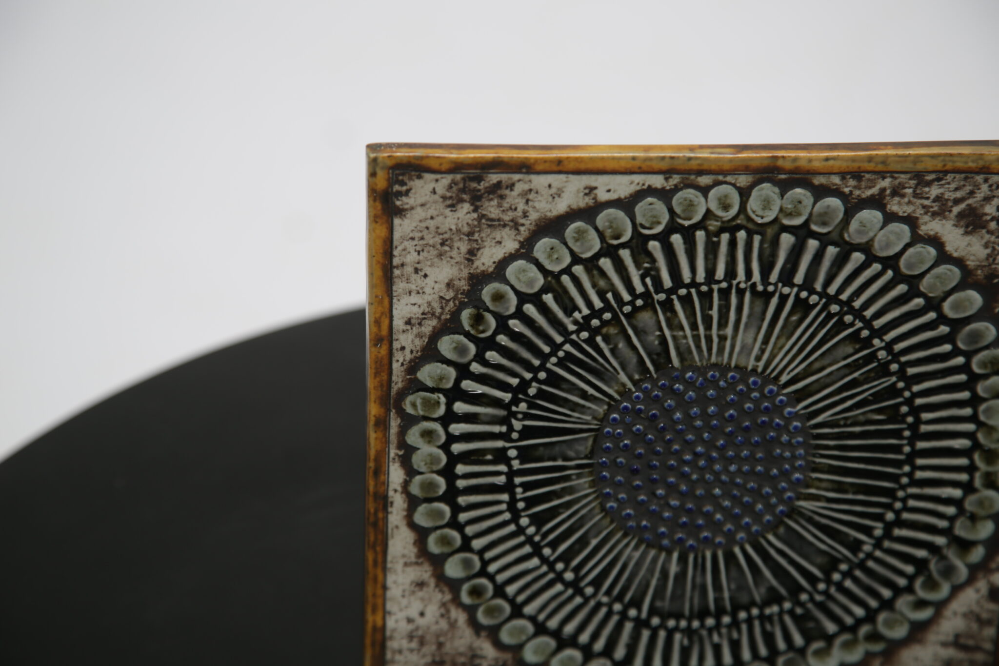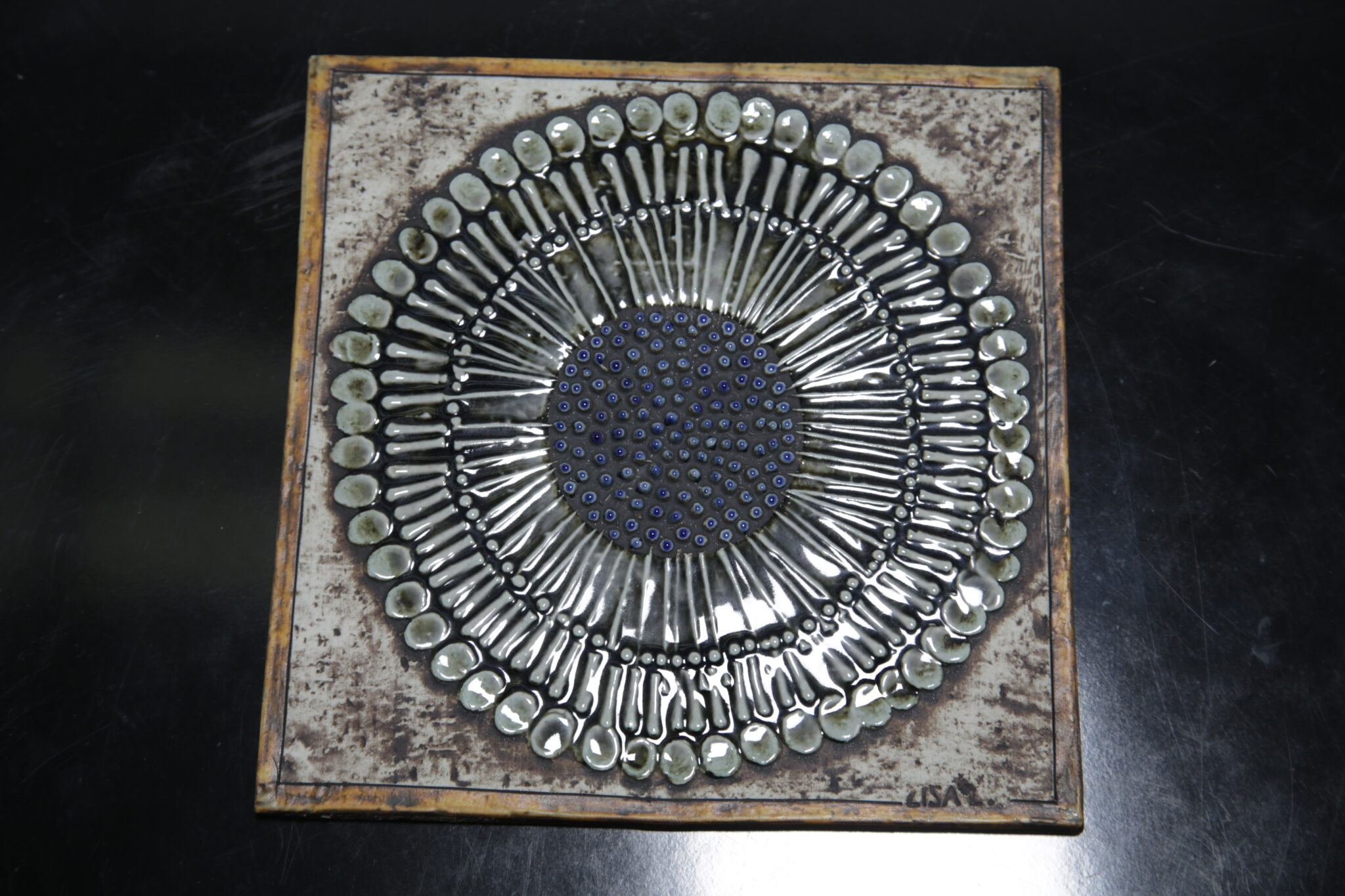 Loved and adored by collectors and admirers world-wide, renowned for her works of ceramic ornaments, sculptures and figurines, Lisa Larson is best known for her work with the famous Swedish ceramics company Gustavsberg. Her work is widely admired for its playful, whimsical style, often incorporating animal and human figures that exude warmth and charm. This wall hanging tile is no different, featuring a relief of a sunflower.