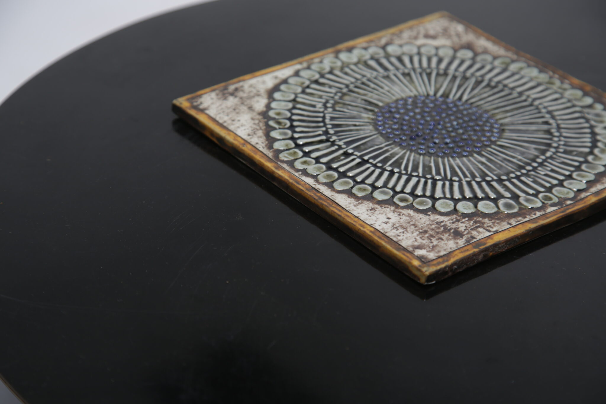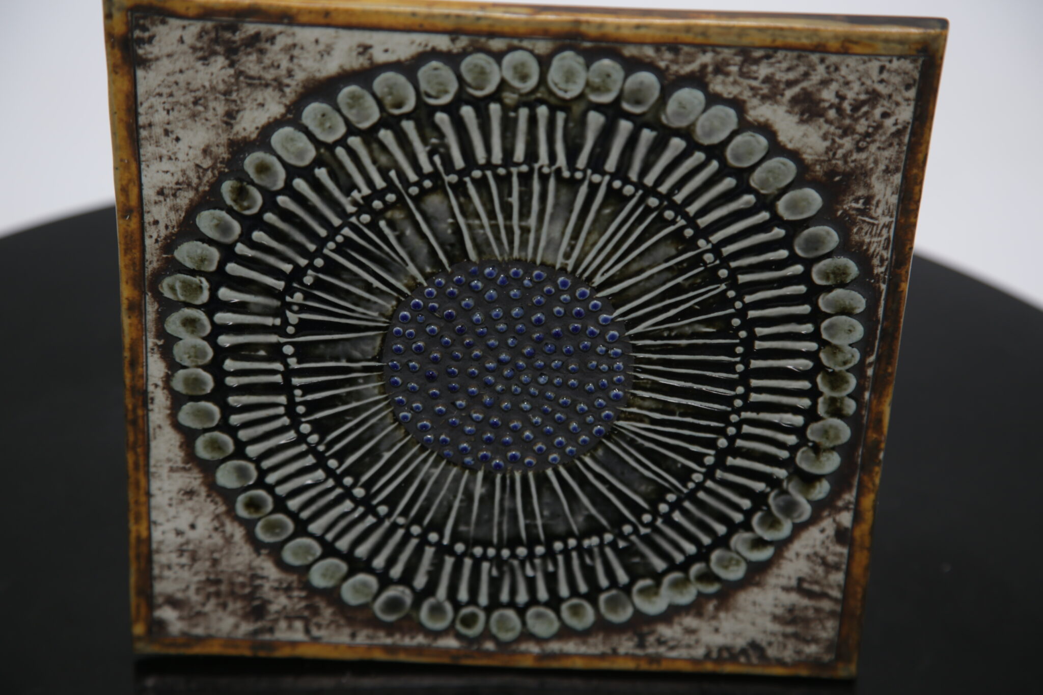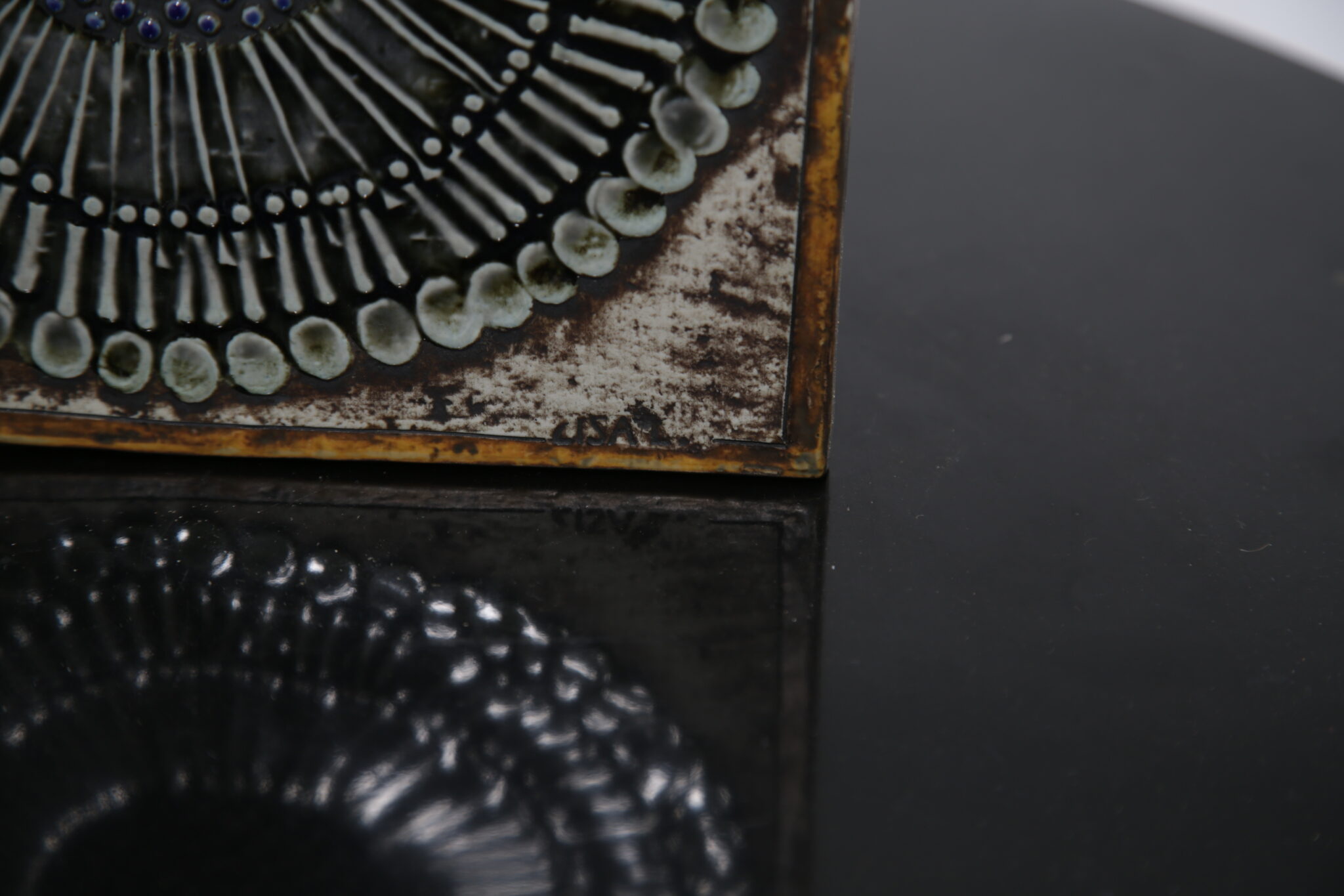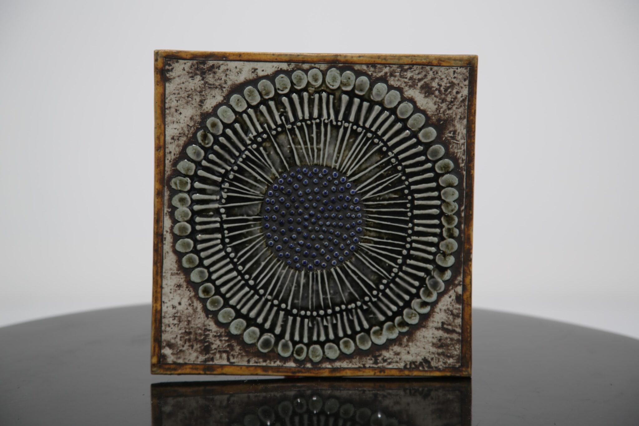 Loved and adored by collectors and admirers world-wide, renowned for her works of ceramic ornaments, sculptures and figurines, Lisa Larson is best known for her work with the famous Swedish ceramics company Gustavsberg. Her work is widely admired for its playful, whimsical style, often incorporating animal and human figures that exude warmth and charm. This wall hanging tile is no different, featuring a relief of a sunflower.