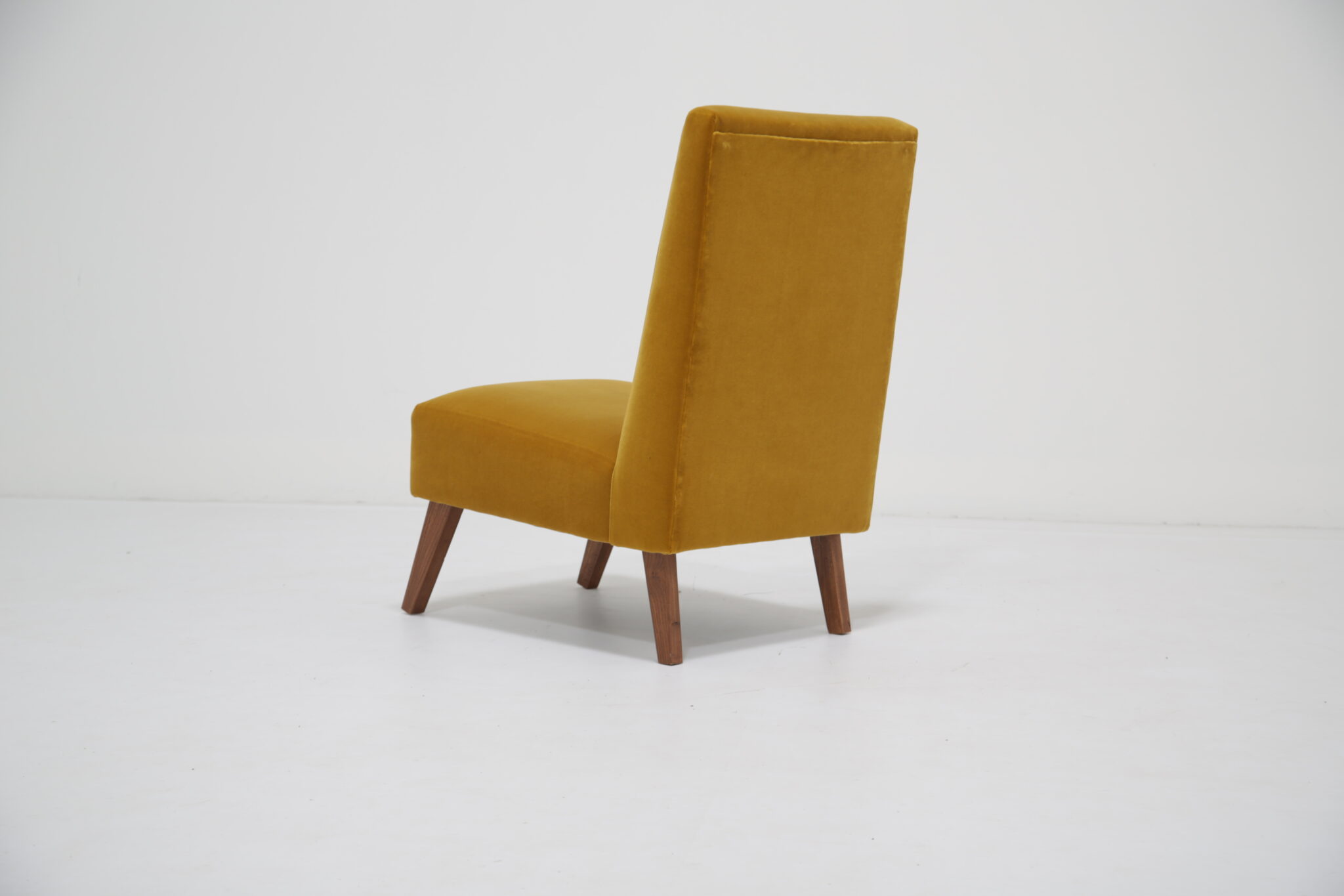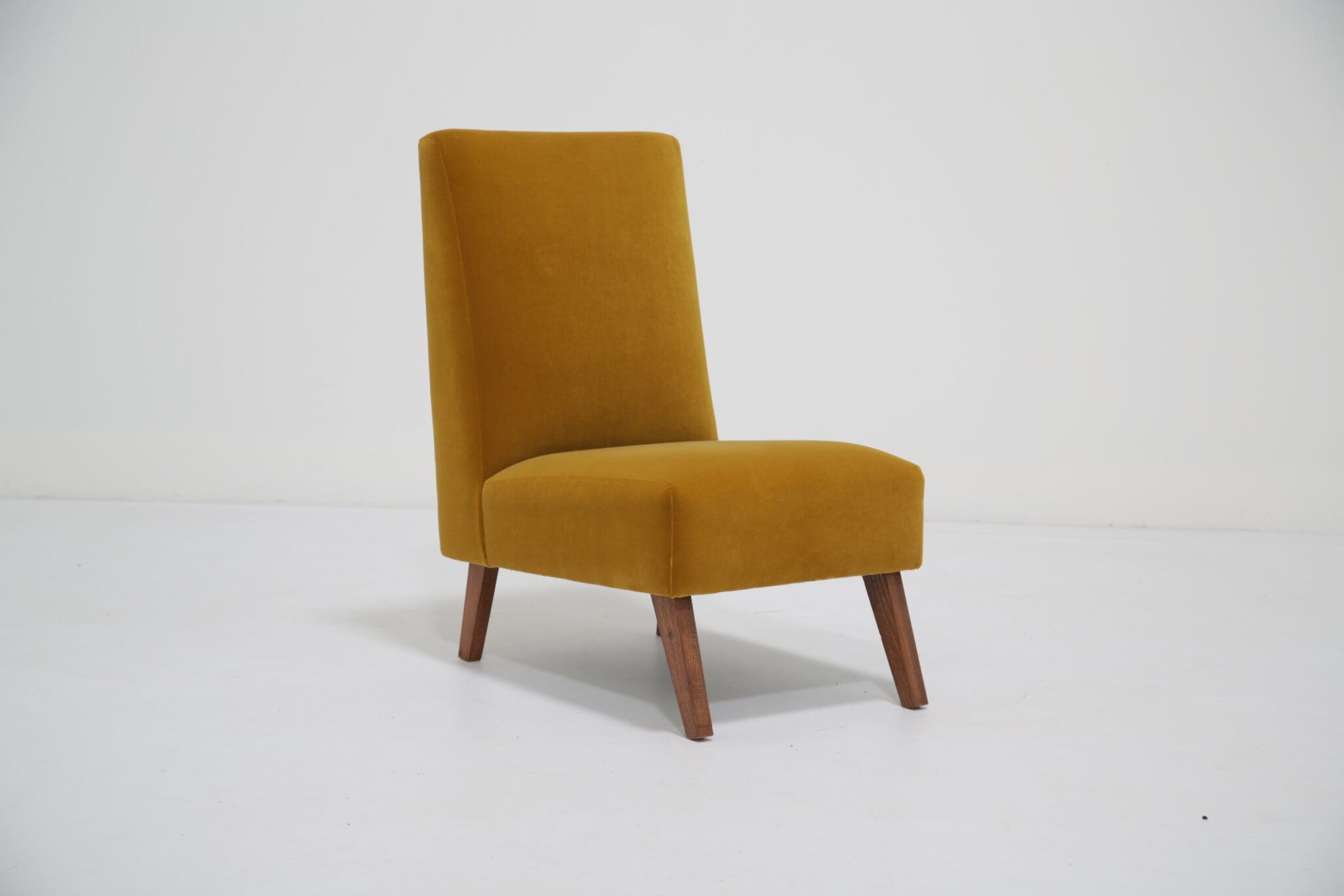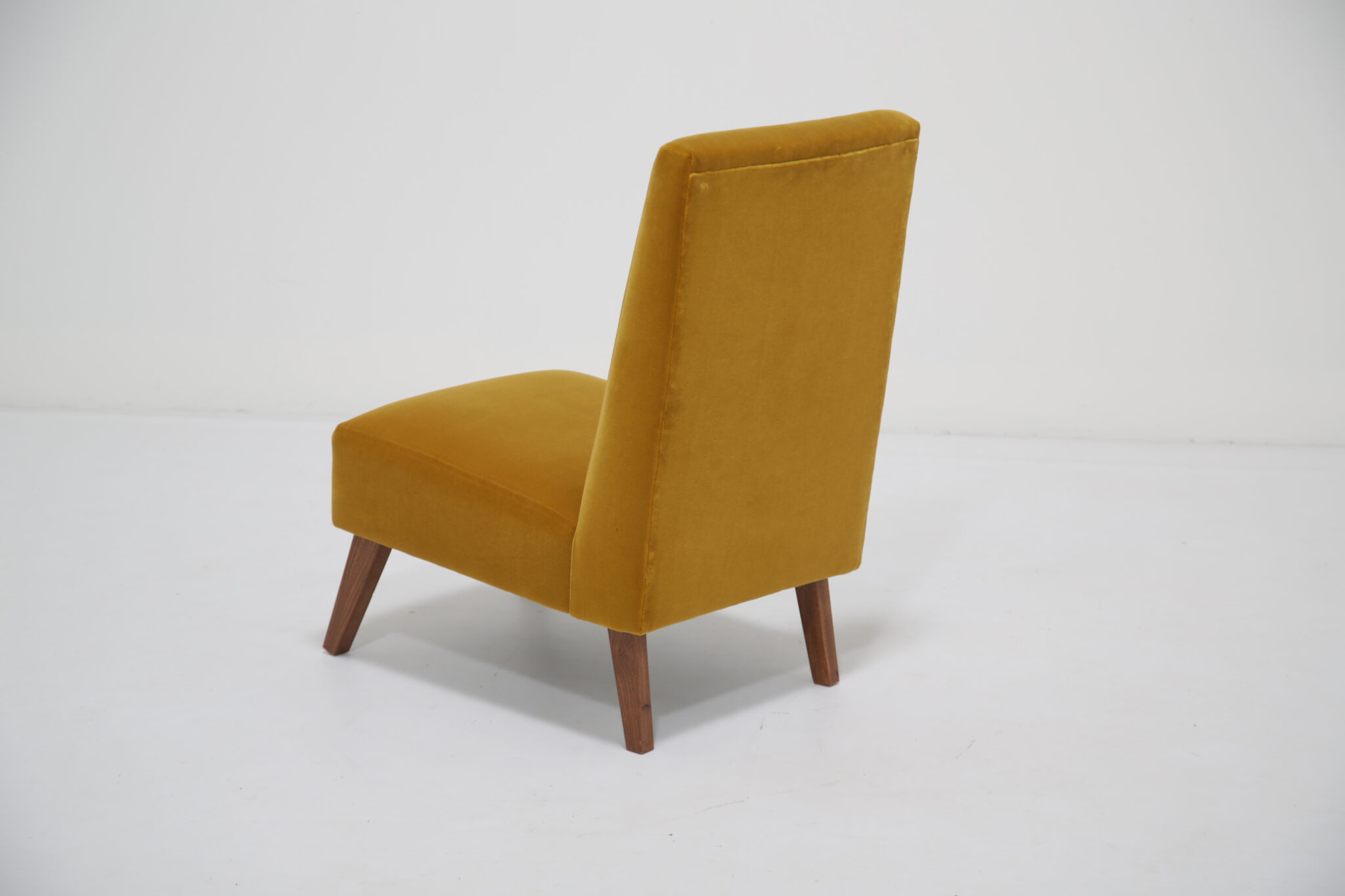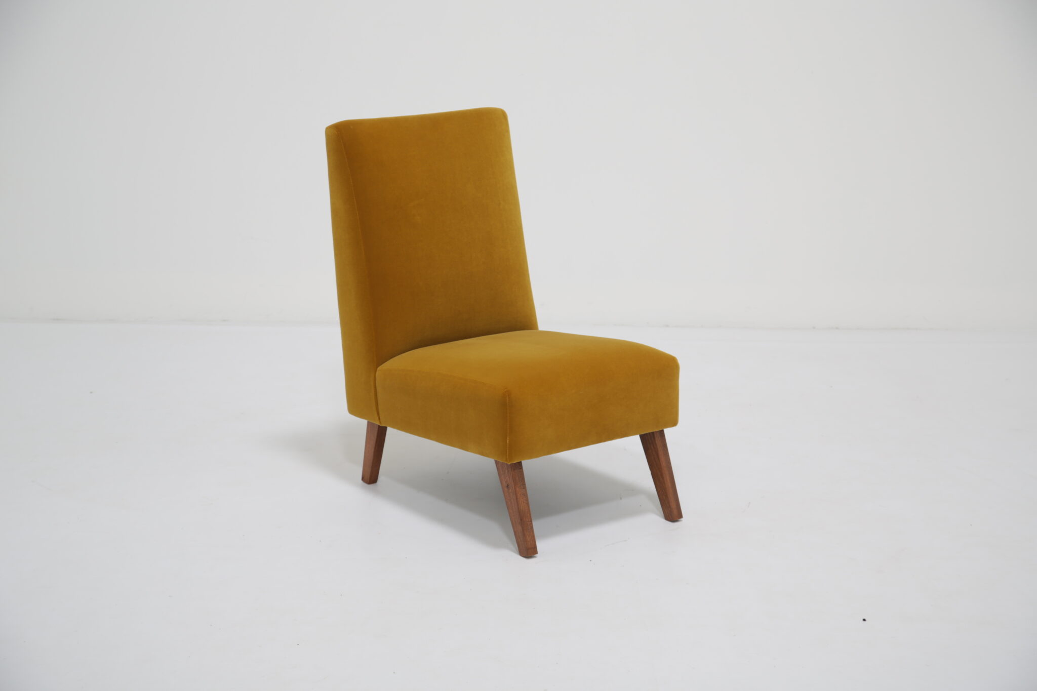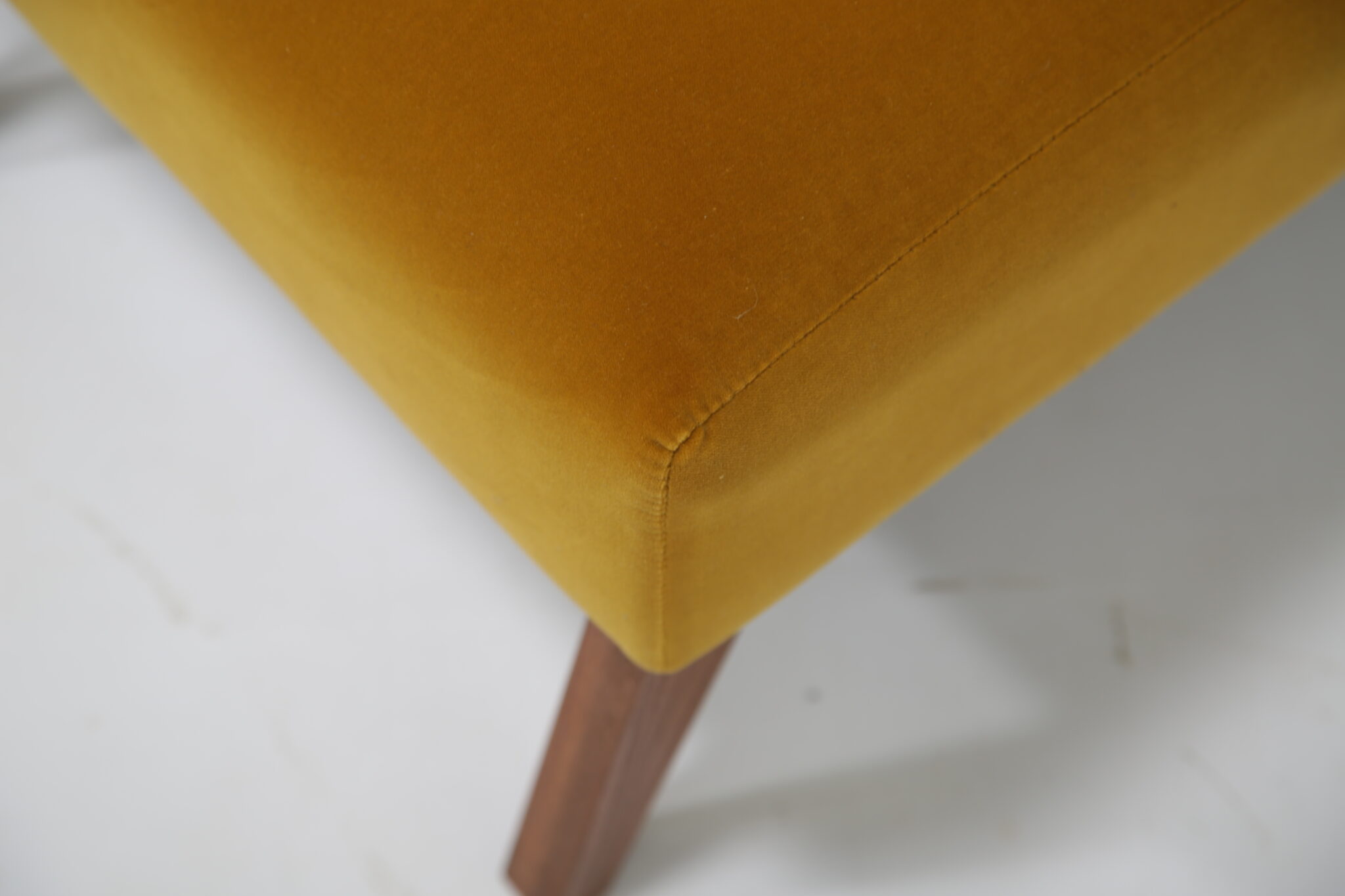 Bring comfort to your bedroom with this upholstered gold mustard velvet chair, it features lovely splayed wooden legs with a slightly angled seat and back and has been upholstered in a nice lush cotton velvet.