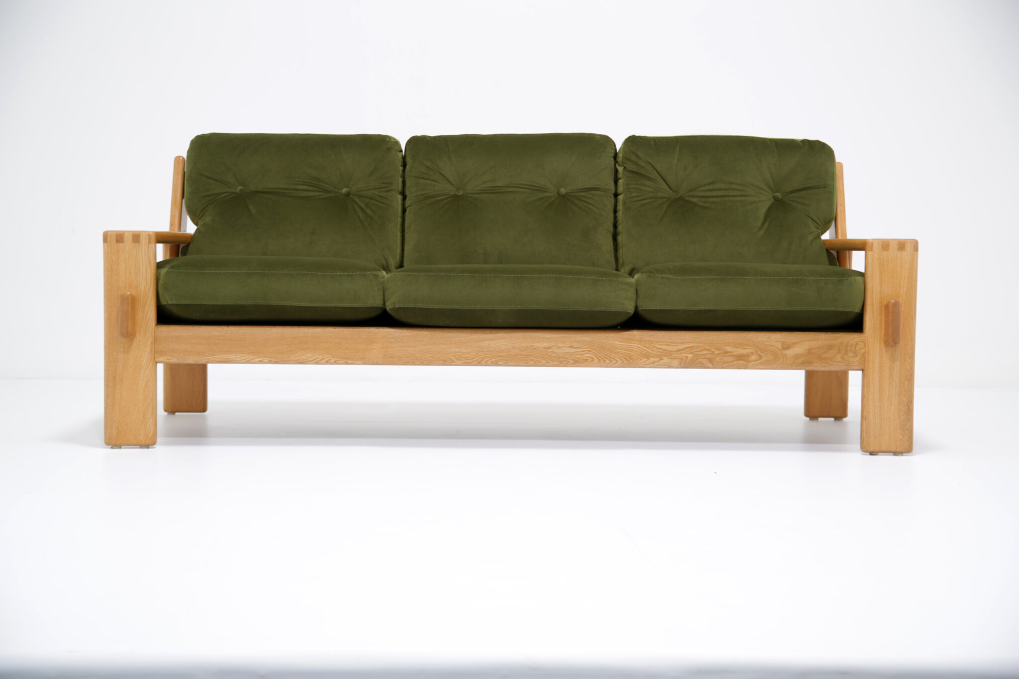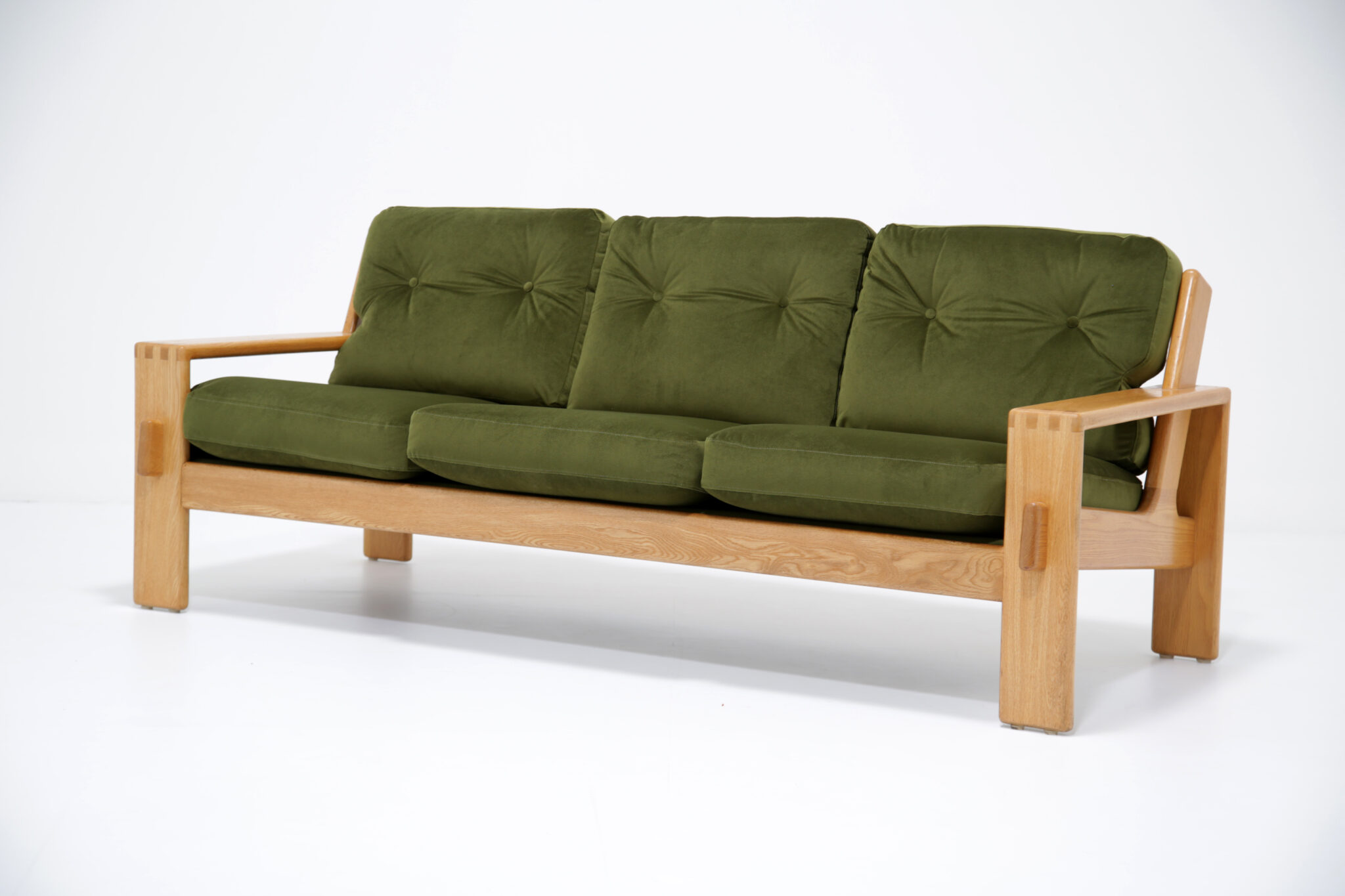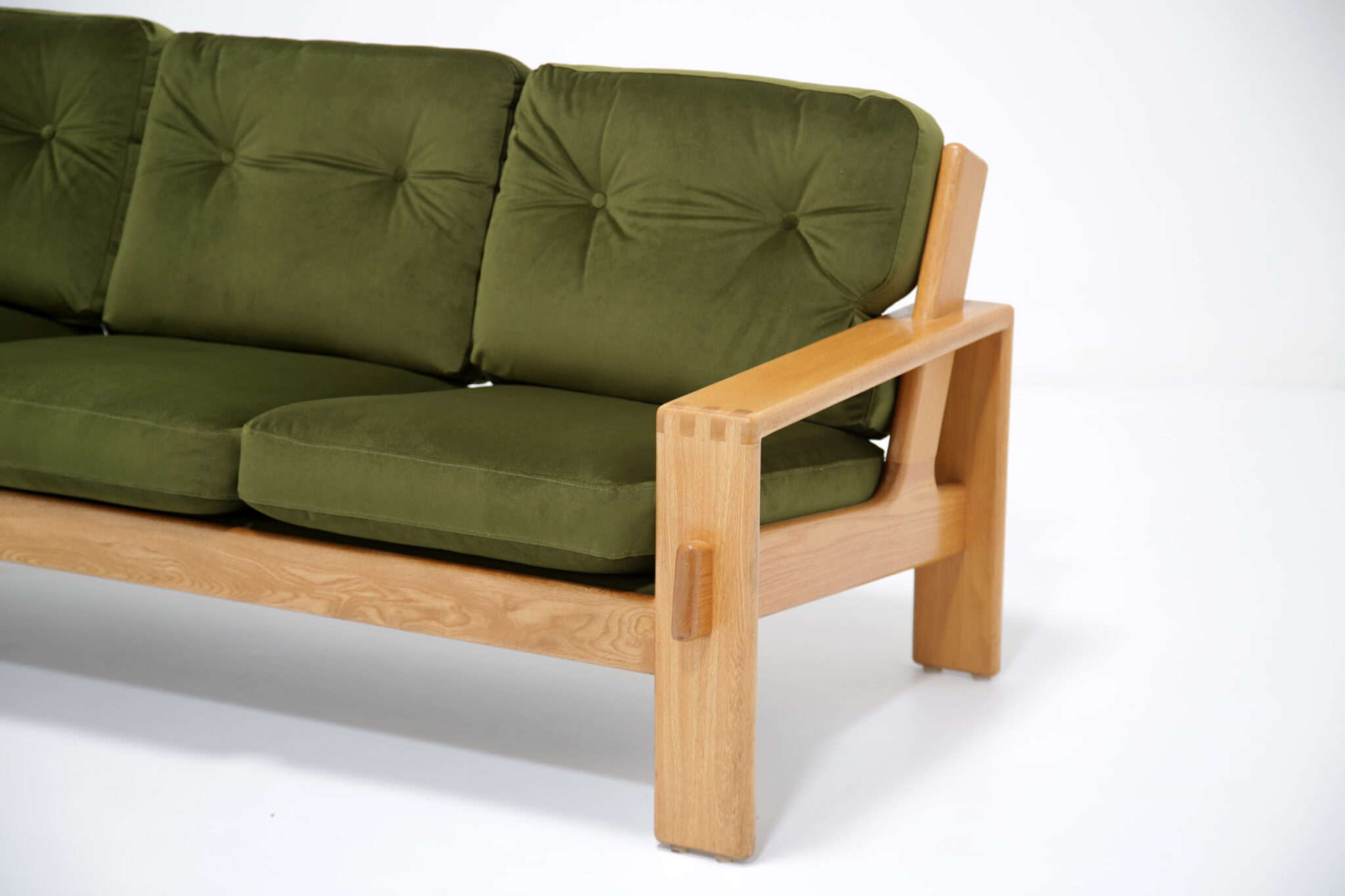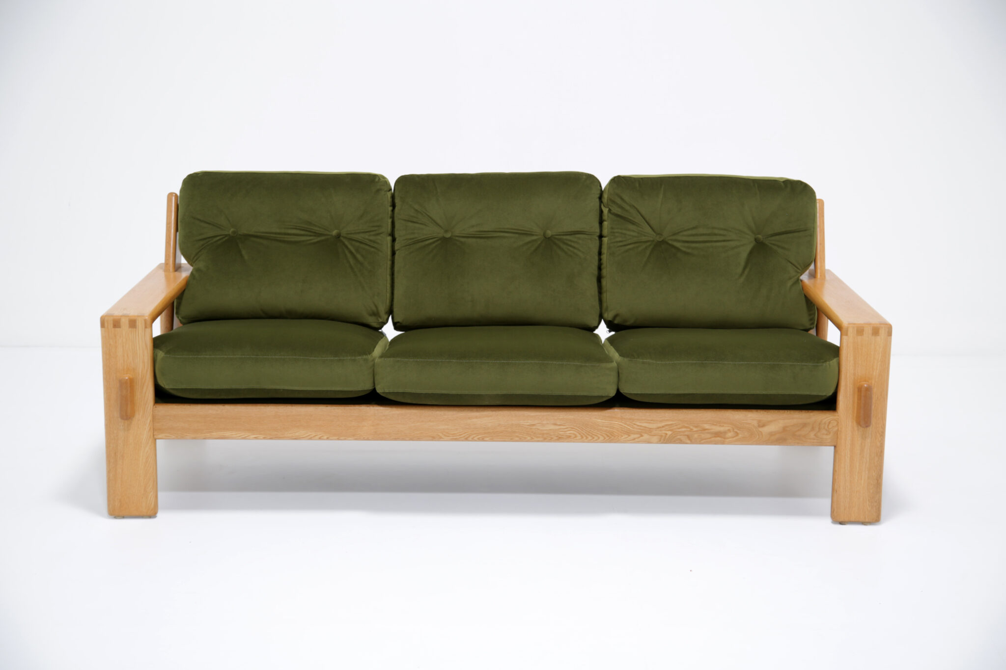 This gorgeous three seat sofa features a solid oak frame with wide plank arms, exposed joints and beautiful angled supports which protrudes on the front rectangular front legs, creating a unique but stunning minimalistic design.