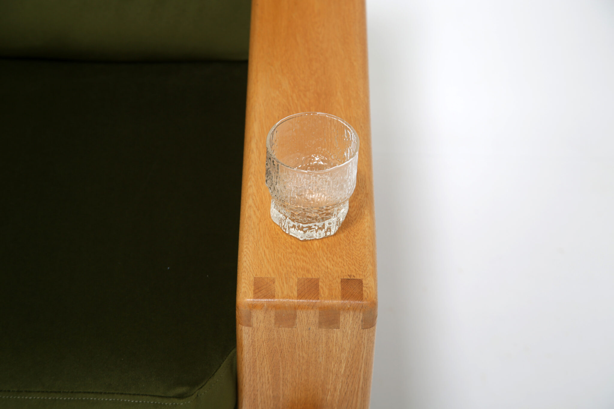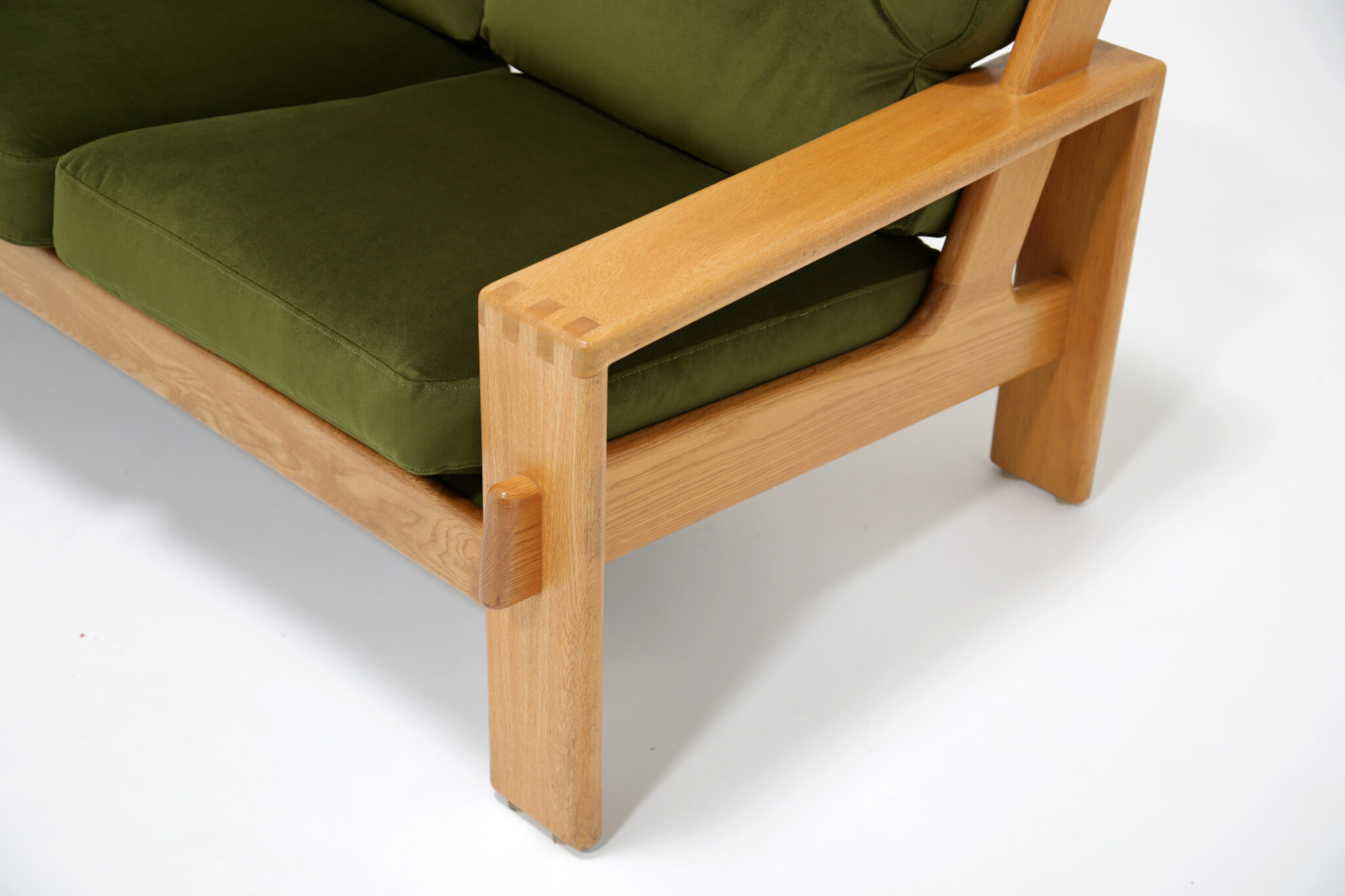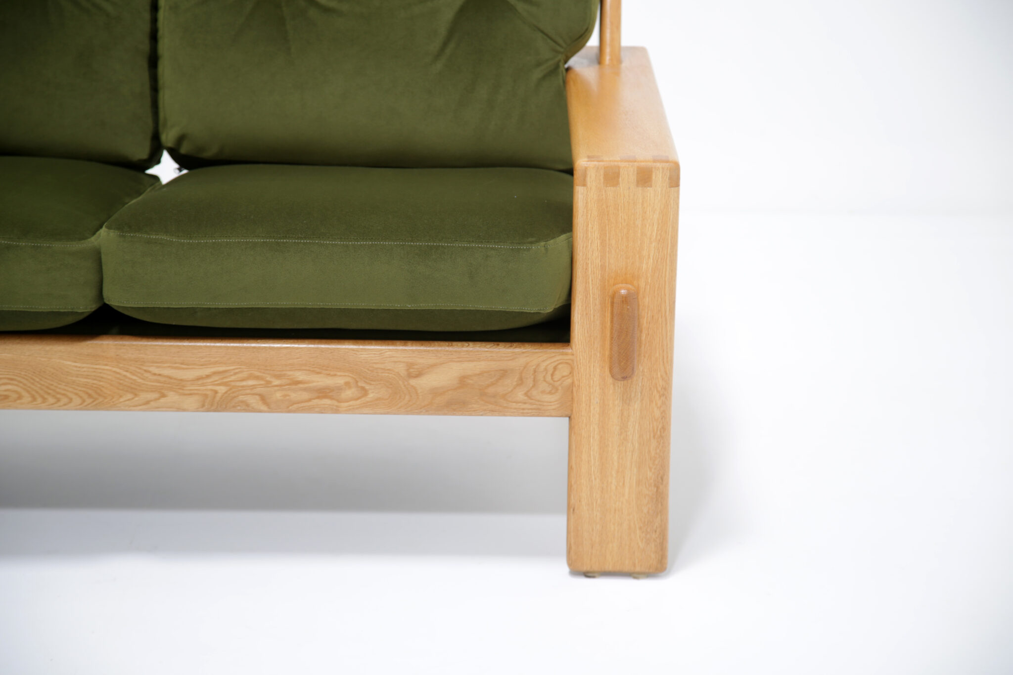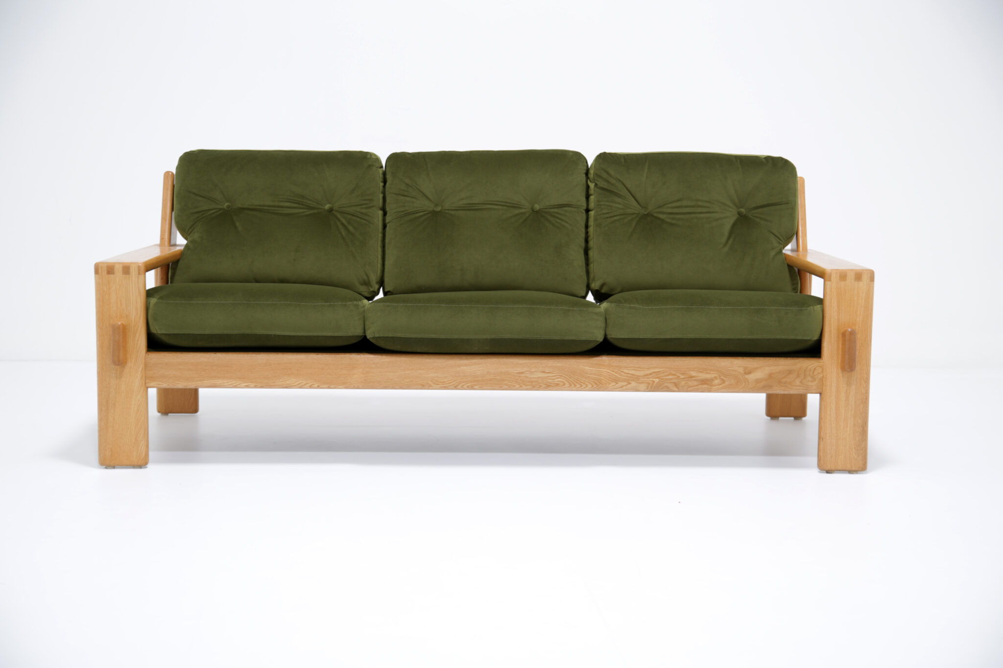 This gorgeous three seat sofa features a solid oak frame with wide plank arms, exposed joints and beautiful angled supports which protrudes on the front rectangular front legs, creating a unique but stunning minimalistic design.