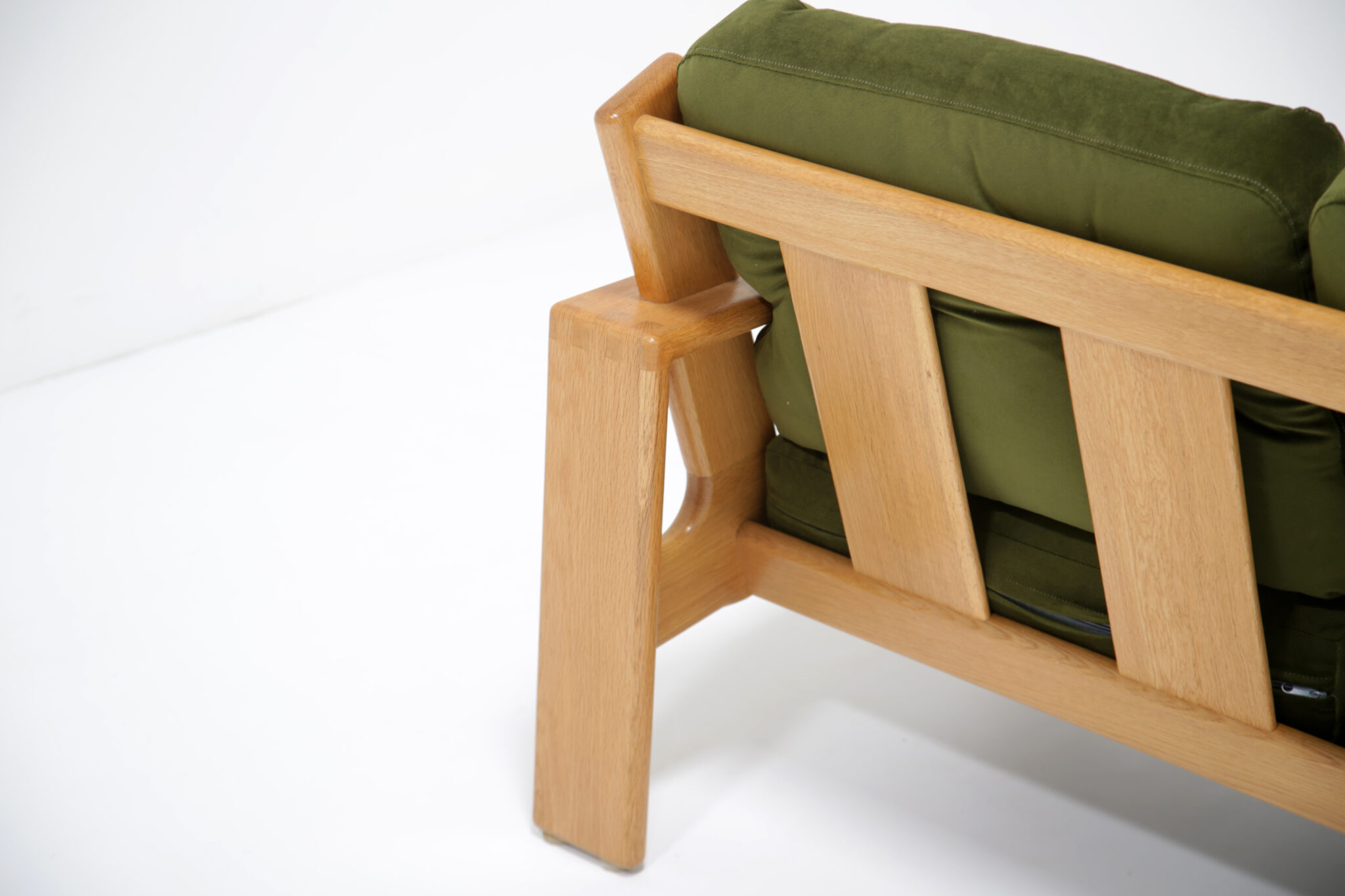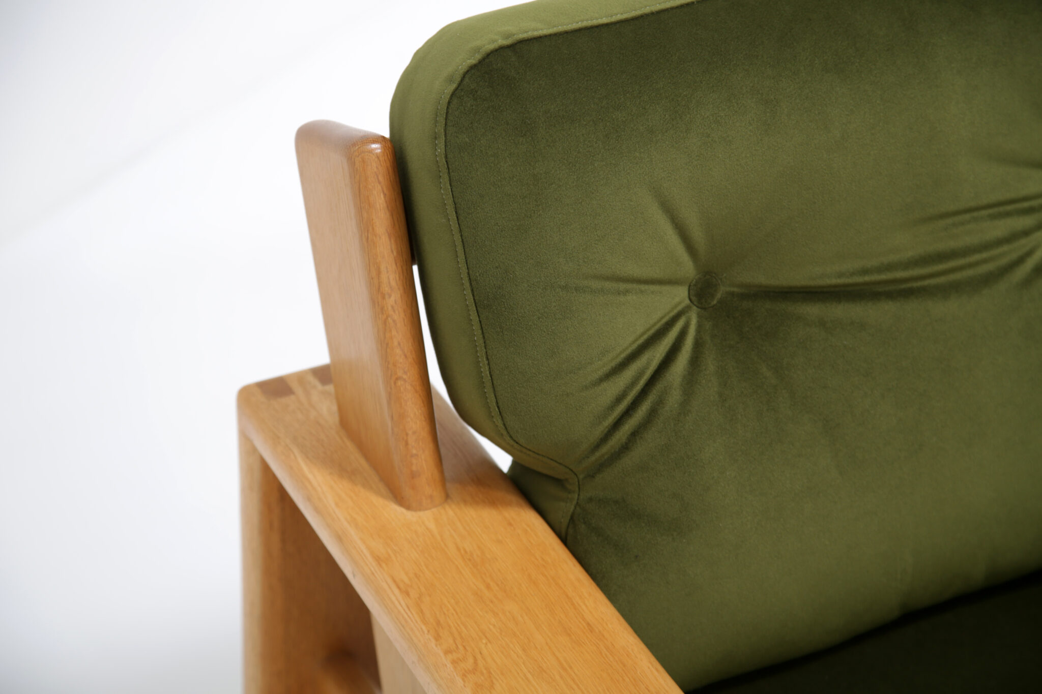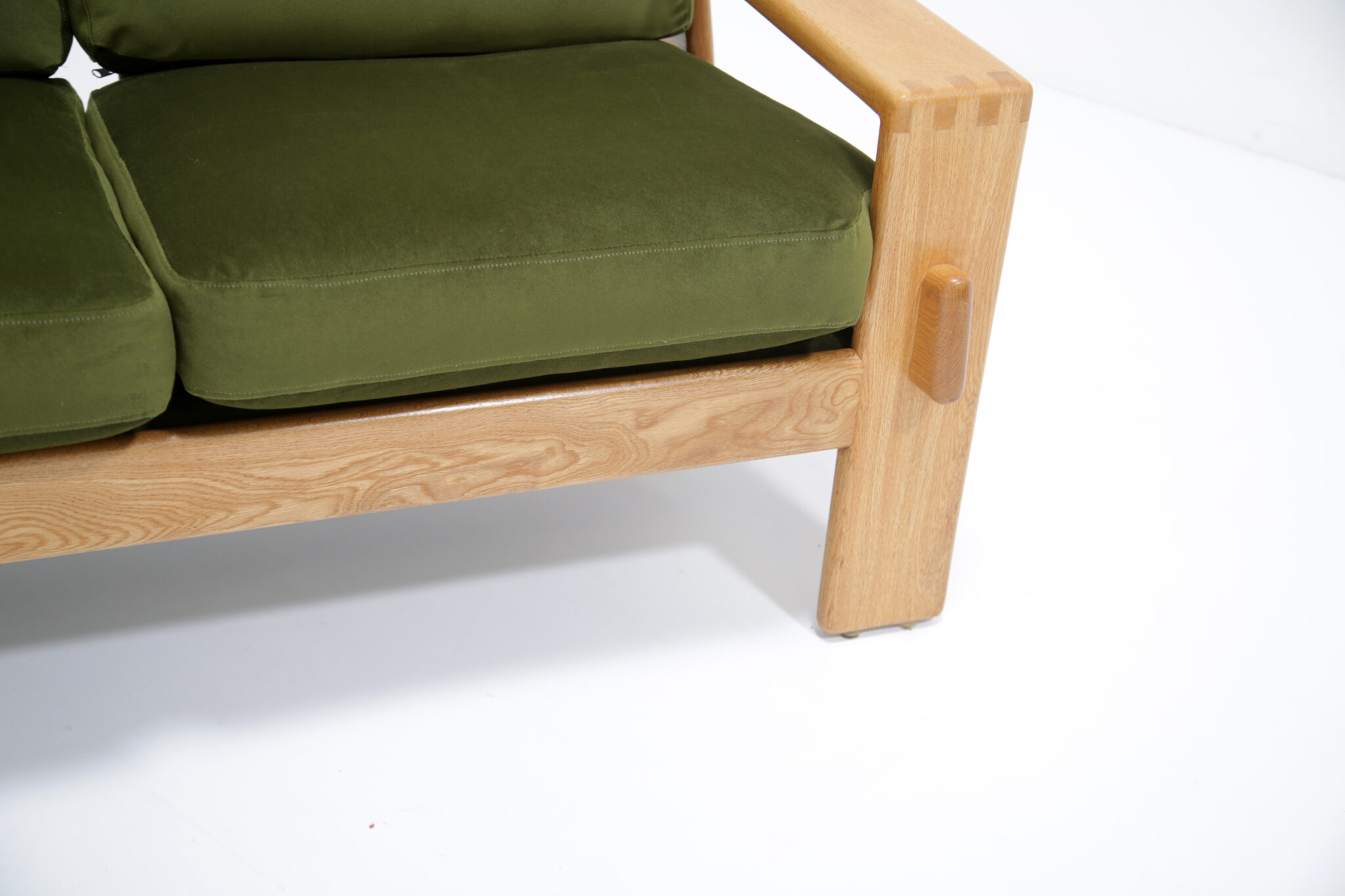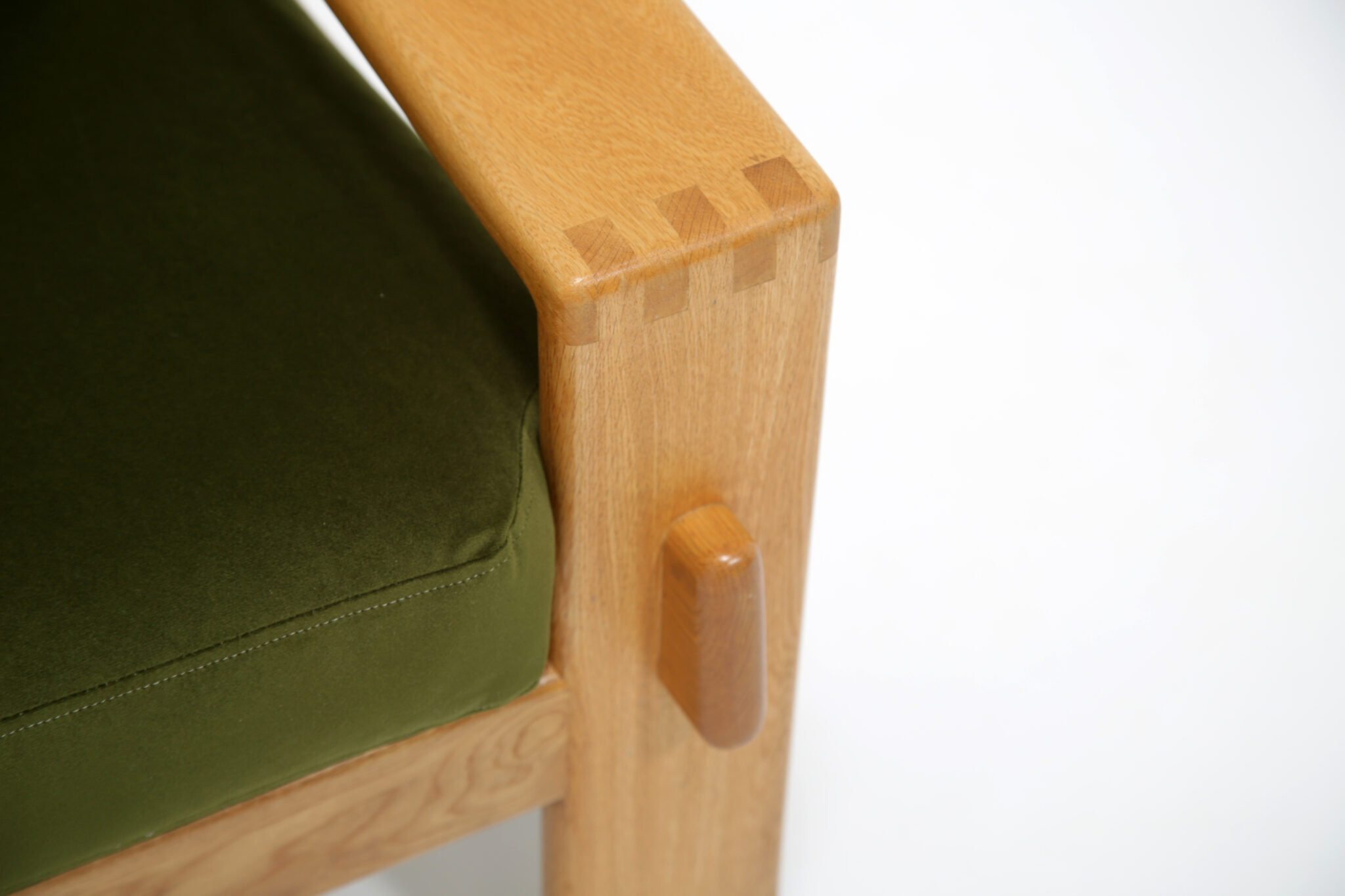 This gorgeous three seat sofa features a solid oak frame with wide plank arms, exposed joints and beautiful angled supports which protrudes on the front rectangular front legs, creating a unique but stunning minimalistic design.