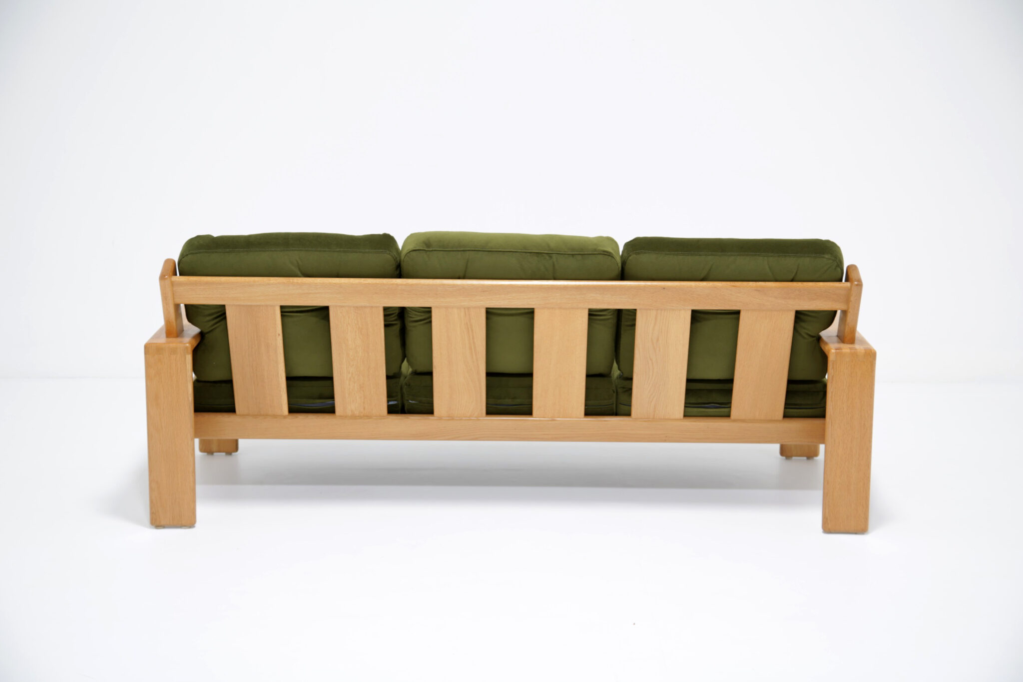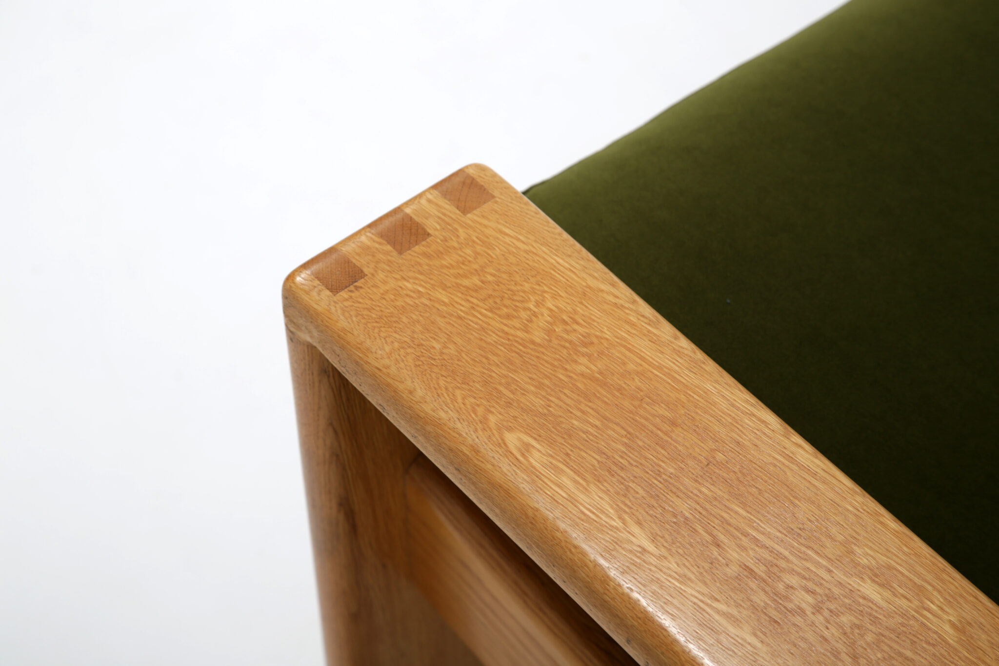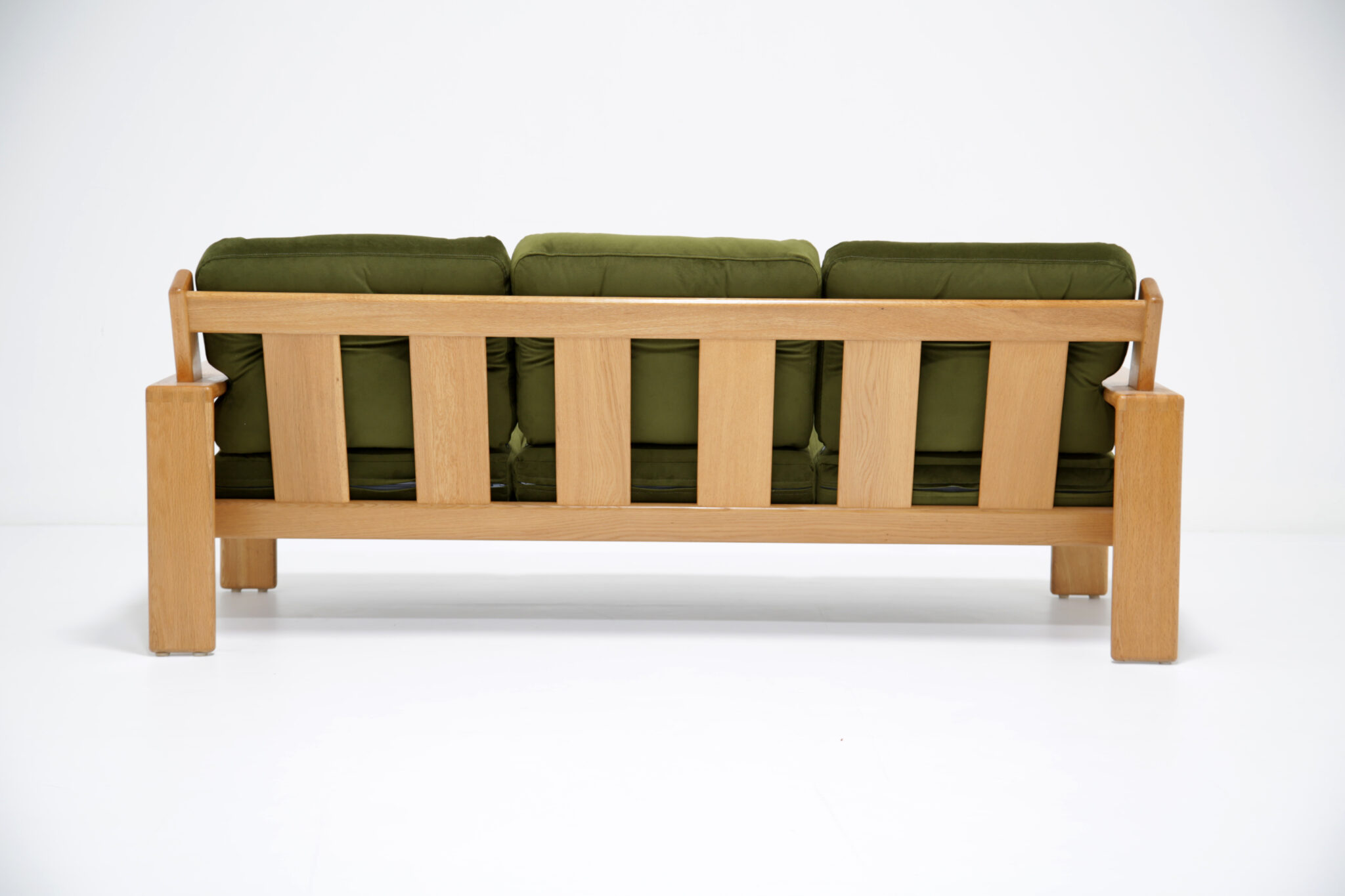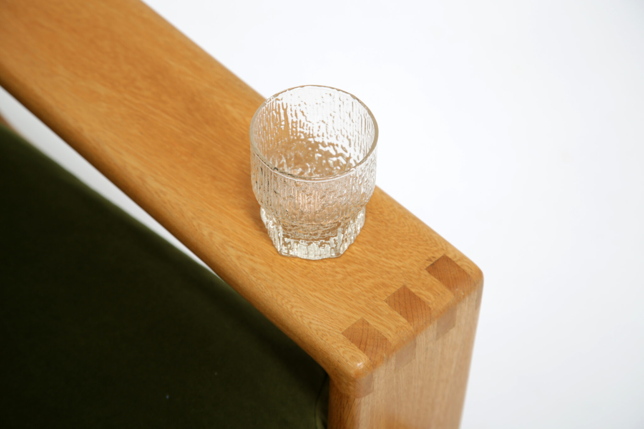 This gorgeous three seat sofa features a solid oak frame with wide plank arms, exposed joints and beautiful angled supports which protrudes on the front rectangular front legs, creating a unique but stunning minimalistic design.
