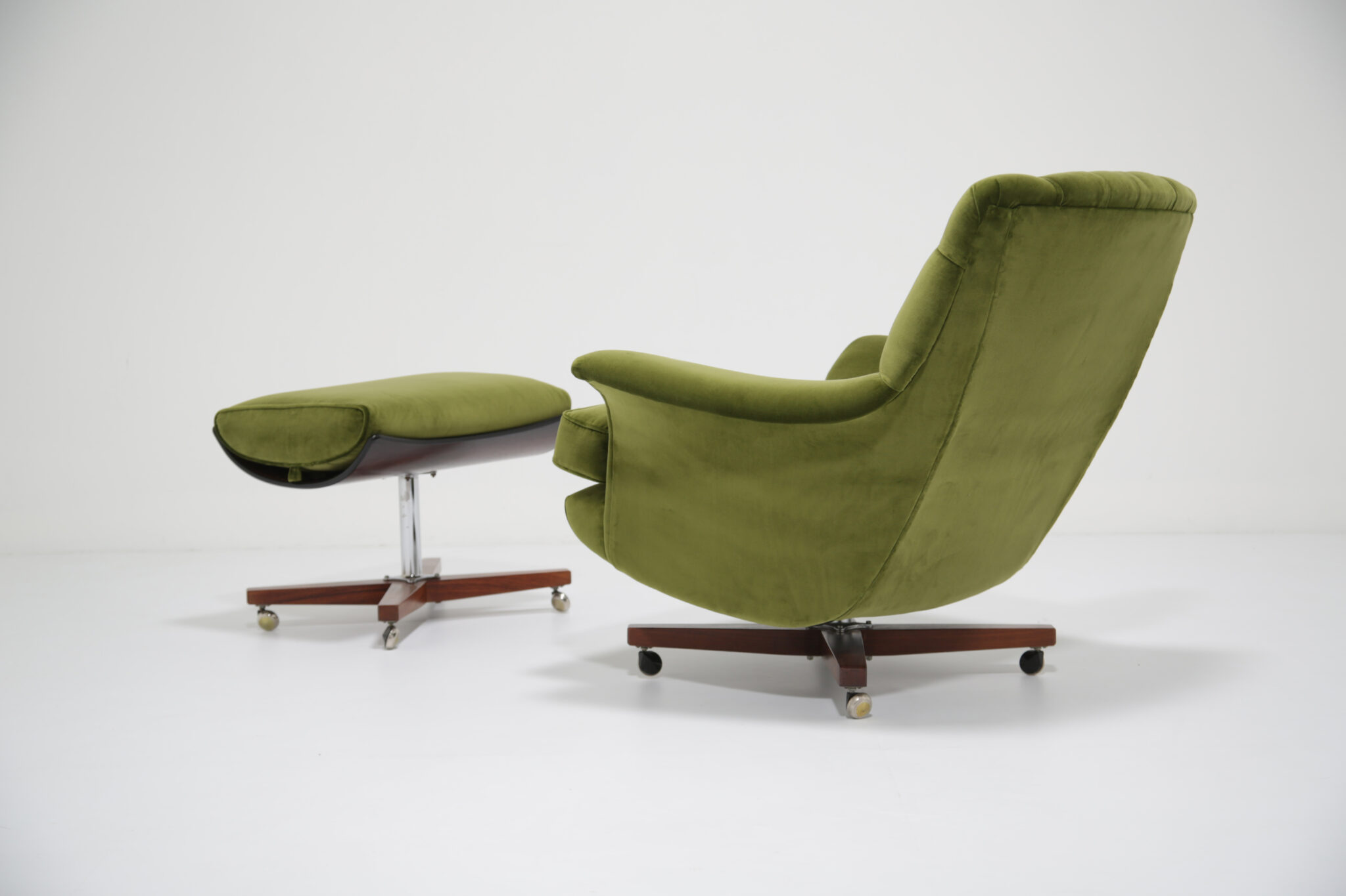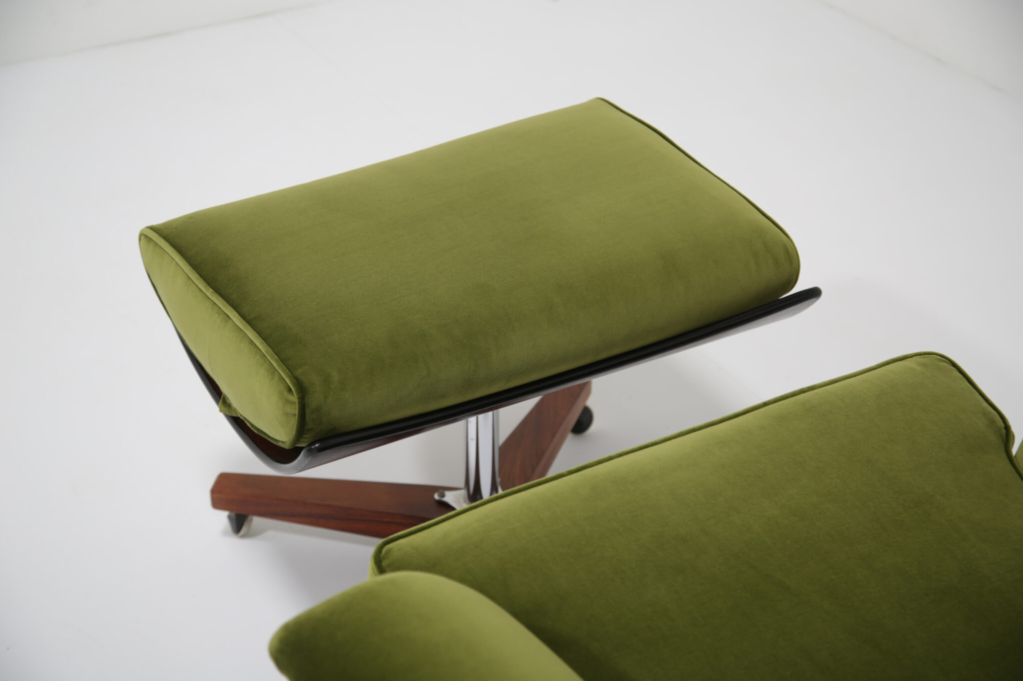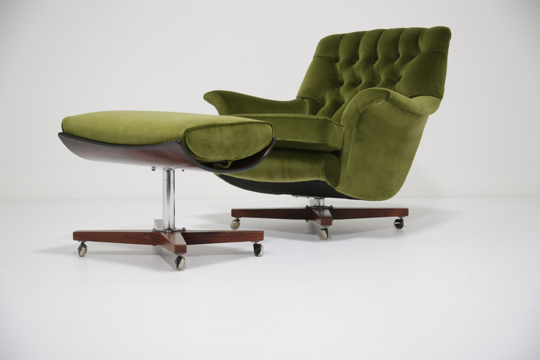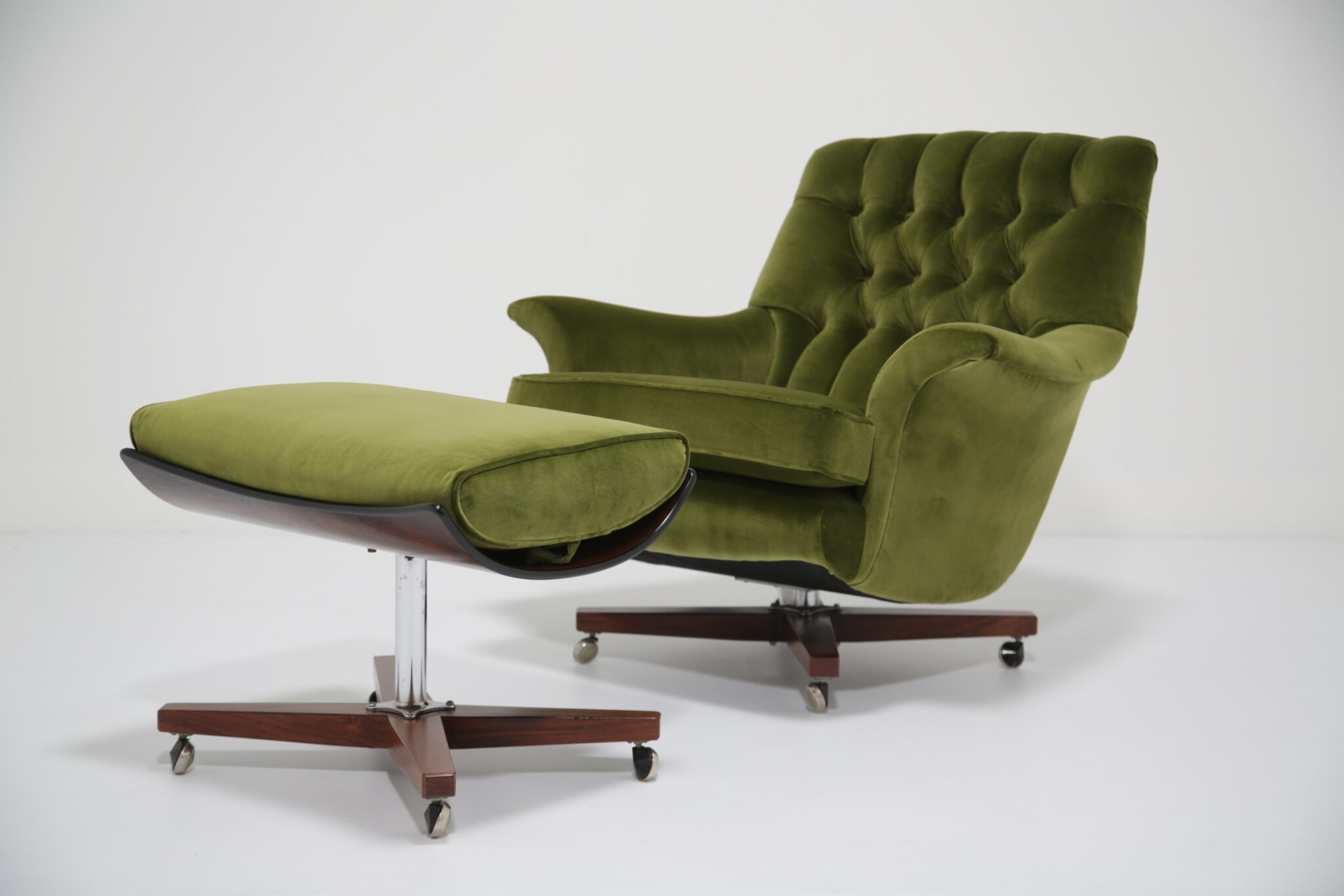 Marketed as “The World’s Most Comfortable Chair” and featured in movies such as the James Bond series and dubbed the “Blofeld” chair. This stunning beauty has undergone a transformation, the frames has been expertly restored by our in-house team and upholstered in a gorgeous green cotton velvet, which is highly durable. This chair is very comfortable to sit in, nearly so that you don’t want to get up out of it. The base and stool is in rosewood with chrome accents which adds to the overall design.