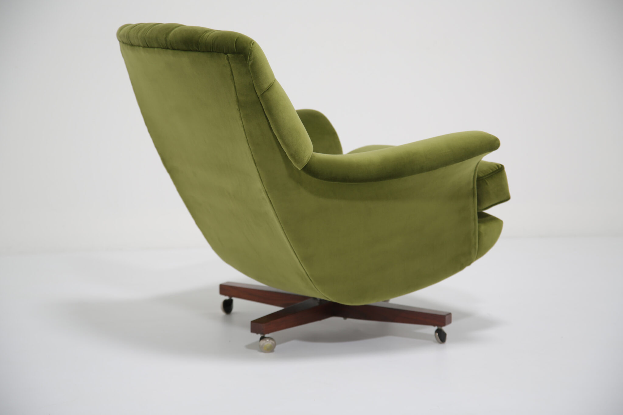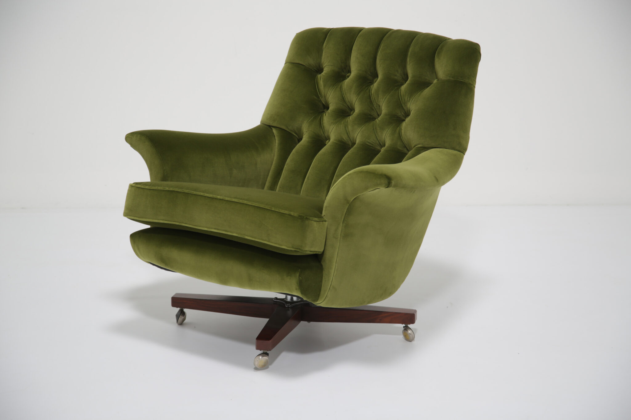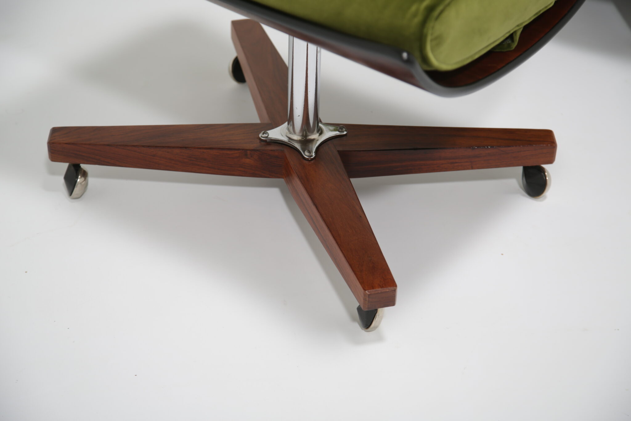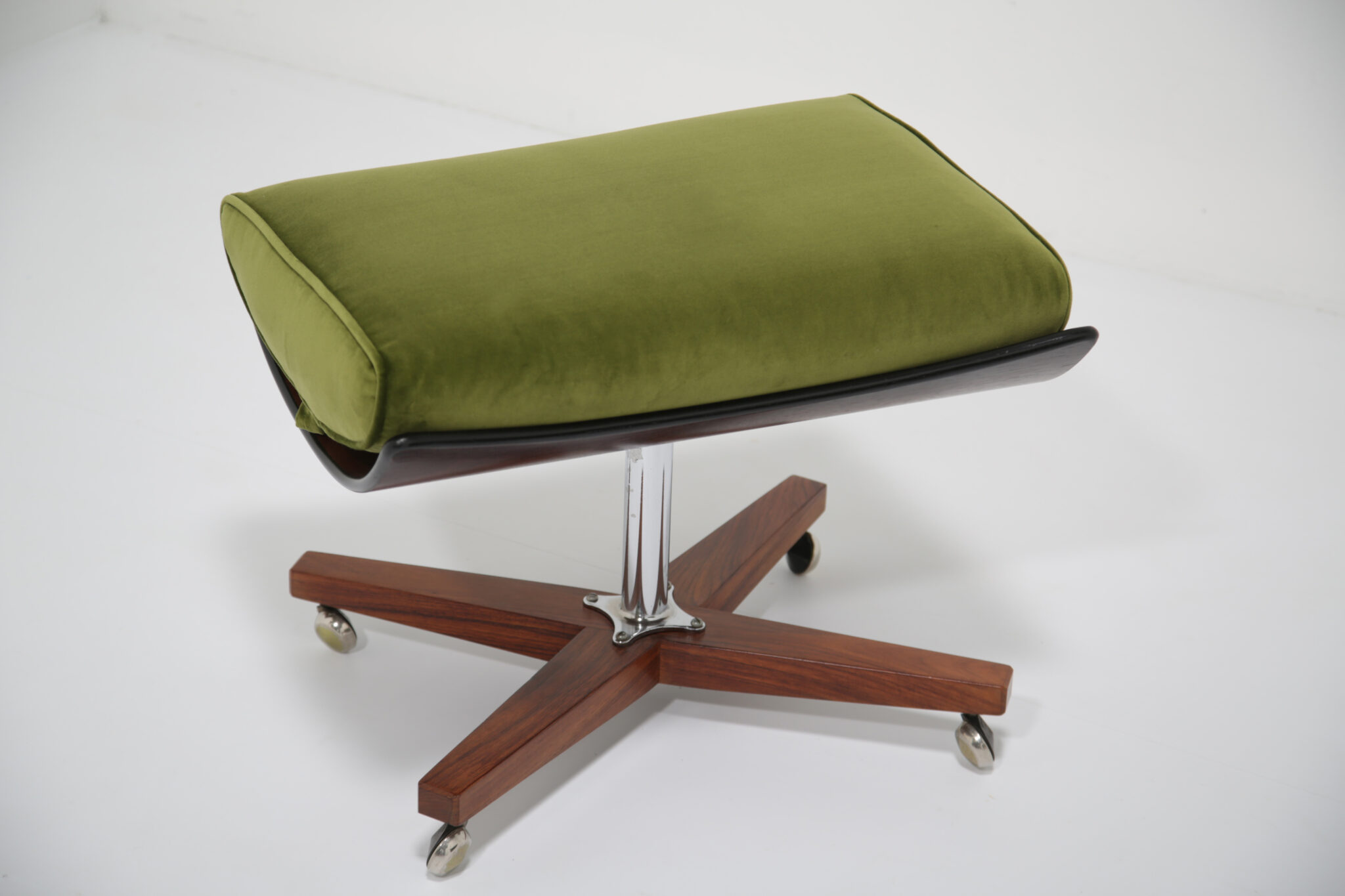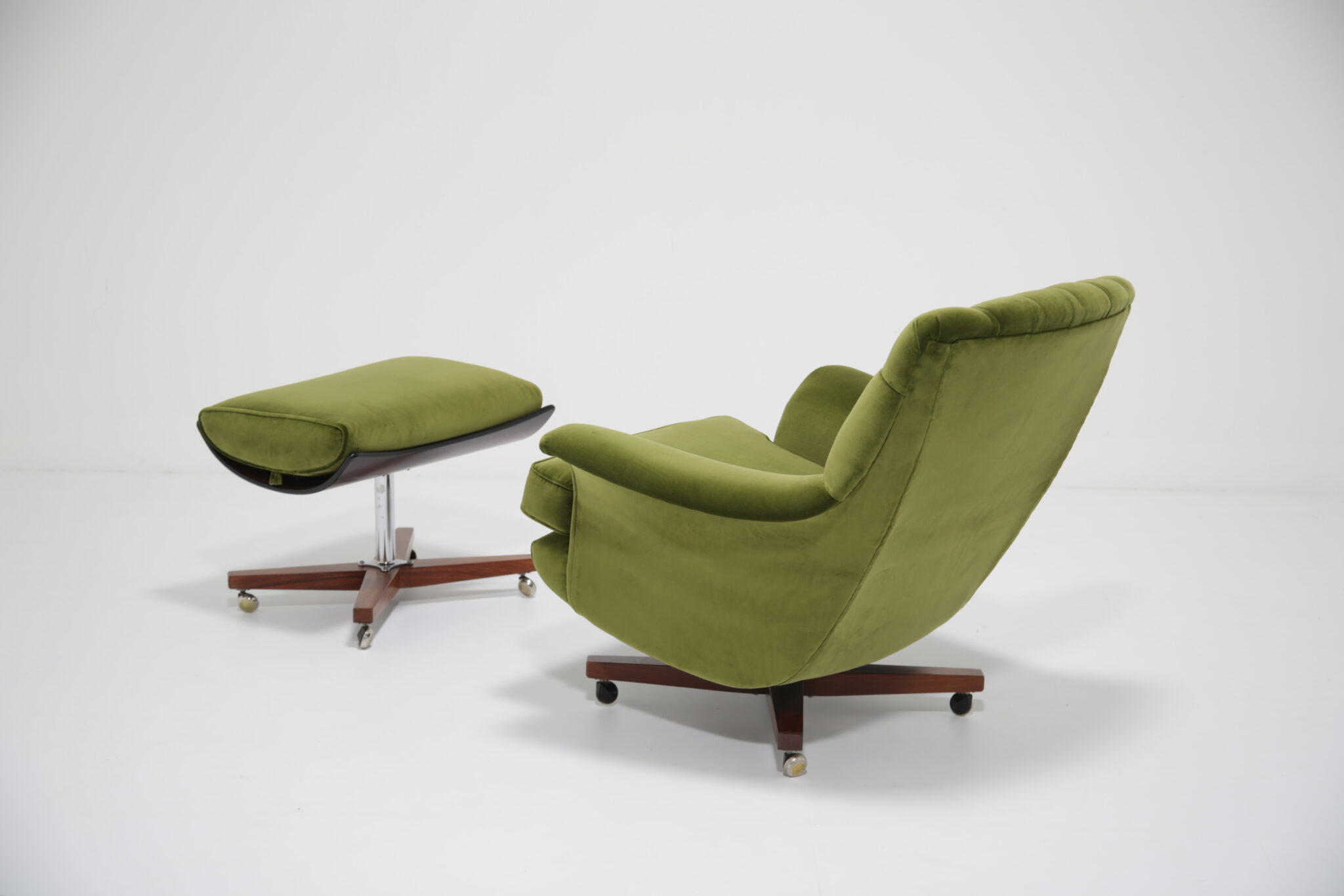 Marketed as “The World’s Most Comfortable Chair” and featured in movies such as the James Bond series and dubbed the “Blofeld” chair. This stunning beauty has undergone a transformation, the frames has been expertly restored by our in-house team and upholstered in a gorgeous green cotton velvet, which is highly durable. This chair is very comfortable to sit in, nearly so that you don’t want to get up out of it. The base and stool is in rosewood with chrome accents which adds to the overall design.