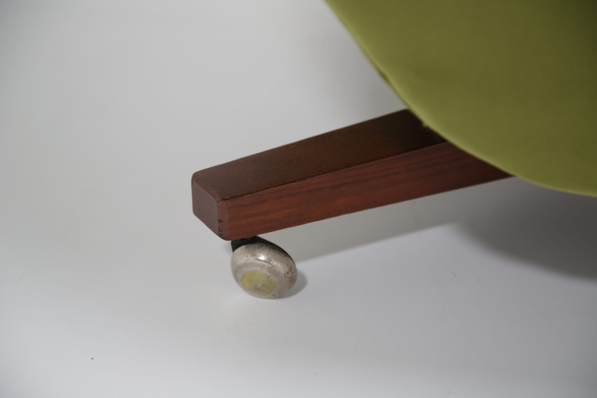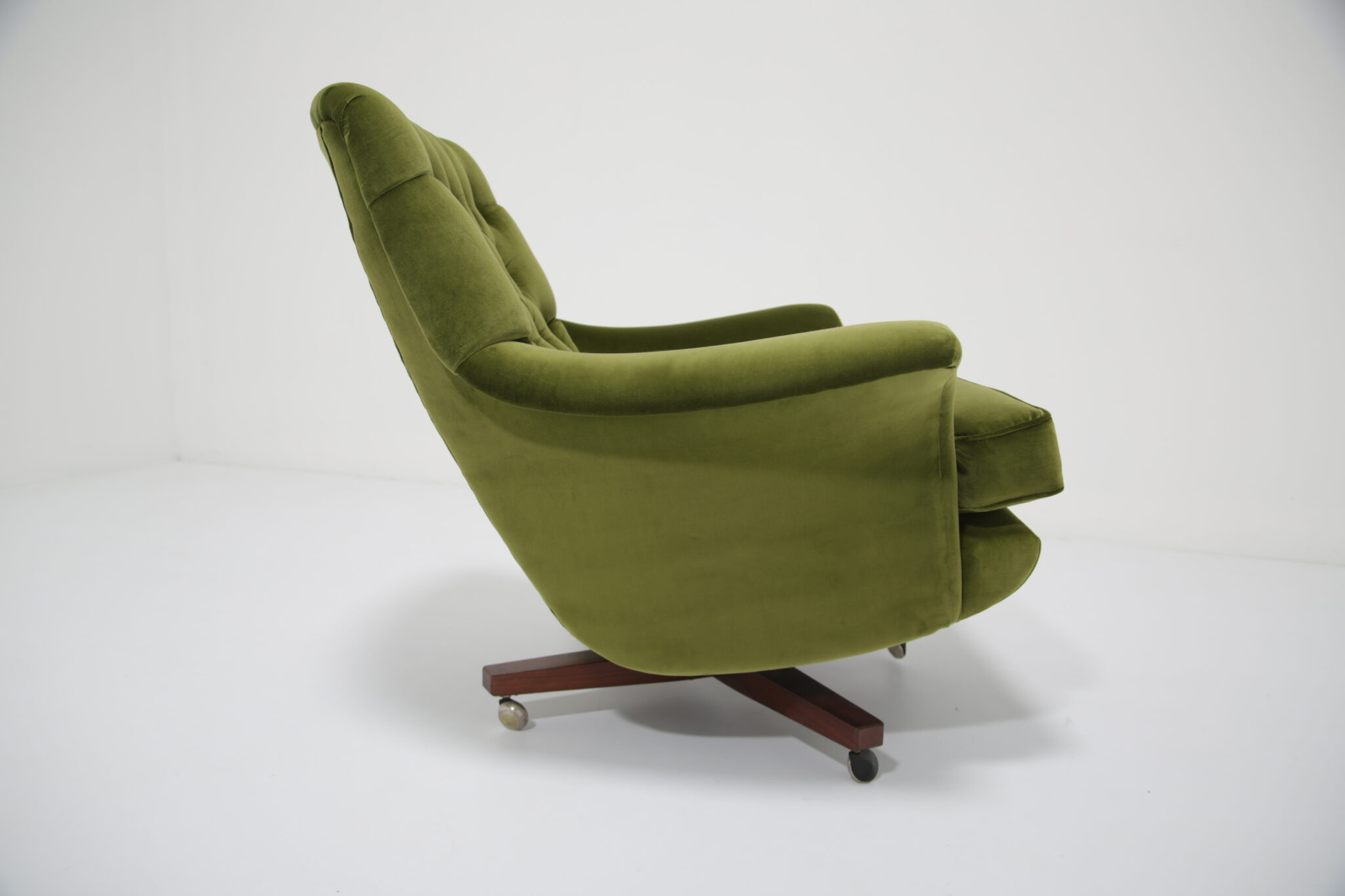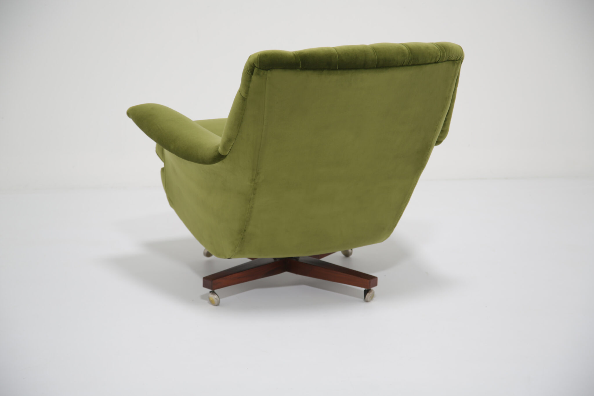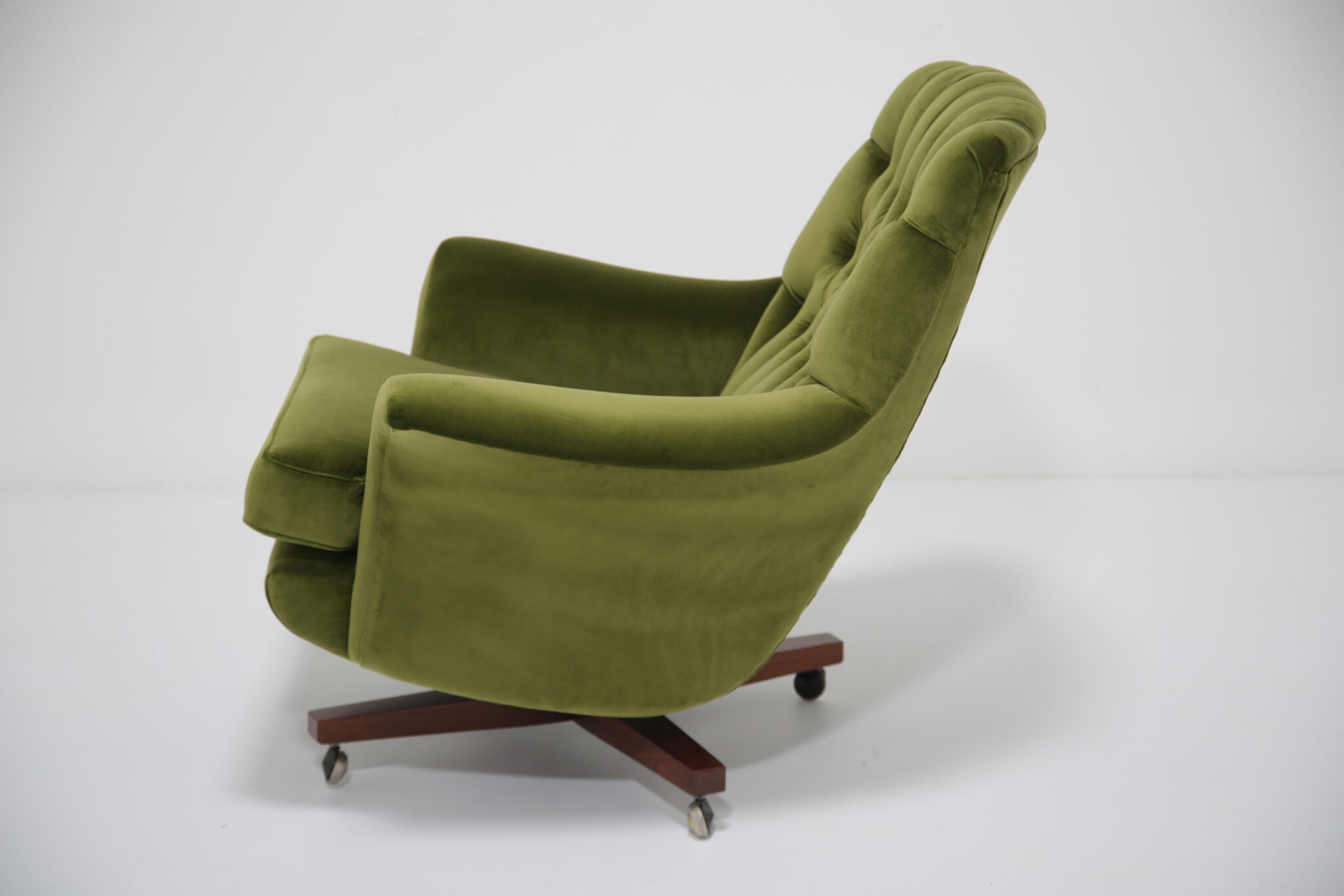 Marketed as “The World’s Most Comfortable Chair” and featured in movies such as the James Bond series and dubbed the “Blofeld” chair. This stunning beauty has undergone a transformation, the frames has been expertly restored by our in-house team and upholstered in a gorgeous green cotton velvet, which is highly durable. This chair is very comfortable to sit in, nearly so that you don’t want to get up out of it. The base and stool is in rosewood with chrome accents which adds to the overall design.