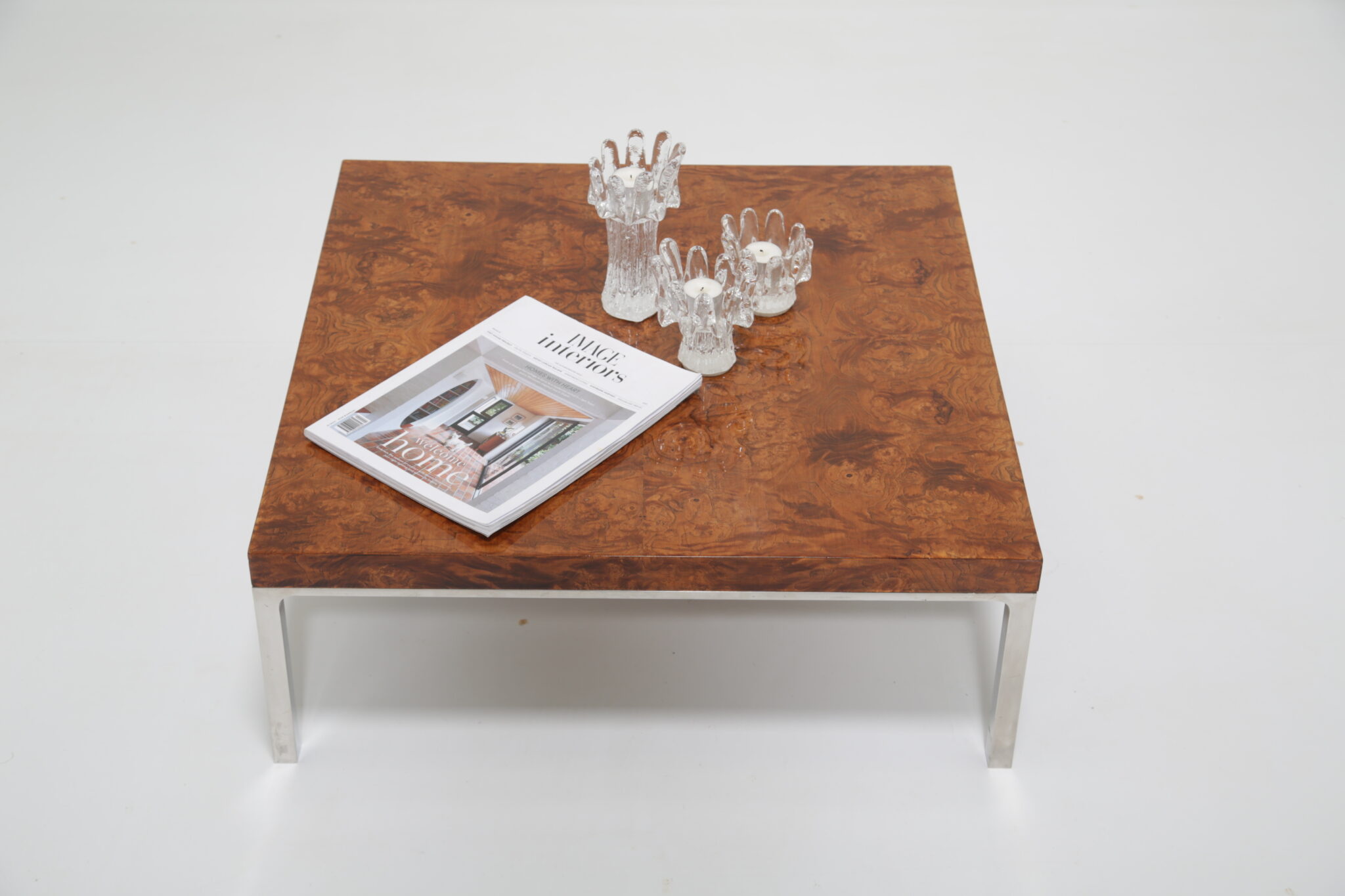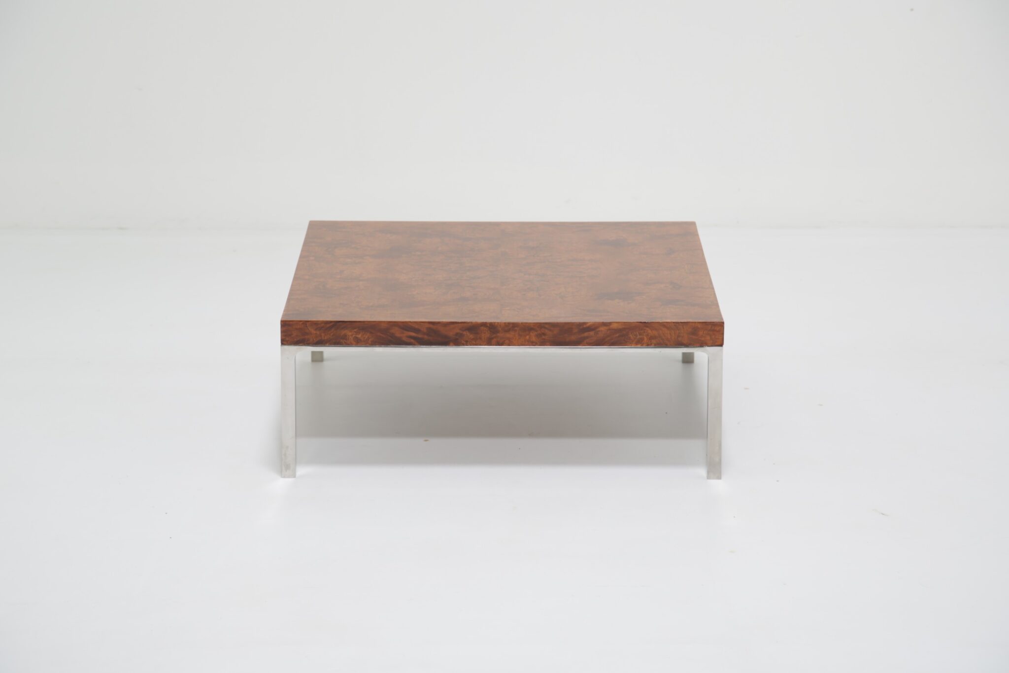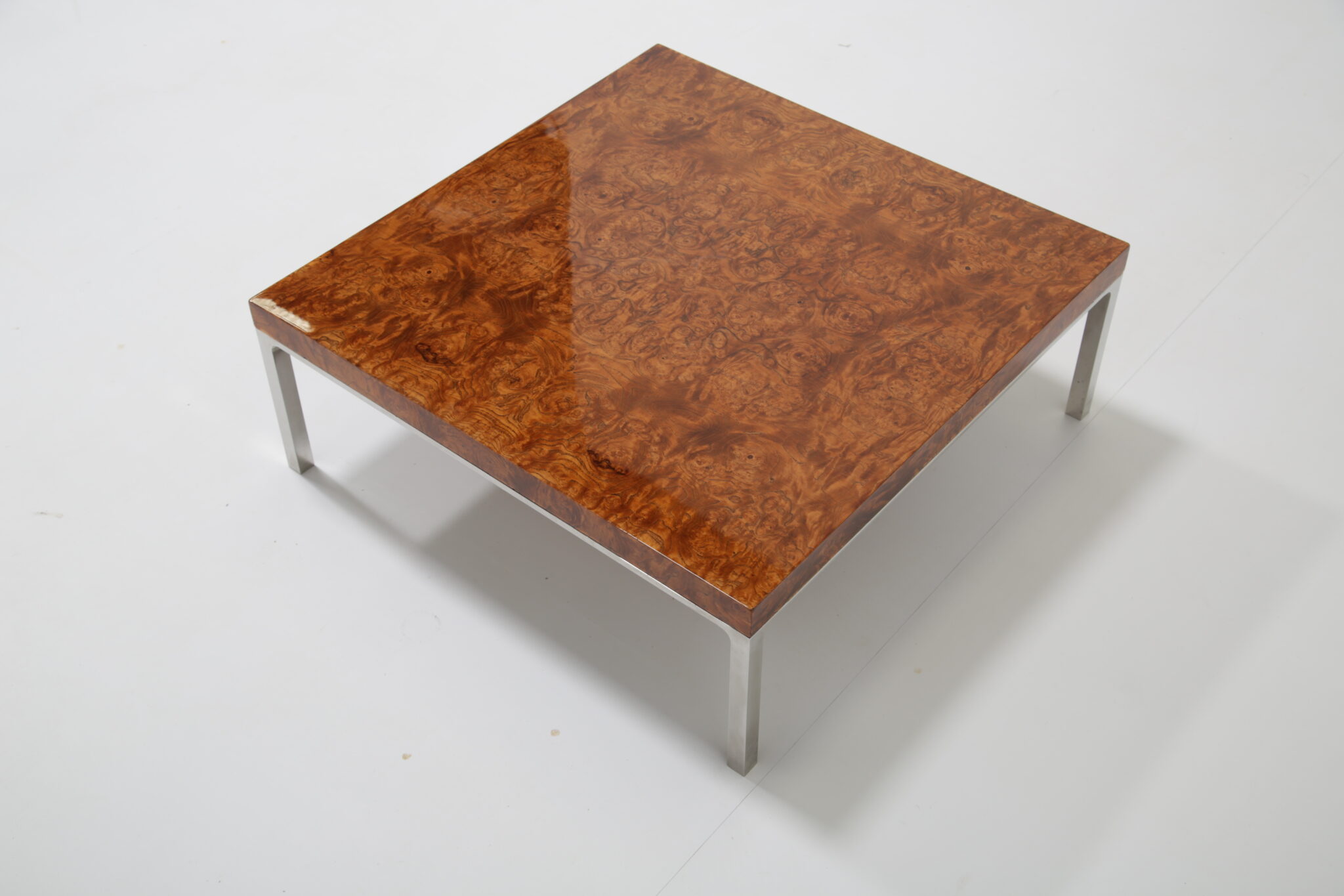 If you are on the hunt for a low coffee table with style and design, this could be the one for you. Manufactured in olive burl wood and paired with a chrome frame, it creates a beautiful minimalist design that is reflective. This table has been expertly restored by our talented team and has been sprayed in a gloss finish to bring it back to it’s former glory. This could also work as a side table between a sofa and an armchair to hold a tall lamp or vase.