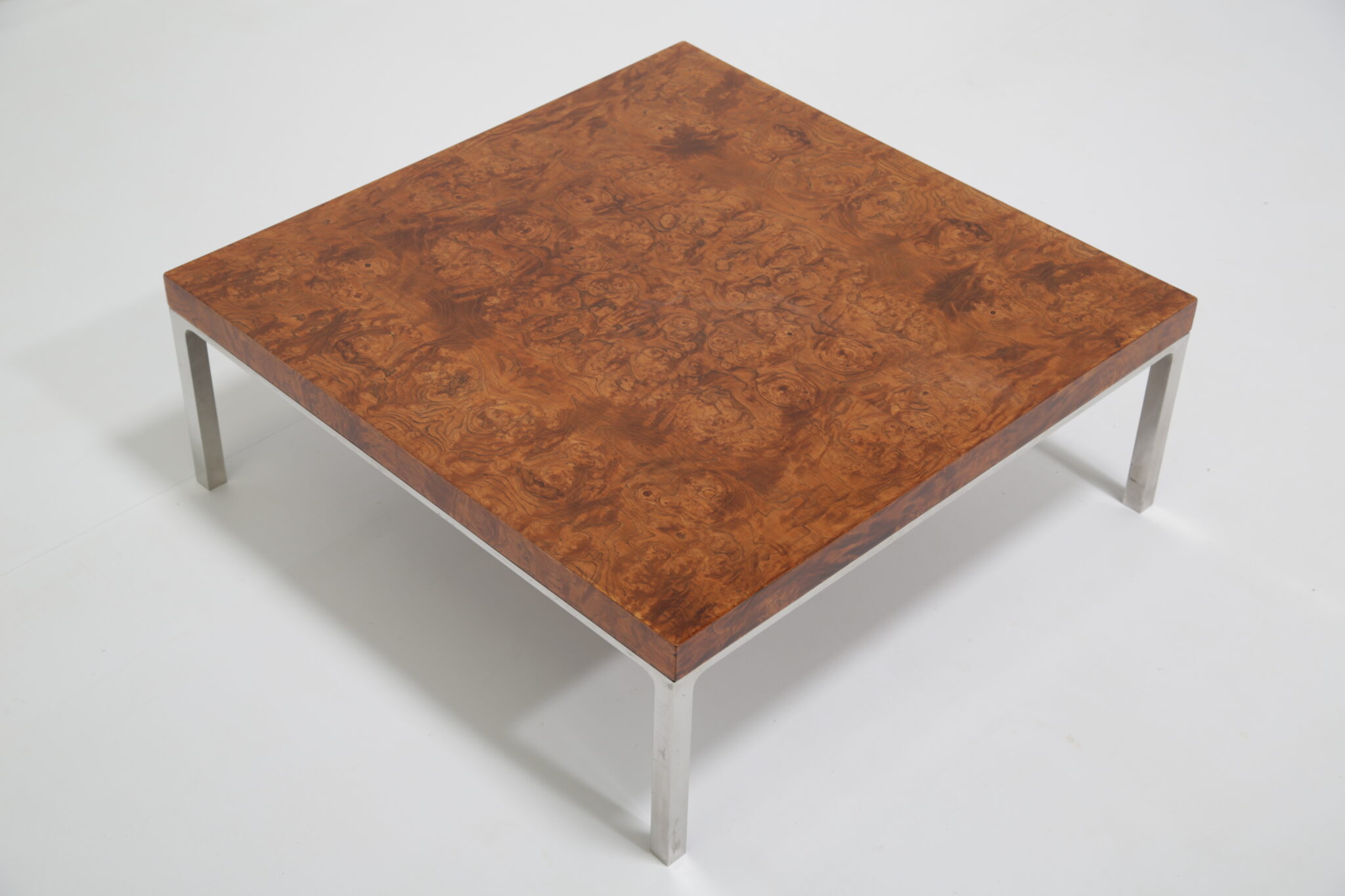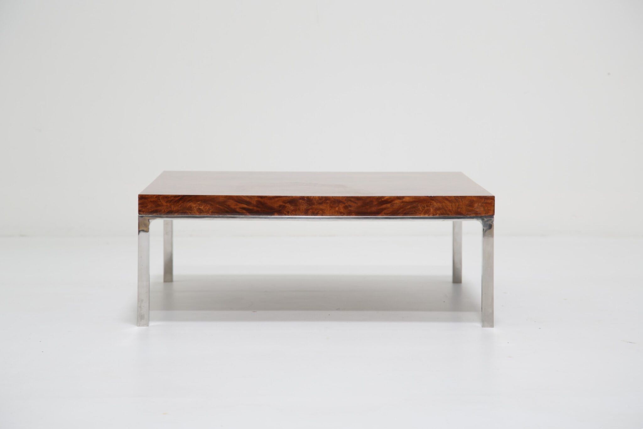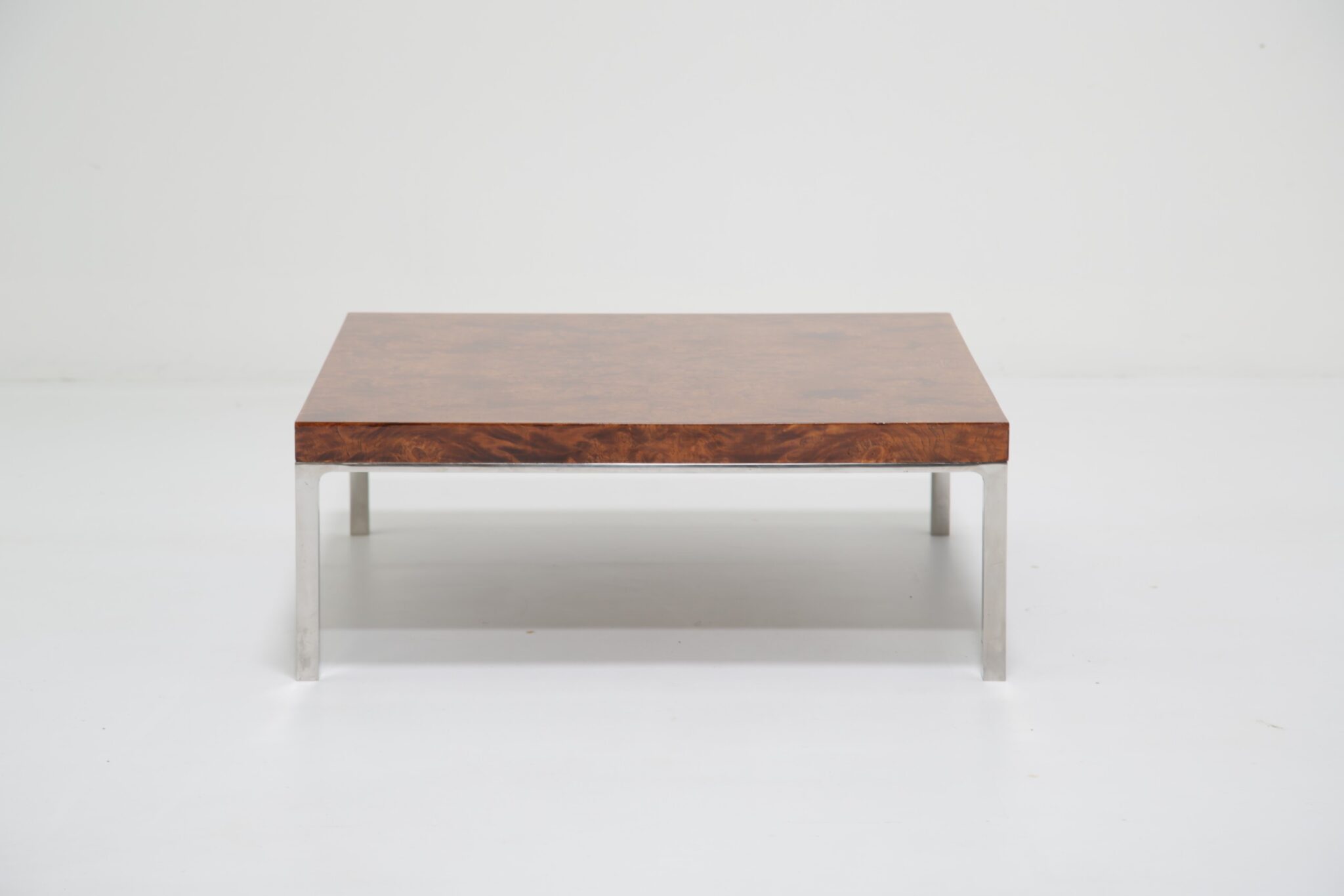 If you are on the hunt for a low coffee table with style and design, this could be the one for you. Manufactured in olive burl wood and paired with a chrome frame, it creates a beautiful minimalist design that is reflective. This table has been expertly restored by our talented team and has been sprayed in a gloss finish to bring it back to it’s former glory. This could also work as a side table between a sofa and an armchair to hold a tall lamp or vase.