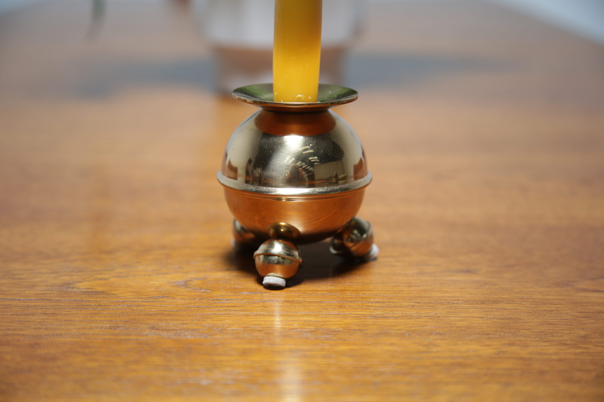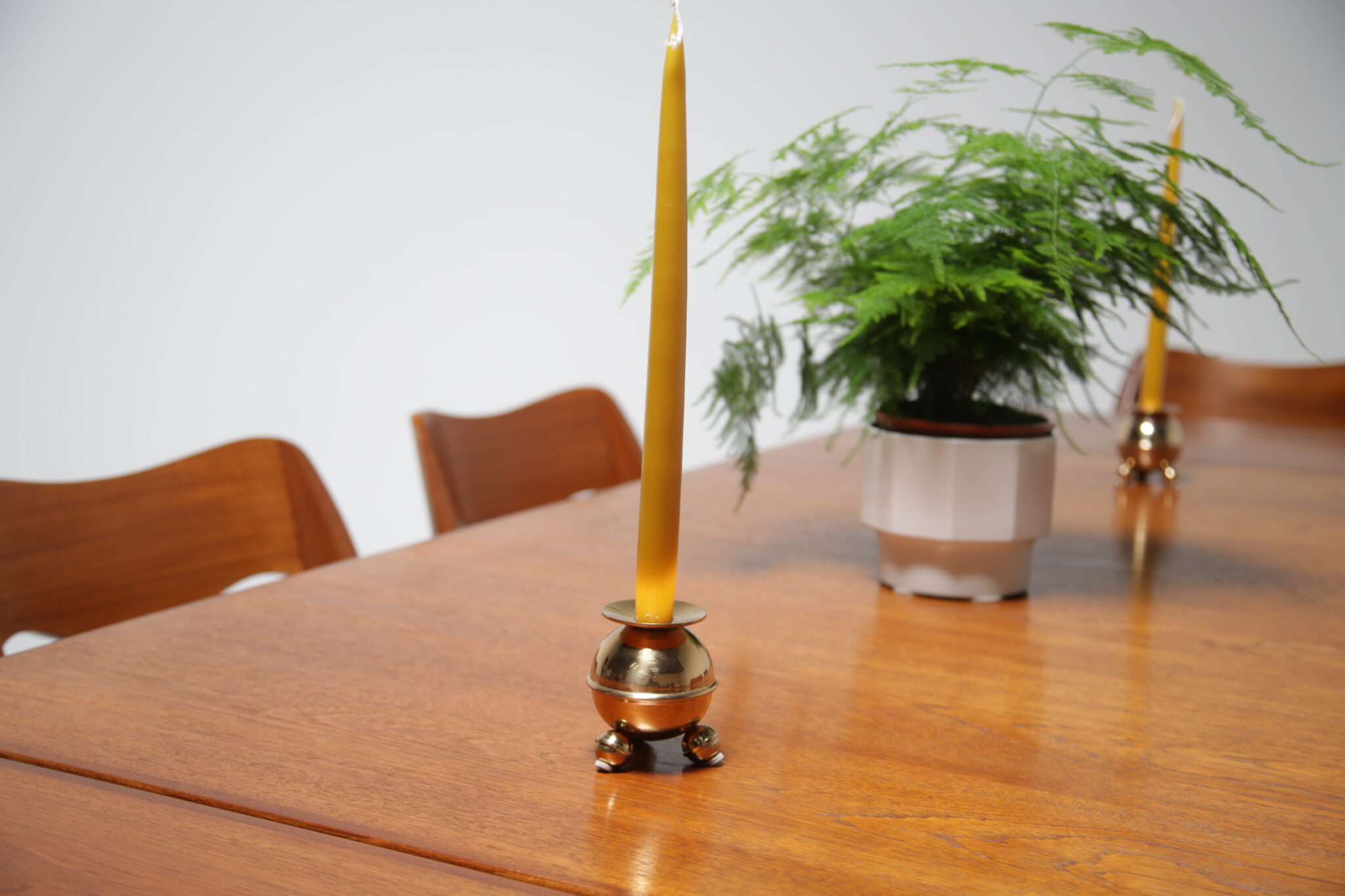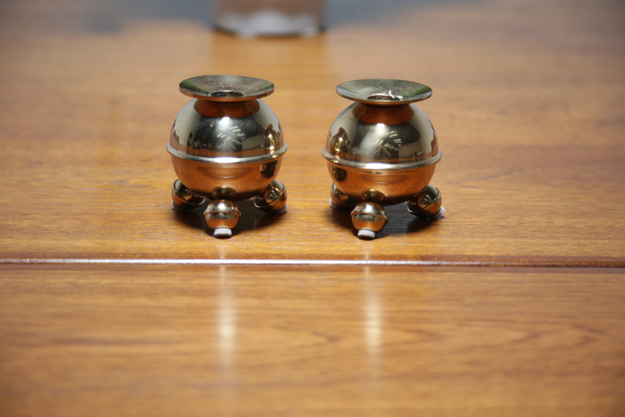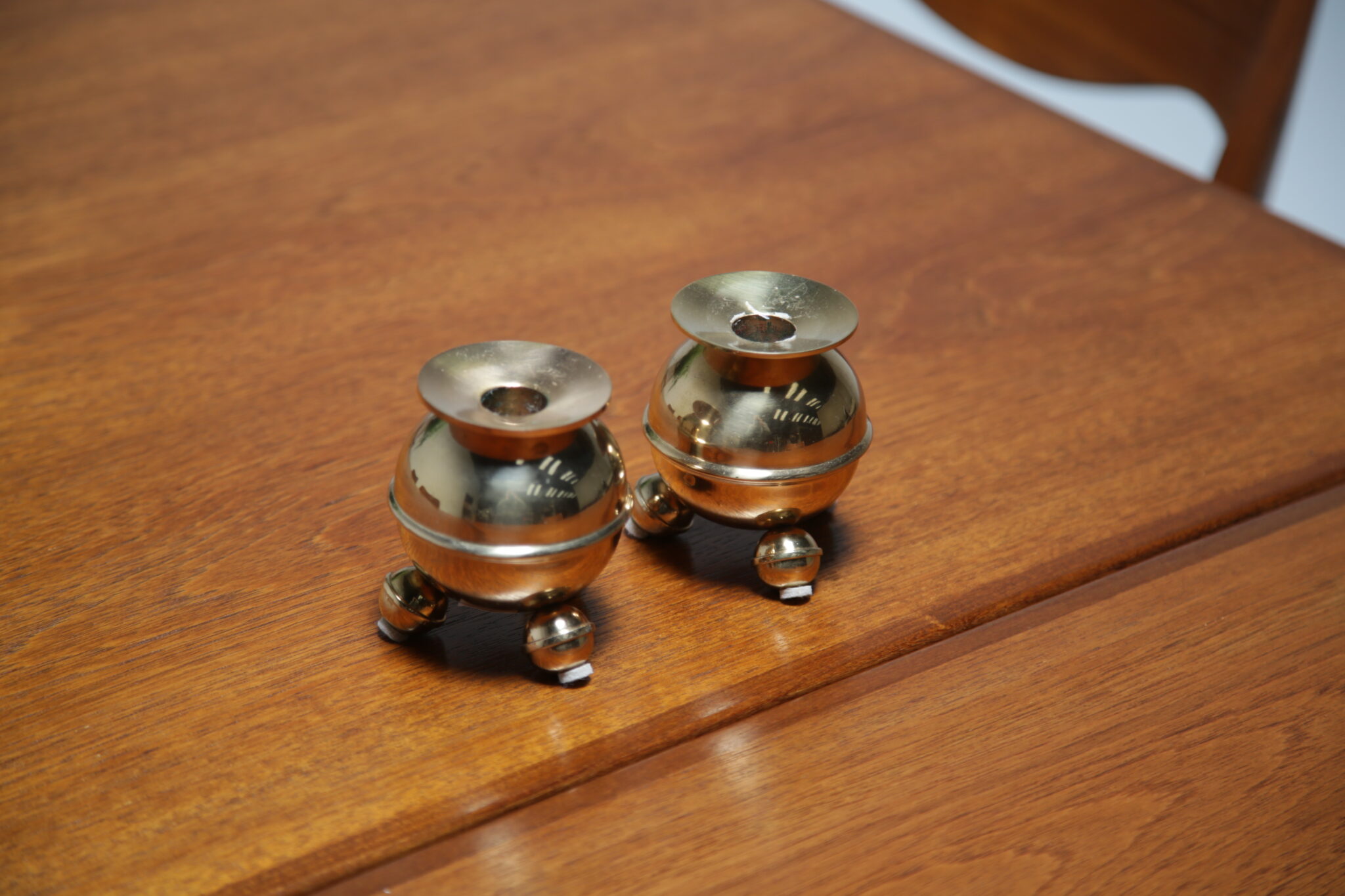If you are looking to dress up your coffee or dining table with a pair of vintage round brass candleholders, look no further as these are the perfect pair. The candleholders feature 3 angled bun feet with a circular top which acts as a drip tray for the candlewax. They were manufactured by a company called Gusum Bruk which was founded in Sweden in 1653.