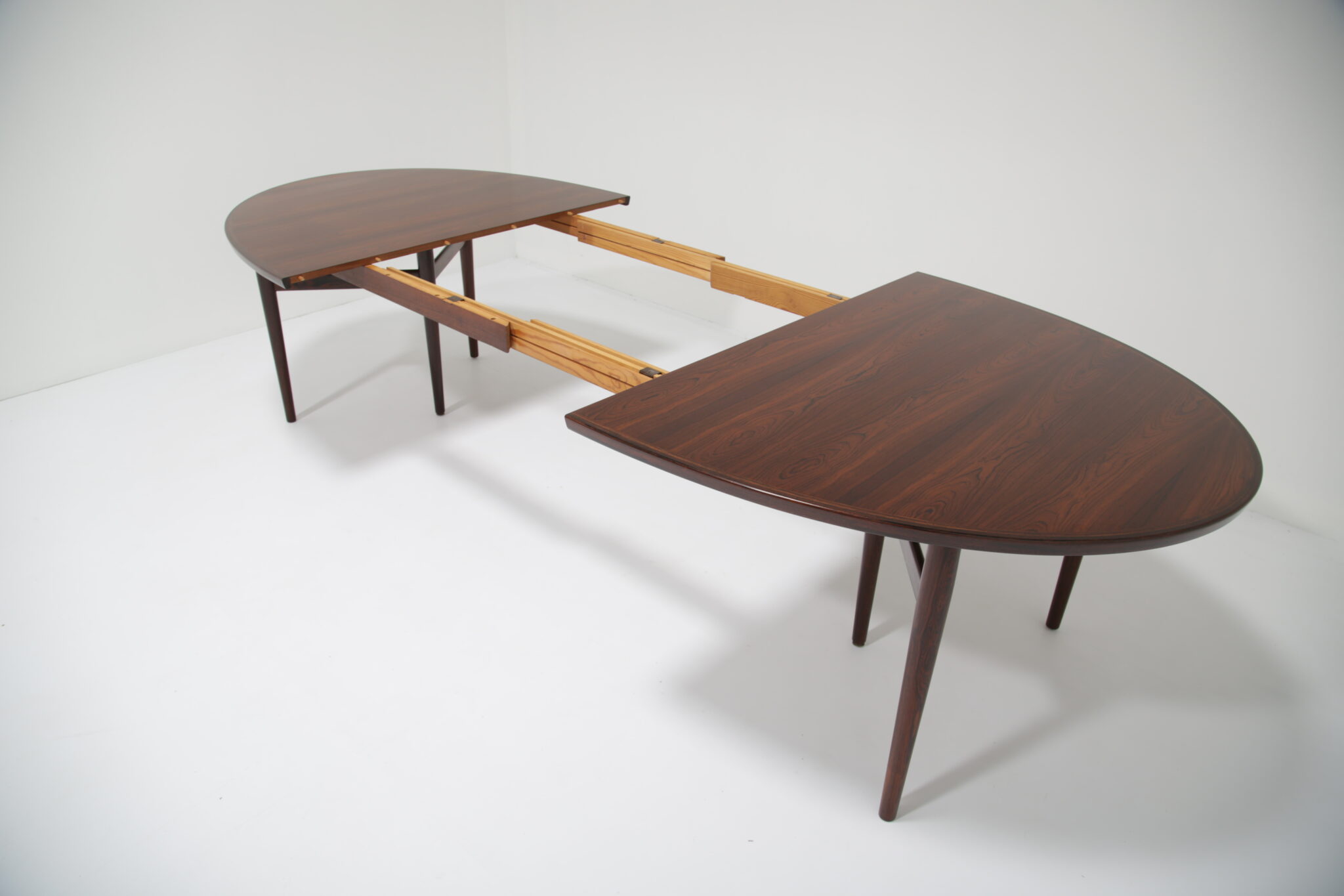 A remarkable and highly sought-after dining table designed by Arne Vodder for Sibast Møbler, Denmark, in the 1960s. The Model 212 is one of Vodder’s most celebrated dining designs—often referred to as the Rolls Royce of Danish dining tables—and this example in Brazilian rosewood is particularly exceptional.
