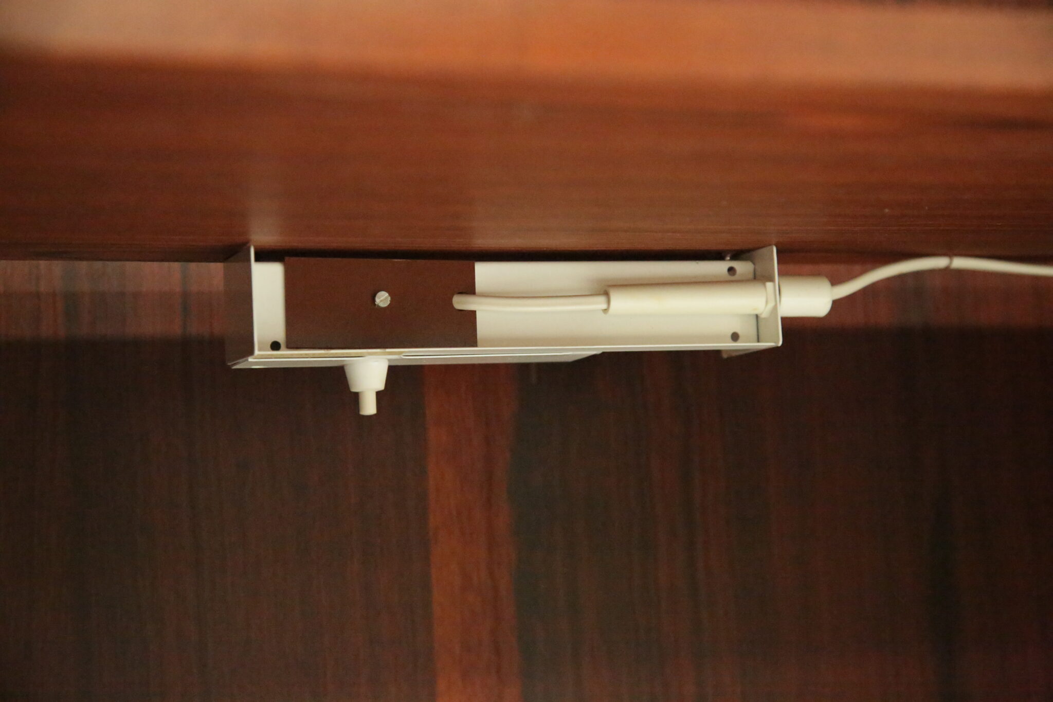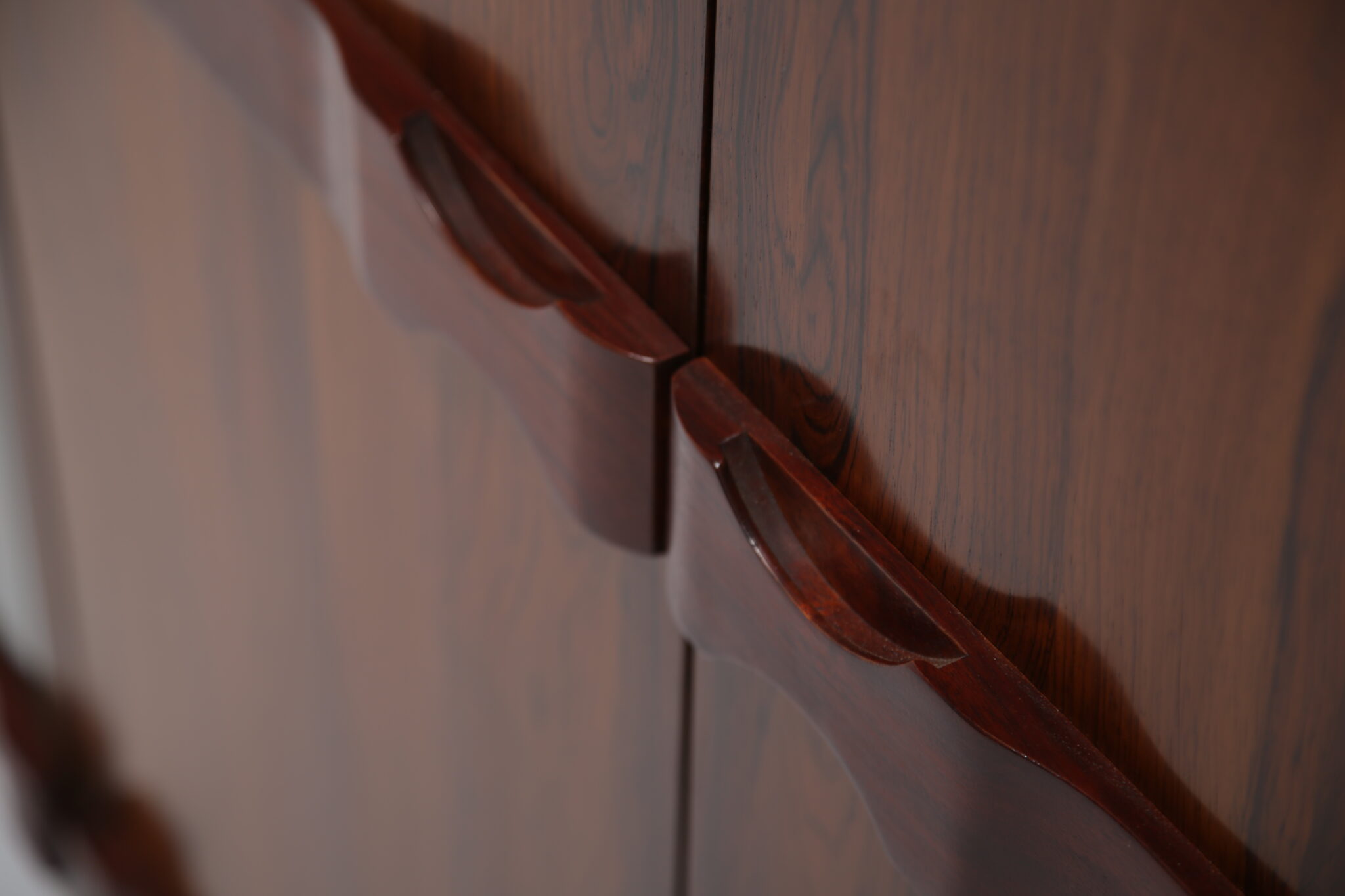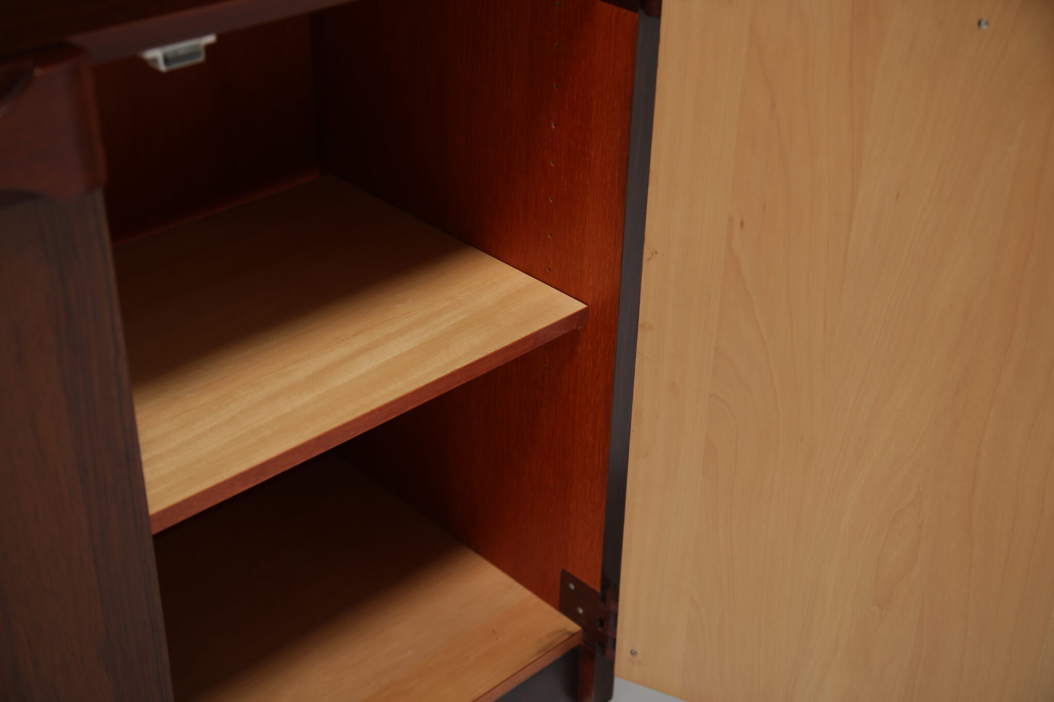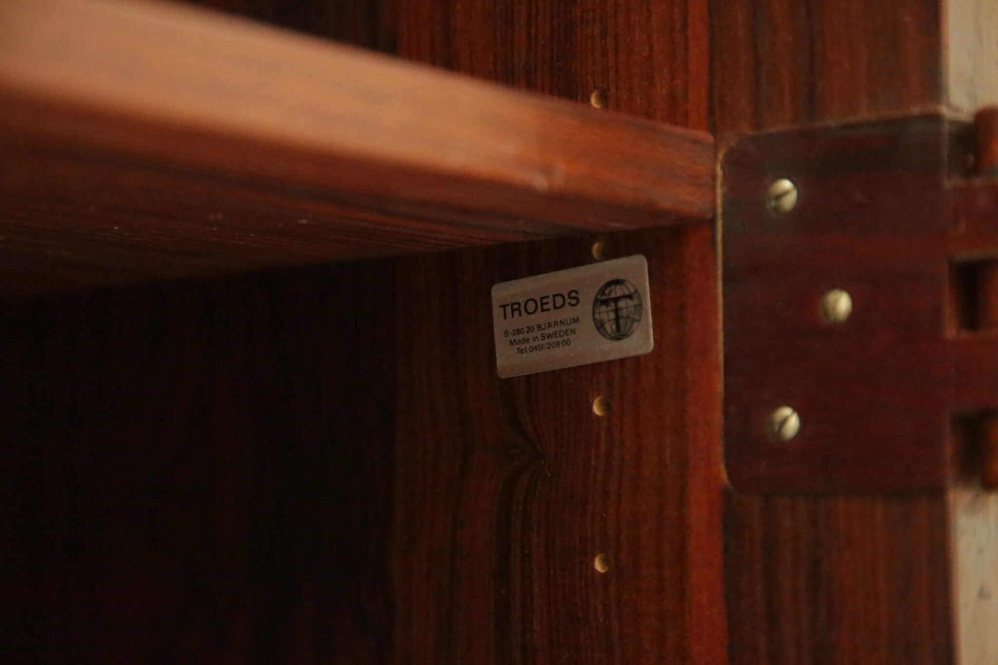This three-piece cabinet system, designed by Nils Jonsson for Troeds in the 1960s, is a striking example of Scandinavian modern storage design. Crafted in richly grained rosewood, it features Jonsson’s signature sculpted handles and clean, functional lines. The system is comprised of three separate units—two with cupboards and one with both open and glass-fronted shelving—offering a flexible mix of display and storage options. Adjustable shelving allows you to tailor the configuration to suit books, decorative objects, or everyday use, while the variation of closed and open sections provides balance and elegance. With its bold wood grain, superb craftsmanship, and timeless design, this cabinet system makes a refined addition to both vintage and modern interiors.