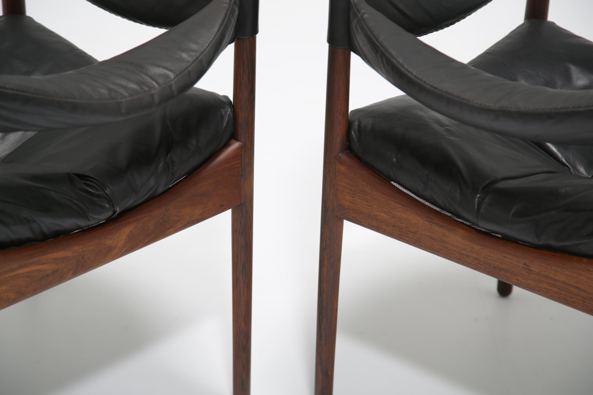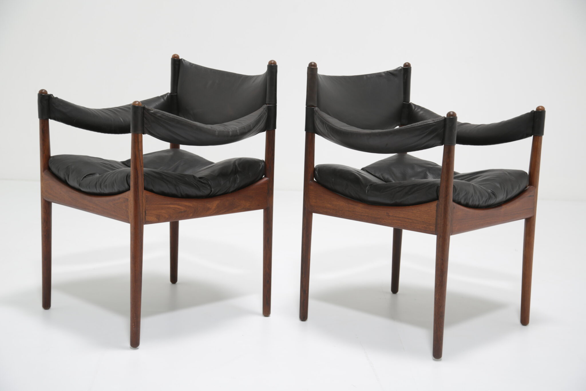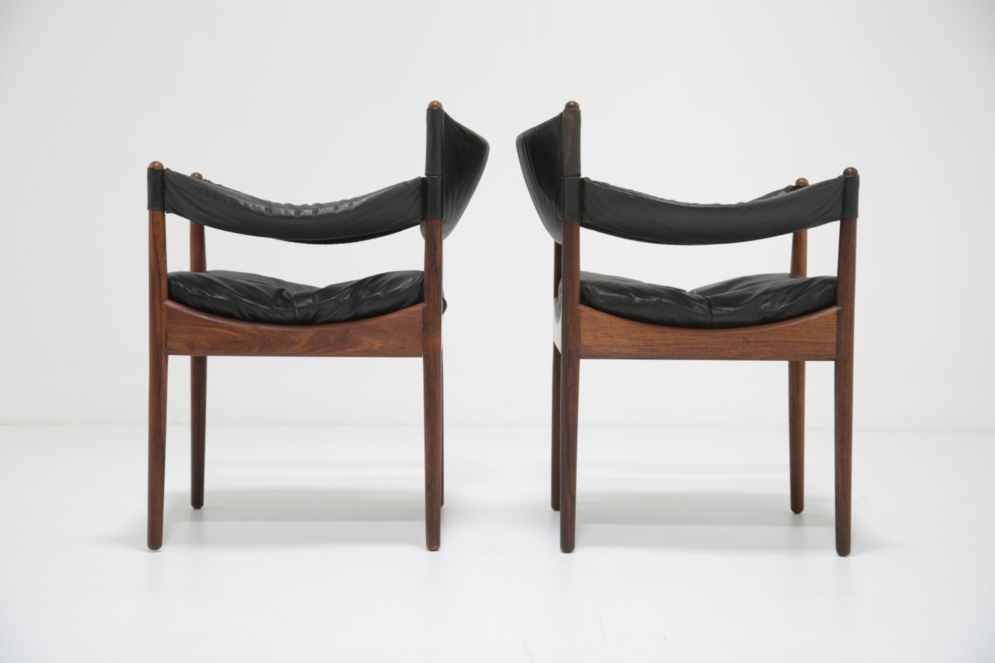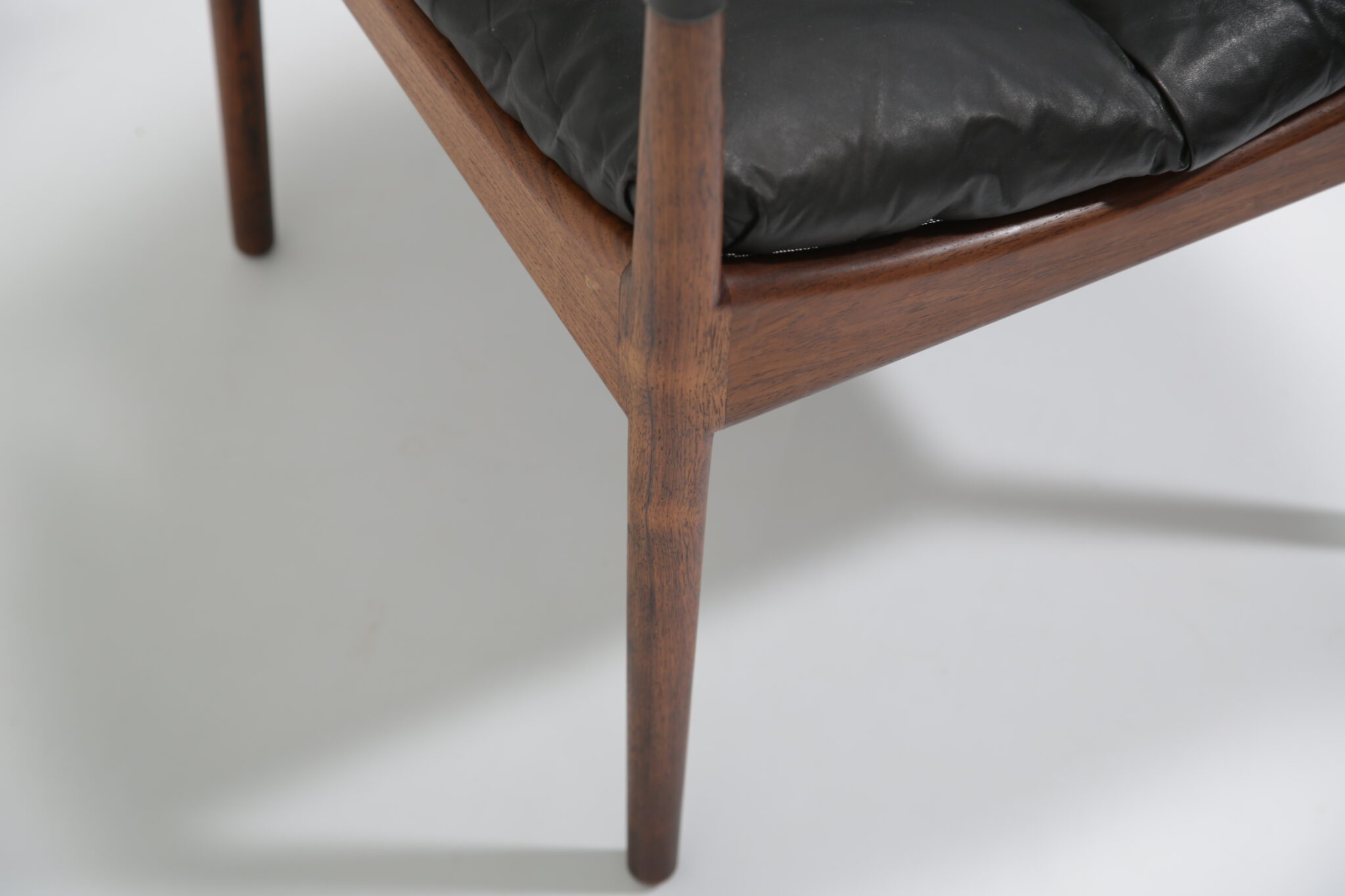 Take a look at these gorgeous dining chairs in it’s original black leather upholstery. Designed by the Danish designer Kristian Solmer Vedel for Søren Willadsen in the 1960s. These dining chairs are comfortable to sit in and provides optimal support for the back and arms, perfect for longer durations seated at the dining table with friends and family. The design of these chairs are stunning with curved rails, nicely shaped arms and rounded legs. These would also function in a boardroom or as an alternative to an office chair.