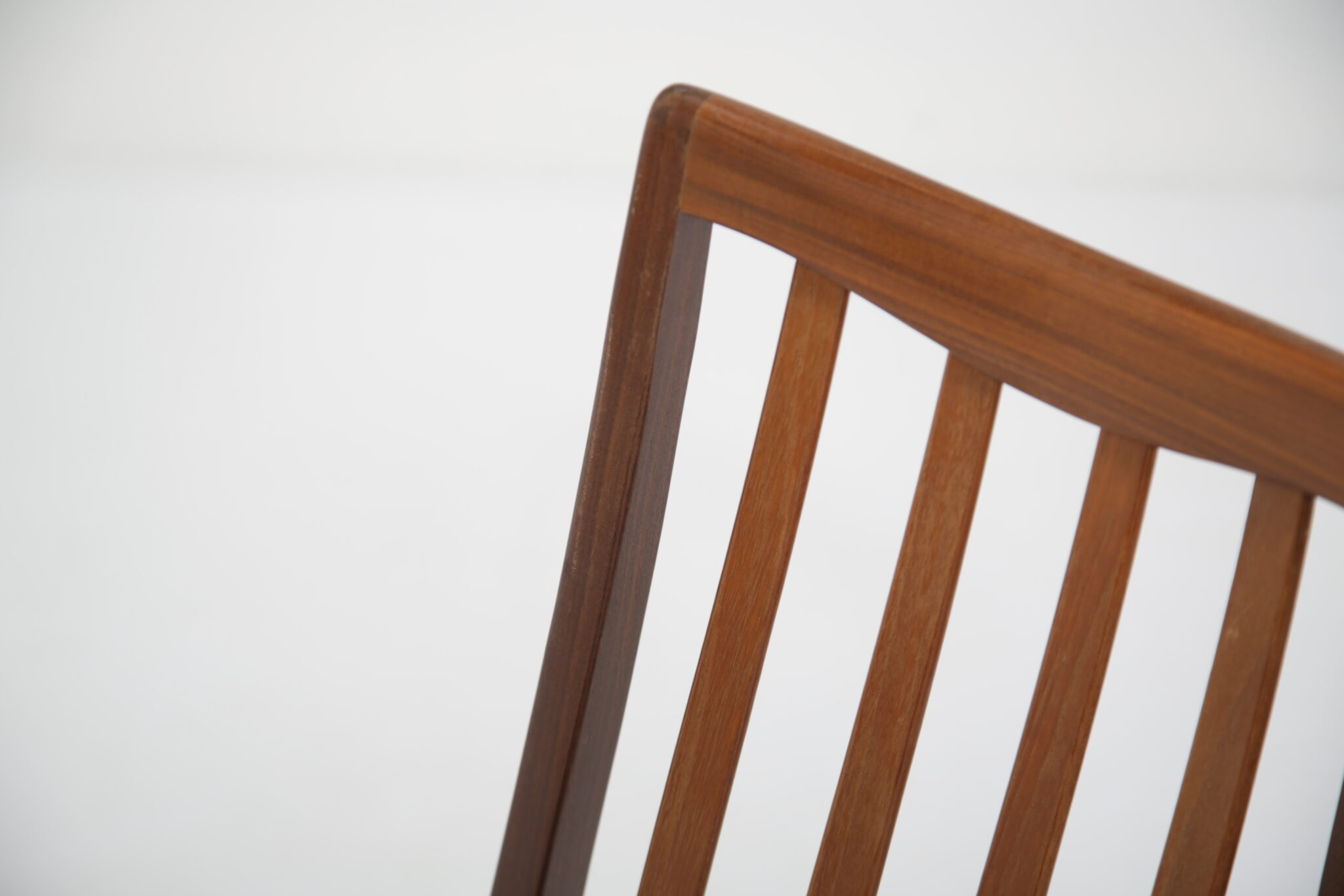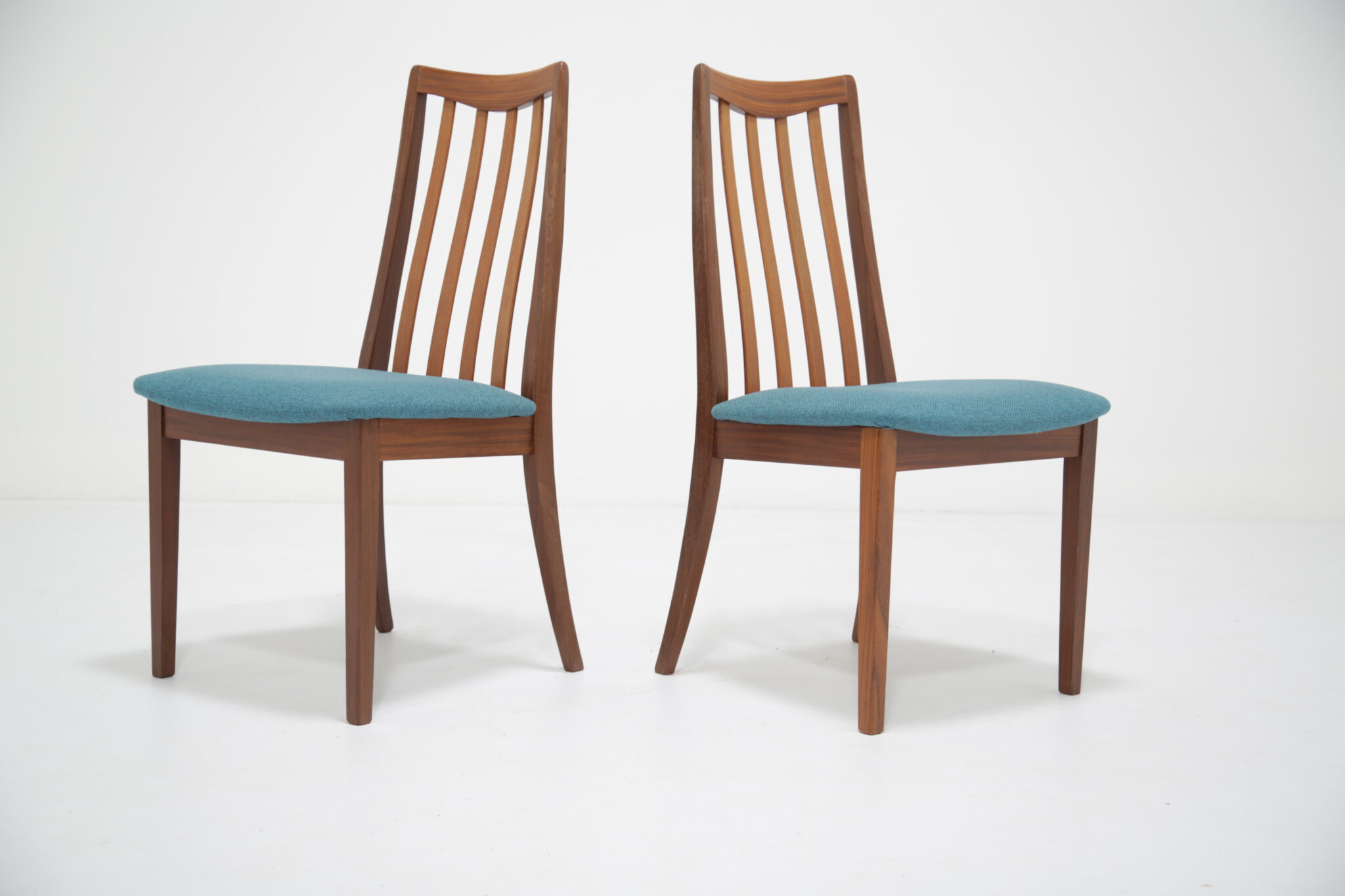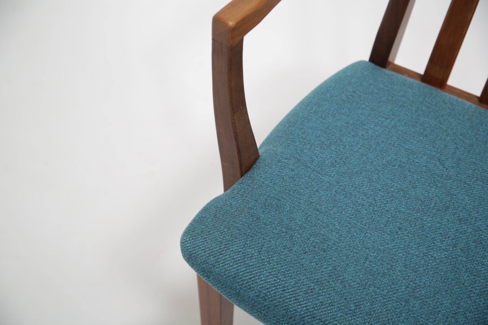 Elevate your dining space with this stunning set of six G-Plan Fresco dining chairs with carvers, a perfect blend of mid-century modern elegance and contemporary flair. Crafted from rich, warm teak wood, these iconic chairs are part of G-Plan’s celebrated Fresco range, known for its Scandinavian-inspired lines and timeless appeal. Each dining chair has been fully restored to what we call “the factory standard” and what we mean by that is that each chair should look like when they left the production line back in the 1960s. We have upholstered the seat pads in a stunning teal fabric, adding a vibrant pop of color that complements the teak’s natural grain.