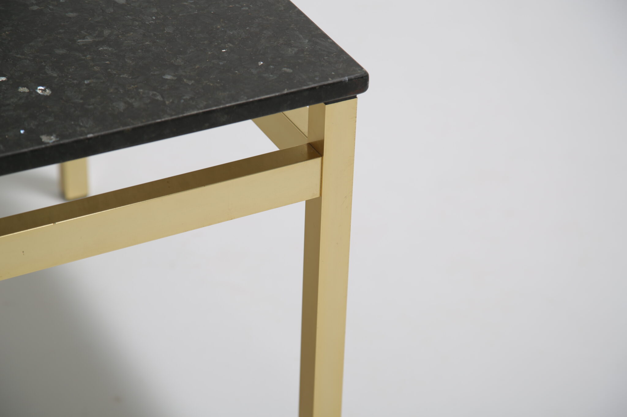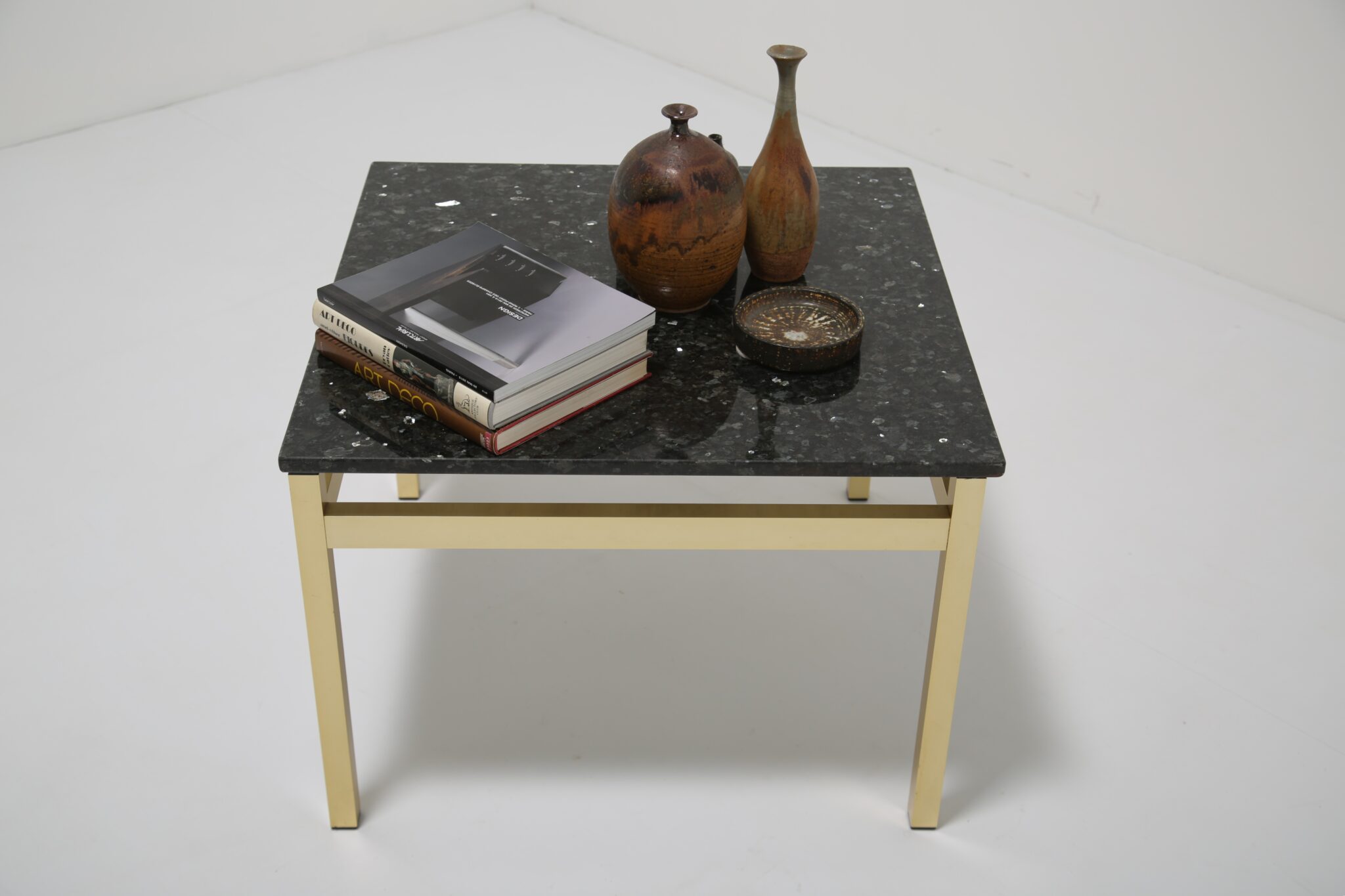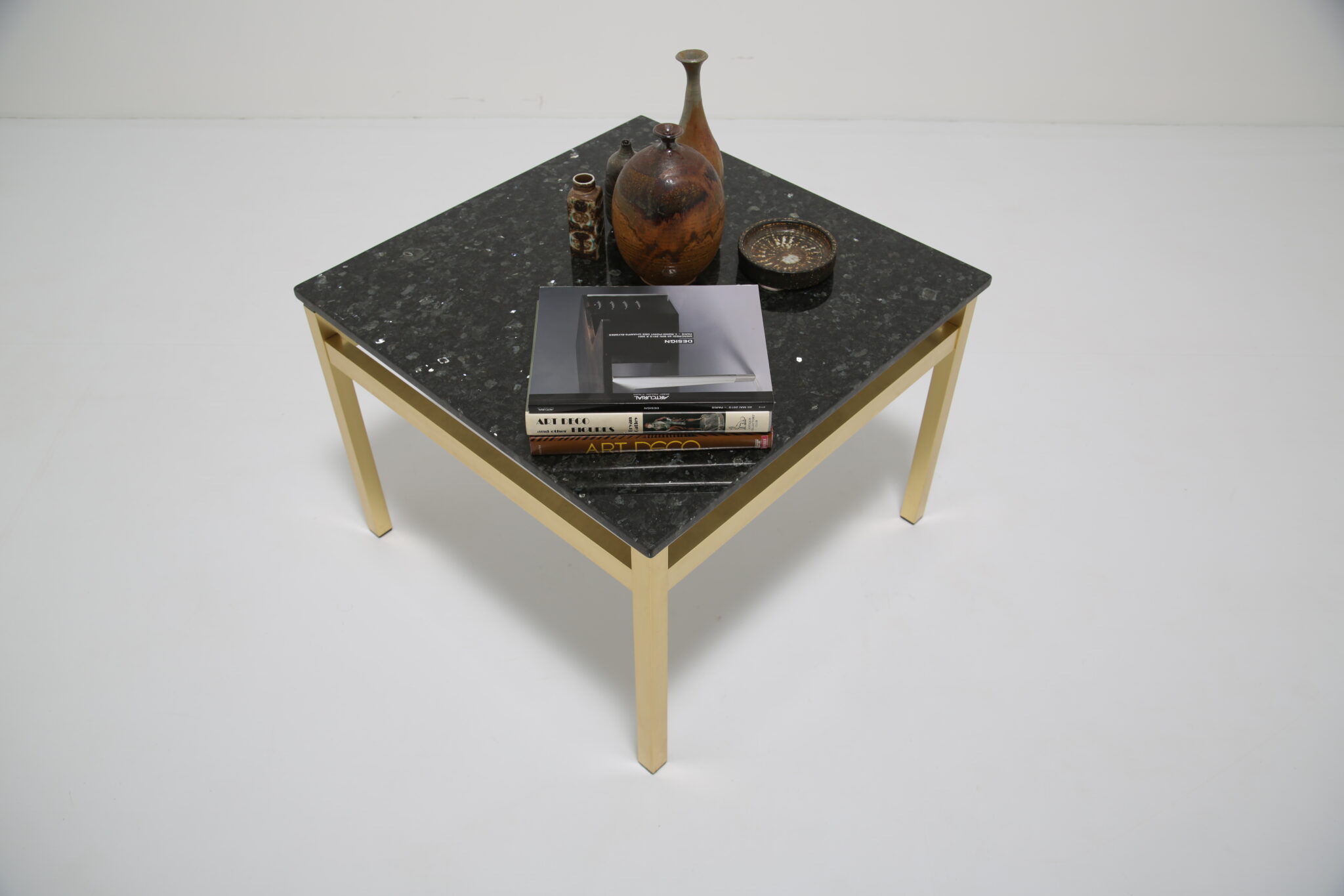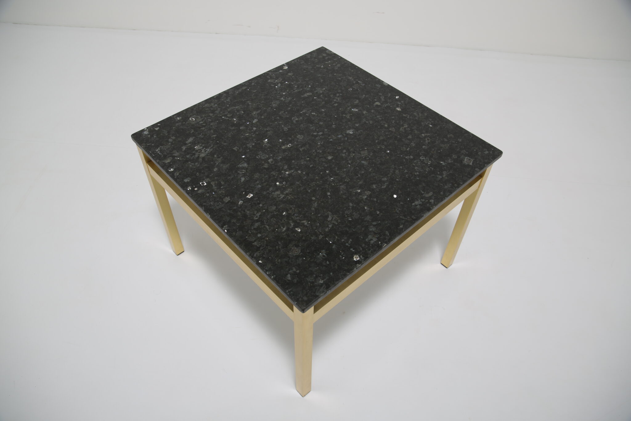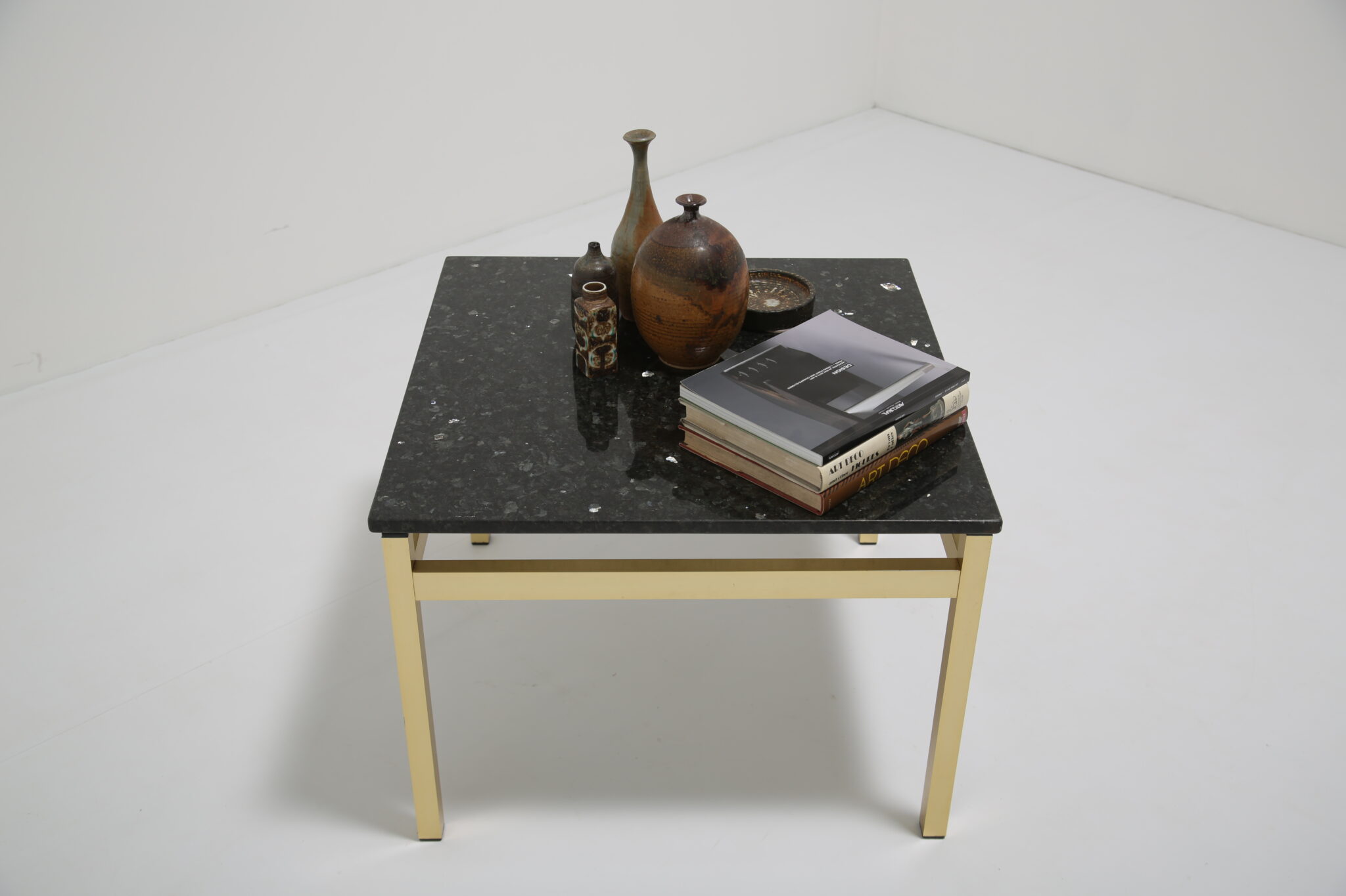 A striking example of mid-century modern elegance, this square coffee or side table combines the natural luxury of stone with the warm glow of brass. The polished black granite top is flecked with subtle reflective inclusions, lending richness and texture to its smooth surface. Supported by a clean-lined brass-plated frame with straight legs and understated cross-supports, the design embodies refined minimalism while offering strength and stability. Compact yet bold, the table adapts beautifully to a variety of settings, whether used as a centerpiece in a smaller living room, a side table by a sofa, or a stylish stand for decorative objects. Its timeless balance of materials ensures it fits seamlessly into both vintage and contemporary interiors.