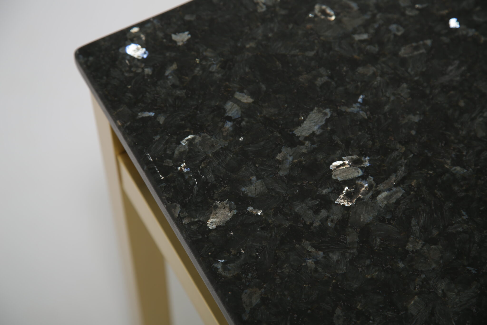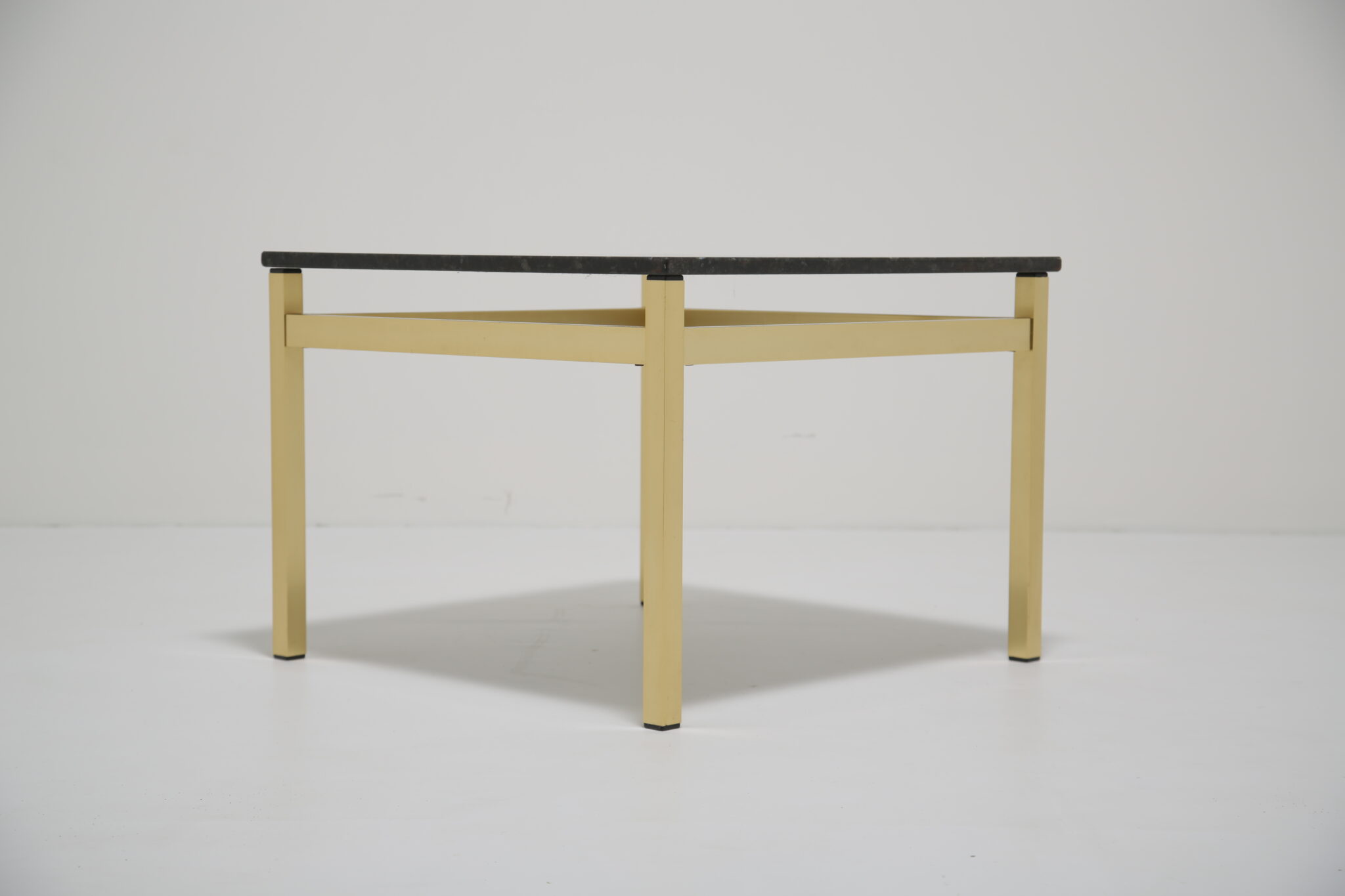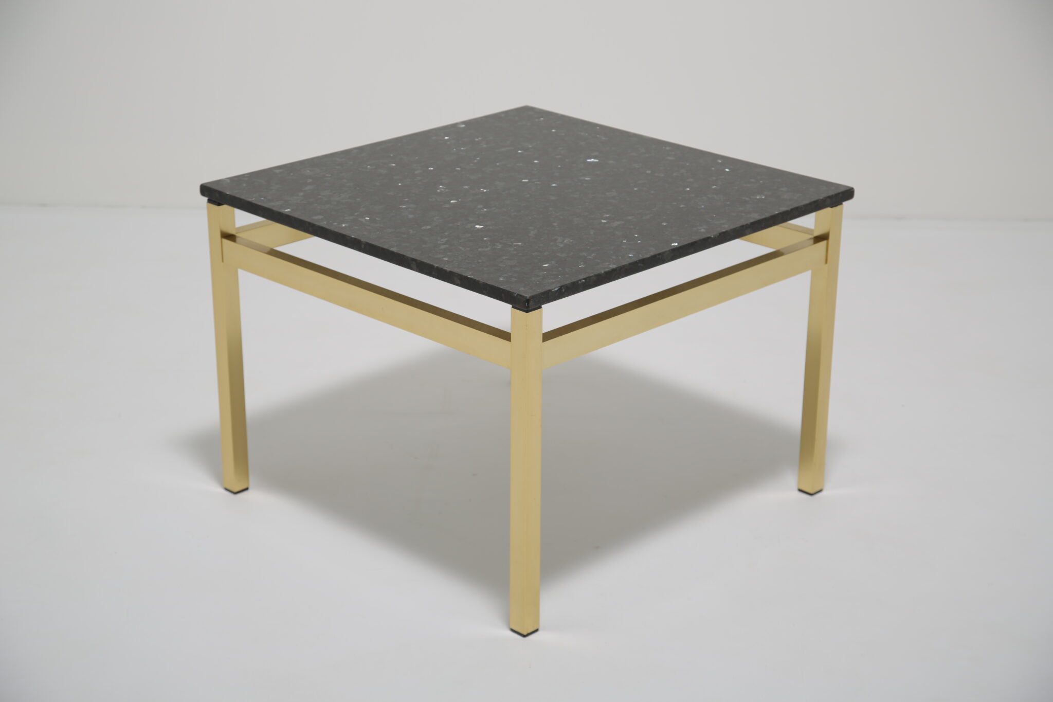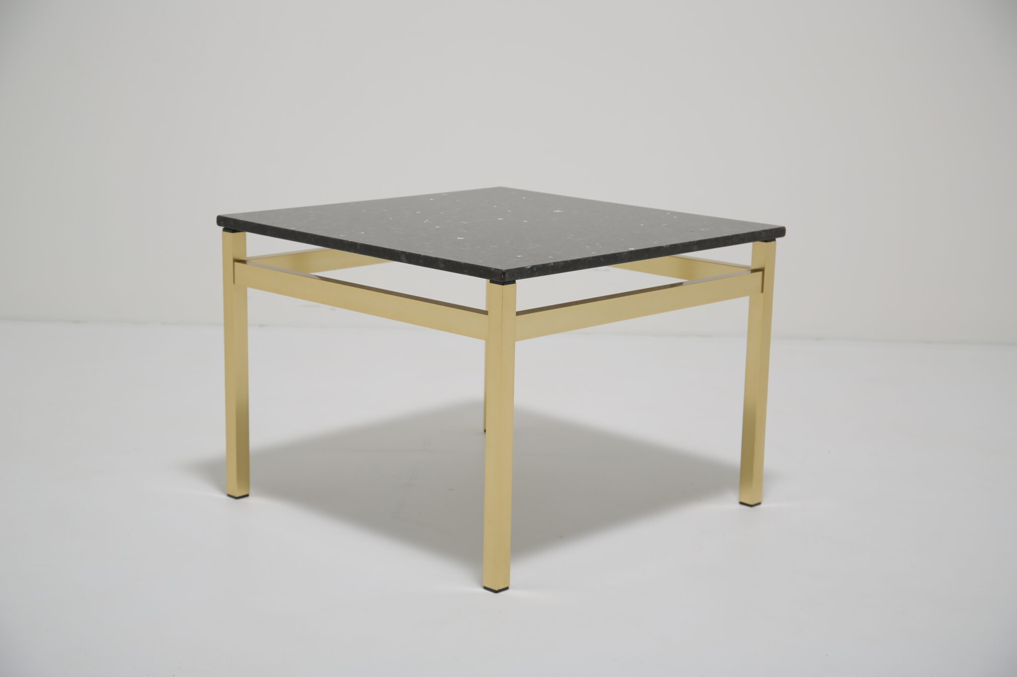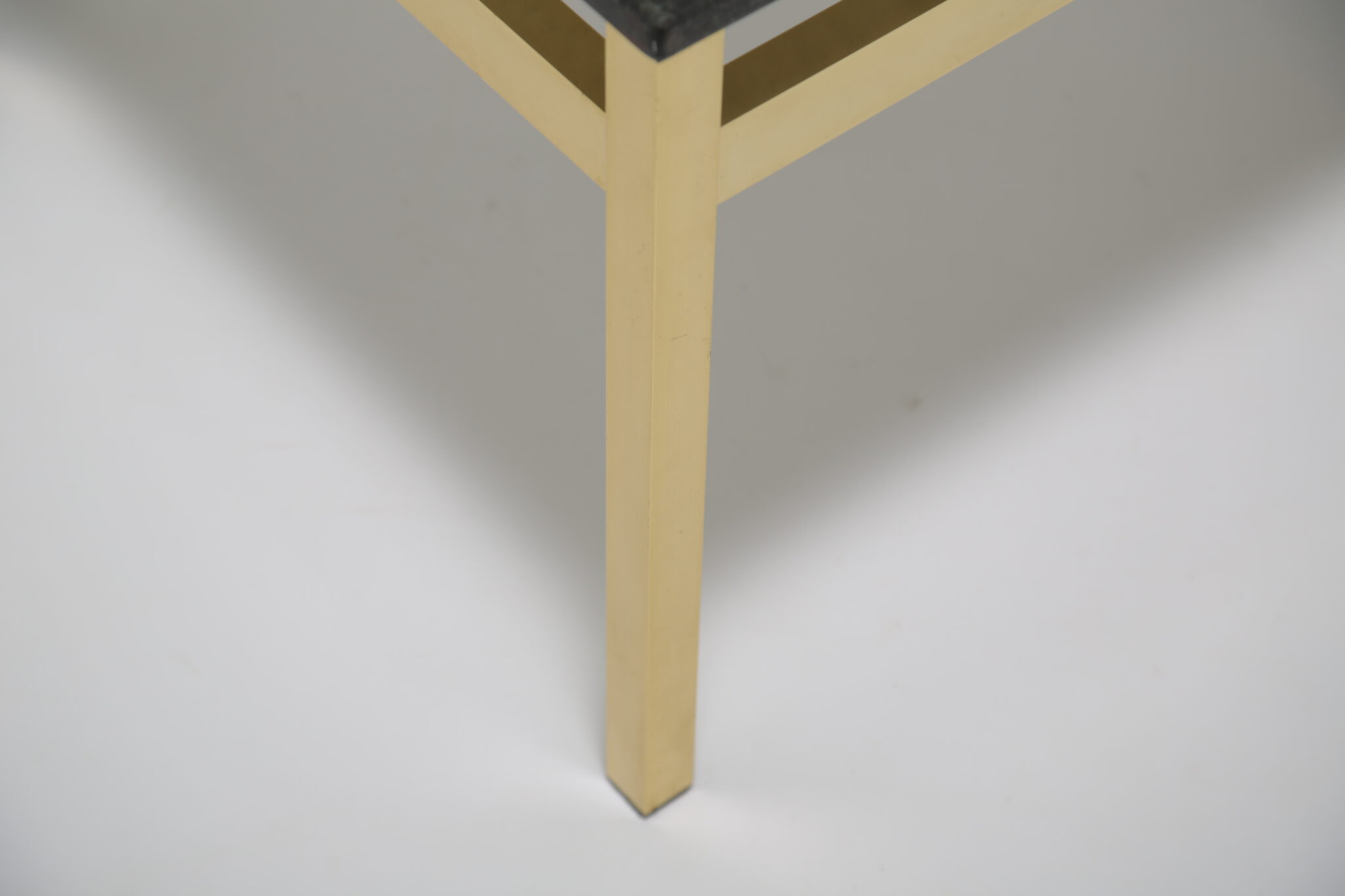 A striking example of mid-century modern elegance, this square coffee or side table combines the natural luxury of stone with the warm glow of brass. The polished black granite top is flecked with subtle reflective inclusions, lending richness and texture to its smooth surface. Supported by a clean-lined brass-plated frame with straight legs and understated cross-supports, the design embodies refined minimalism while offering strength and stability. Compact yet bold, the table adapts beautifully to a variety of settings, whether used as a centerpiece in a smaller living room, a side table by a sofa, or a stylish stand for decorative objects. Its timeless balance of materials ensures it fits seamlessly into both vintage and contemporary interiors.